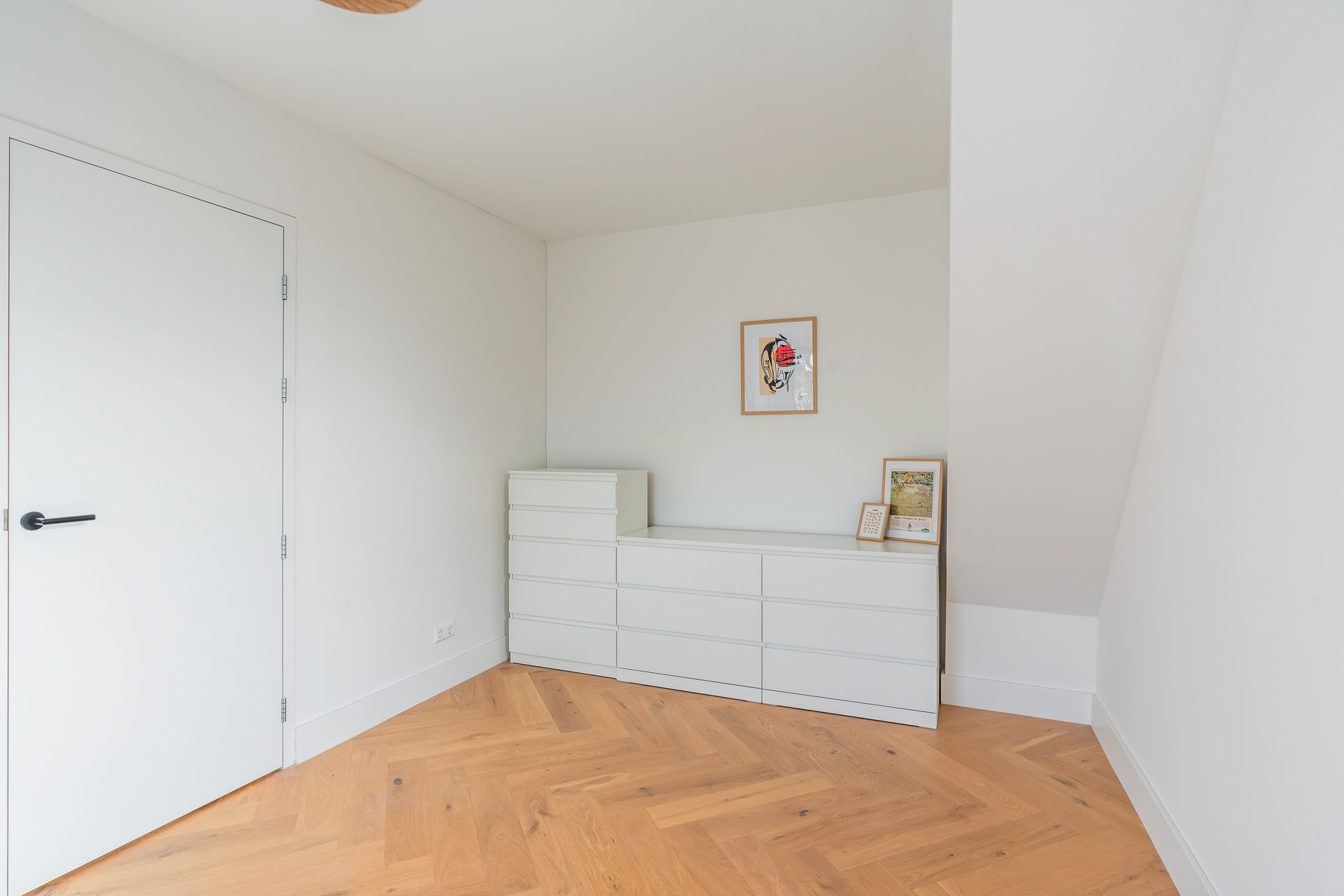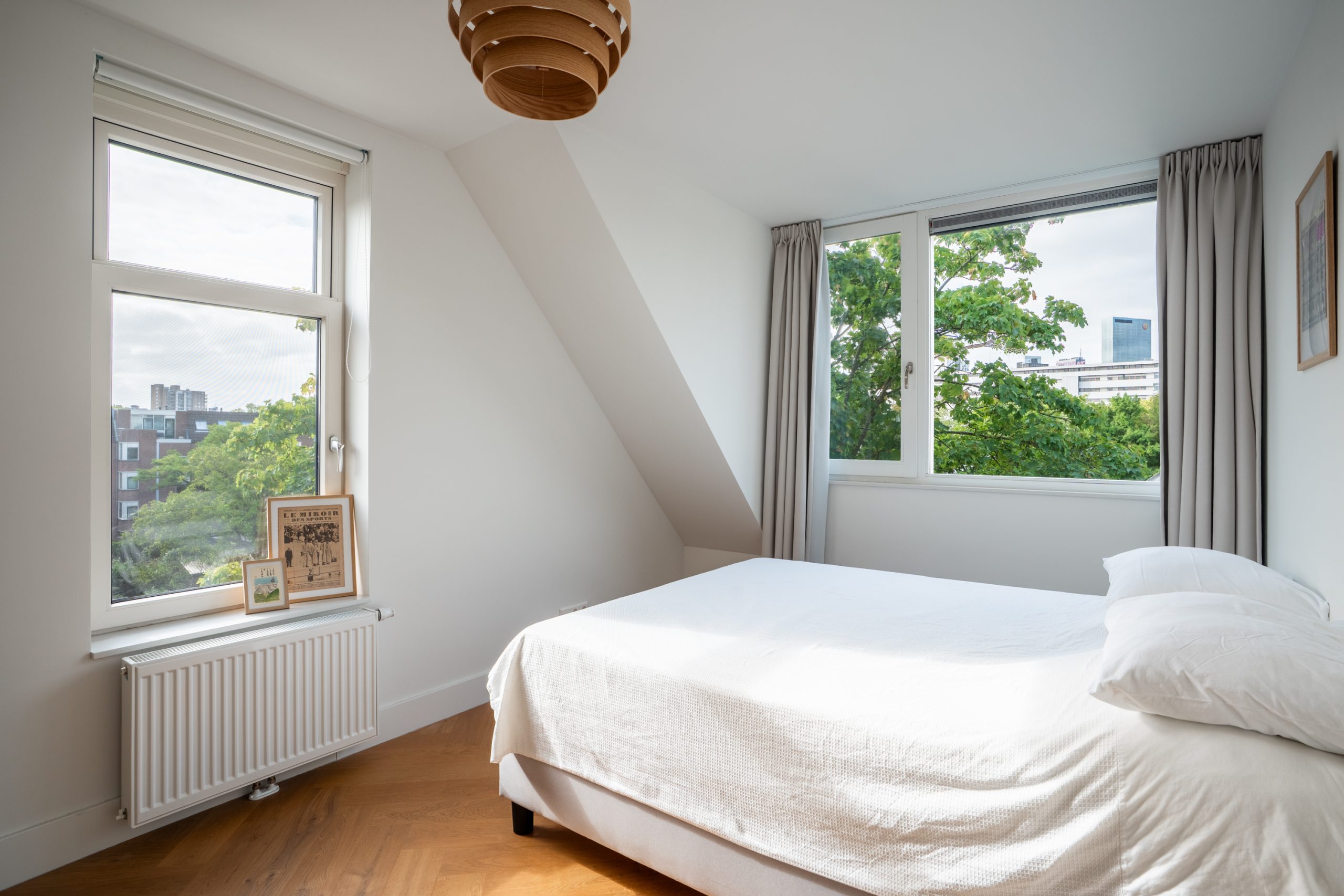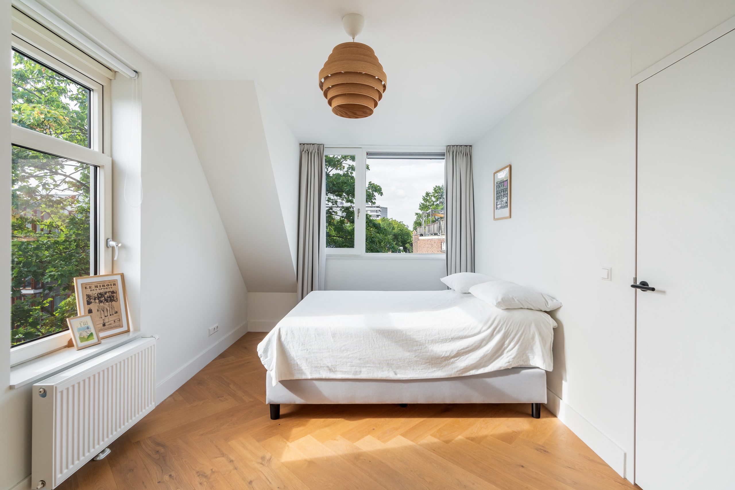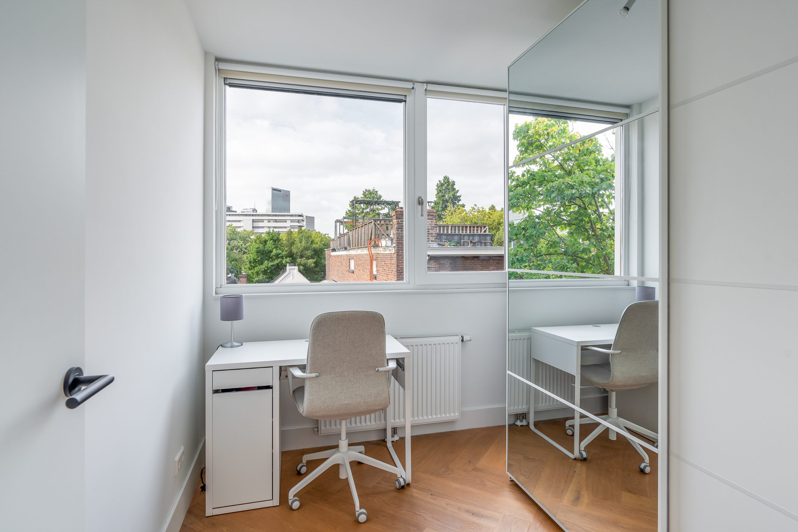 Via de trap bereik je de derde verdieping, waar opnieuw de visgraatvloer de ruimtes met elkaar verbindt. De master bedroom is gelegen aan de achterzijde van de woning. Een lichte kamer met uitzicht op groen en zeeën van ruimte. Je kan hier gemakkelijk een bed en een grote garderobe kast kwijt. De tweede slaapkamer is momenteel ingericht als kantoor. Deze is multifunctioneel in te richten als inloopkast, kinderkamer of atelier en heeft een tevens een prachtig uitzicht. De moderne badkamer is volledig betegeld en beschikt over een wastafel met meubel en inloopdouche. Door de aardse tinten en natuurlijke materialen waan je je hier in een luxe spa.