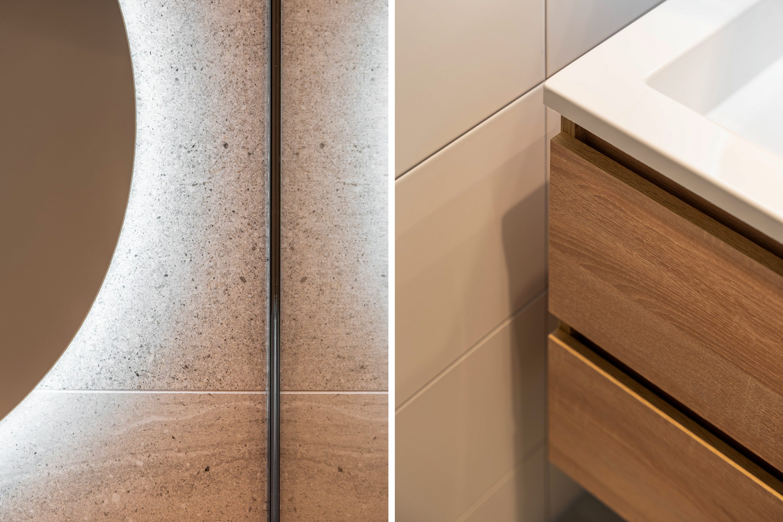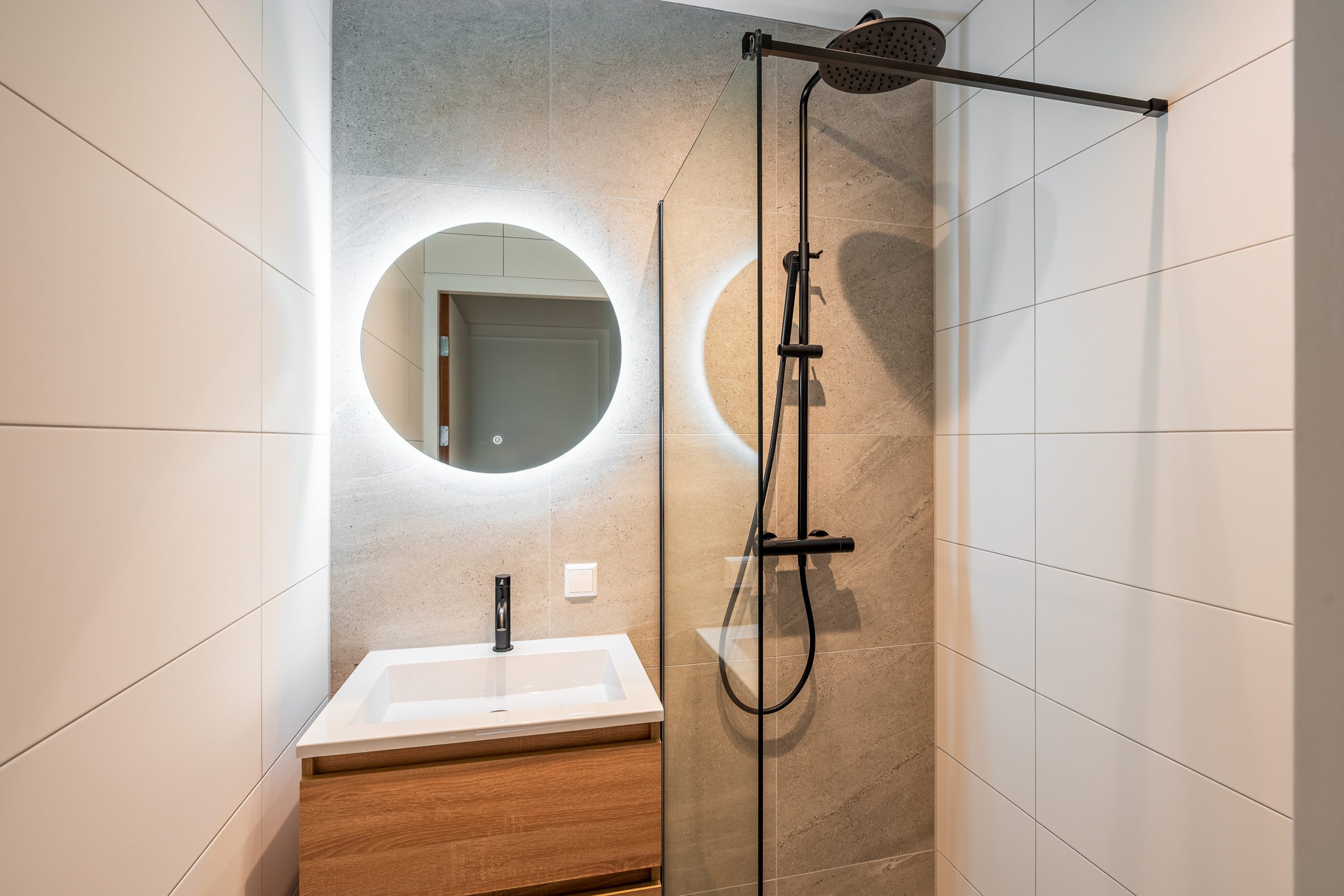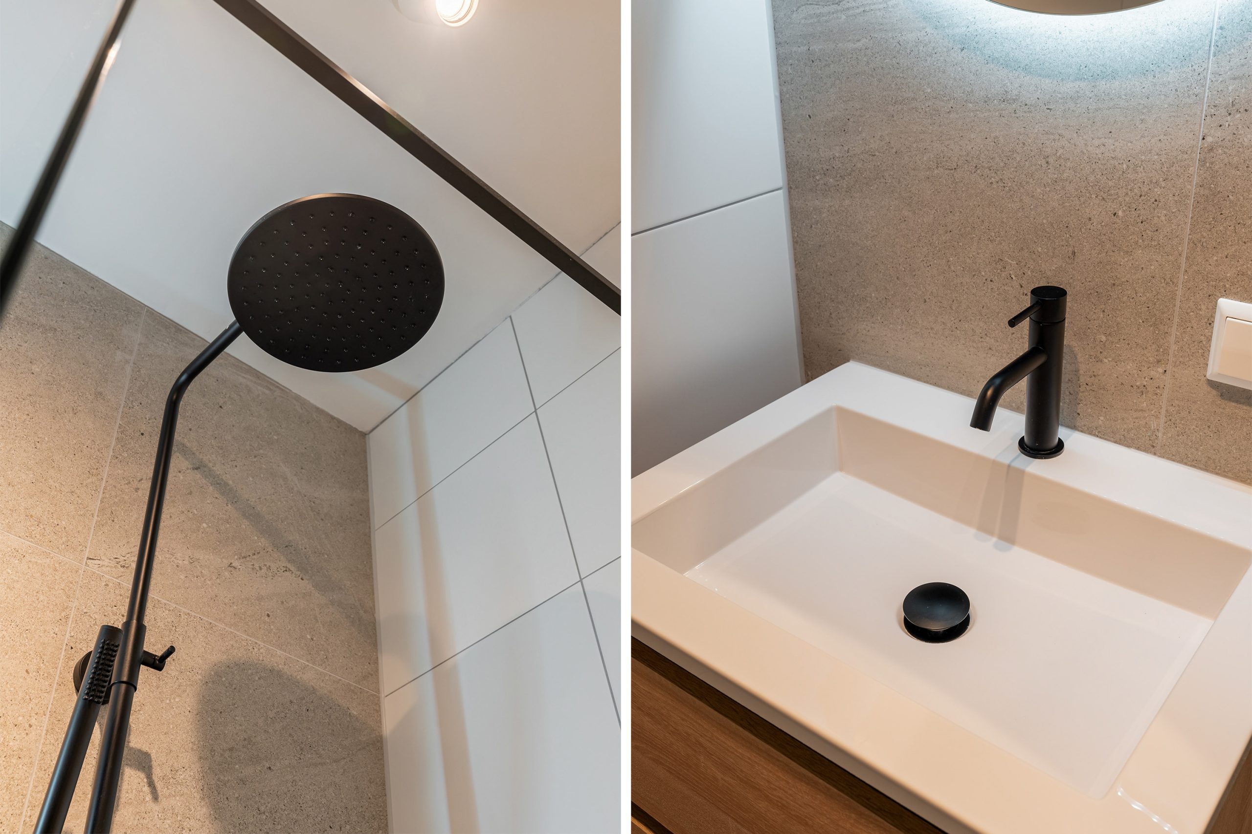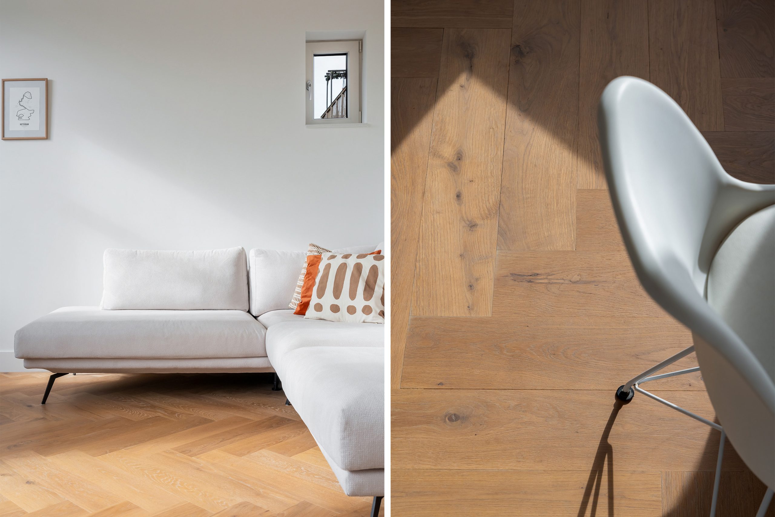 Via de trap bereik je de derde verdieping, waar opnieuw de visgraatvloer de ruimtes met elkaar verbindt. De master bedroom is gelegen aan de achterzijde van de woning. Een lichte kamer met uitzicht op groen en zeeën van ruimte. Je kan hier gemakkelijk een bed en een grote garderobe kast kwijt. De tweede slaapkamer is momenteel ingericht als kantoor. Deze is multifunctioneel in te richten als inloopkast, kinderkamer of atelier en heeft een tevens een prachtig uitzicht. De moderne badkamer is volledig betegeld en beschikt over een wastafel met meubel en inloopdouche. Door de aardse tinten en natuurlijke materialen waan je je hier in een luxe spa.