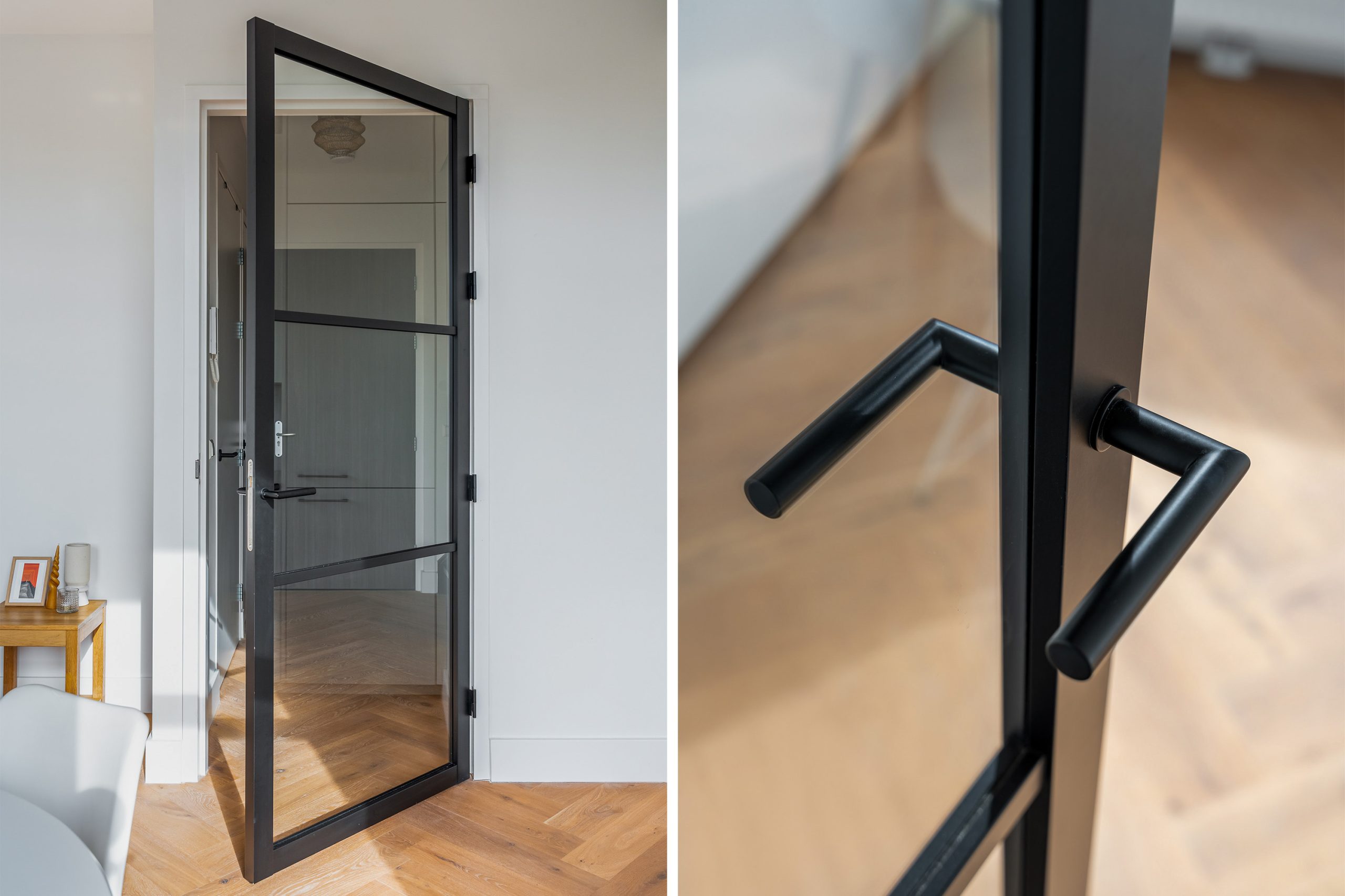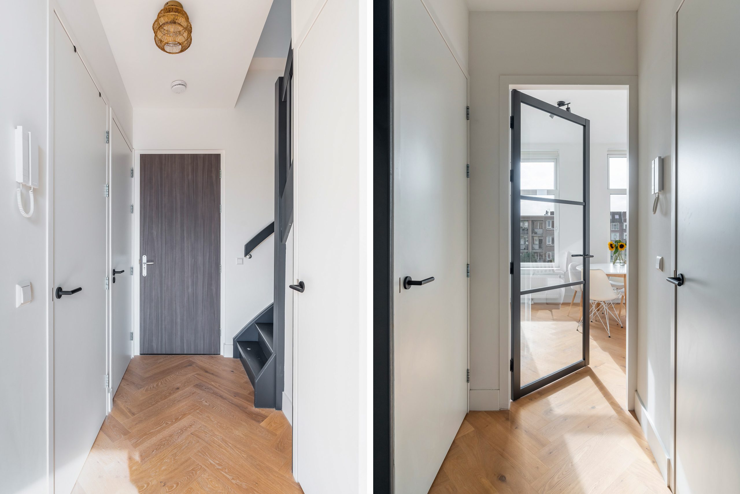 Kom binnen in de entree die toegang geeft tot alle vertrekken op deze verdieping. Meteen valt de prachtige visgraatvloer op, samen met de stalen deuren met glas, wat de woning een luxe uitstraling geeft.