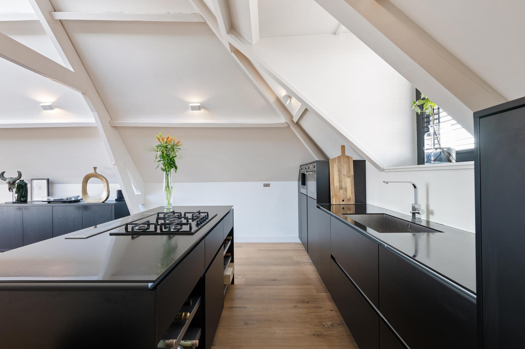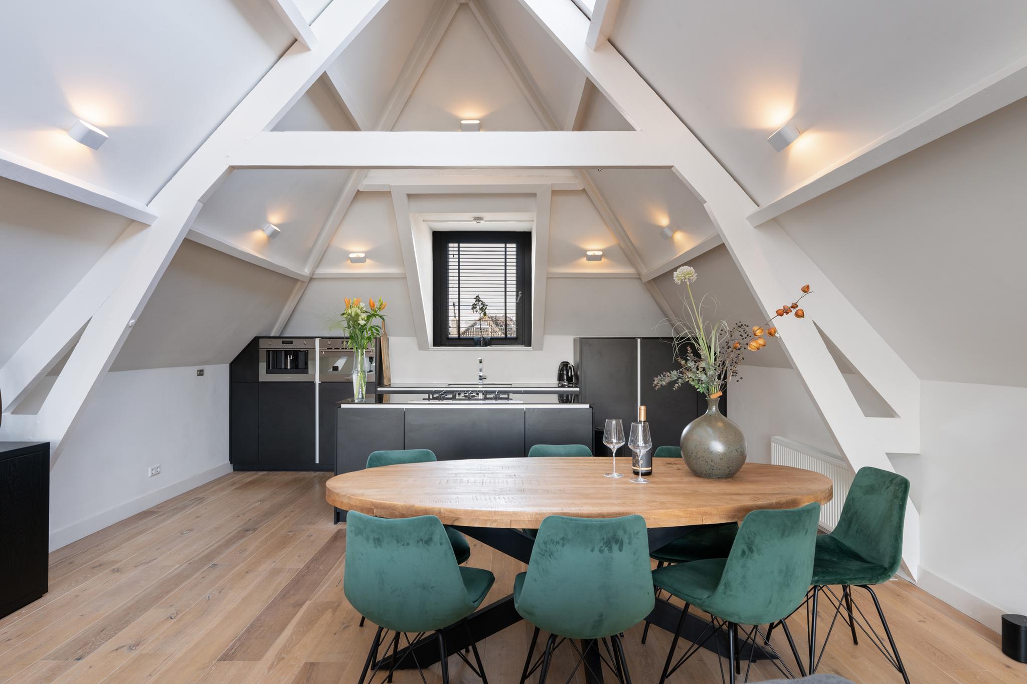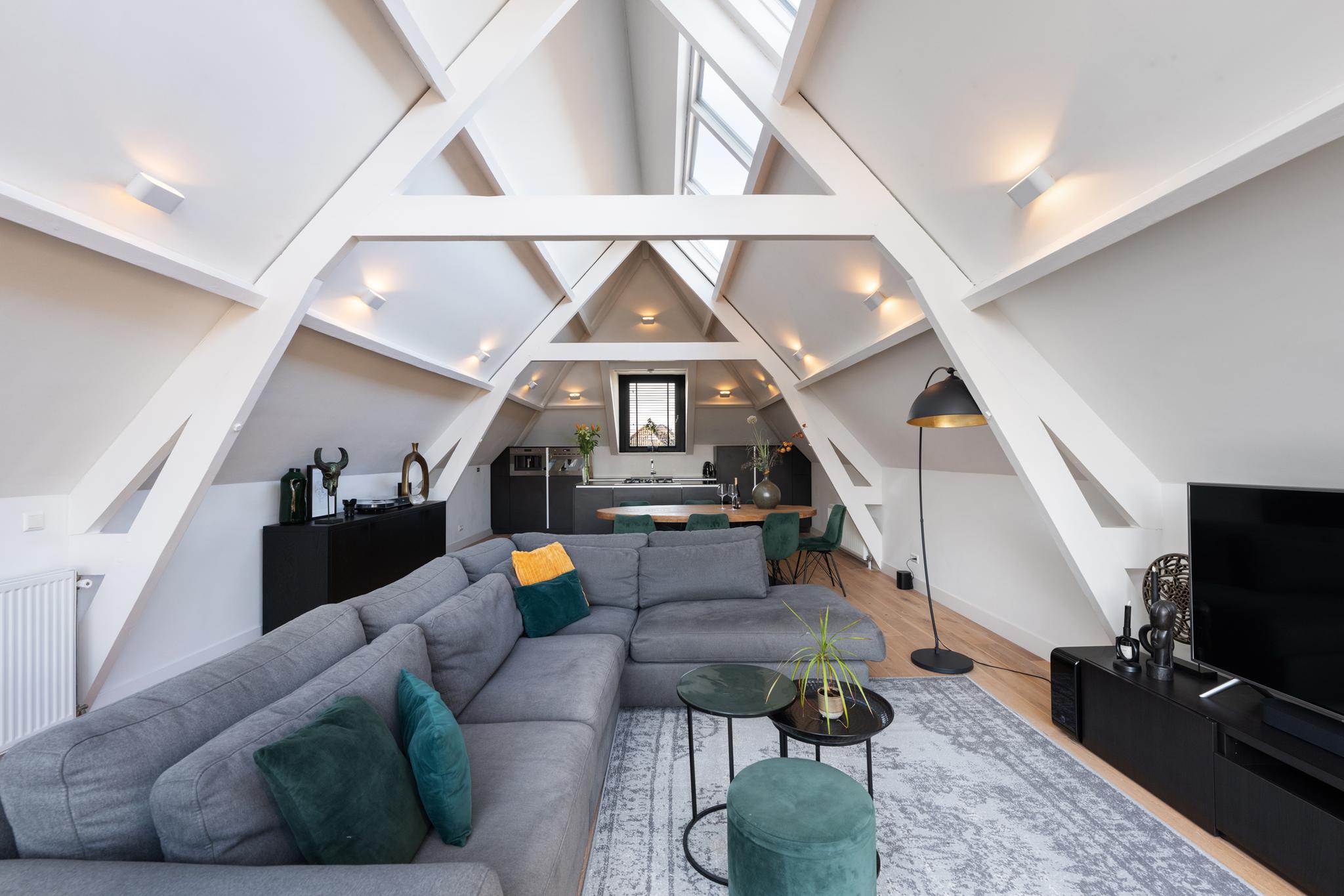 Op de bovenste verdieping van dit karakteristieke pand uit 1901 bevindt zich een indrukwekkende leefruimte die zich uitstrekt over de volledige lengte van het gebouw. De royale opzet, hoge plafonds, robuuste houten balken en schuine daken geven de ruimte een authentiek karakter, terwijl de hoogwaardige afwerking zorgt voor een luxe uitstraling. Dankzij de dakramen en de grote pui met openslaande deuren naar het terras baadt de ruimte in natuurlijk licht.
