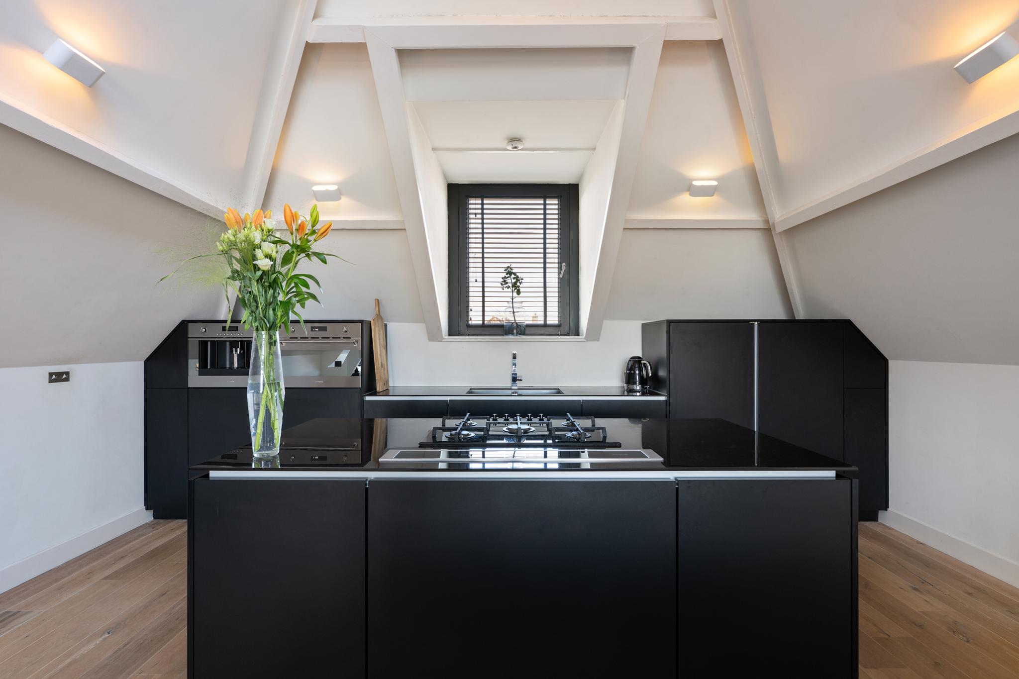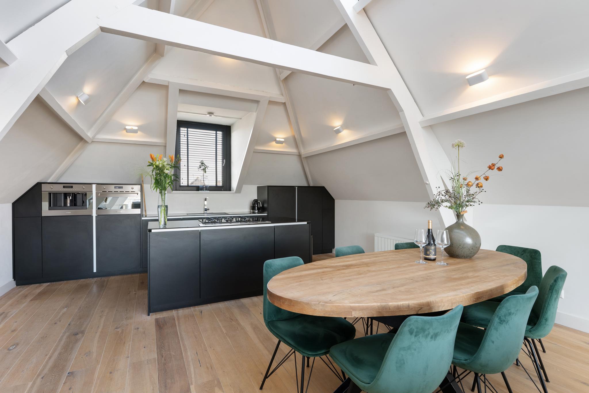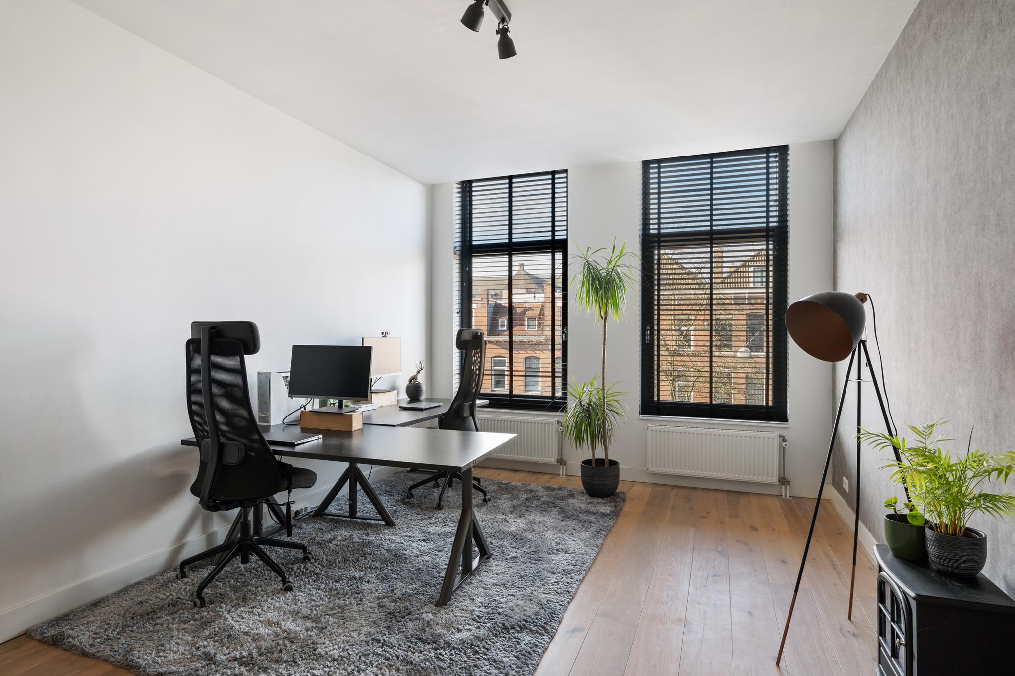 Op de bovenste verdieping van dit karakteristieke pand uit 1901 bevindt zich een indrukwekkende leefruimte die zich uitstrekt over de volledige lengte van het gebouw. De royale opzet, hoge plafonds, robuuste houten balken en schuine daken geven de ruimte een authentiek karakter, terwijl de hoogwaardige afwerking zorgt voor een luxe uitstraling. Dankzij de dakramen en de grote pui met openslaande deuren naar het terras baadt de ruimte in natuurlijk licht.
