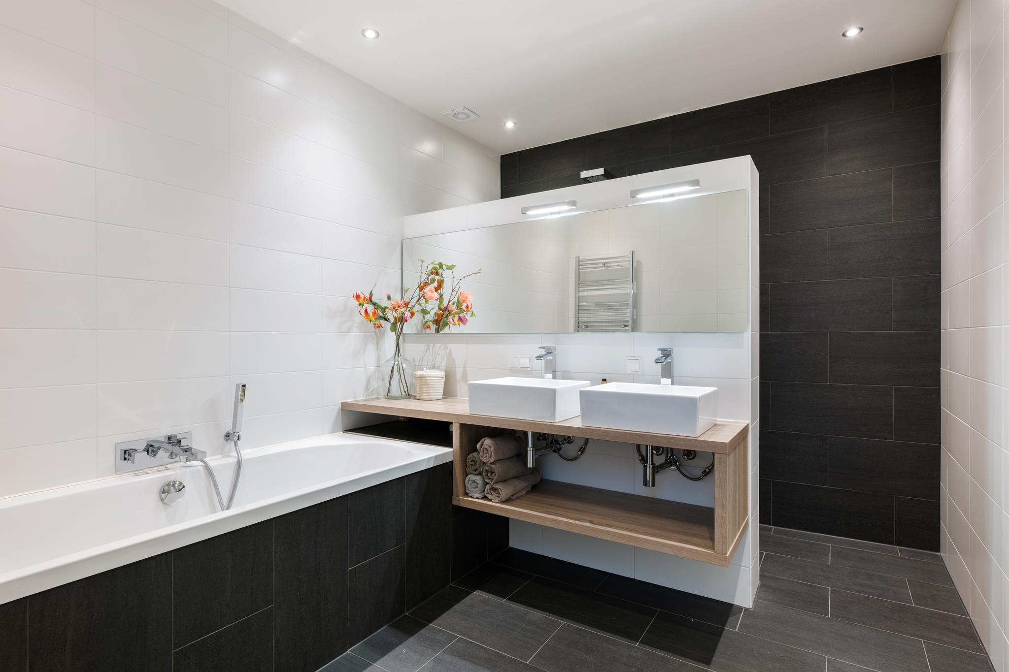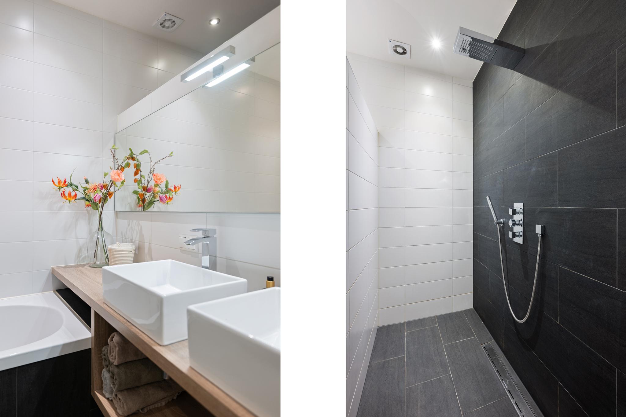 Aan de voorzijde bevinden zich twee ruime slaapkamers, flexibel in te richten naar wens met ruime raampartijen. In het midden van de etage tref je de luxe badkamer, volledig betegeld en voorzien van moderne spotverlichting. Hier ontbreekt het je aan niets: een ligbad, dubbele wastafel met grote spiegel en een royale inbouw inloop regendouche met maken het geheel compleet, een ware welness-ervaring.