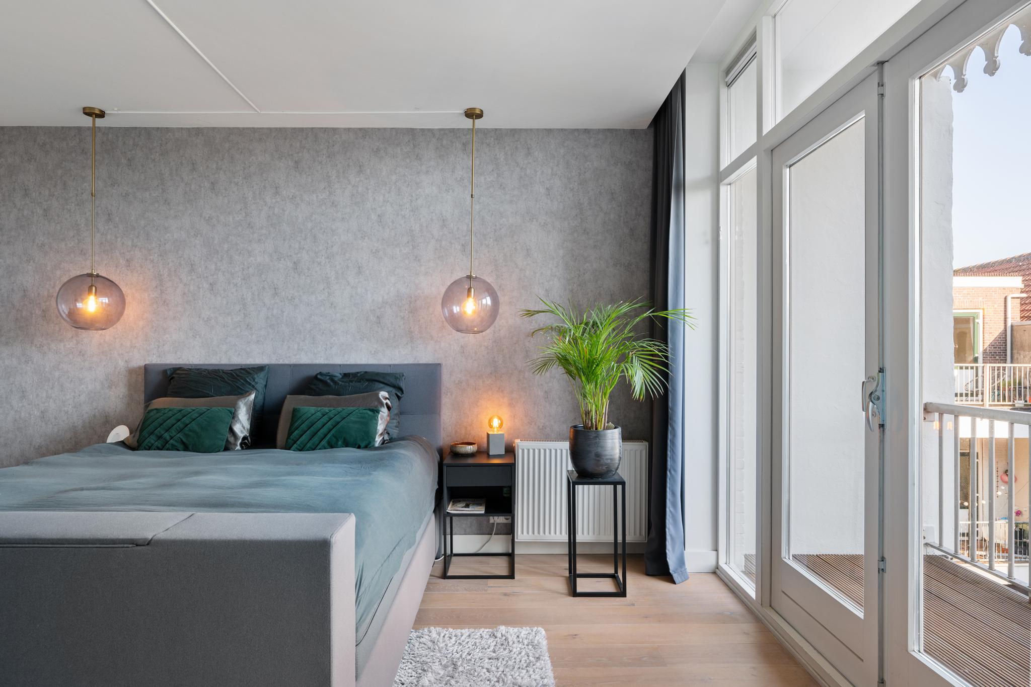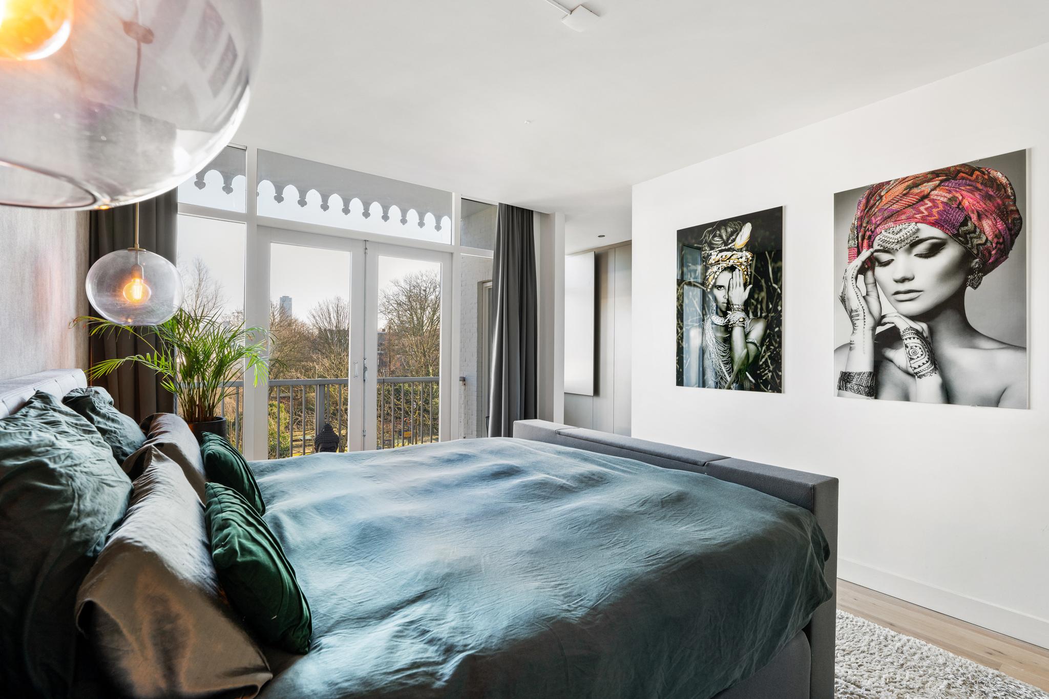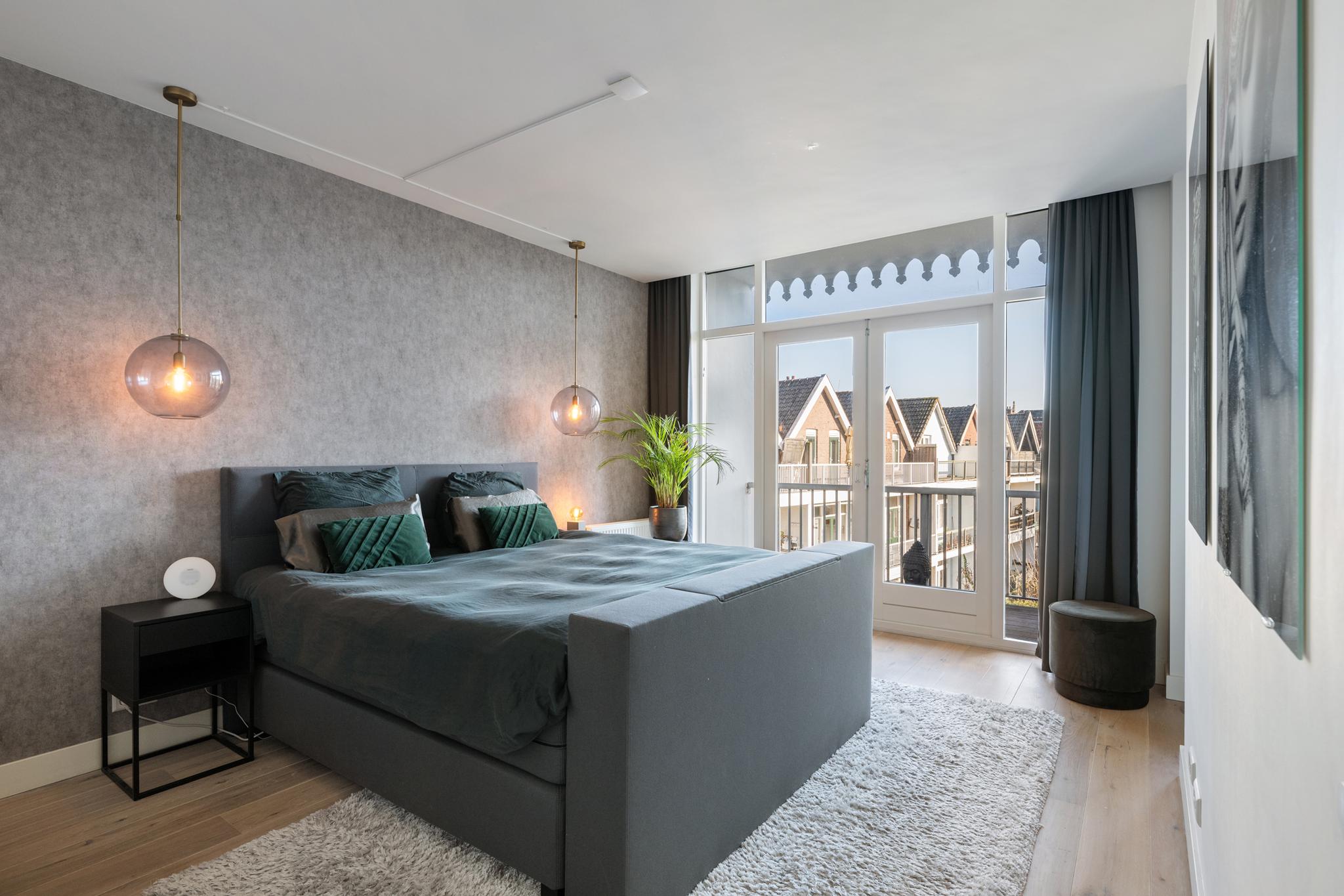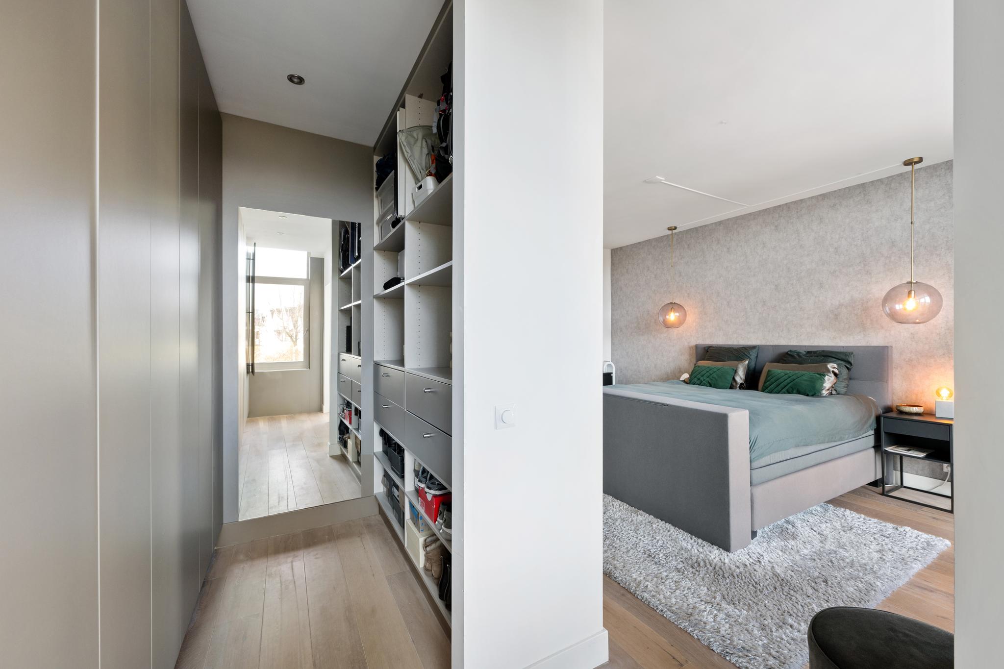 Aan de achterzijde bevindt zich een van de hoofdslaapkamers, compleet met een aangrenzende inloopkast op maat met ingebouwde spots. Via openslaande deuren heb je hier toegang tot een heerlijke buitenruimte, waar je wakker wordt met zicht op het groen én de Rotterdamse skyline.