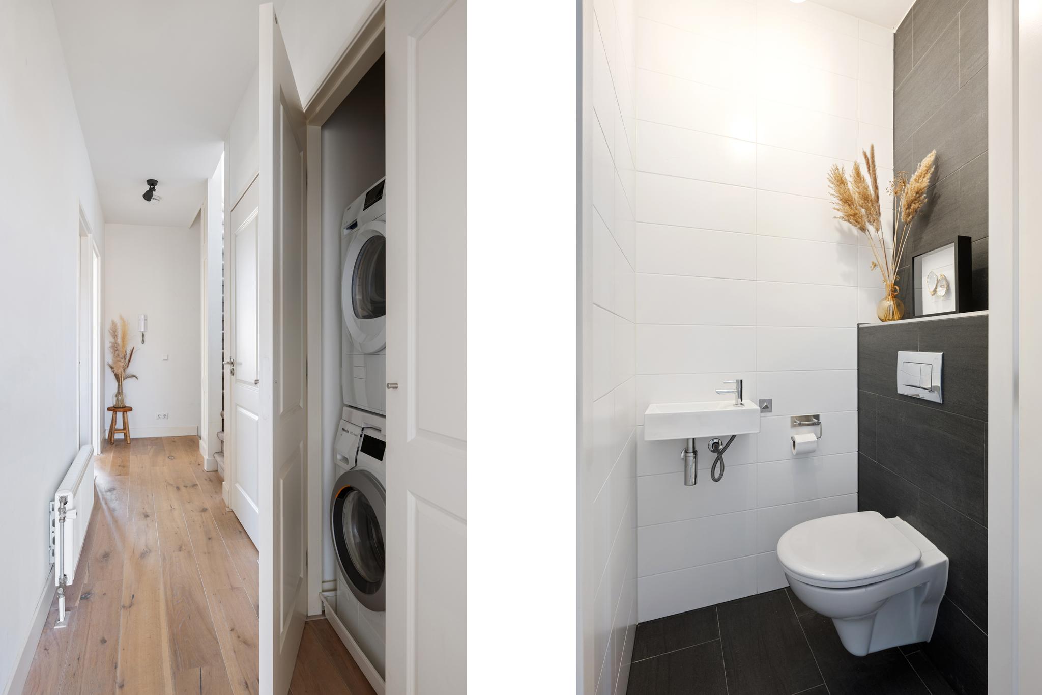 Daarnaast beschikt de overloop over een separaat toilet met fonteintje en een ruimte inpandige kast met aansluitingen en ruimte voor onder andere de wasmachine en wasdroger.