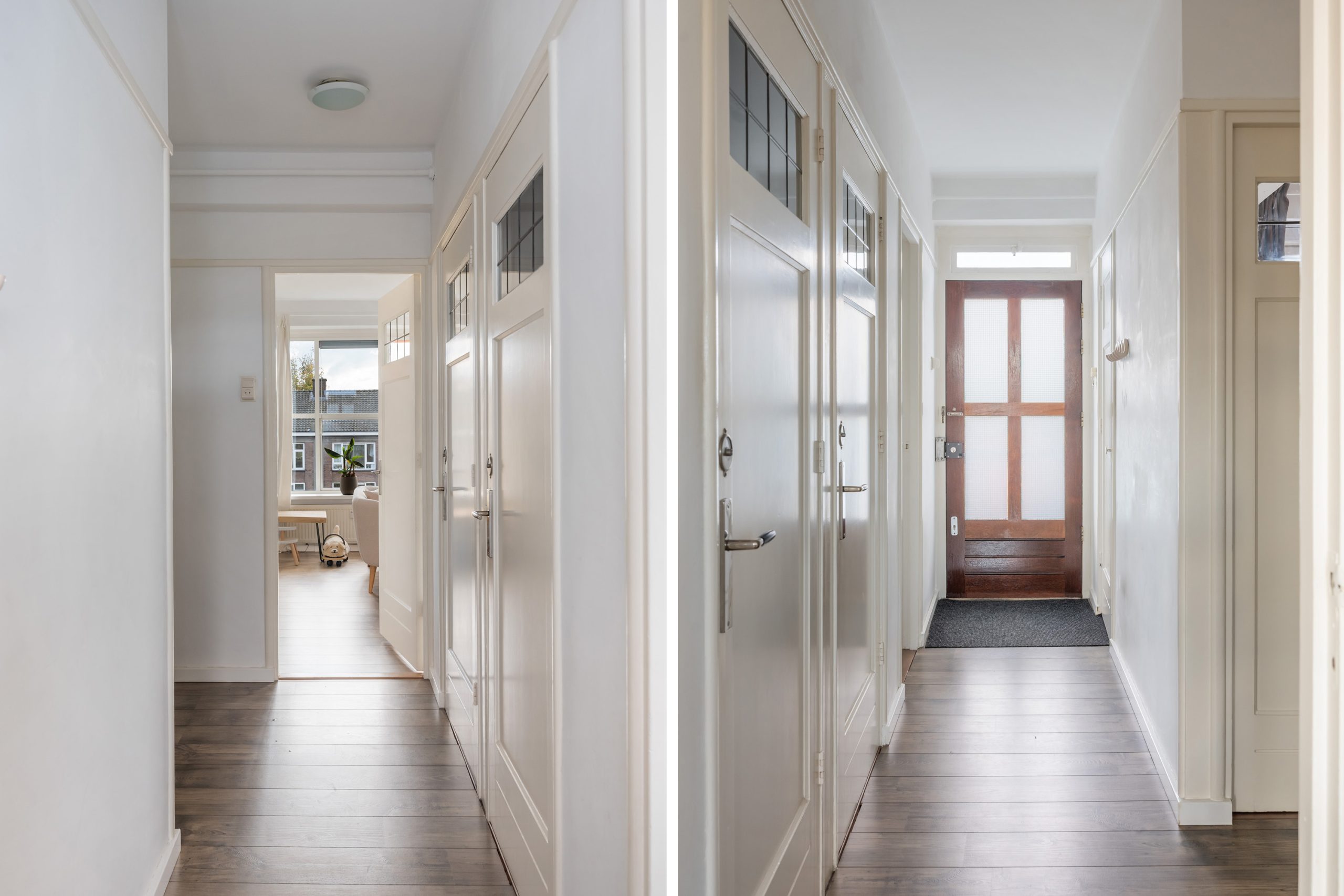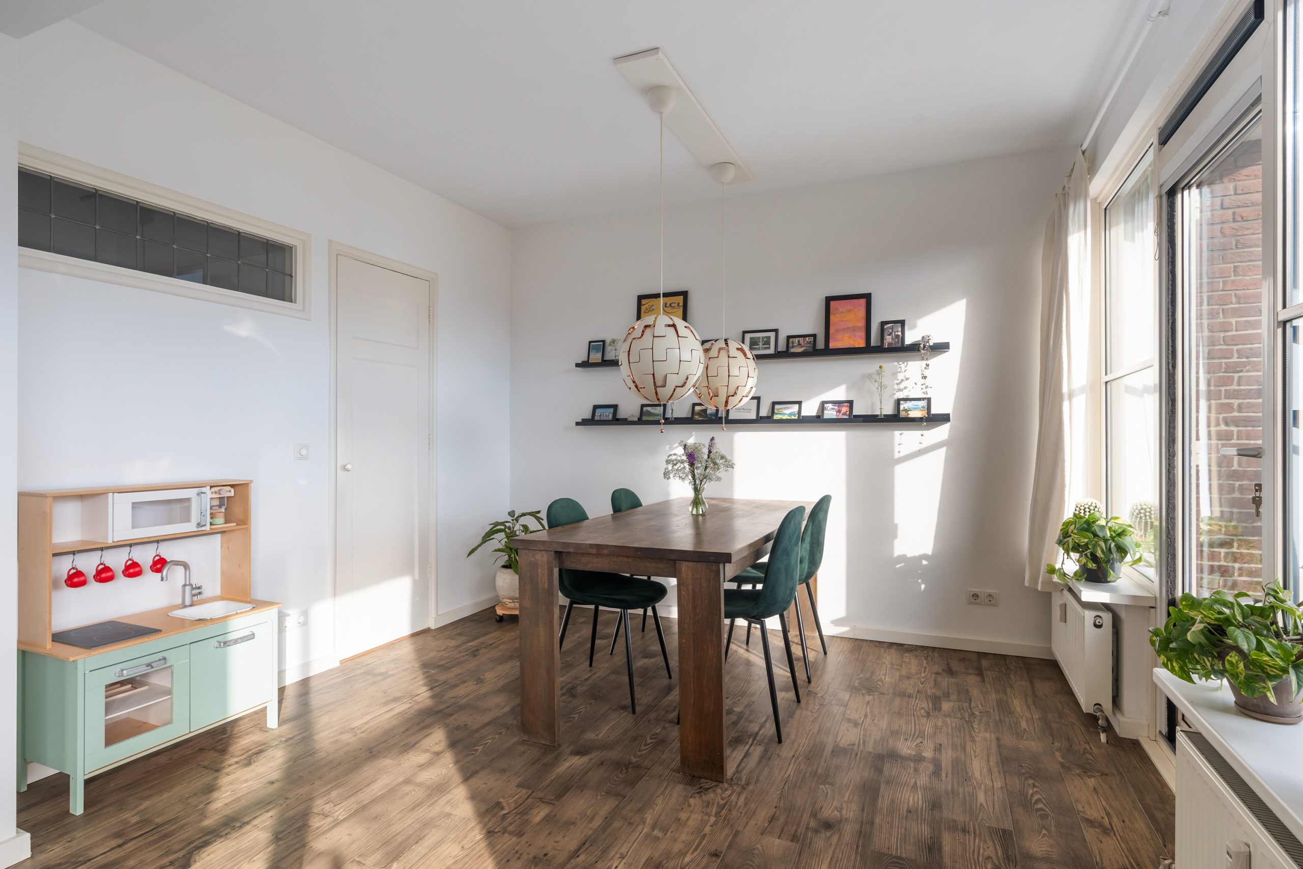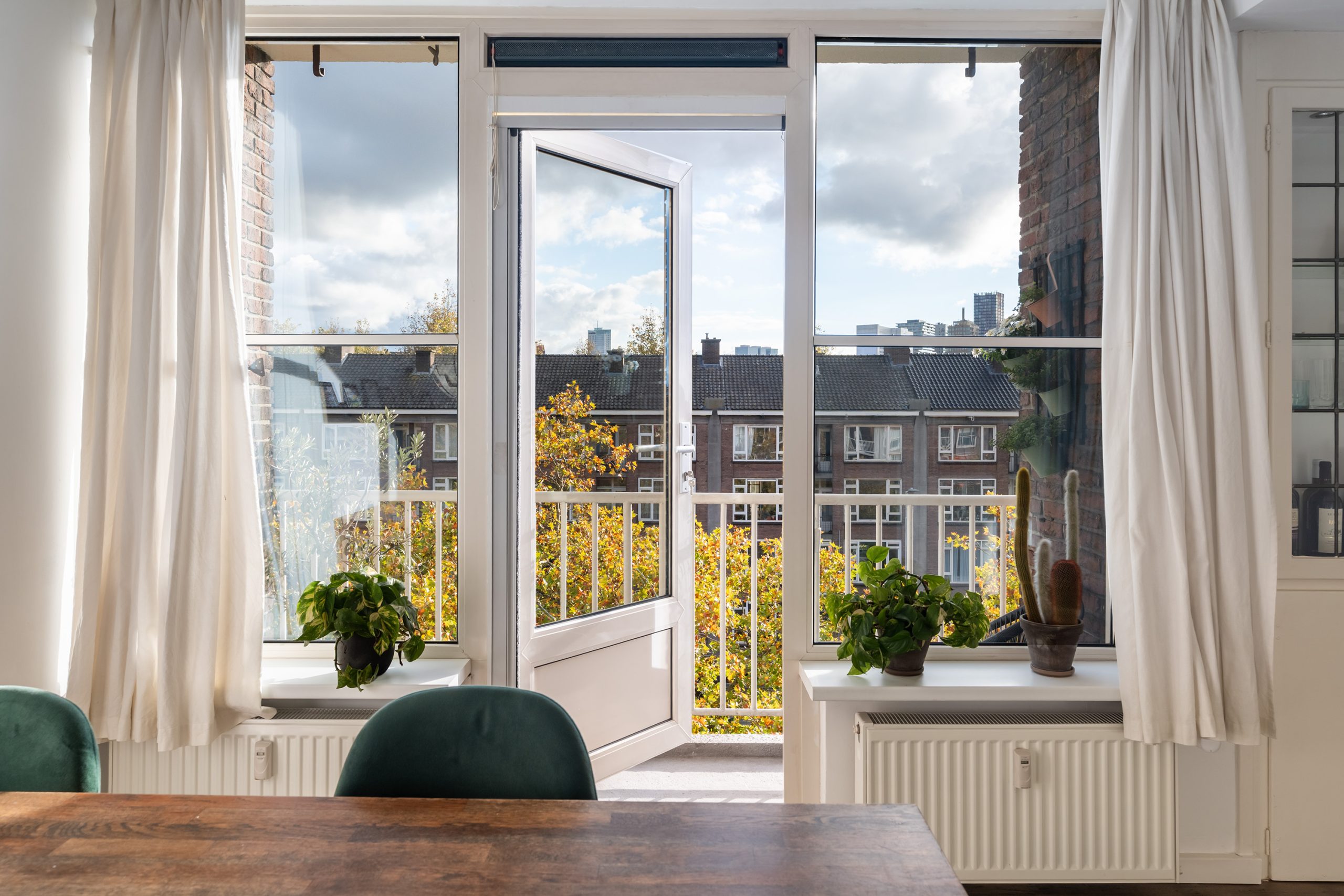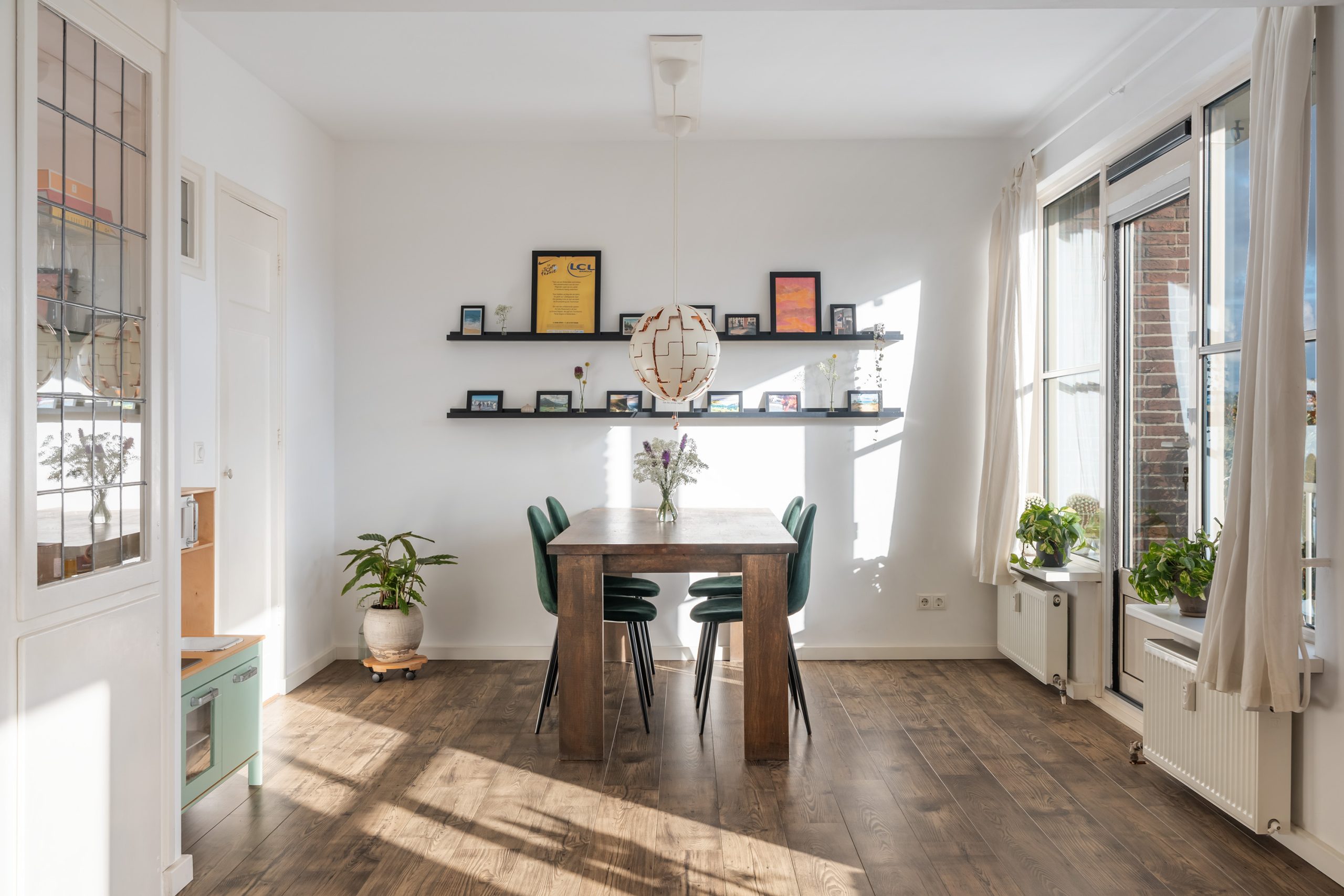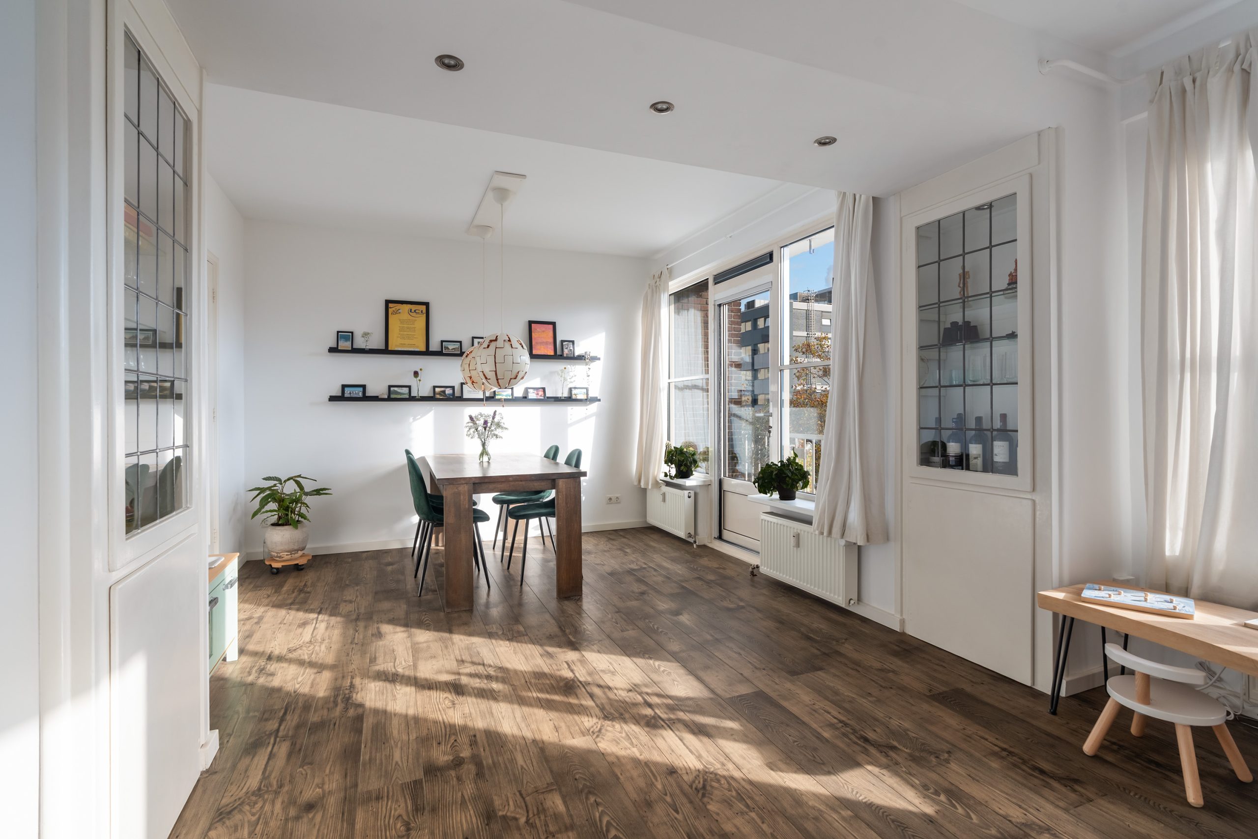 Binnenkomend in de entree die toegang geeft tot de verschillende vertrekken. Bij het binnenkomen in de woonkamer word je meteen verrast door de overvloed aan natuurlijk licht. Een fijne ruimte waar de laminaatvloer en de originele inbouwkasten met glas-in-lood mooi tot hun recht komen in het daglicht. Een lange eettafel of een grote zithoek? Hier kan het allemaal! Doordat de woonkamer is uitgestrekt over de volledige breedte van de woning richt je deze flexibel en geheel naar wens in. Hiervandaan heb je ook toegang tot het heerlijke balkon op het zuiden. Een fijne eigen buitenruimte met zon van ’s ochtends vroeg tot ’s avonds laat onder het genot van de echte stadse sferen.
