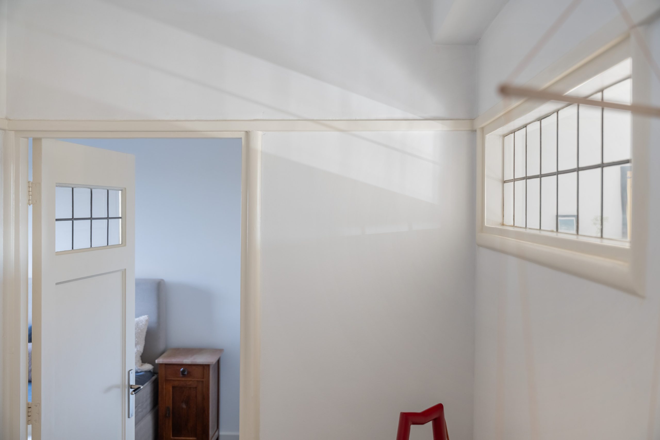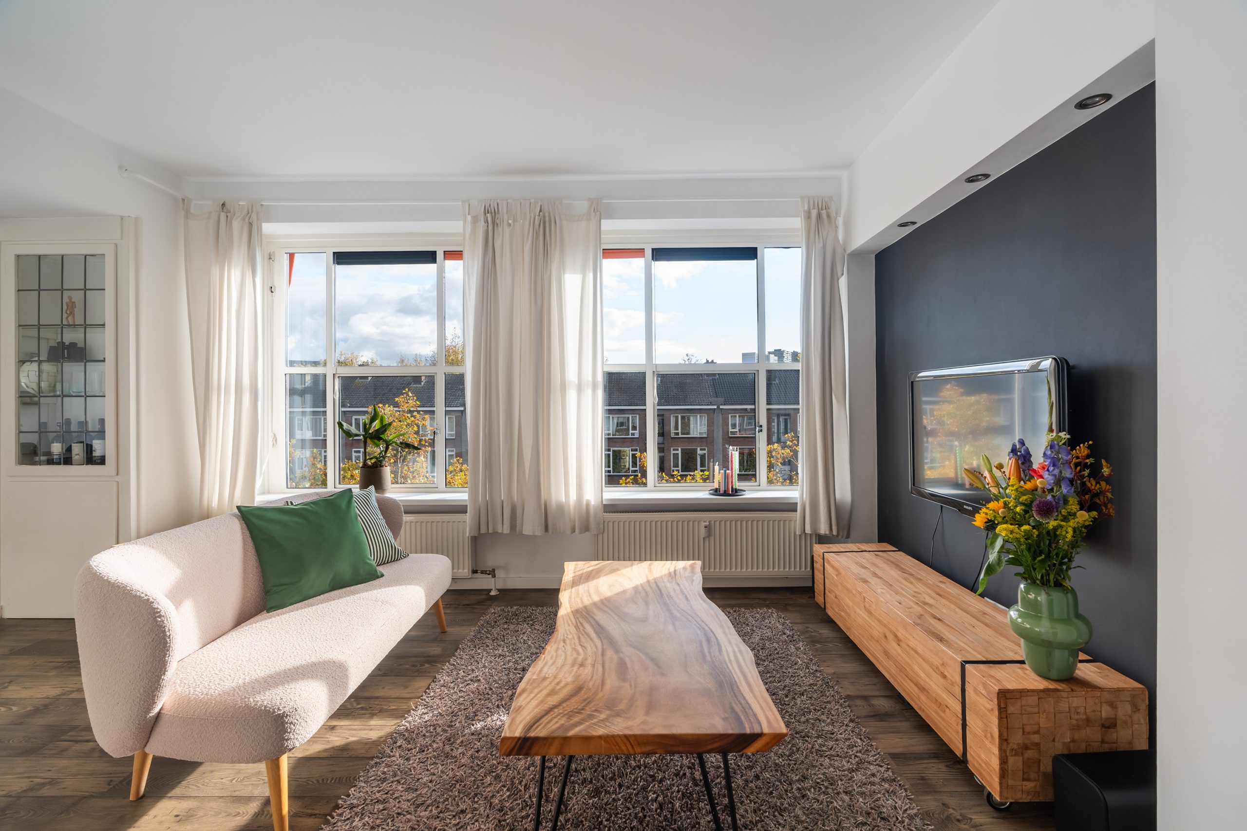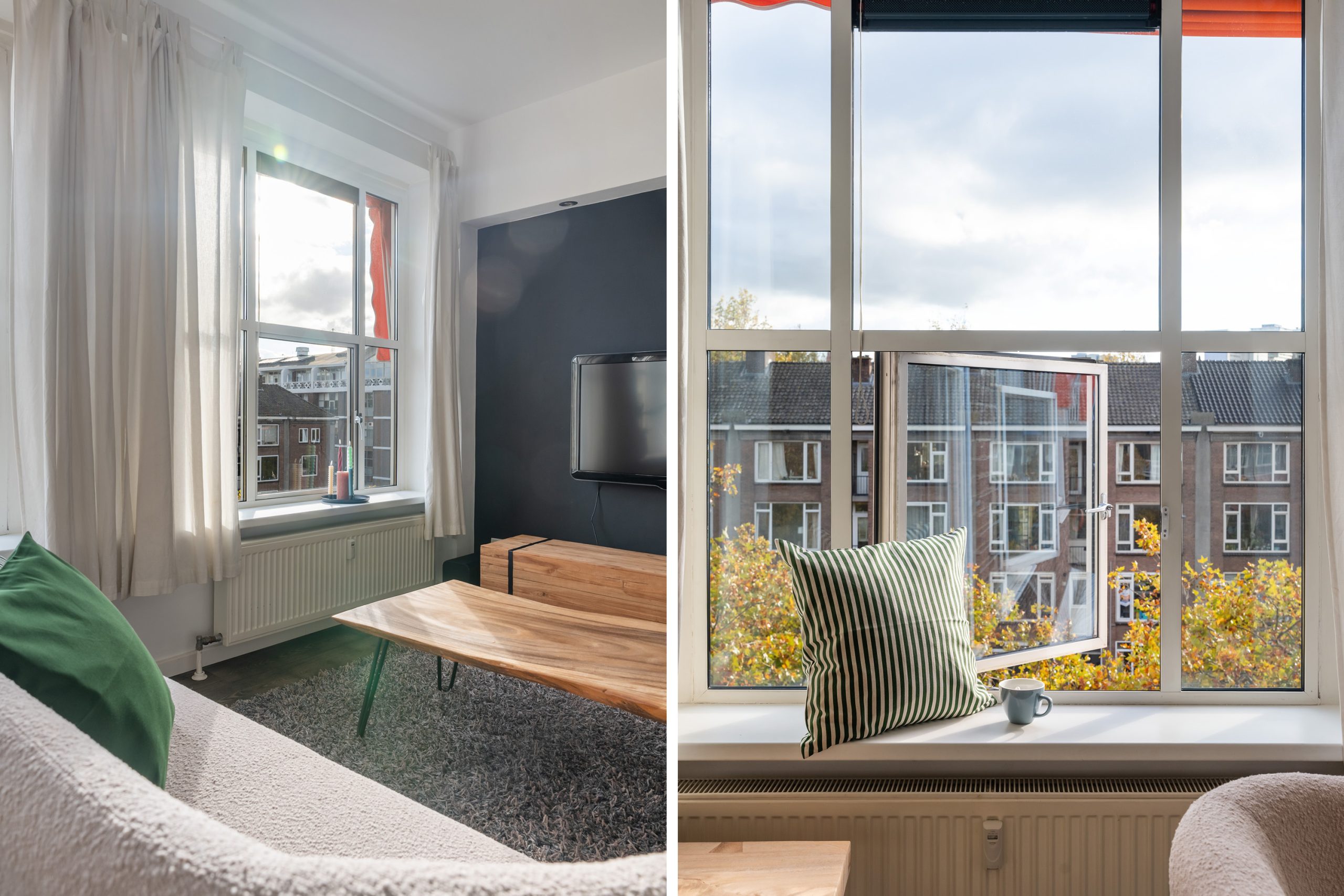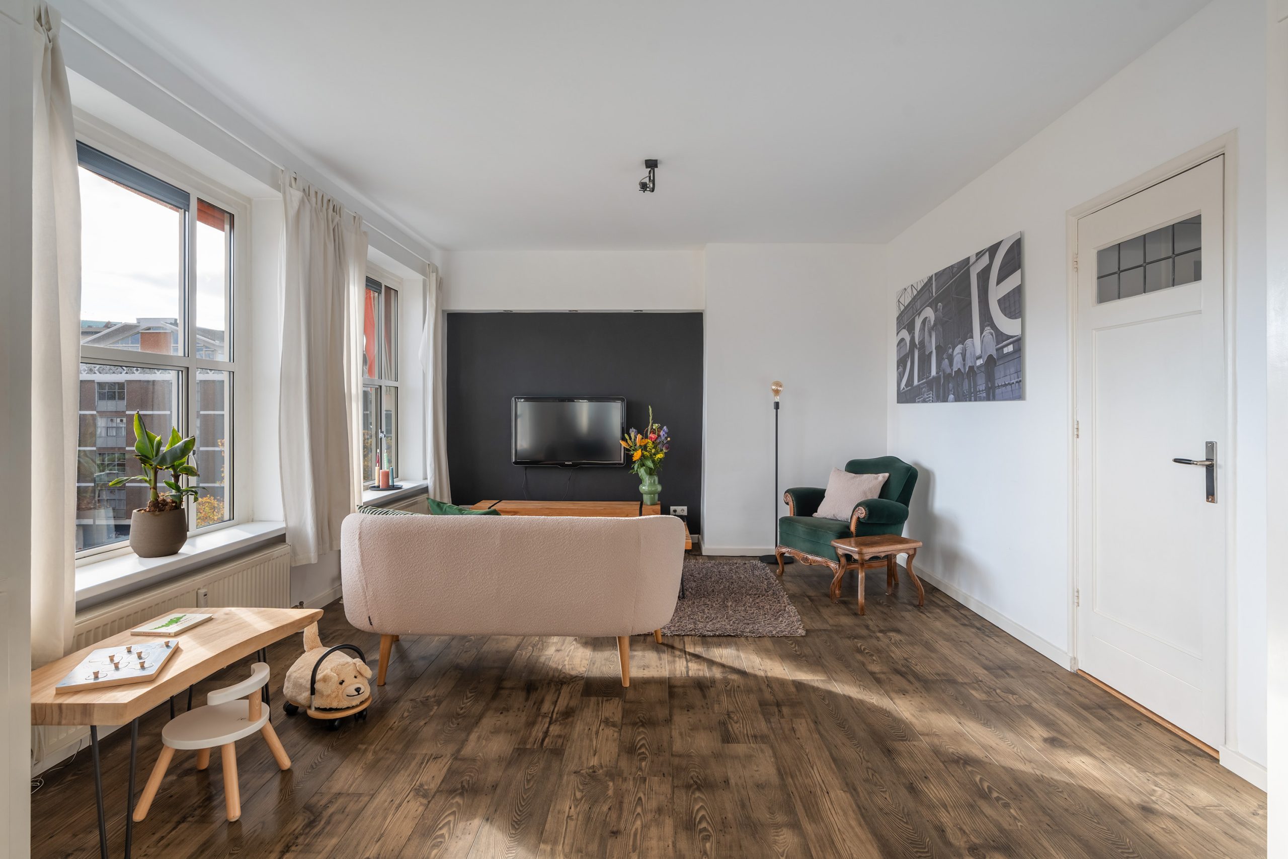 Binnenkomend in de entree die toegang geeft tot de verschillende vertrekken. Bij het binnenkomen in de woonkamer word je meteen verrast door de overvloed aan natuurlijk licht. Een fijne ruimte waar de laminaatvloer en de originele inbouwkasten met glas-in-lood mooi tot hun recht komen in het daglicht. Een lange eettafel of een grote zithoek? Hier kan het allemaal! Doordat de woonkamer is uitgestrekt over de volledige breedte van de woning richt je deze flexibel en geheel naar wens in. Hiervandaan heb je ook toegang tot het heerlijke balkon op het zuiden. Een fijne eigen buitenruimte met zon van ’s ochtends vroeg tot ’s avonds laat onder het genot van de echte stadse sferen.