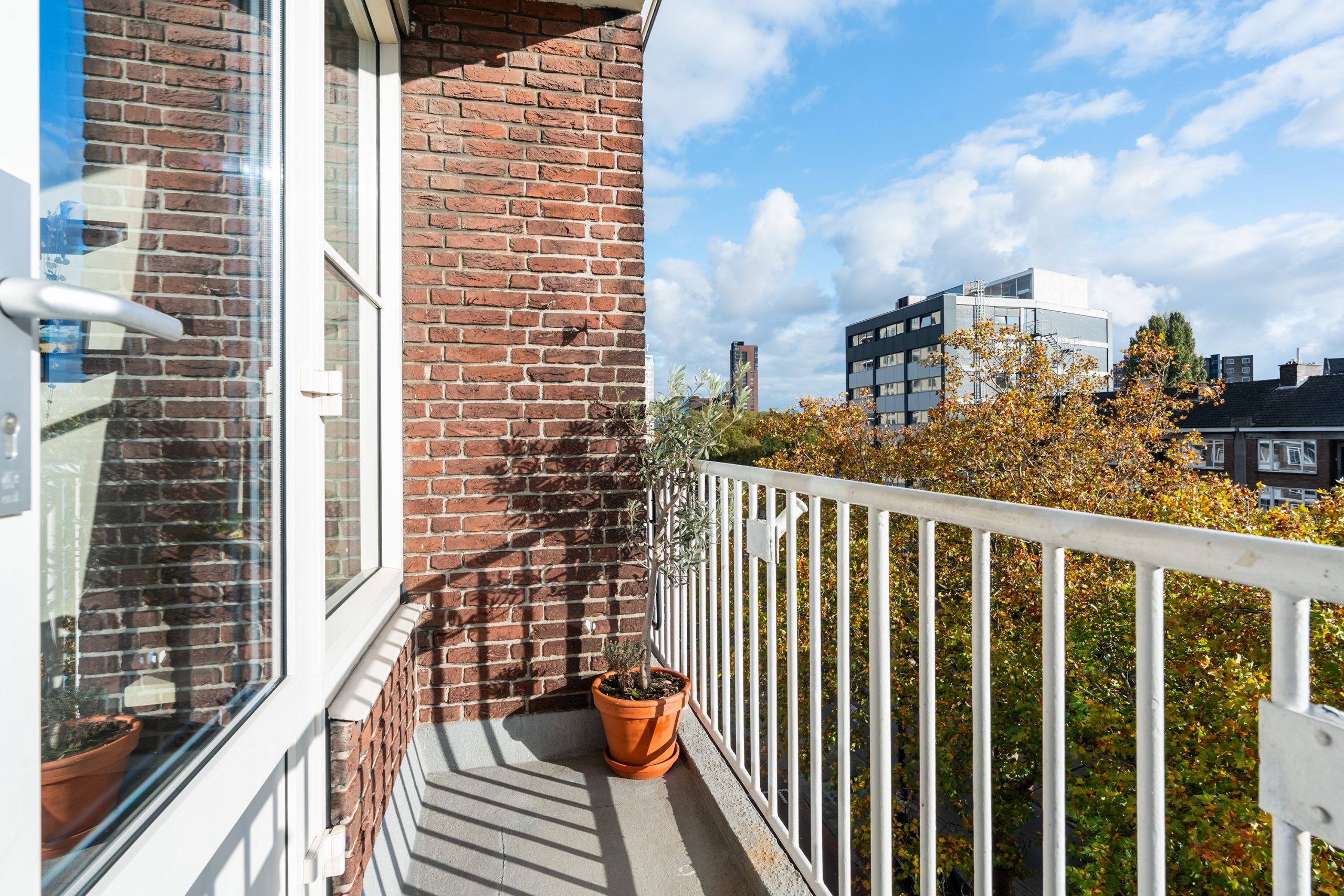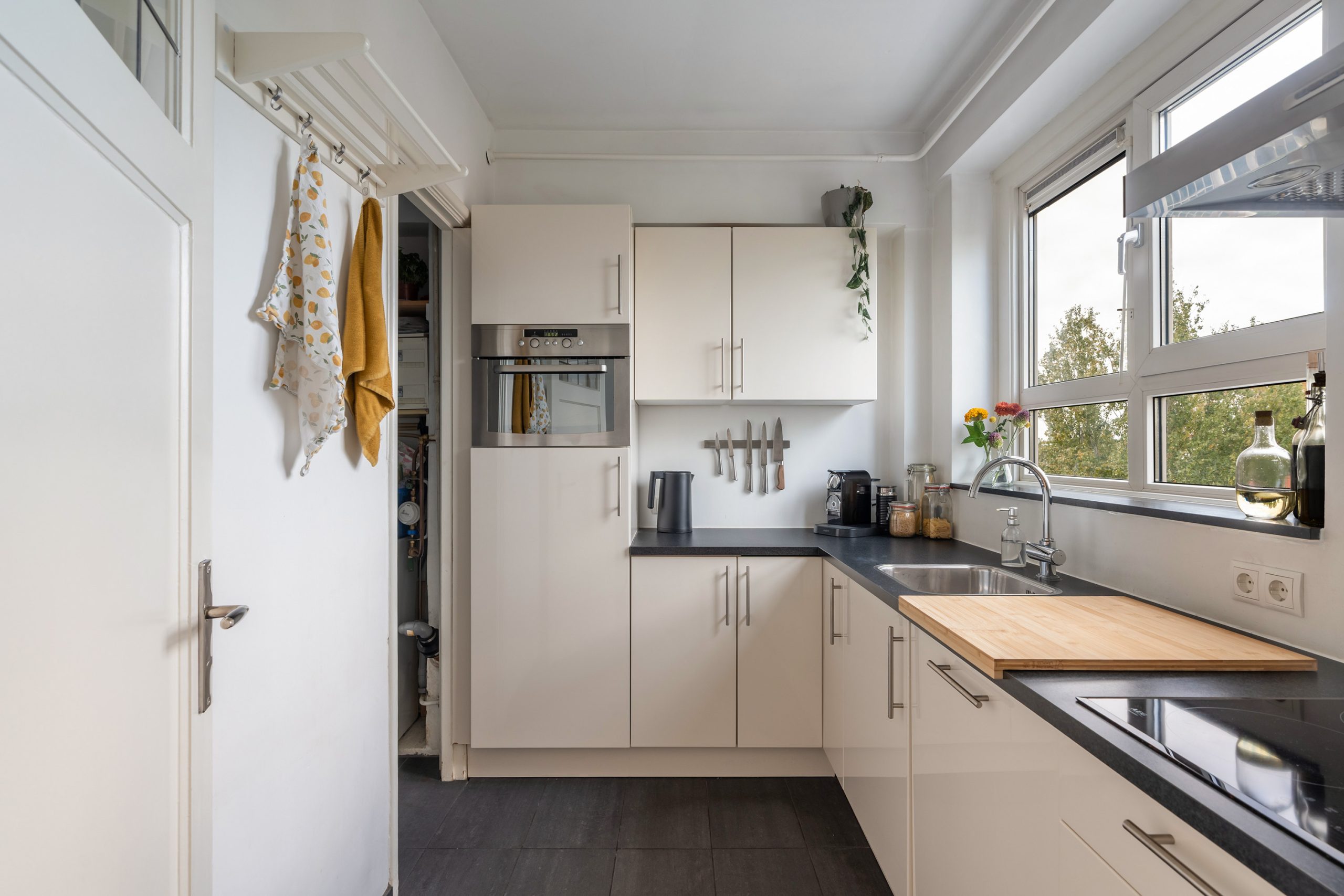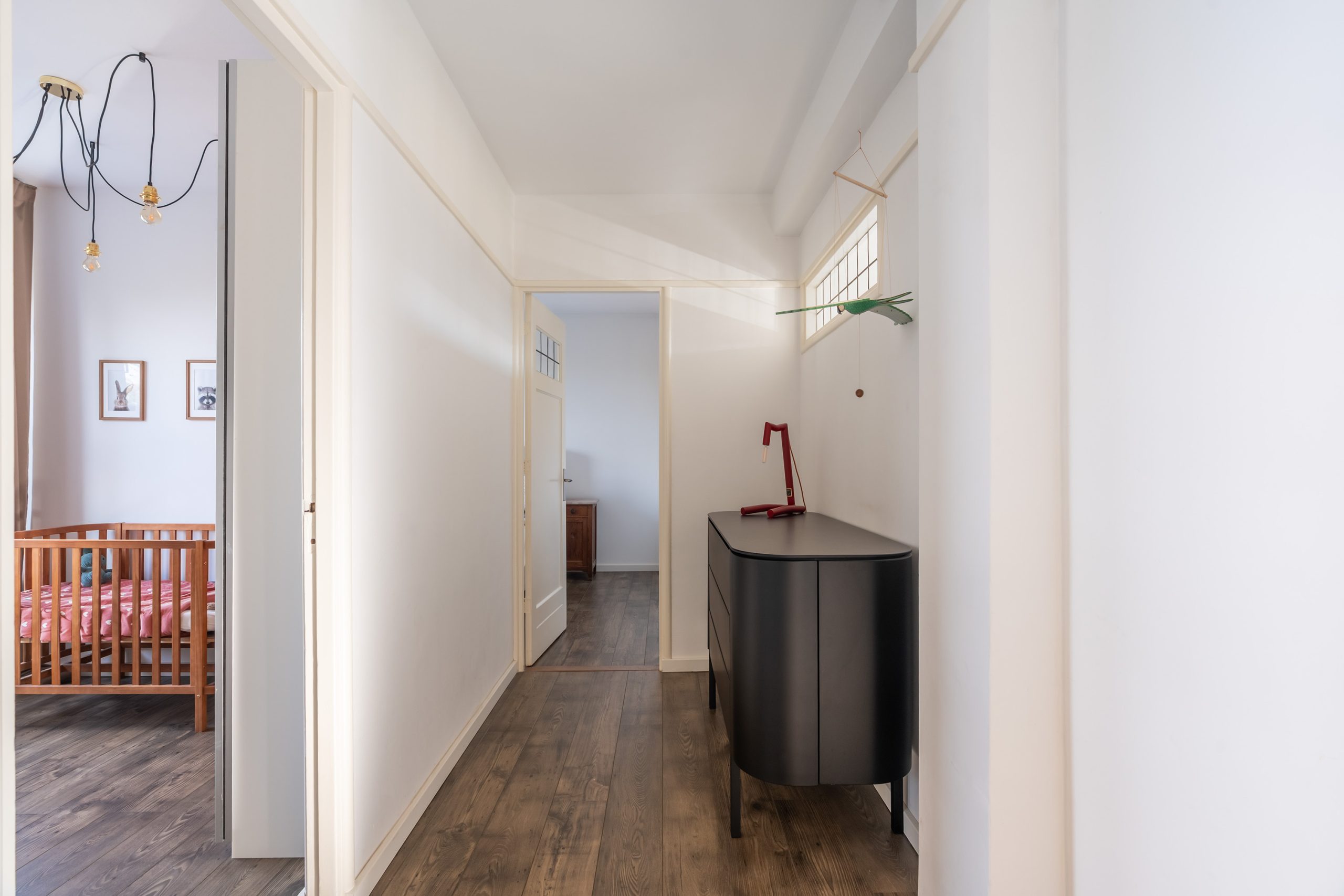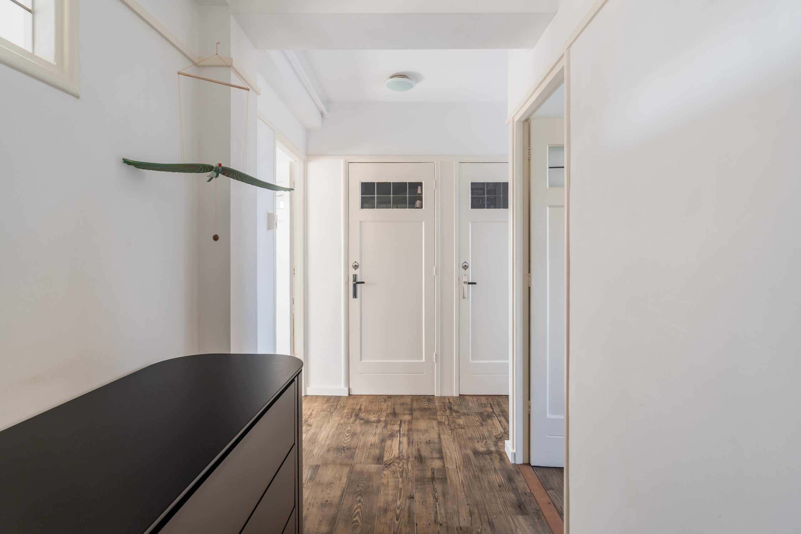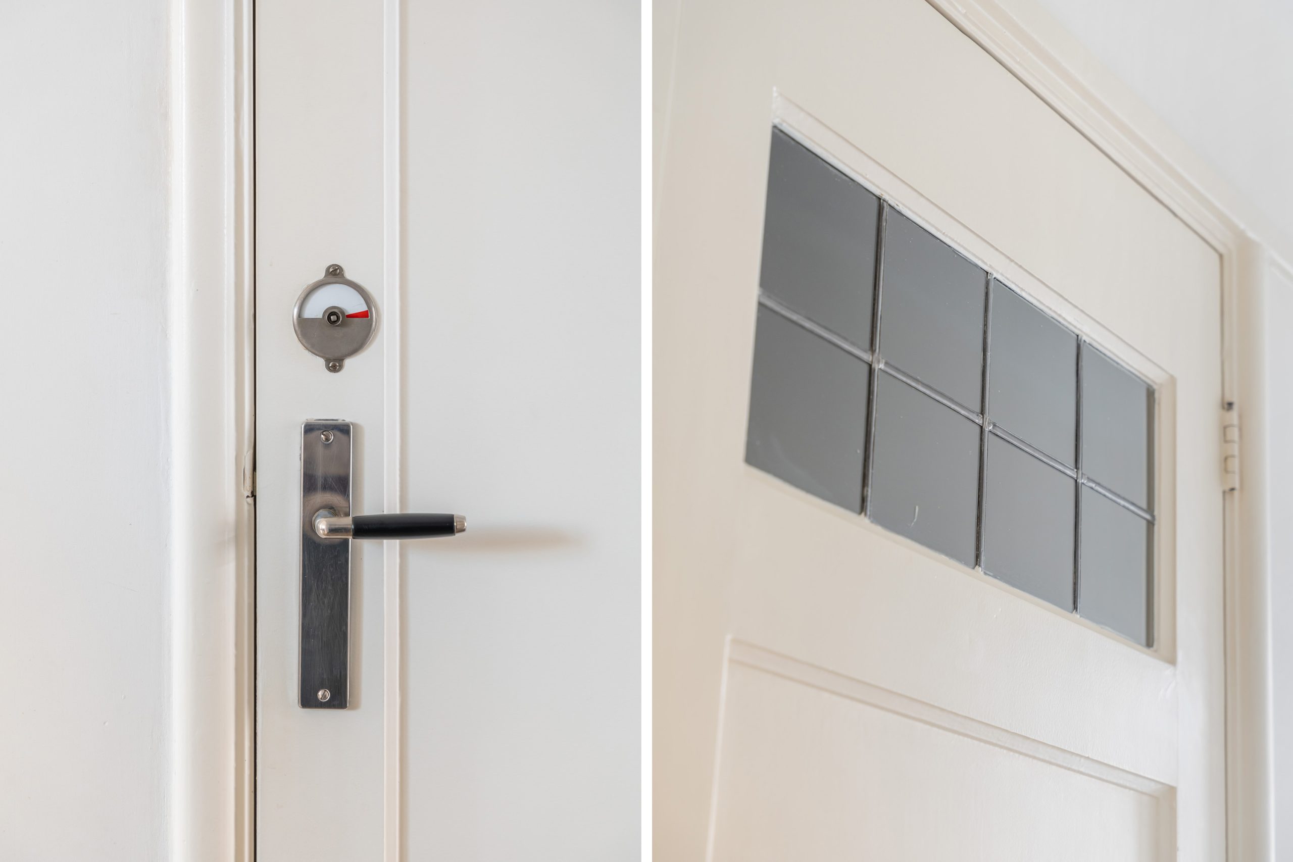 Binnenkomend in de entree die toegang geeft tot de verschillende vertrekken. Bij het binnenkomen in de woonkamer word je meteen verrast door de overvloed aan natuurlijk licht. Een fijne ruimte waar de laminaatvloer en de originele inbouwkasten met glas-in-lood mooi tot hun recht komen in het daglicht. Een lange eettafel of een grote zithoek? Hier kan het allemaal! Doordat de woonkamer is uitgestrekt over de volledige breedte van de woning richt je deze flexibel en geheel naar wens in. Hiervandaan heb je ook toegang tot het heerlijke balkon op het zuiden. Een fijne eigen buitenruimte met zon van ’s ochtends vroeg tot ’s avonds laat onder het genot van de echte stadse sferen.