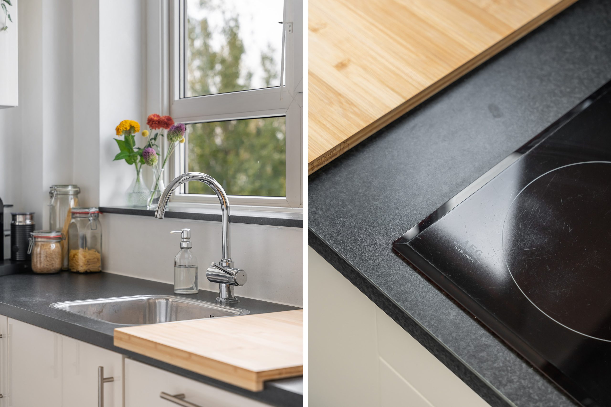 De keuken is ook te bereiken vanuit de hal. Deze beschikt over inbouwapparatuur als een kookplaat, afzuigkap, koelkast, vaatwasser en een vriezer, waardoor jij binnen een handomdraai iets lekkers op tafel zet! Vanuit hier is tevens de praktische berging met wasmachineaansluiting te bereiken.