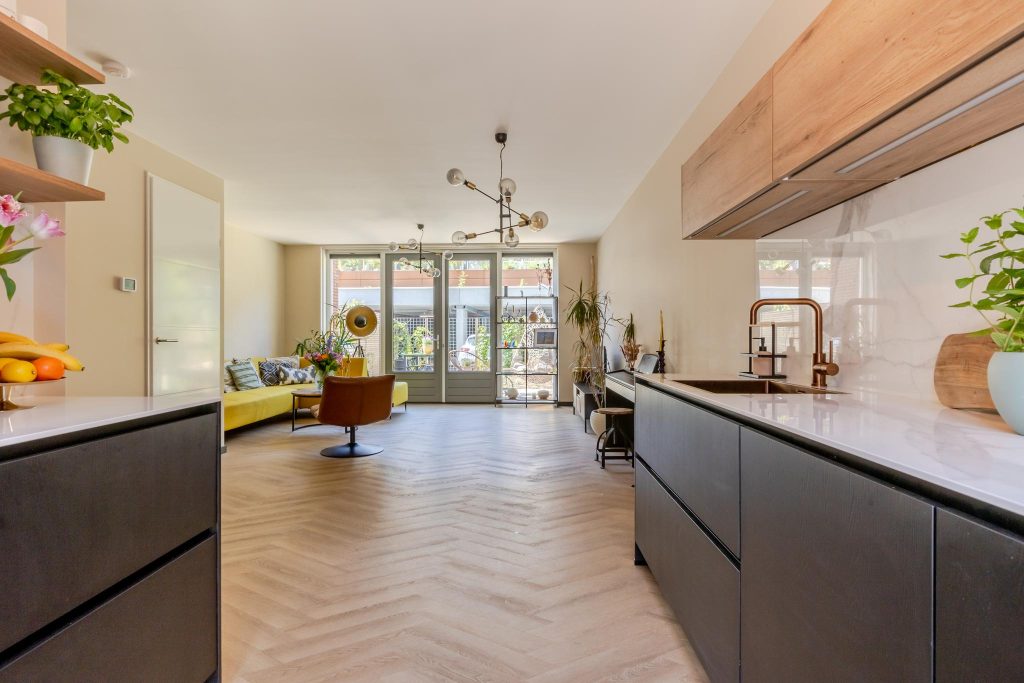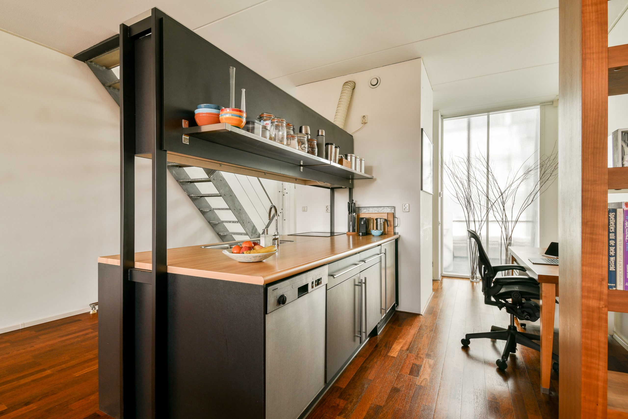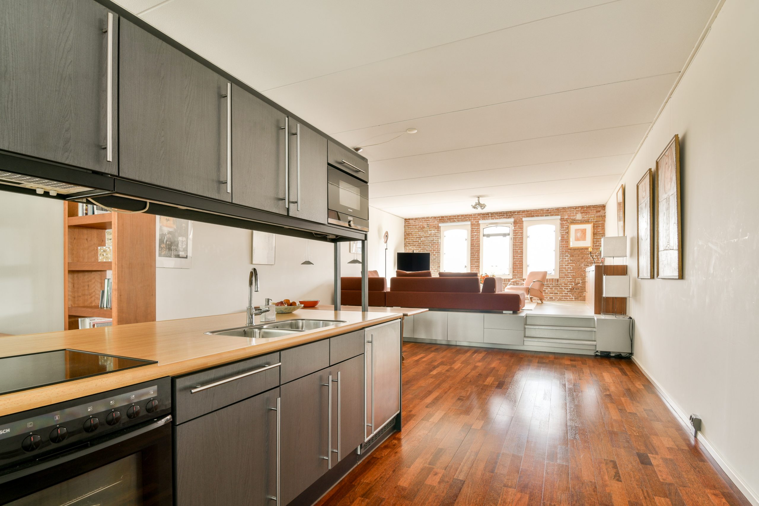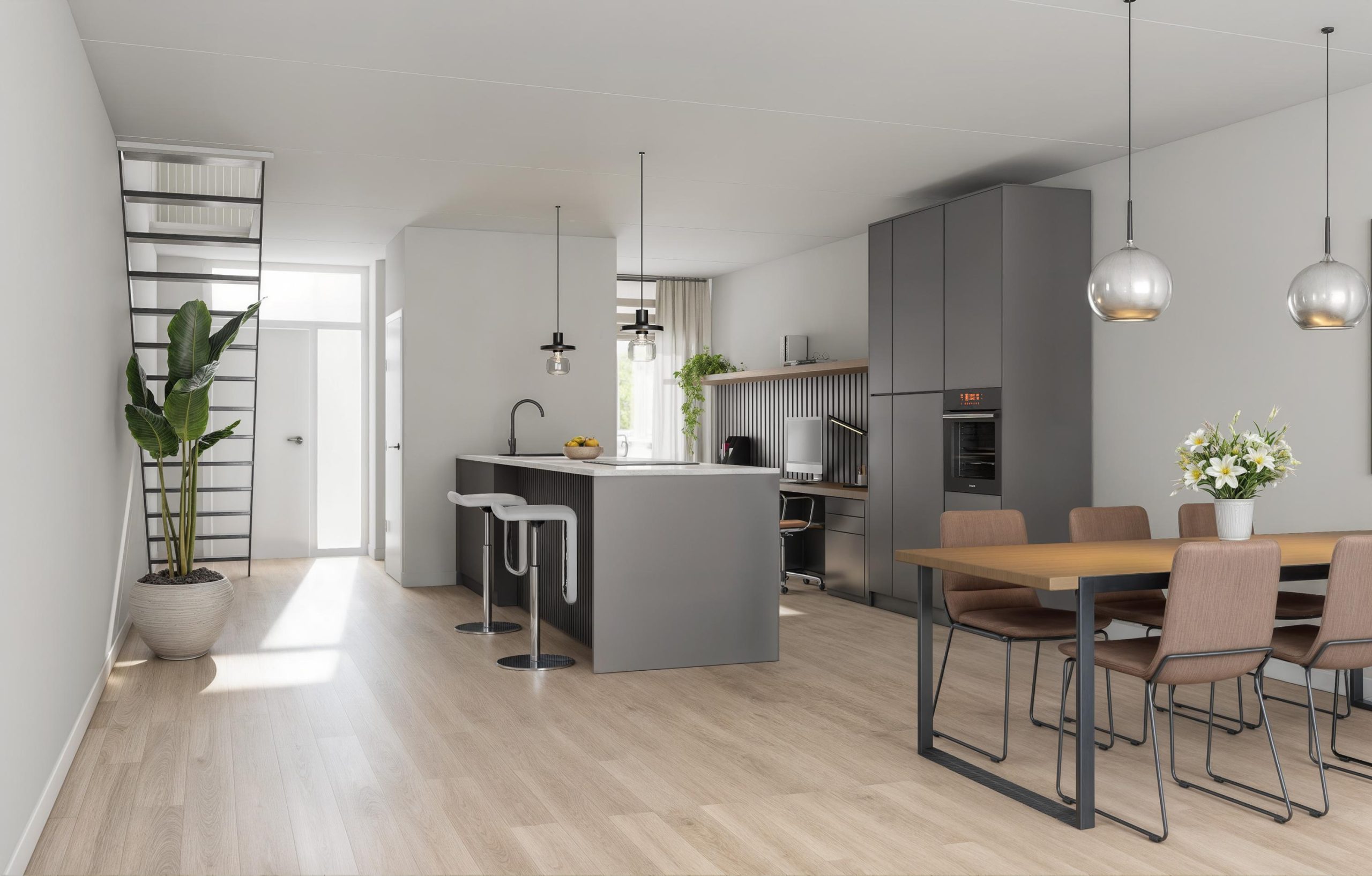 De open keuken vormt het kloppend hart van deze woonlaag. Met een strak kookblok en aan weerszijden praktische kastenwanden, is er alle ruimte om te koken en samen te komen. Uiteraard is de keuken compleet uitgerust met een vaatwasser, oven, kookplaat én magnetron, alles wat je nodig hebt voor dagelijks comfort of het ontvangen van gasten.