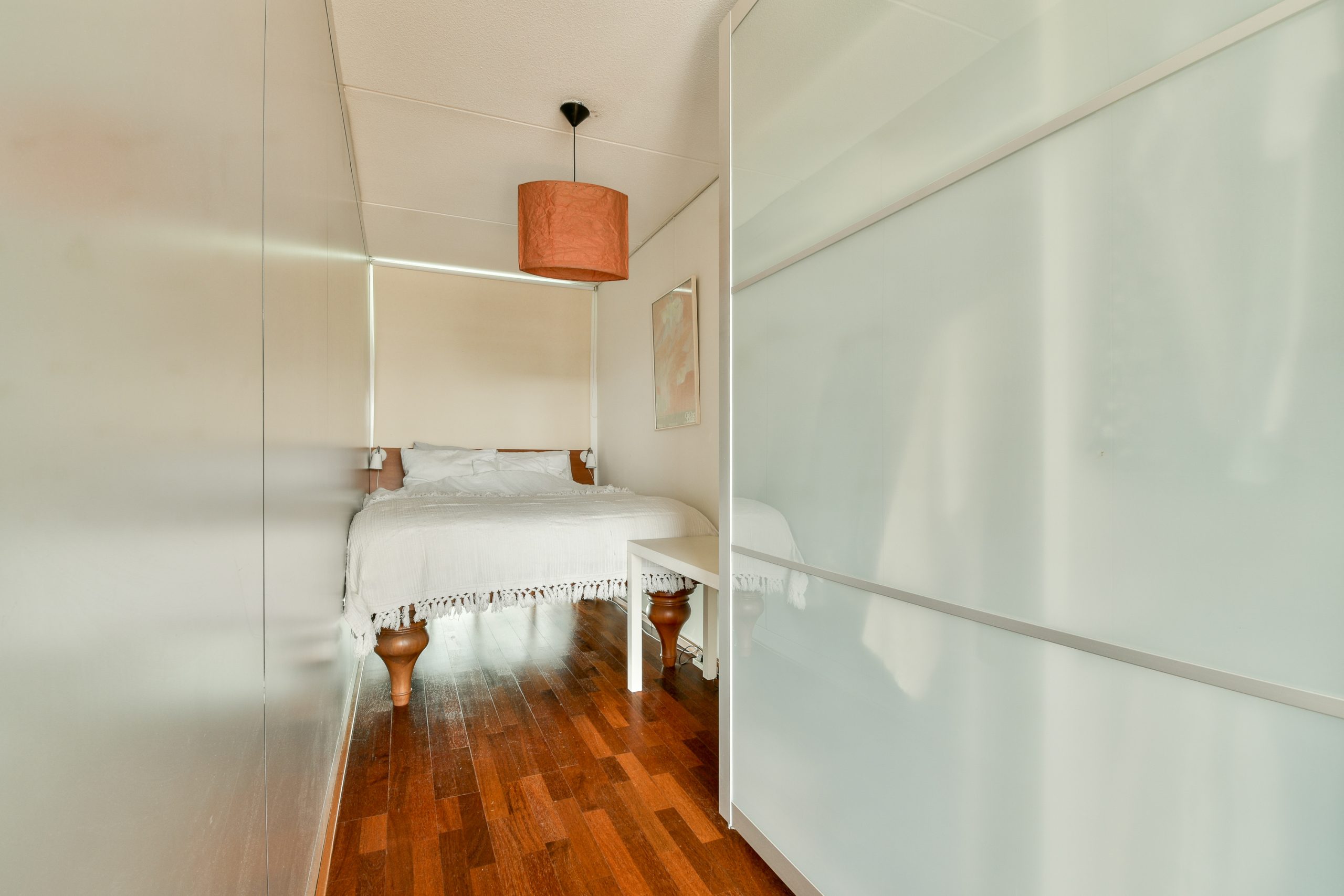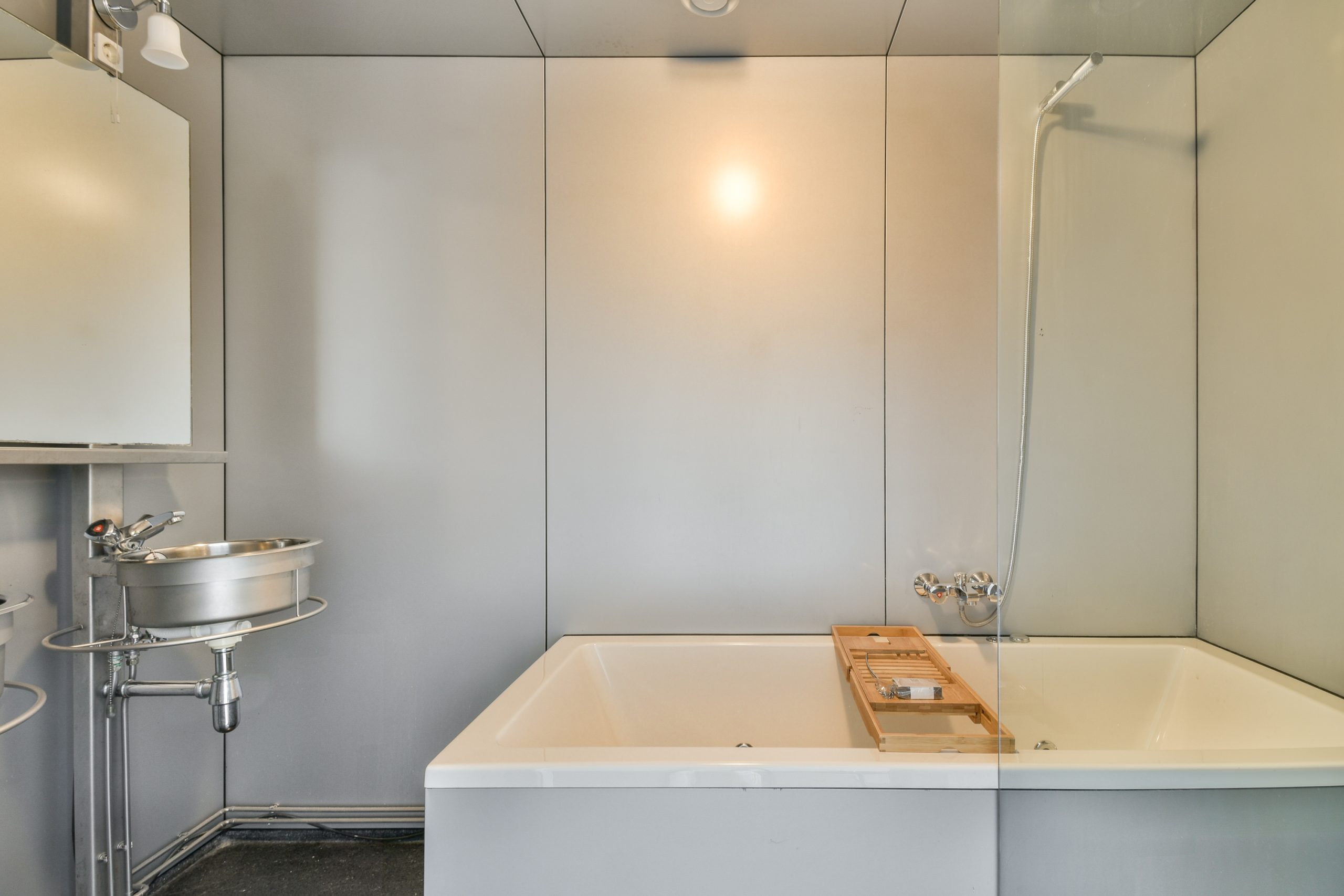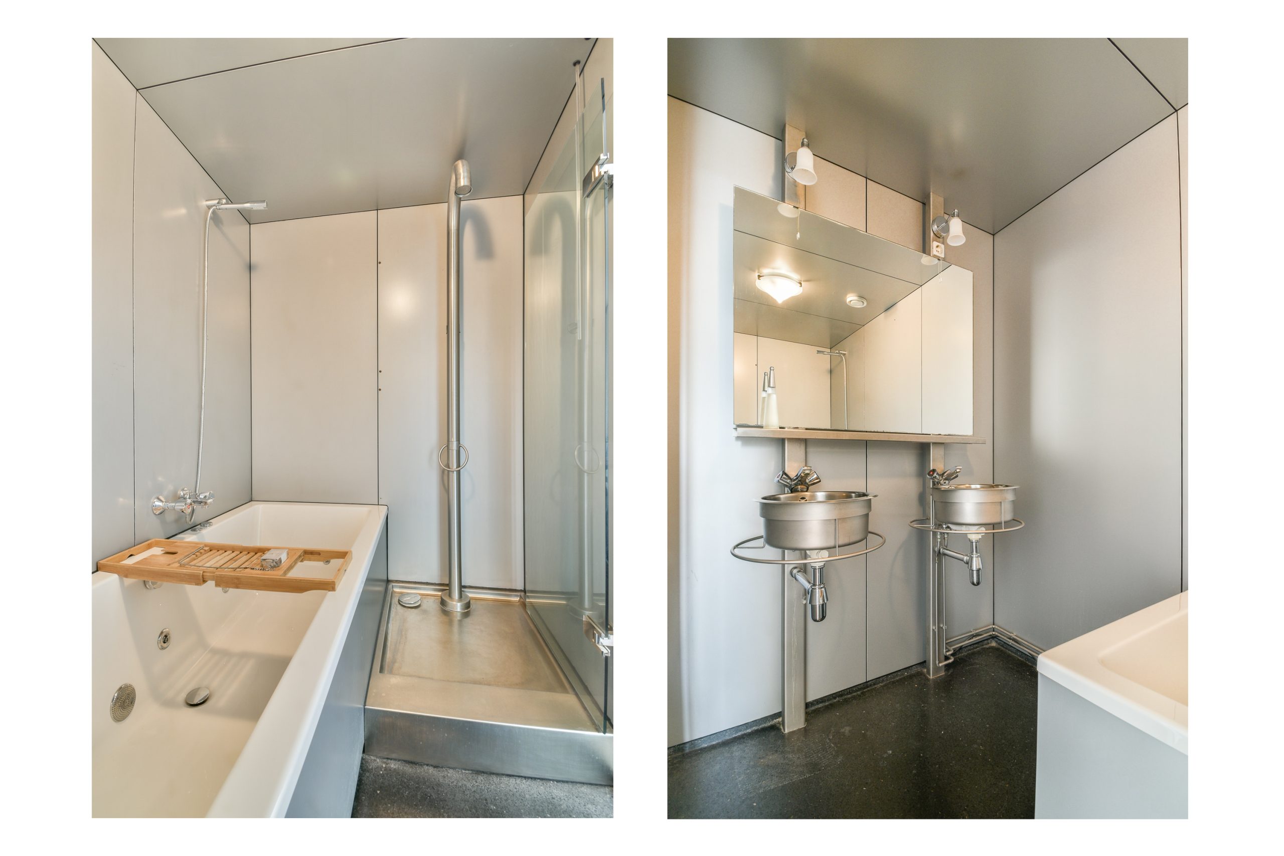 Aan de terraszijde bevindt zich een heerlijk tweede woongedeelte, waar het daglicht rijkelijk naar binnen stroomt en binnen moeiteloos overgaat in buiten. Aan de andere zijde van de verdieping vind je de rustig gelegen slaapkamer, een intieme plek om je even helemaal terug te trekken. De moderne badkamer voelt als een elegante kajuit, compleet met een comfortabel ligbad, een aparte douche en een dubbele wastafel. In de hal bevinden zich het separate toilet en een praktische wasruimte met opstelplaats voor wasmachine en droger.
