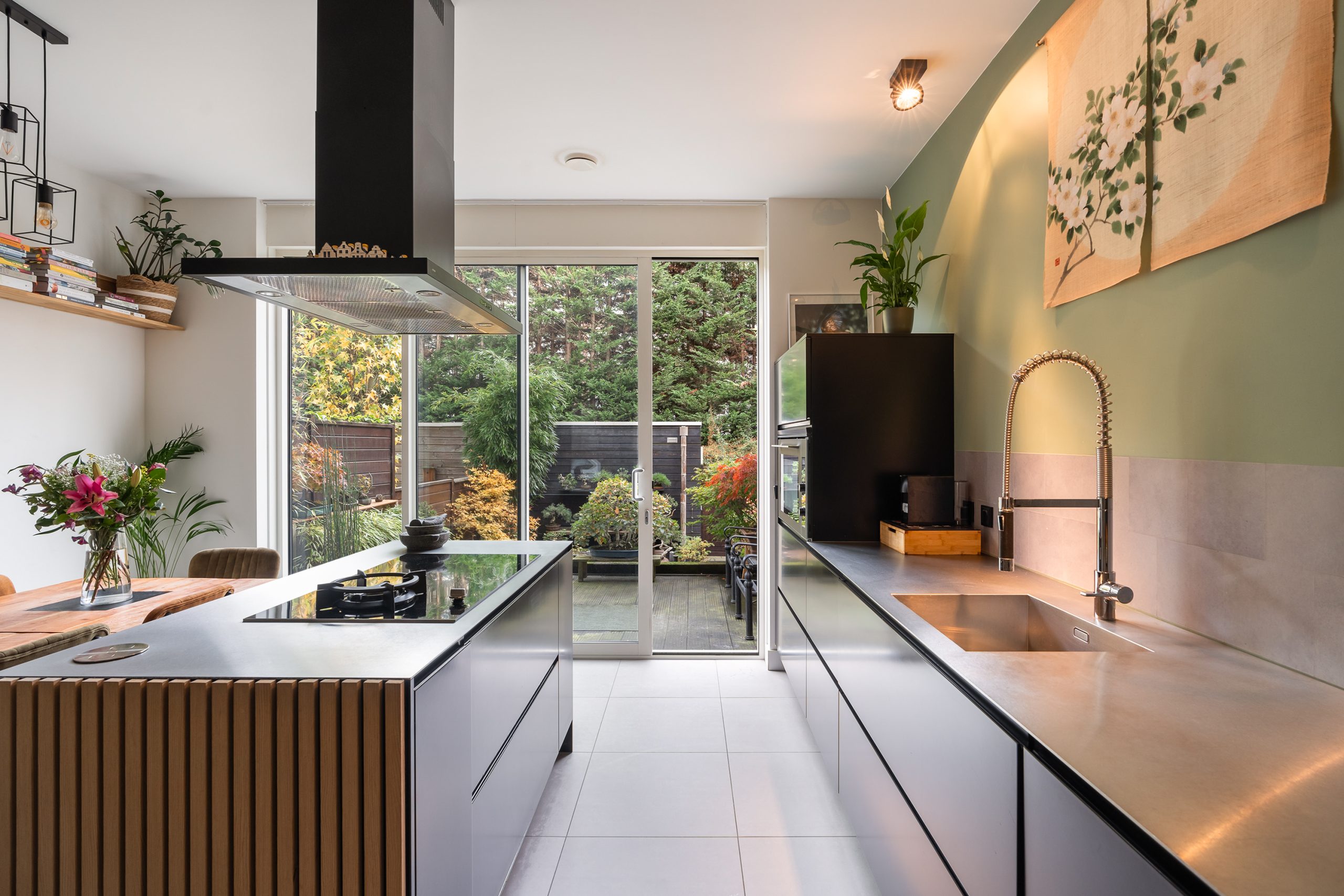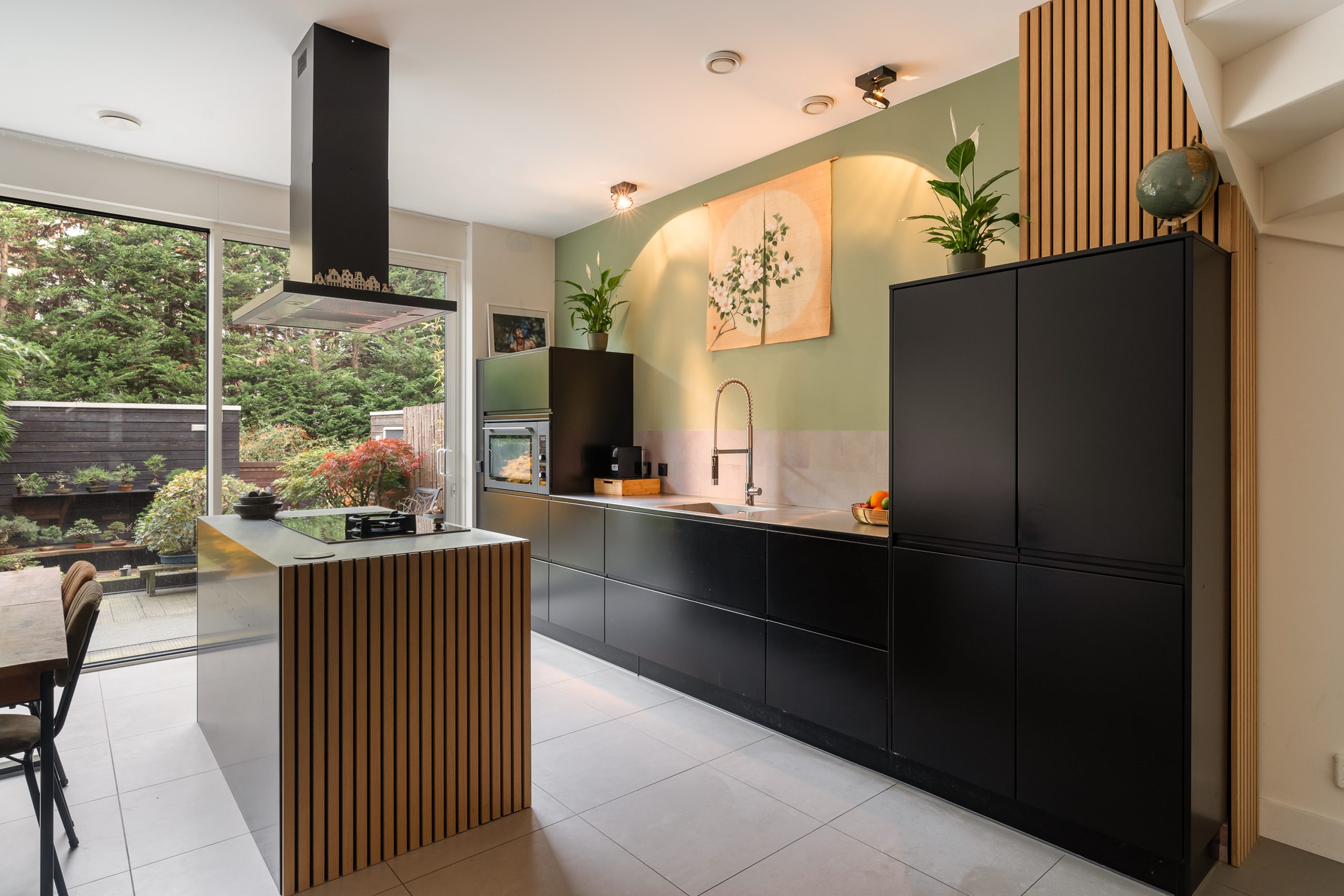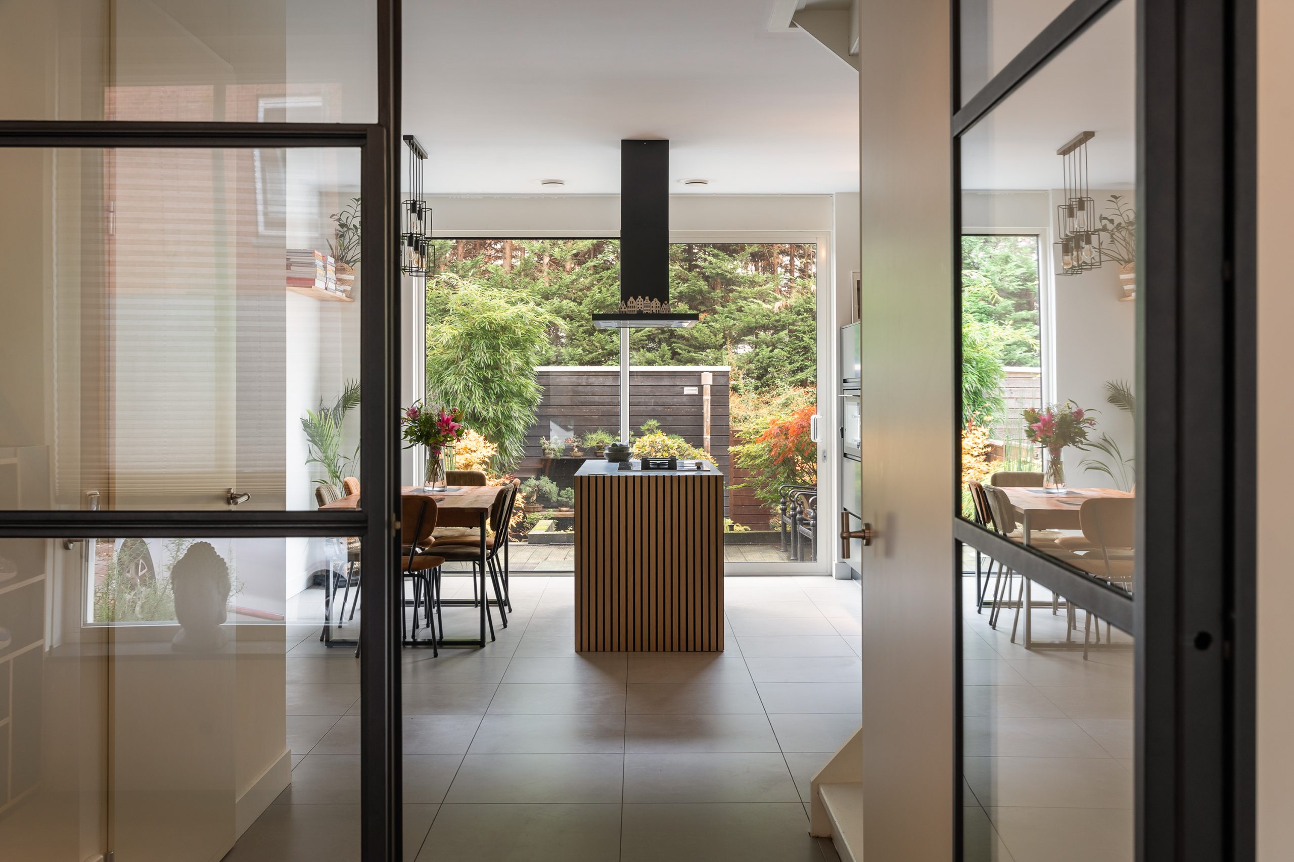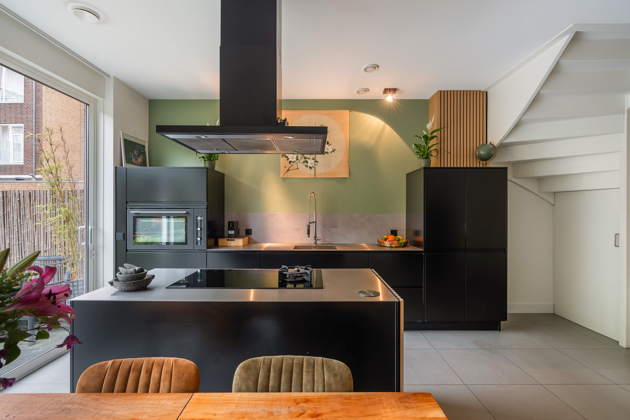 Stap binnen in de ruime entree, waar volop plek is voor een royale garderobe – een warm en stijlvol welkom! Via de brede, hoge glas-in-staalwand met openslaande deuren bereik je de woonkeuken, het kloppend hart van het huis. Hier draait alles om samen genieten: koken, tafelen en het buitenleven. De riante keuken met kookeiland is met oog voor detail ingericht. Het robuuste RVS-aanrechtblad, de grote 90 cm Atag-oven, de luxe spoelkraan, de vaatwasser en de inductiekookplaat met wokbrander maken koken extra comfortabel. Dankzij de praktische ruimte naast het kookeiland is er plek voor een lange eettafel waar een groot gezelschap kan aanschuiven voor een uitgebreid diner. Aan de achterzijde zorgt de grote schuifpui voor een naadloze overgang naar de smaakvol aangelegde achtertuin. Hier kun je de hele dag door genieten van zon en rust, met ruimte om meerdere zitjes te creëren voor elk moment. De tuin beschikt bovendien over een praktische achterom en een ruime schuur voor fietsen en extra opbergruimte.