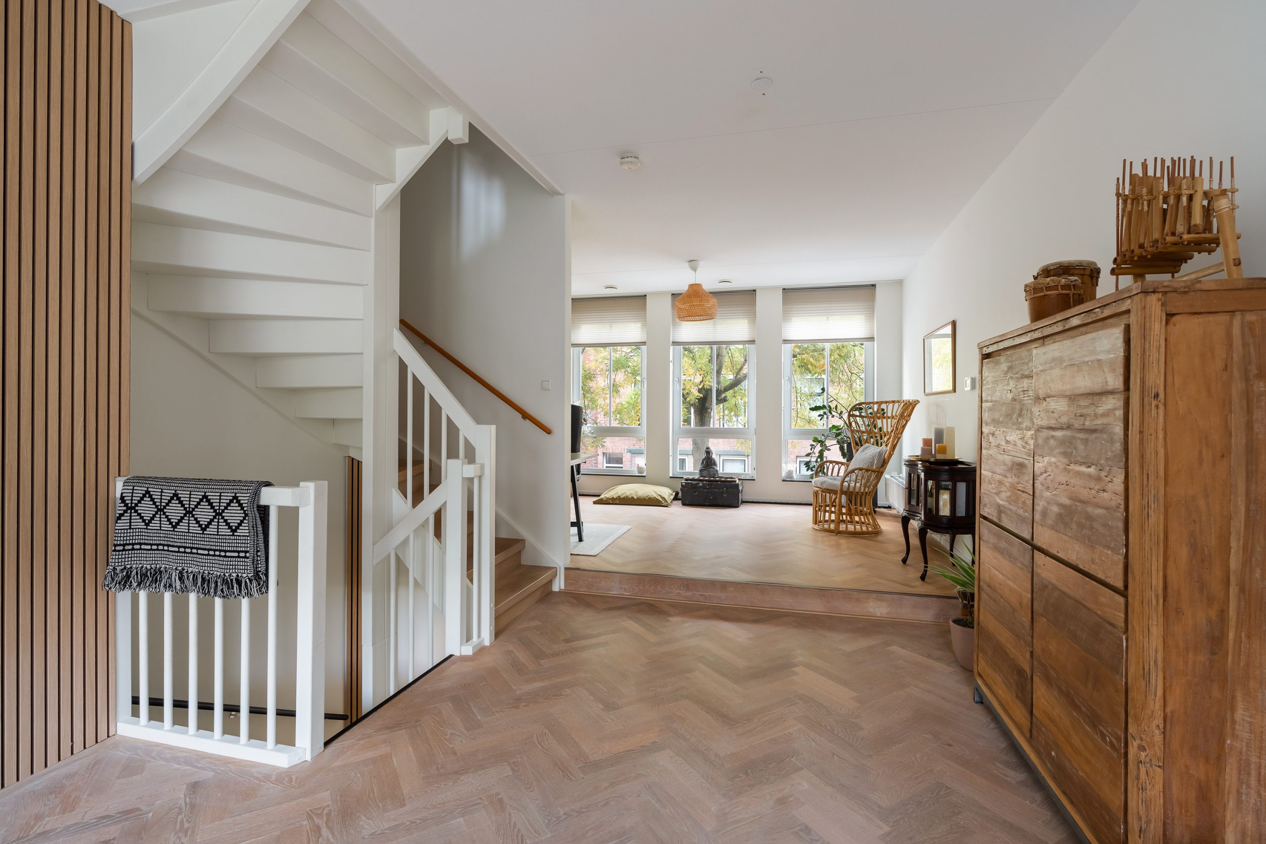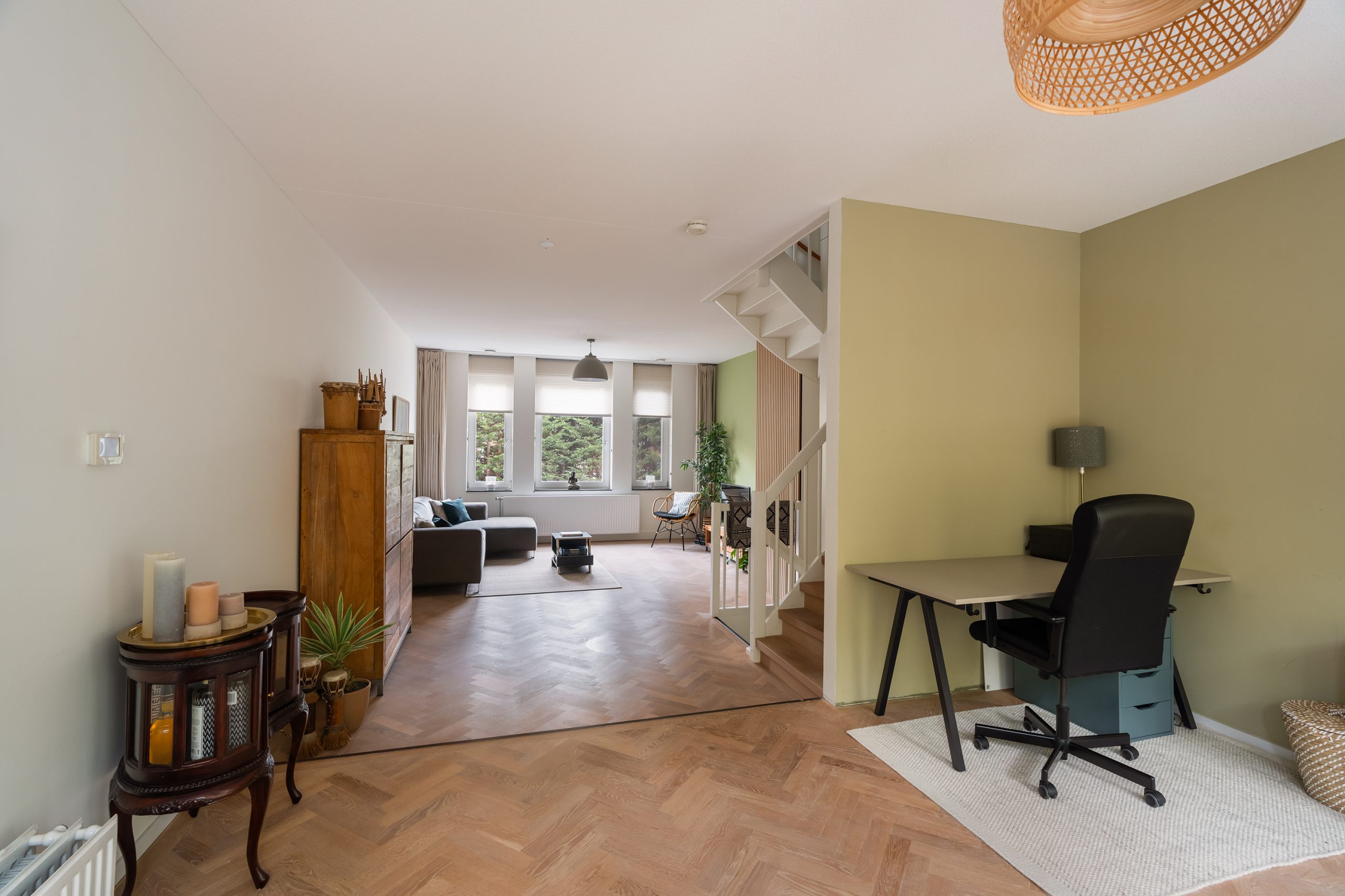 Betreed vanaf de begane grond de living op de eerste etage en voel je direct thuis. De stijlvolle afwerking met een prachtige visgraatvloer en strak afgewerkte wanden en plafonds geeft de ruimte een luxe uitstraling. Doordat de living zich uitstrekt over de volledige lengte van het pand, zijn de indelingsmogelijkheden eindeloos. Creëer bijvoorbeeld twee comfortabele zithoeken, een werkplek of een fijne speelruimte voor de jongste van het gezin.