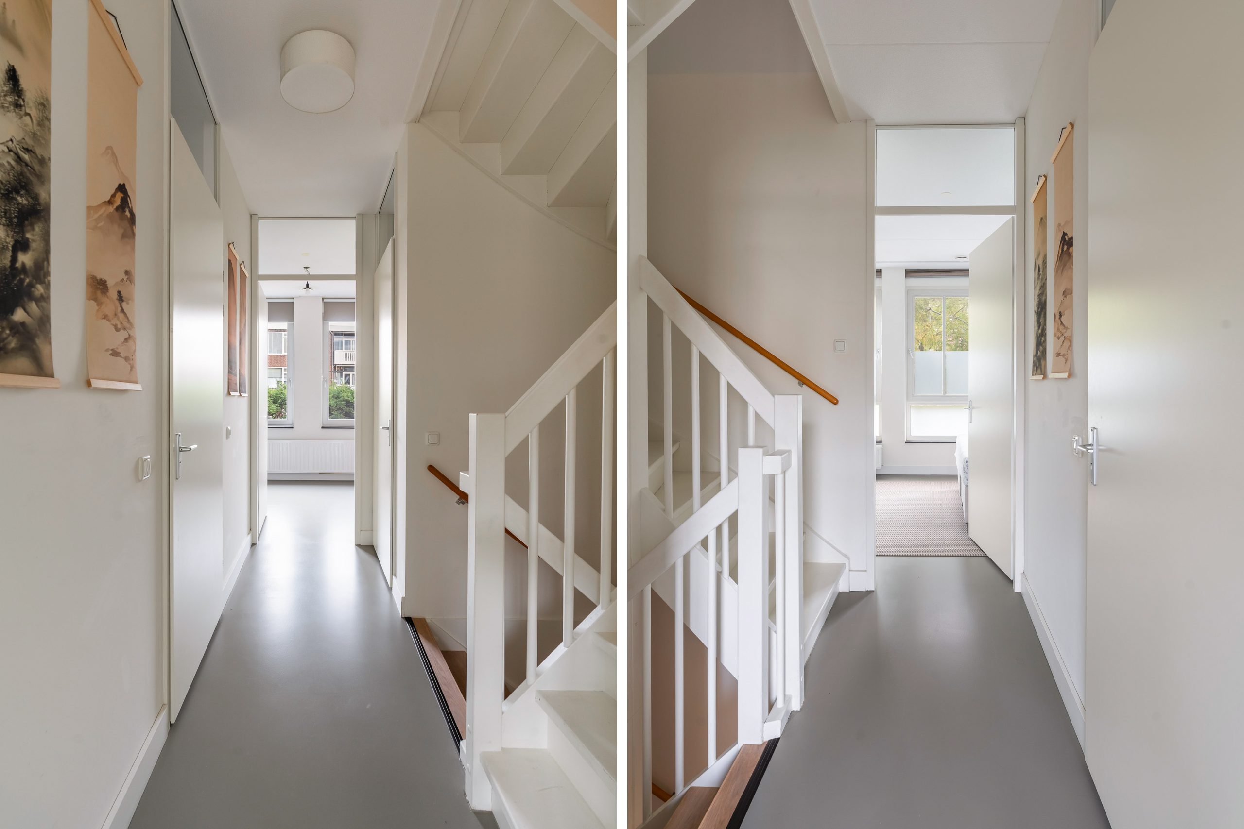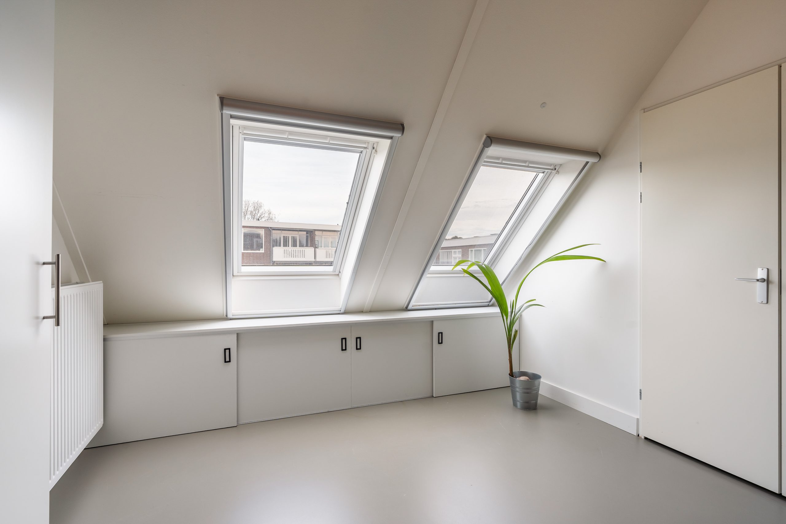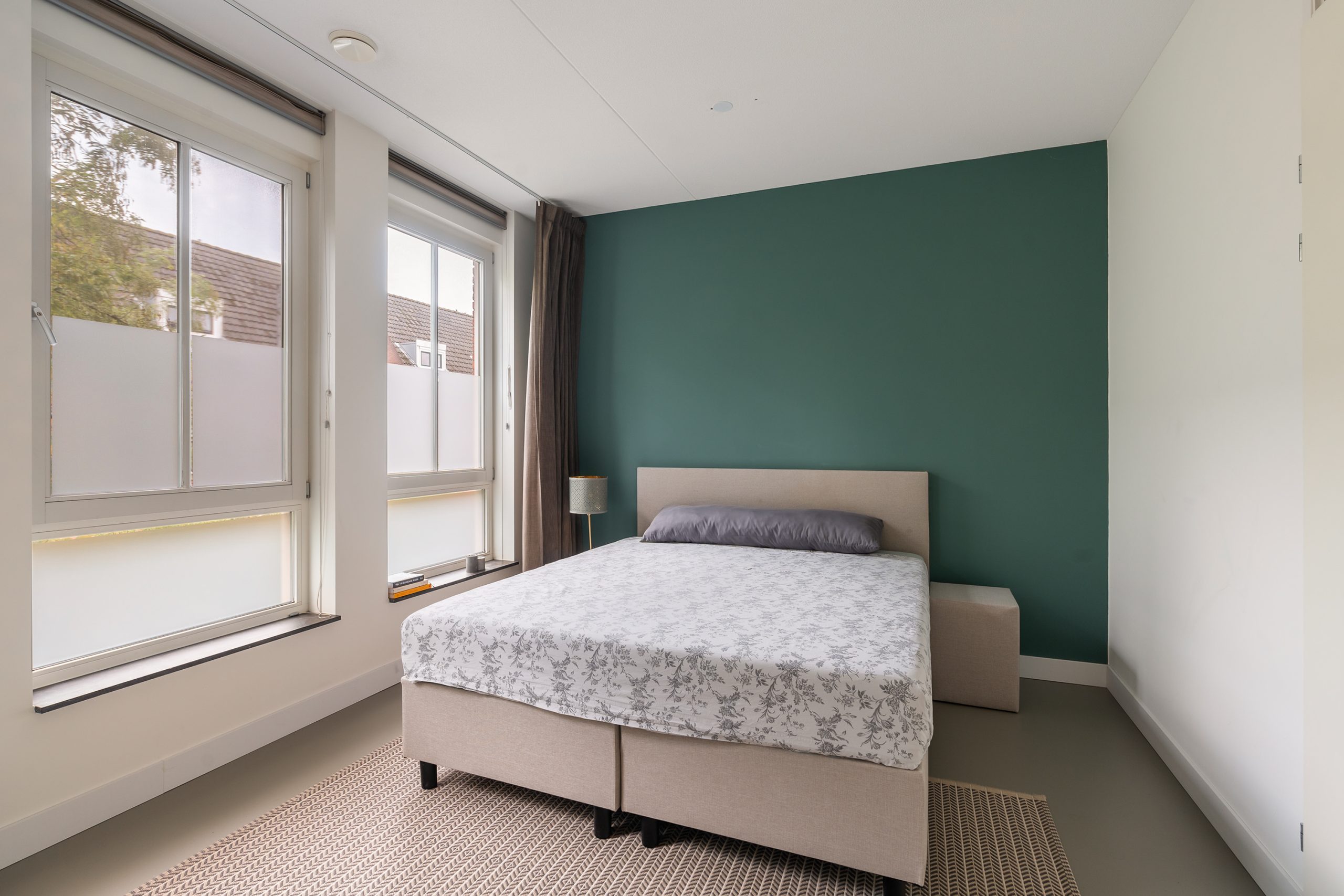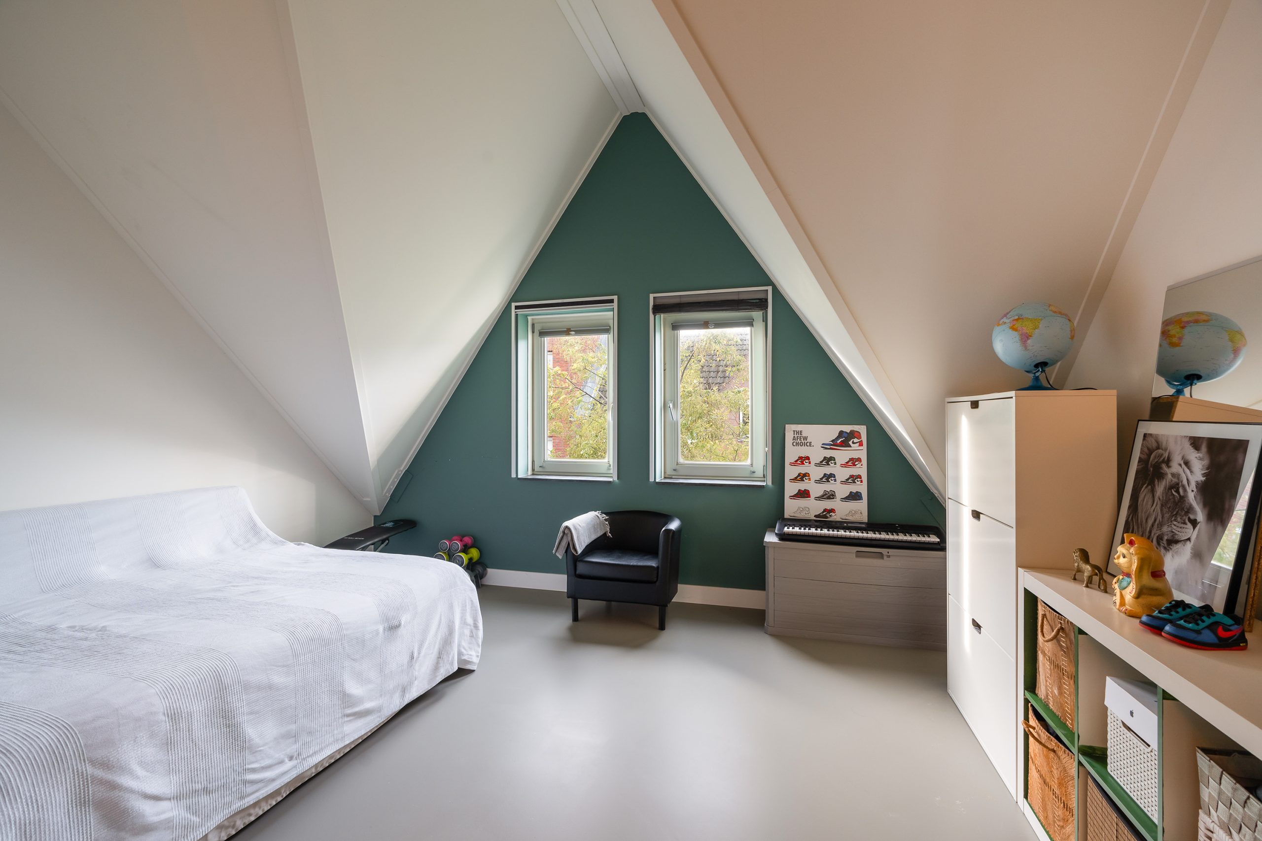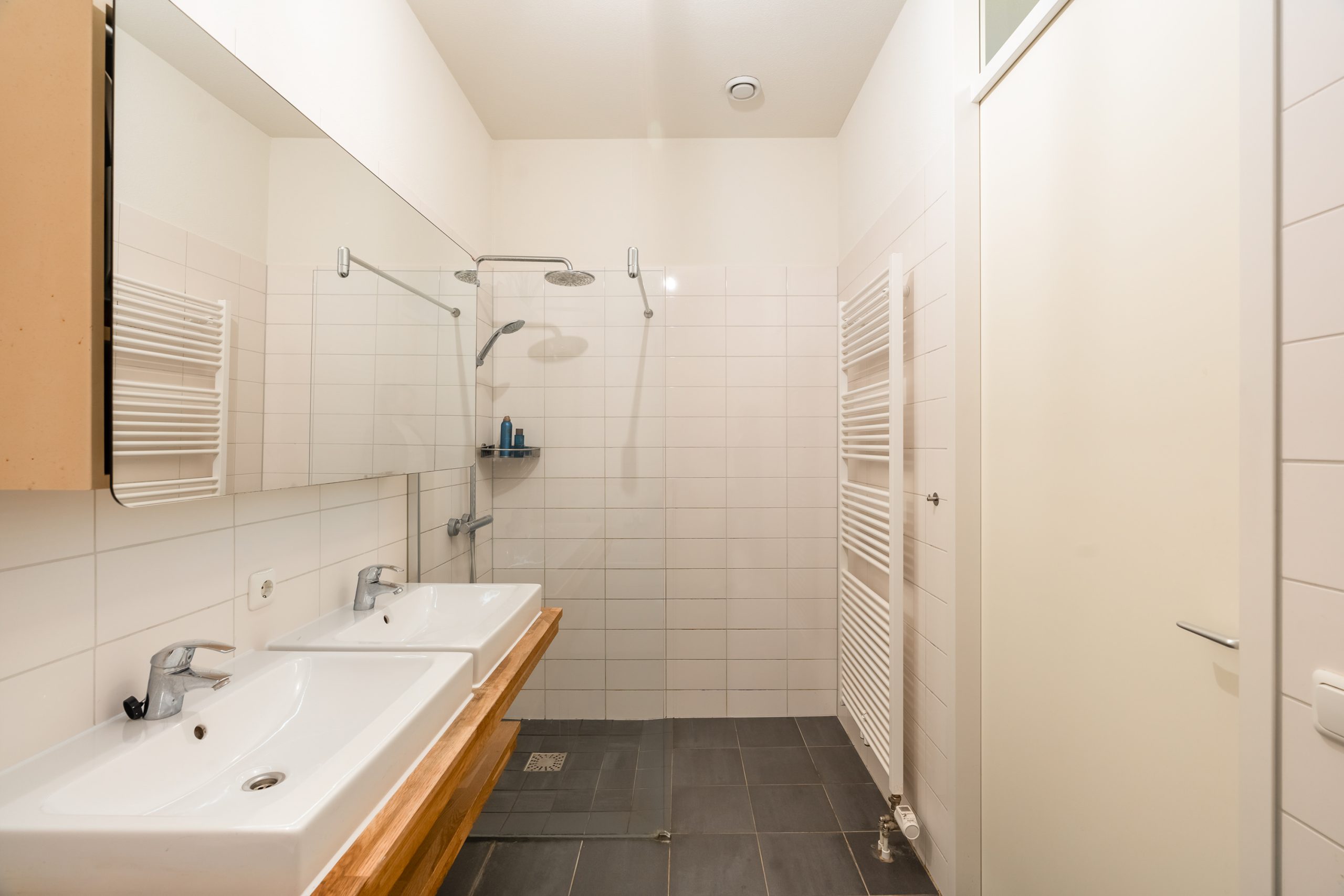 Vanaf de overloop heb je toegang tot twee ruime slaapkamers en de badkamer. Deze gehele etage is voorzien van een toffe gietvloer. De slaapkamers zijn vrijwel even groot, waardoor beide uitstekend kunnen dienen als hoofdslaapkamer – ideaal voor bijvoorbeeld een gezin of een logeerkamer met hotelgevoel. Dankzij de grote raampartijen zijn de kamers heerlijk licht en bieden ze een rustgevend uitzicht. De badkamer is royaal van formaat en grotendeels betegeld, wat zorgt voor een verzorgde en rustige uitstraling. Hier geniet je van een ligbad voor de ontspannen momenten, een inloopdouche voor een frisse start van de dag, en een dubbele wastafel met meubel en spiegelkast voor extra comfort en opbergruimte.