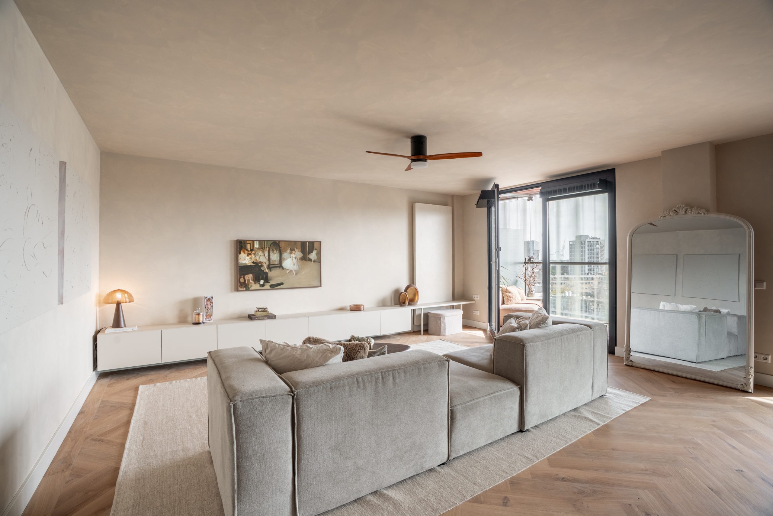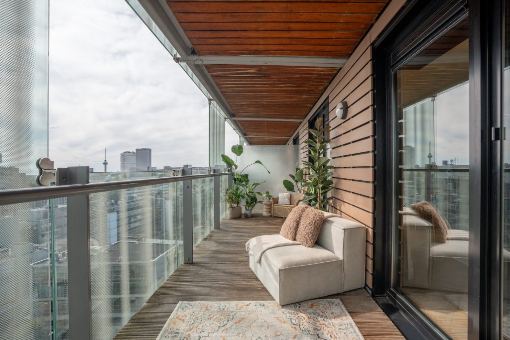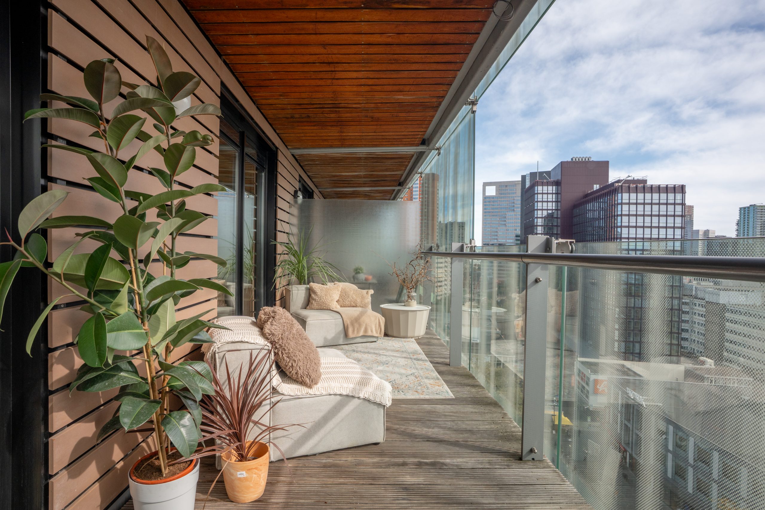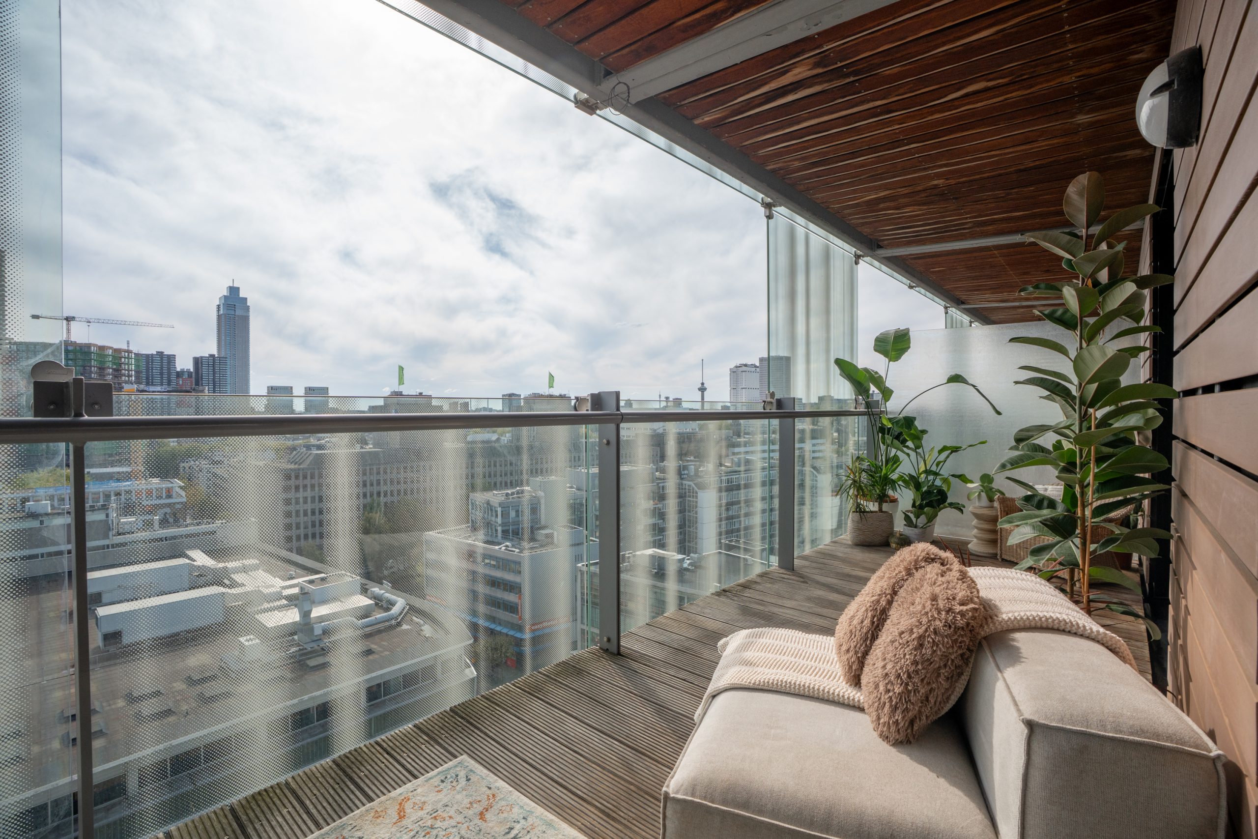De living is royaal opgezet, waardoor er volop ruimte is voor een comfortabele zithoek én een lange eettafel waar je met vrienden en familie uitgebreid kunt tafelen. Via de openslaande deuren stap je het brede balkon op, dat zich uitstrekt over de volledige breedte van het appartement. Dankzij de royale afmetingen biedt dit balkon alle mogelijkheden voor een sfeervolle loungehoek – de ideale plek om op grote hoogte te ontspannen en te genieten van het uitzicht.