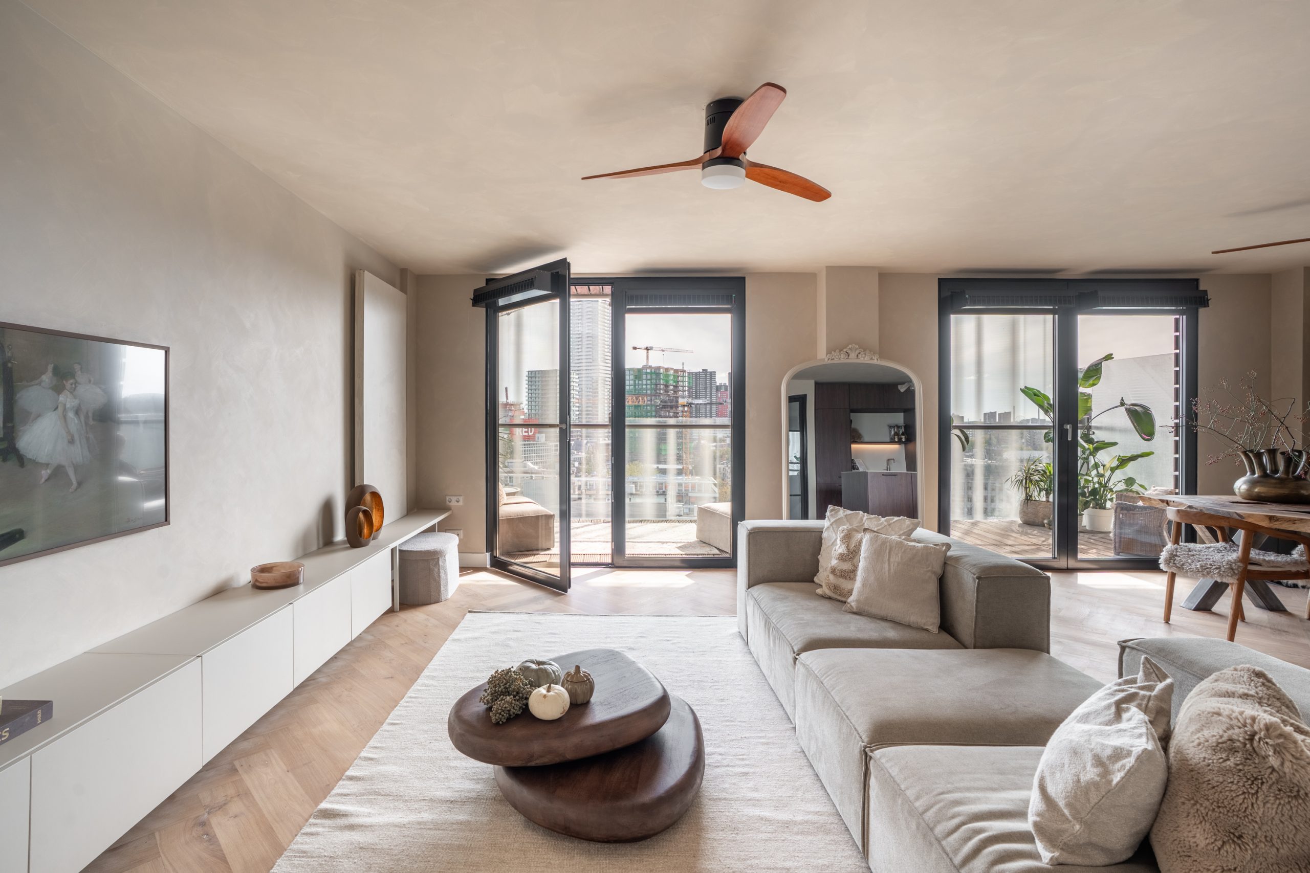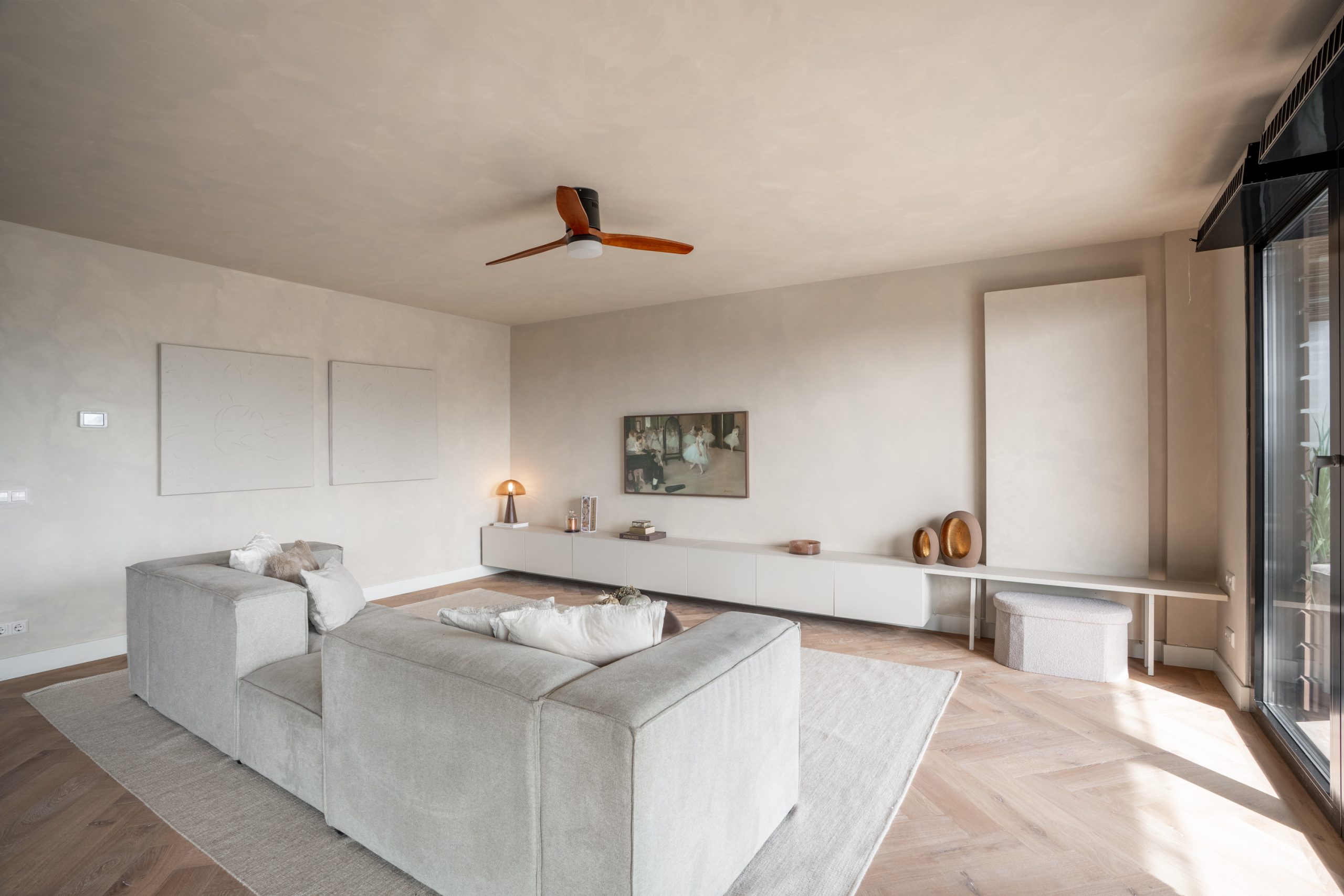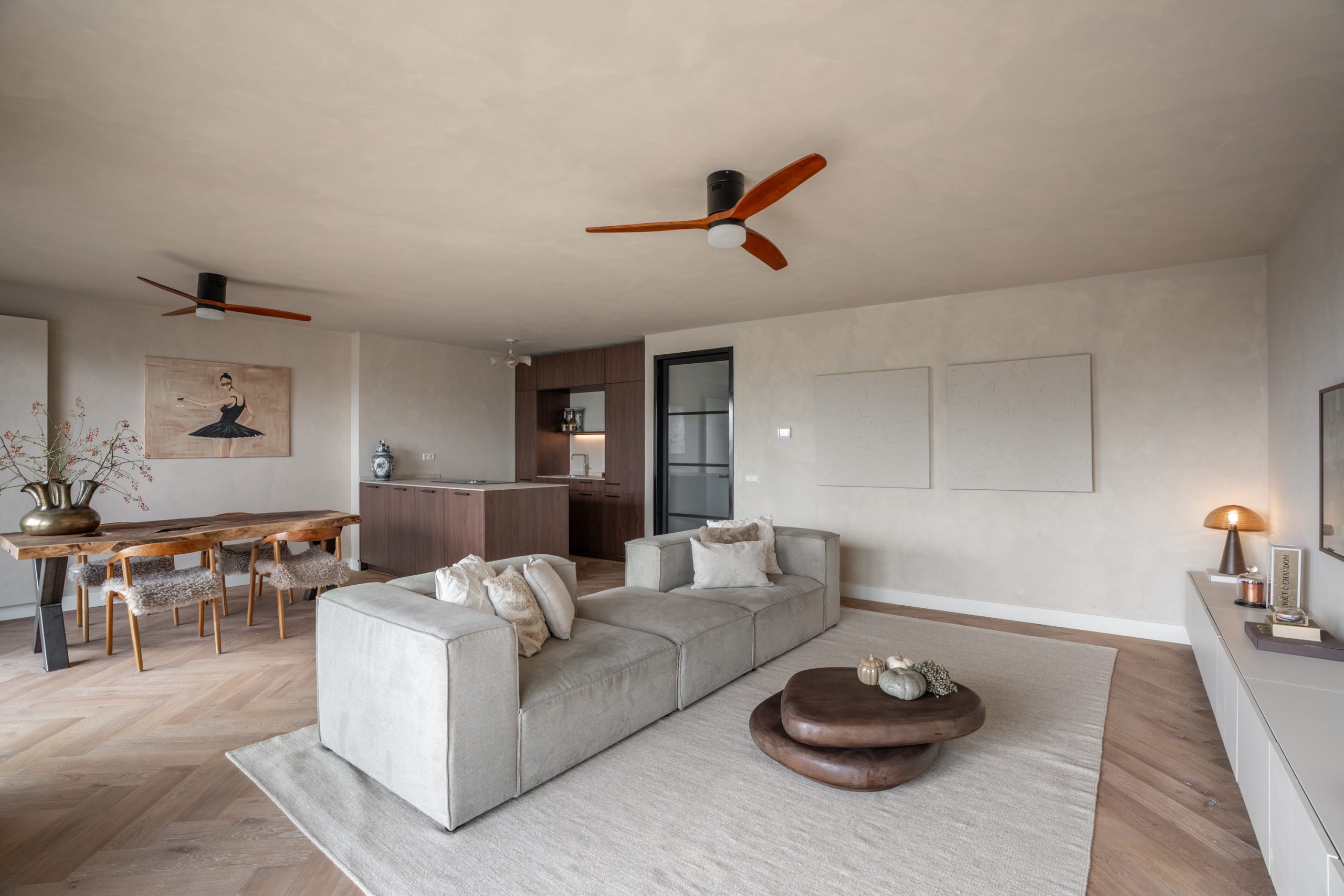 De living is royaal opgezet, waardoor er volop ruimte is voor een comfortabele zithoek én een lange eettafel waar je met vrienden en familie uitgebreid kunt tafelen. Via de openslaande deuren stap je het brede balkon op, dat zich uitstrekt over de volledige breedte van het appartement. Dankzij de royale afmetingen biedt dit balkon alle mogelijkheden voor een sfeervolle loungehoek – de ideale plek om op grote hoogte te ontspannen en te genieten van het uitzicht.