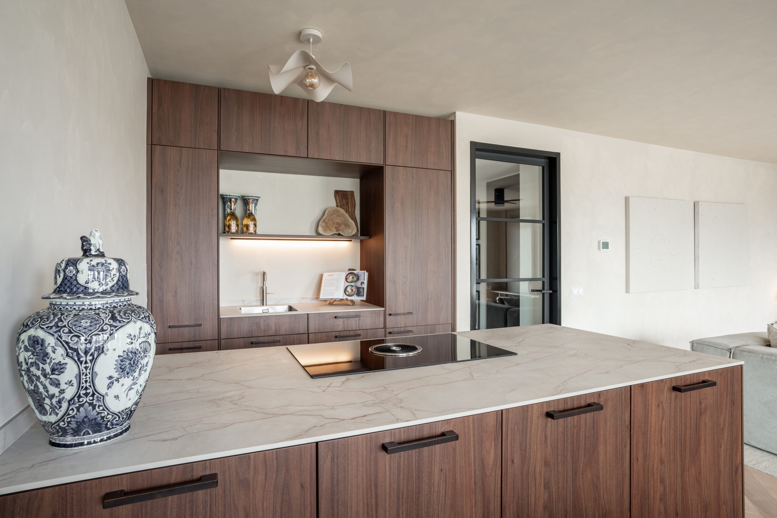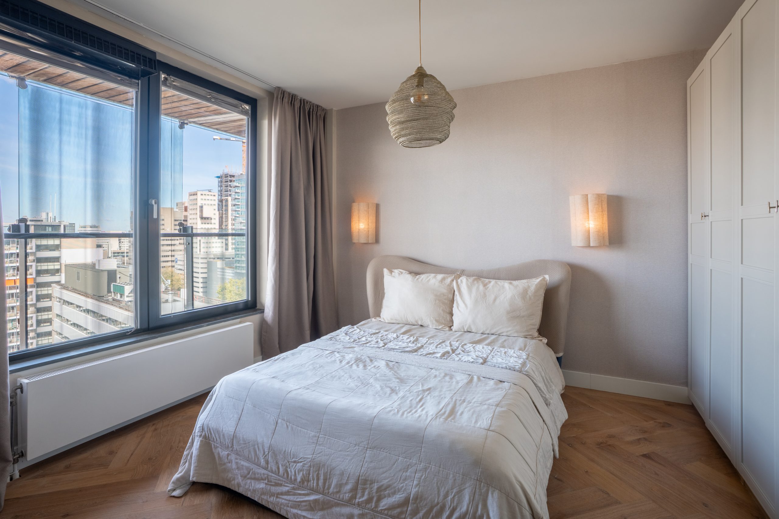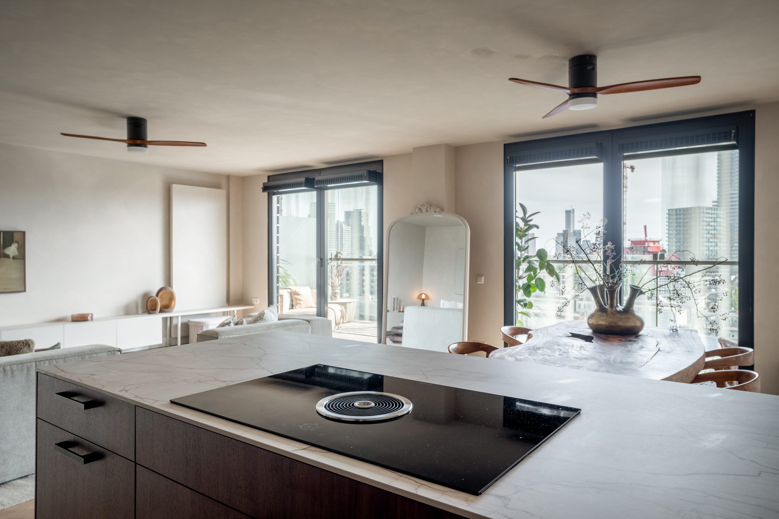 De afwerking is tot in de puntjes verzorgd. Denk aan een schitterende houten visgraatvloer die de ruimte warmte en karakter geeft, gecombineerd met een moderne open keuken voorzien van houtlook fronten. Deze keuken is niet zomaar een plek om te koken, maar een absolute eyecatcher. Het kookeiland met marmerlook blad en Bora kookplaat straalt luxe uit en biedt bovendien enorm veel kastruimte. Natuurlijk ontbreekt het ook niet aan hoogwaardige inbouwapparatuur: een koelkast, vriezer, vaatwasser én een Quooker zijn allemaal aanwezig. Terwijl je hier kookt, geniet je van een prachtig uitzicht over de stad – koken wordt op deze manier bijna een belevenis op zich.