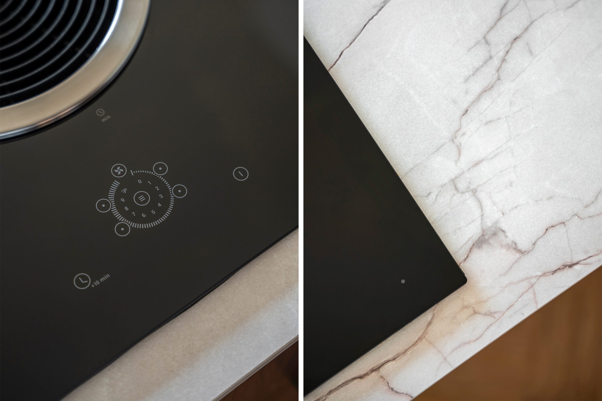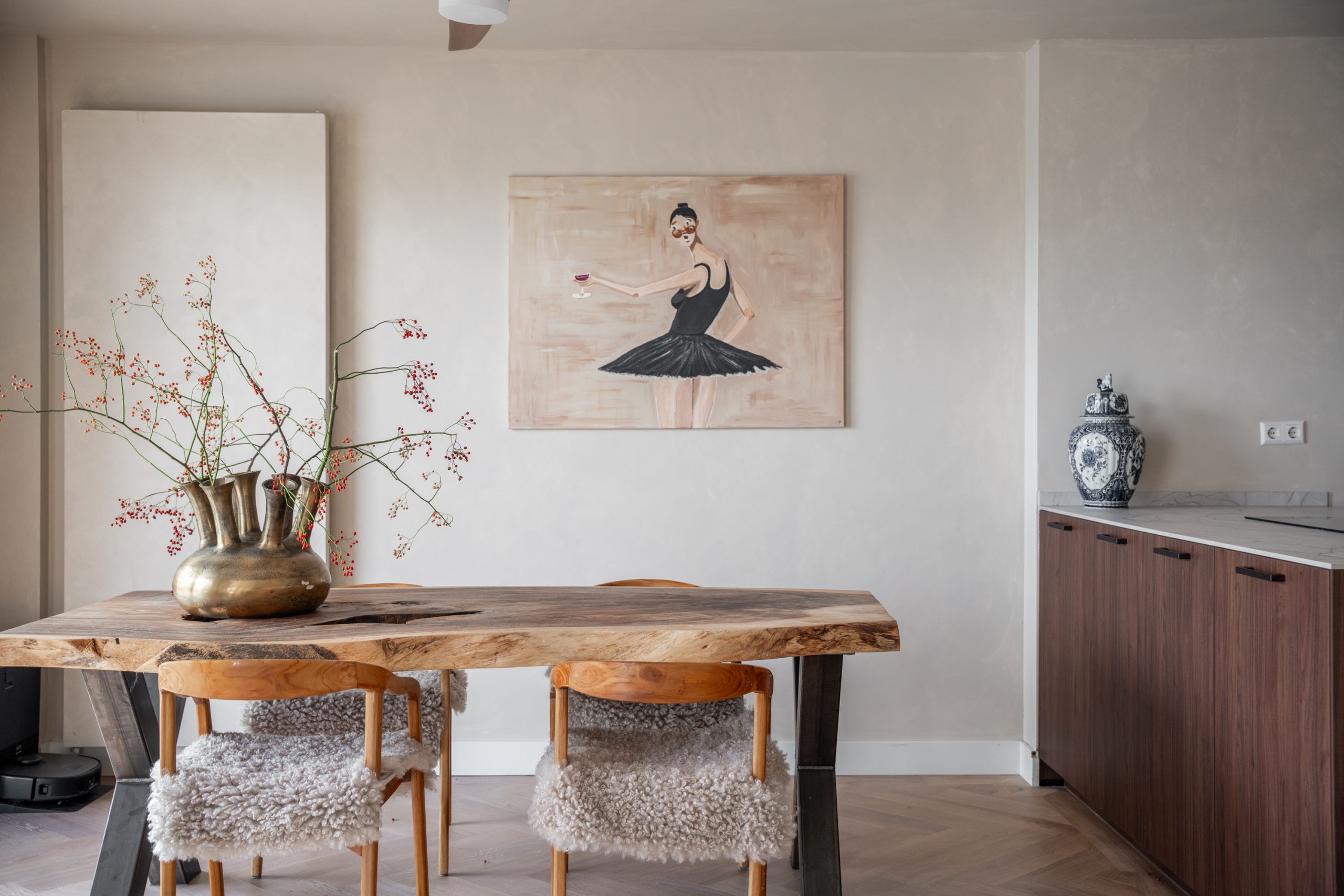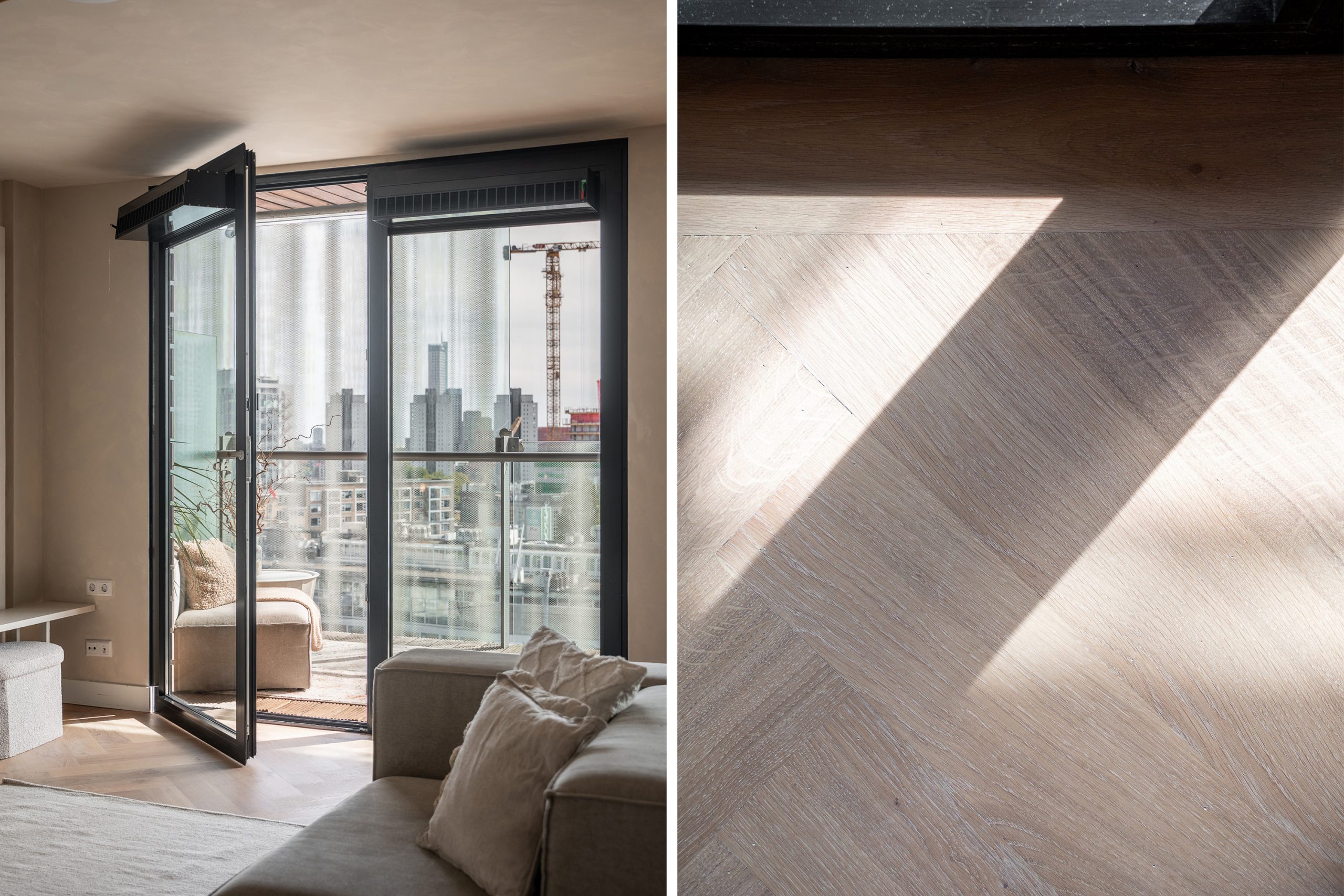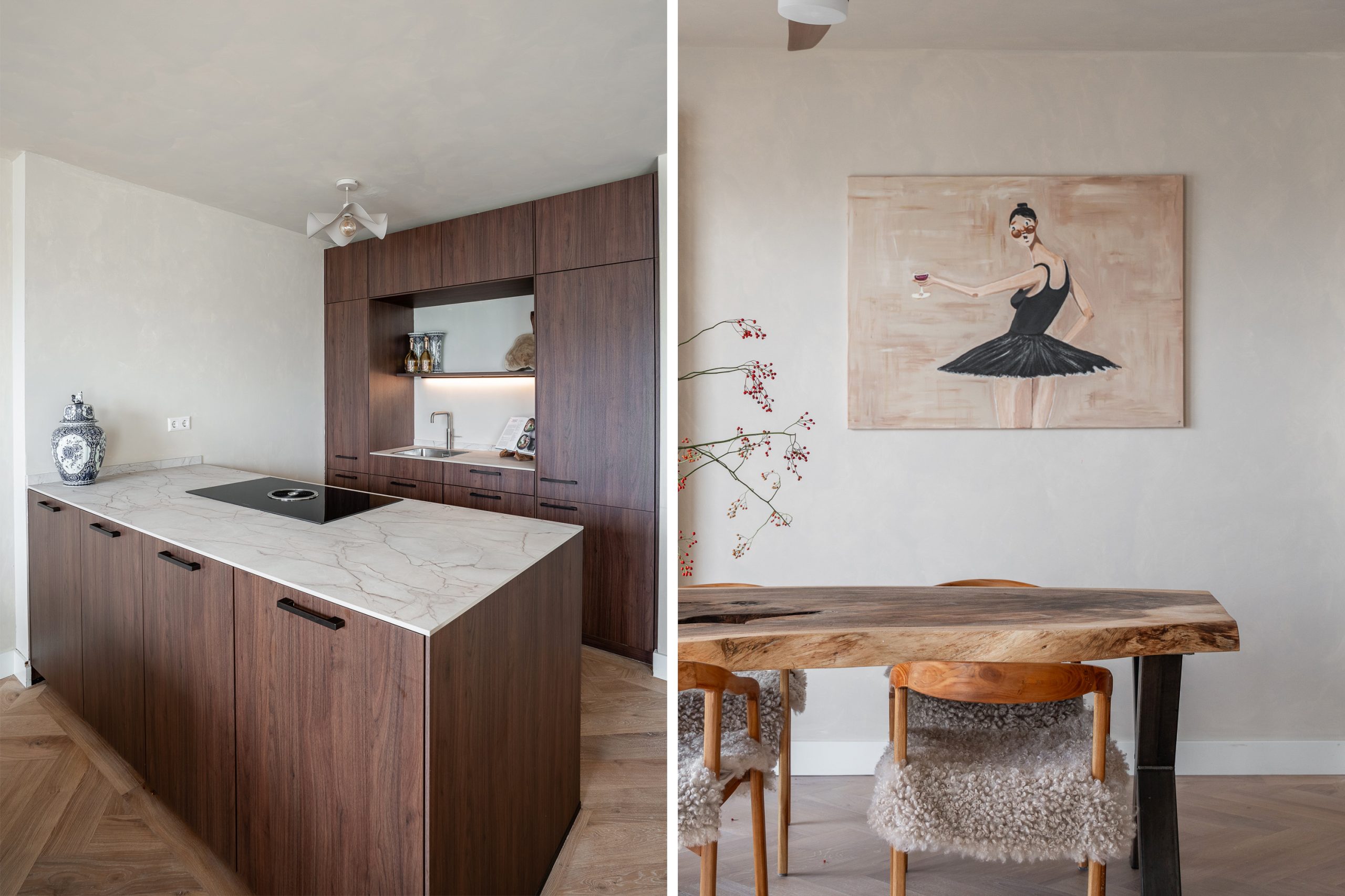 De afwerking is tot in de puntjes verzorgd. Denk aan een schitterende houten visgraatvloer die de ruimte warmte en karakter geeft, gecombineerd met een moderne open keuken voorzien van houtlook fronten. Deze keuken is niet zomaar een plek om te koken, maar een absolute eyecatcher. Het kookeiland met marmerlook blad en Bora kookplaat straalt luxe uit en biedt bovendien enorm veel kastruimte. Natuurlijk ontbreekt het ook niet aan hoogwaardige inbouwapparatuur: een koelkast, vriezer, vaatwasser én een Quooker zijn allemaal aanwezig. Terwijl je hier kookt, geniet je van een prachtig uitzicht over de stad – koken wordt op deze manier bijna een belevenis op zich.