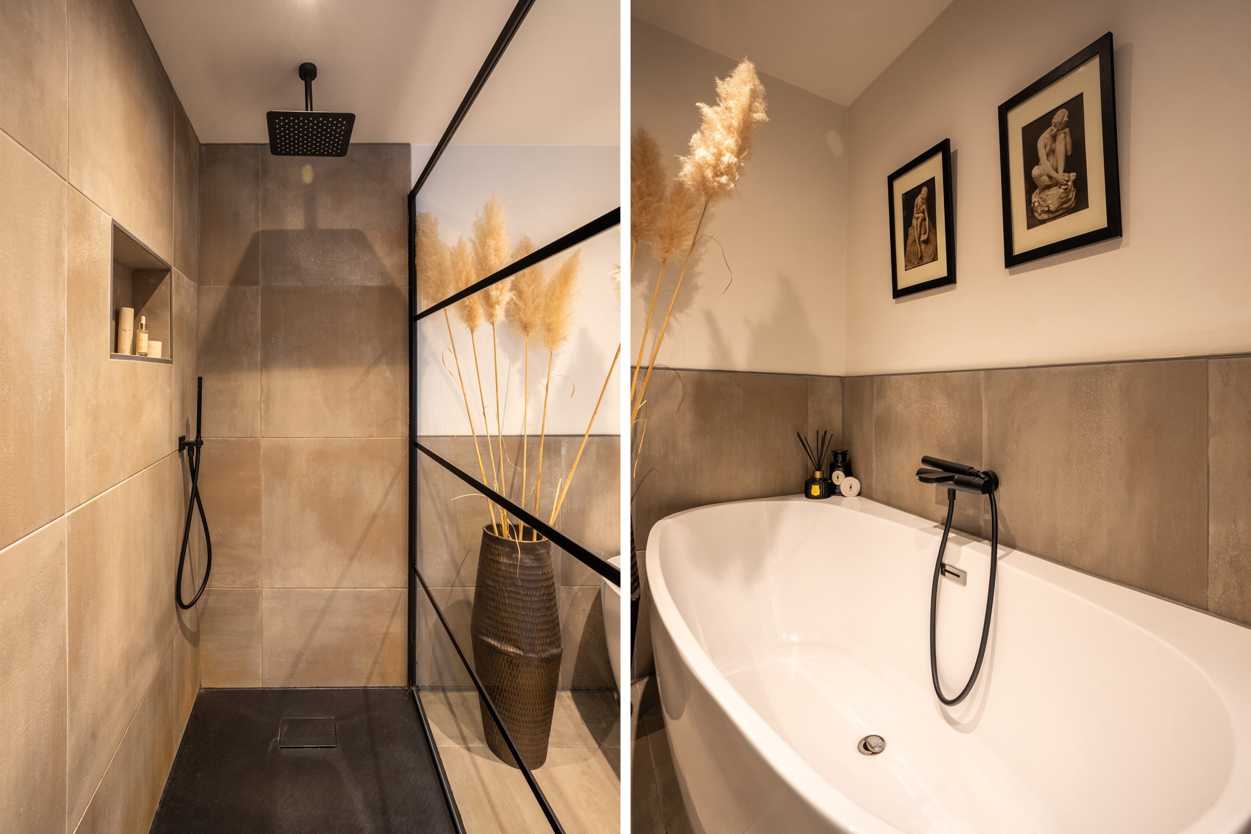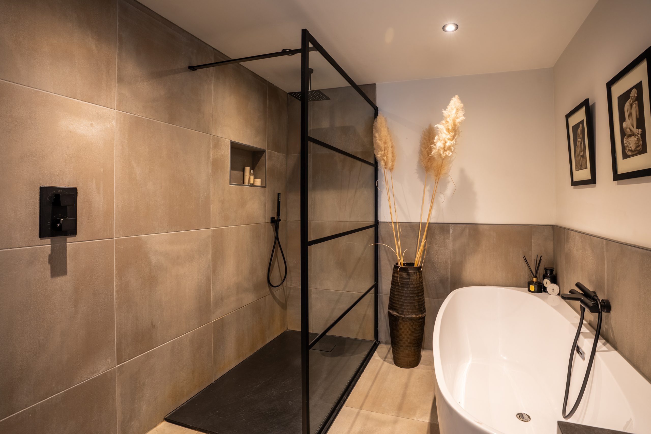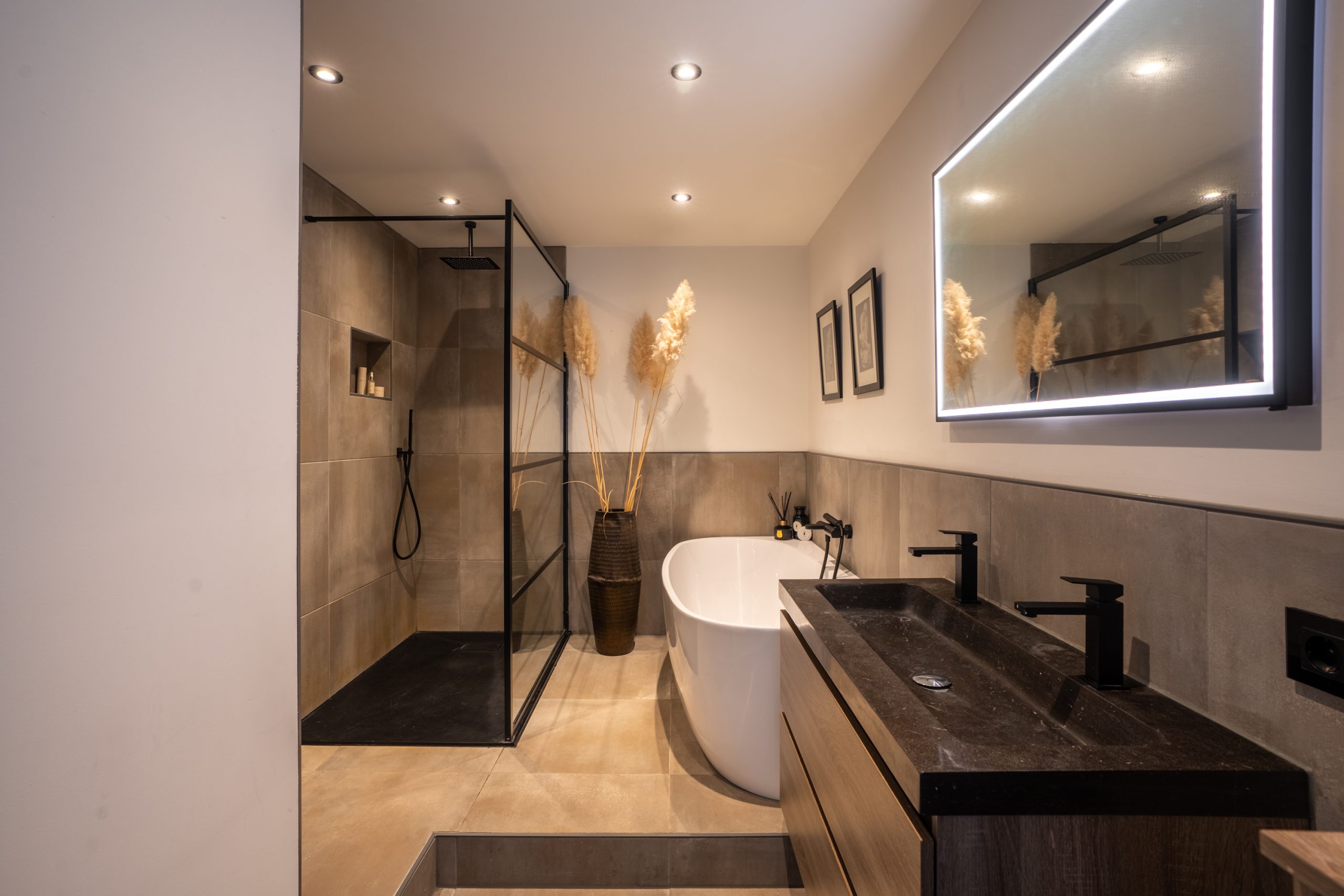 De badkamer, vernieuwd in 2019, is een waar toevluchtsoord. Hier geniet je van ultieme ontspanning in een omgeving die stijl en comfort biedt. De ruimte is modern afgewerkt en voorzien van een dubbele wastafel met meubel, een royale inloopdouche én een heerlijk ligbad. Een apart toilet met fonteintje en een praktische was-/bergruimte met aansluitingen voor wasmachine en droger maken het geheel compleet.
