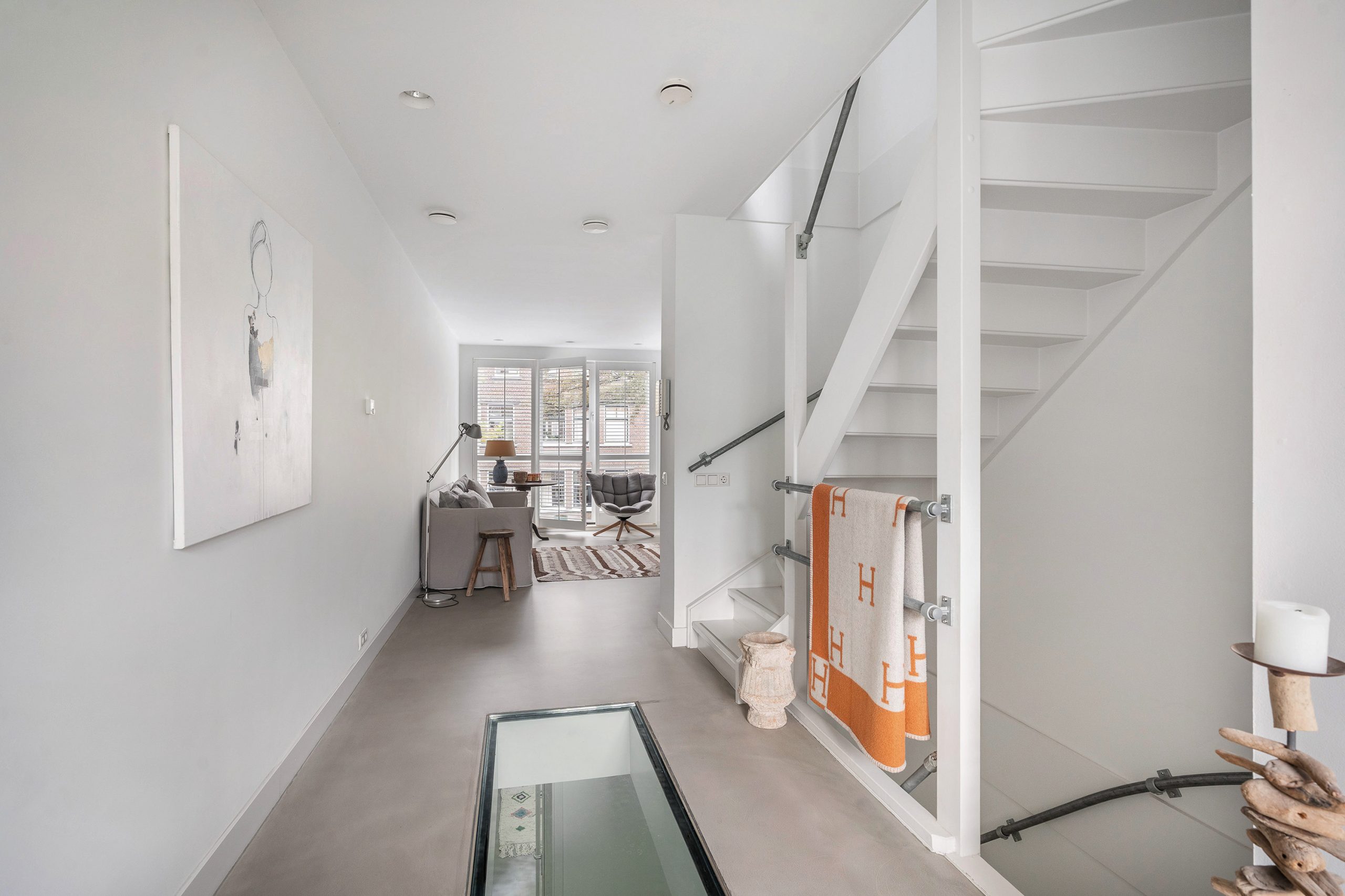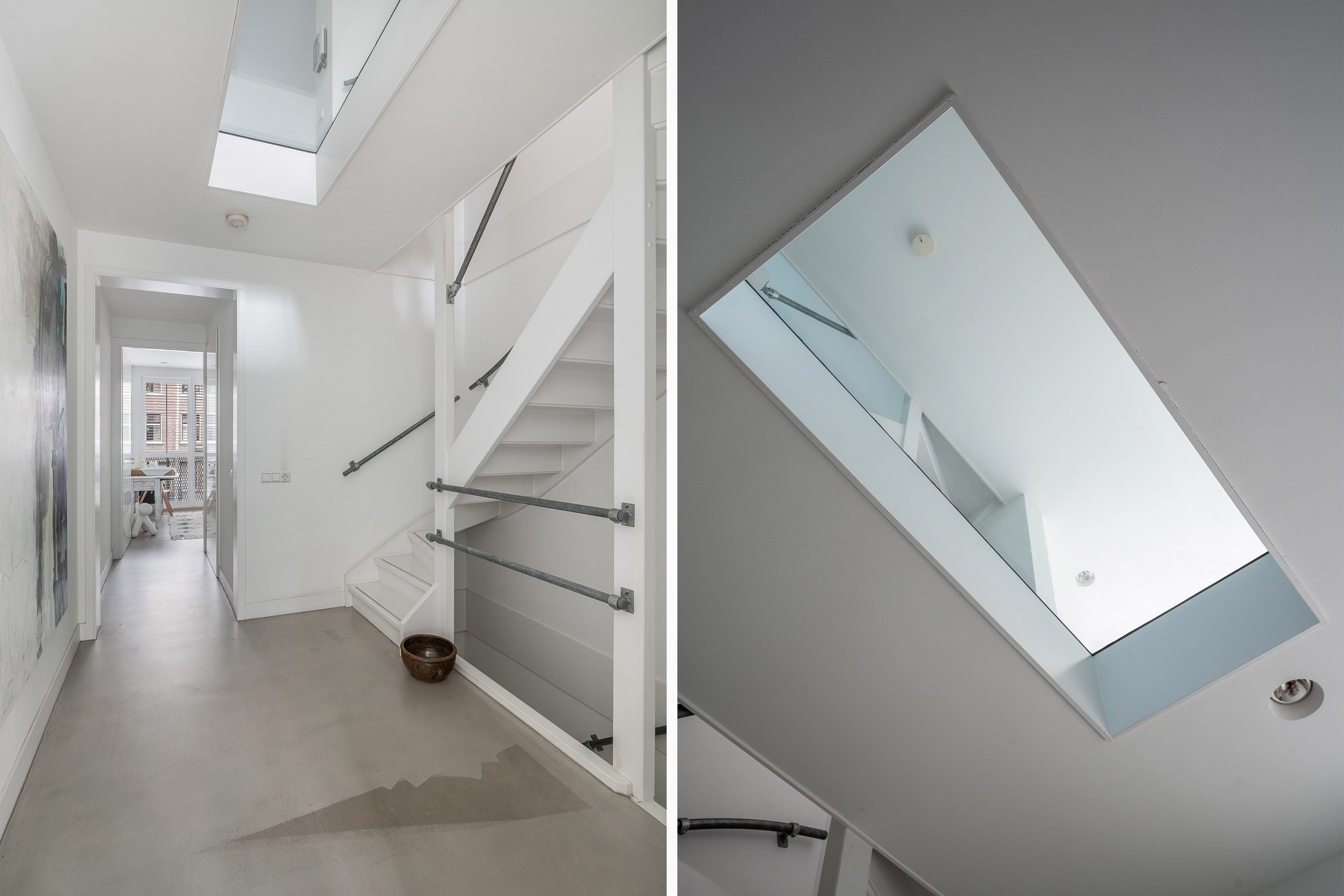 Hier stap je direct binnen in het royale leefgedeelte. Een bijzonder detail is het glazen paneel met doorkijk naar de verdieping eronder. een echte eyecatcher die de ruimte karakter en licht geeft! Grote raampartijen aan beide kanten laten heerlijk veel licht binnen en de openslaande ramen maken het extra aangenaam. Het plafond is voorzien van moderne inbouwspots, wat de ruimte een stijlvolle en sfeervolle uitstraling geeft. Aan beide zijden is er voldoende ruimte om een gezellige zithoek, een praktische werkkamer of een inspirerende hobbyruimte in te richten.