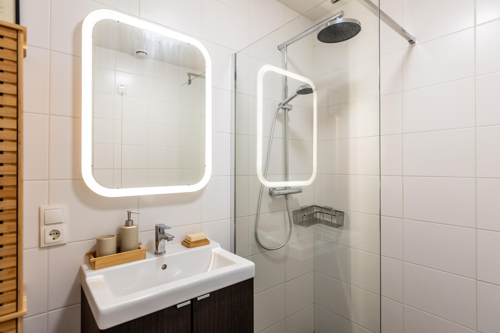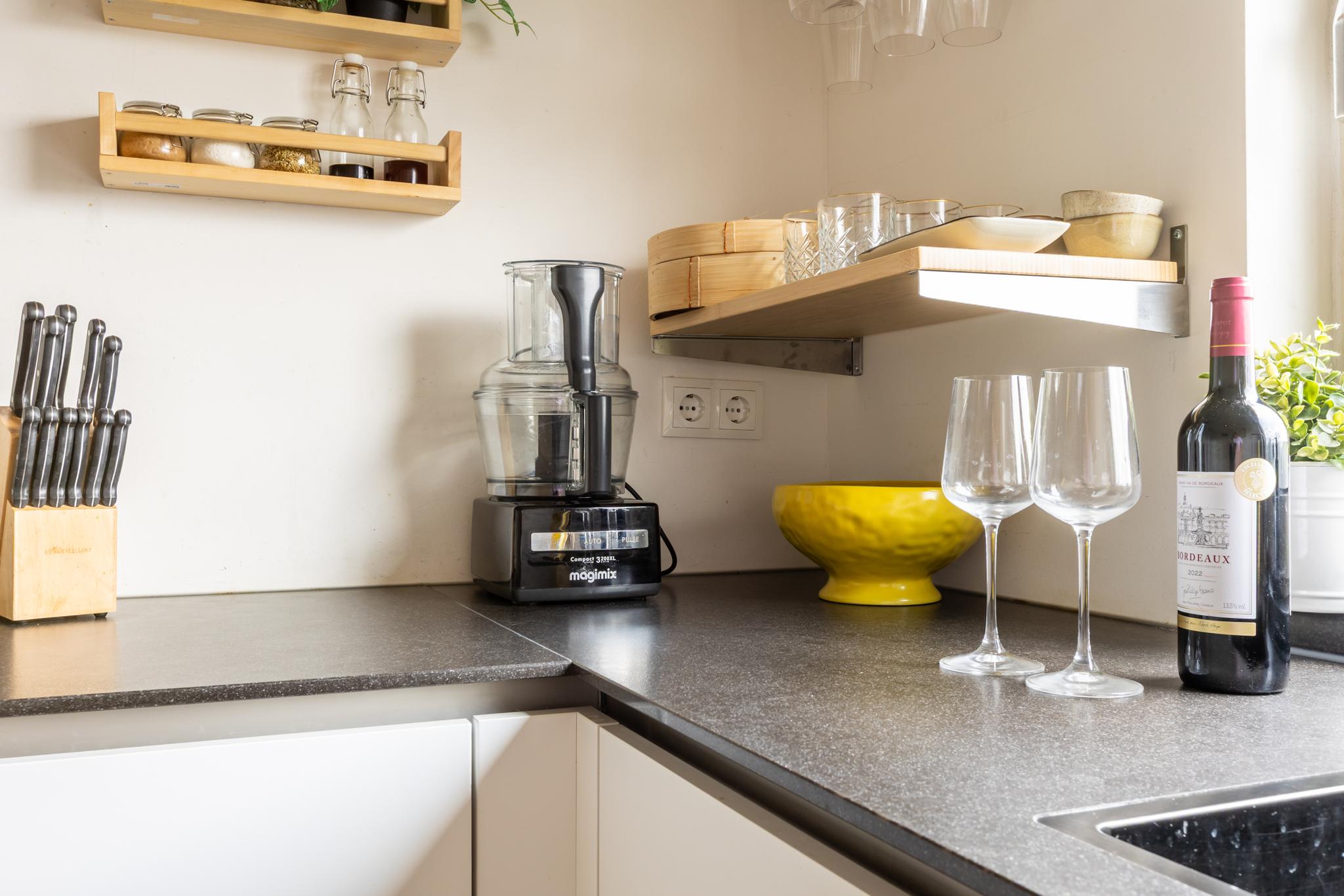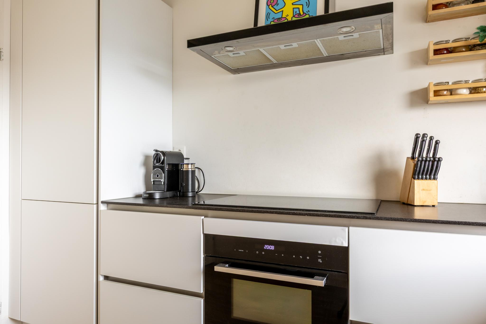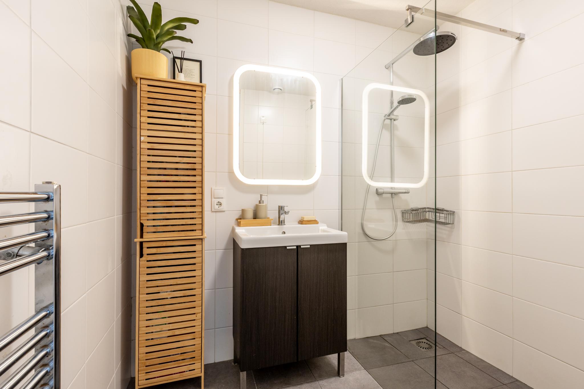 Terug in de woning, aan de andere zijde, is de moderne keuken gesitueerd. De keuken heeft heerlijk veel opbergruimte en is voorzien van een inductiekookplaat, afzuigkap, combi-oven, koelkast, vriezer, vaatwasser en Quooker. Hier is ook een vaste kast gevestigd met de cv-opstelling en een aansluiting voor de wasmachine. Naastgelegen bevindt zich de hoofdslaapkamer die voldoende ruimte biedt voor een groot bed en een kledingkast. De nette badkamer is volledig betegeld en uitgerust met een inloopdouche en een wastafel met meubel. Het separate toilet met fonteintje is in de hal te vinden.