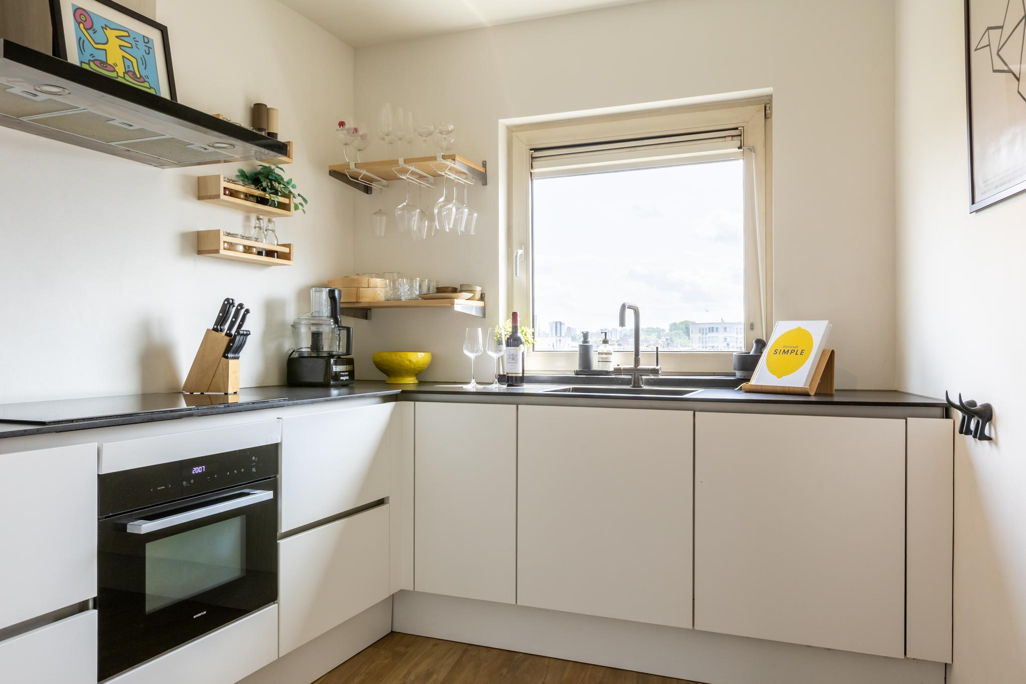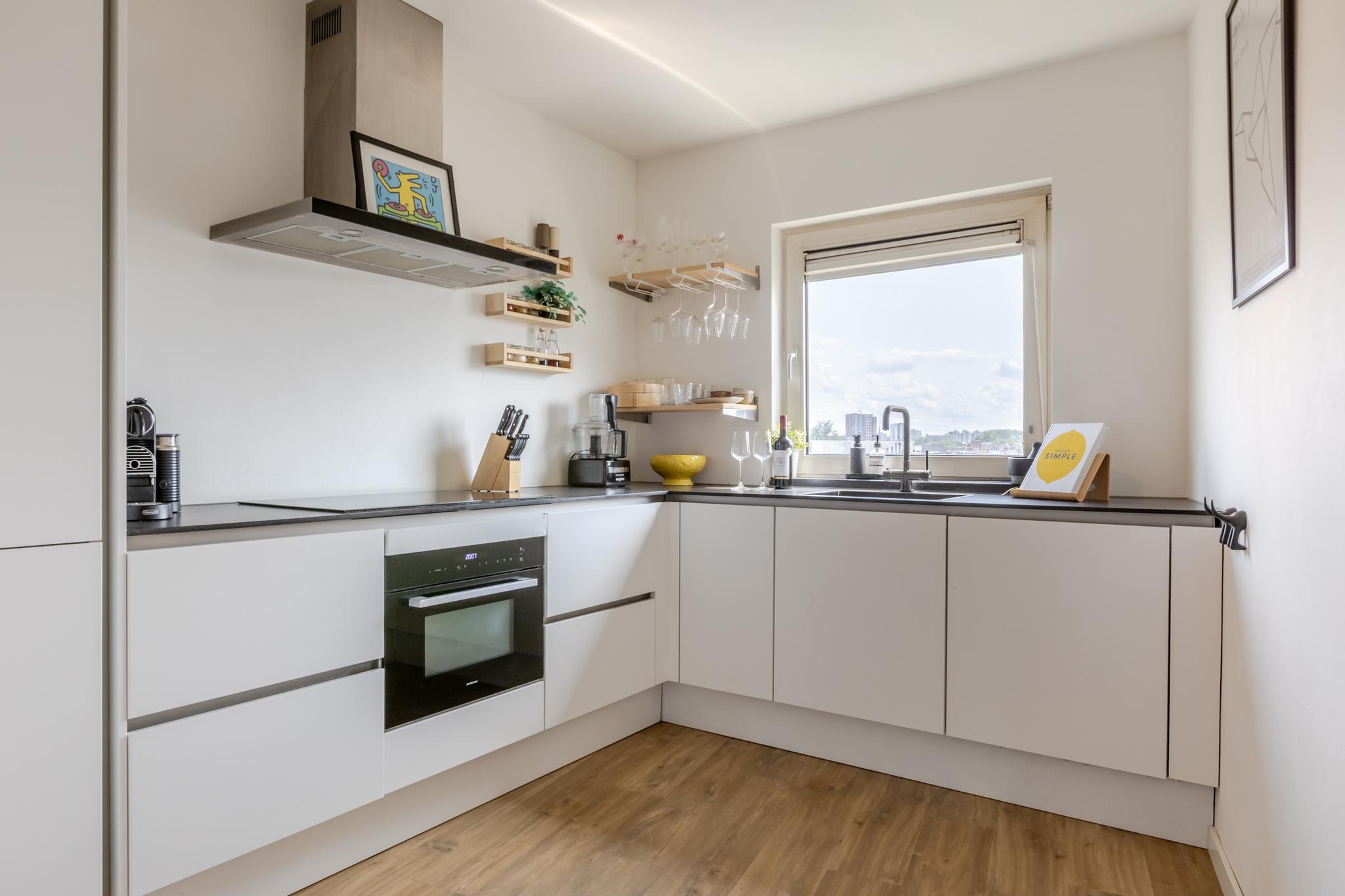 Binnenkomst in de ruime hal met toegang tot de verschillende vertrekken. Aan de achterzijde bevindt zich de ruime living, die op een leuke manier is opgesplitst in een zit- en eetgedeelte. De grote raampartijen, mooie laminaatvloer en keurige afwerking maken dit tot een ideaal thuis. Van een ontspannen avond op de bank tot een gezellige borrel met vrienden of een diner met familie. Het kan hier allemaal! Het balkon van maar liefst 15 m2 met uitzicht over de stad en het water is echt een pluspunt – in de zomer haal je de gezelligheid van binnen moeiteloos naar buiten. Dankzij de ligging op de bovenste verdieping geniet je hier volop van de zon!