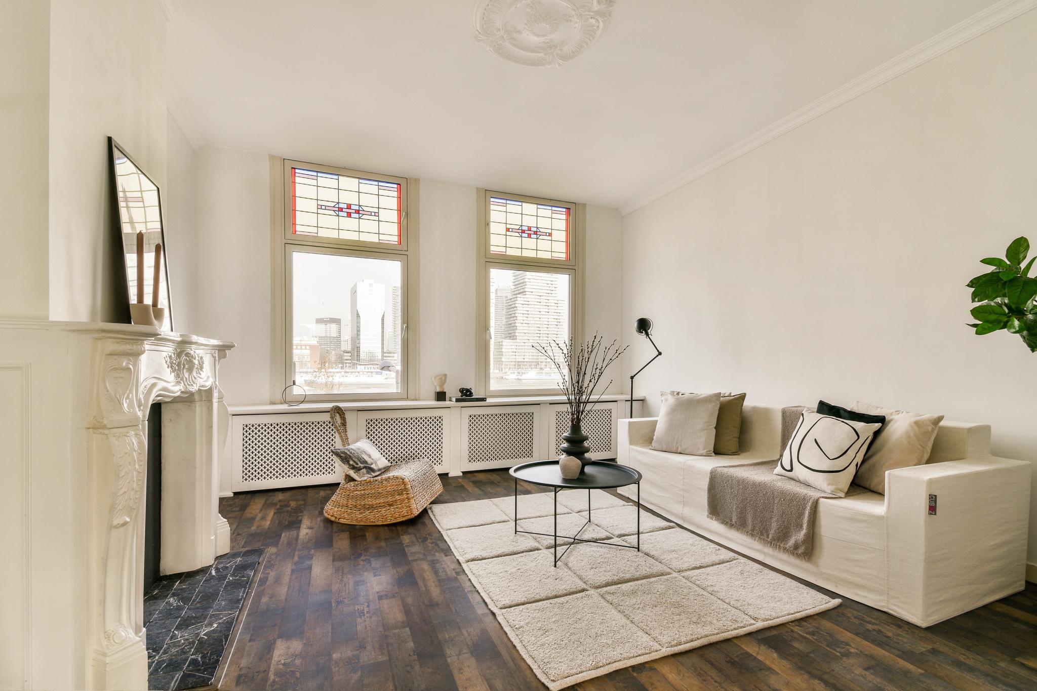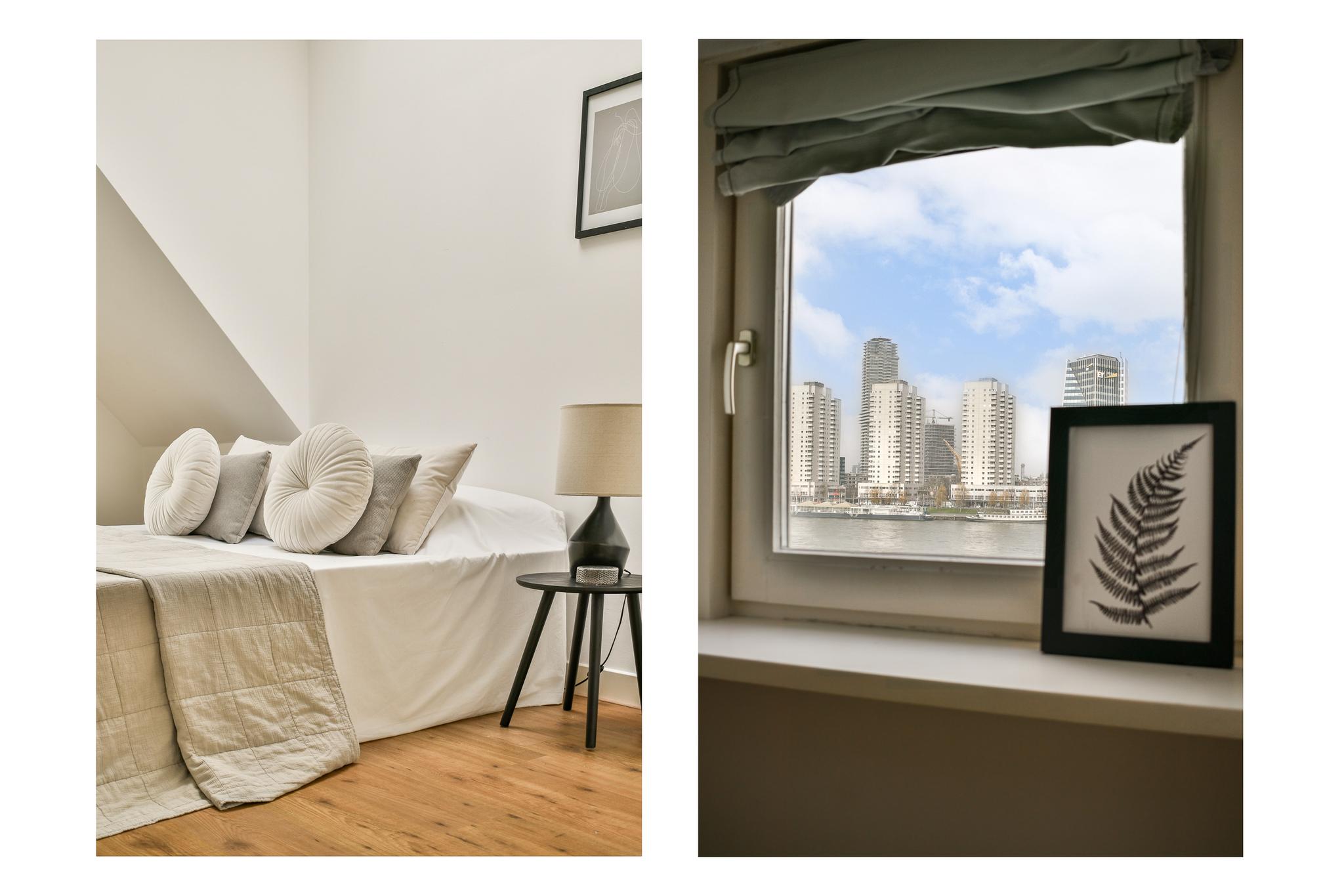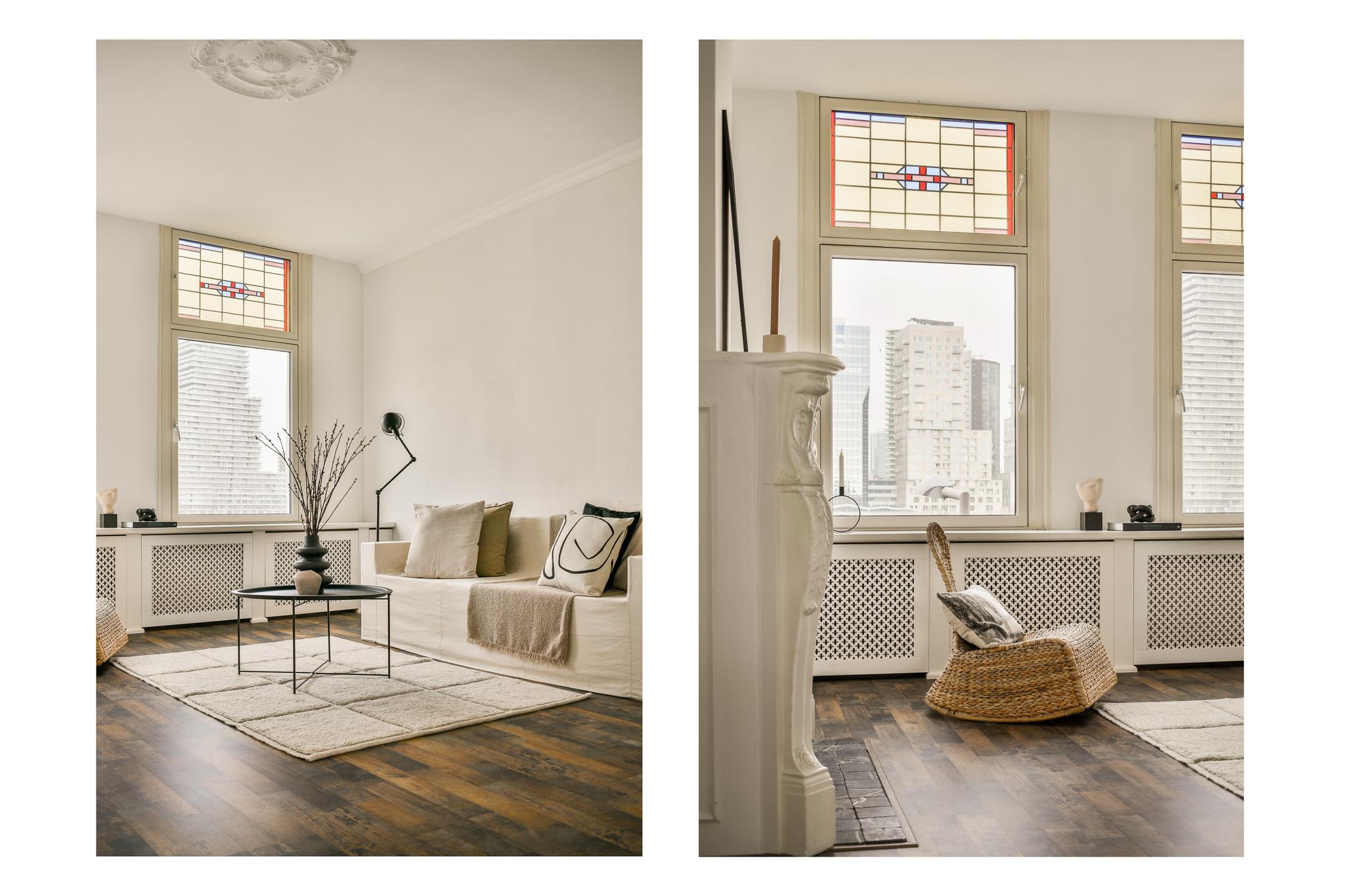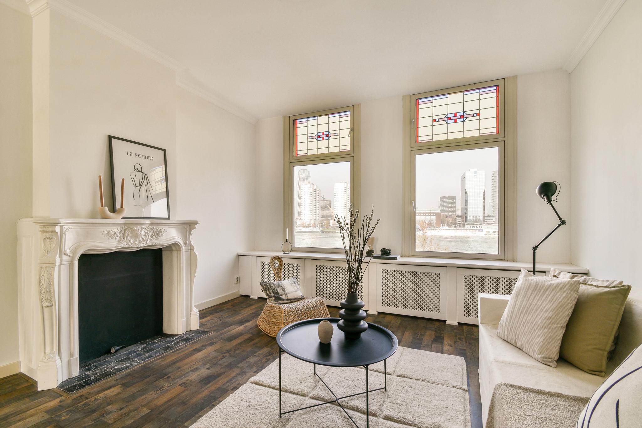 De woonkamer ademt karakter, met glas-in-loodramen, een klassieke schouw en brede vensterbanken met stijlvolle ombouw. De grote raampartijen zorgen voor een fijne lichtinval en prachtig zicht op de Maas en de skyline van Rotterdam. Een heerlijke plek waar je nooit uitgekeken raakt. De keuken, in een praktische L-opstelling, is voorzien van een gaskookplaat, koel-/vriescombinatie, vaatwasser en een gezellige bar: ideaal voor een snel ontbijt of een glas wijn tijdens het koken.