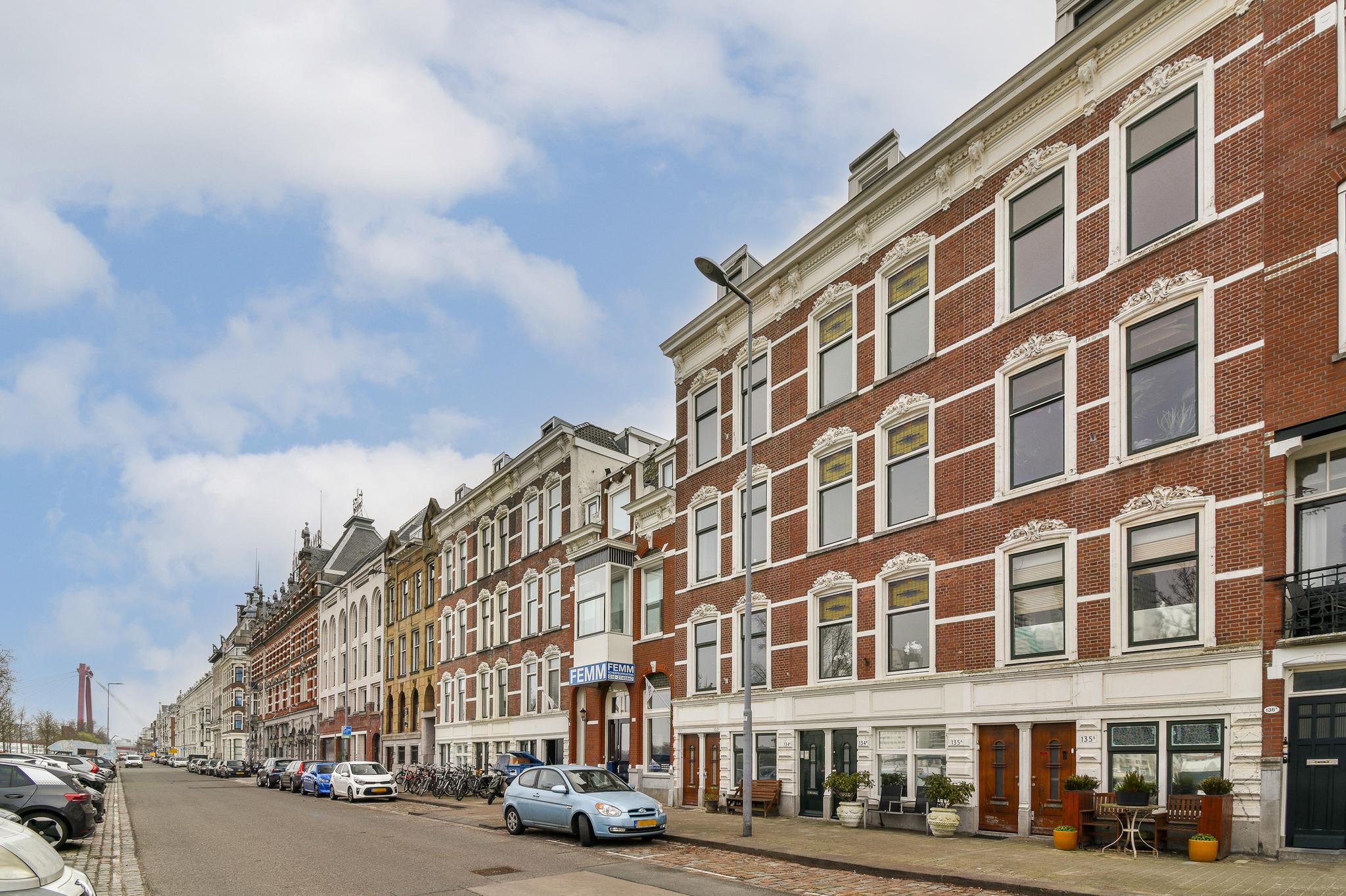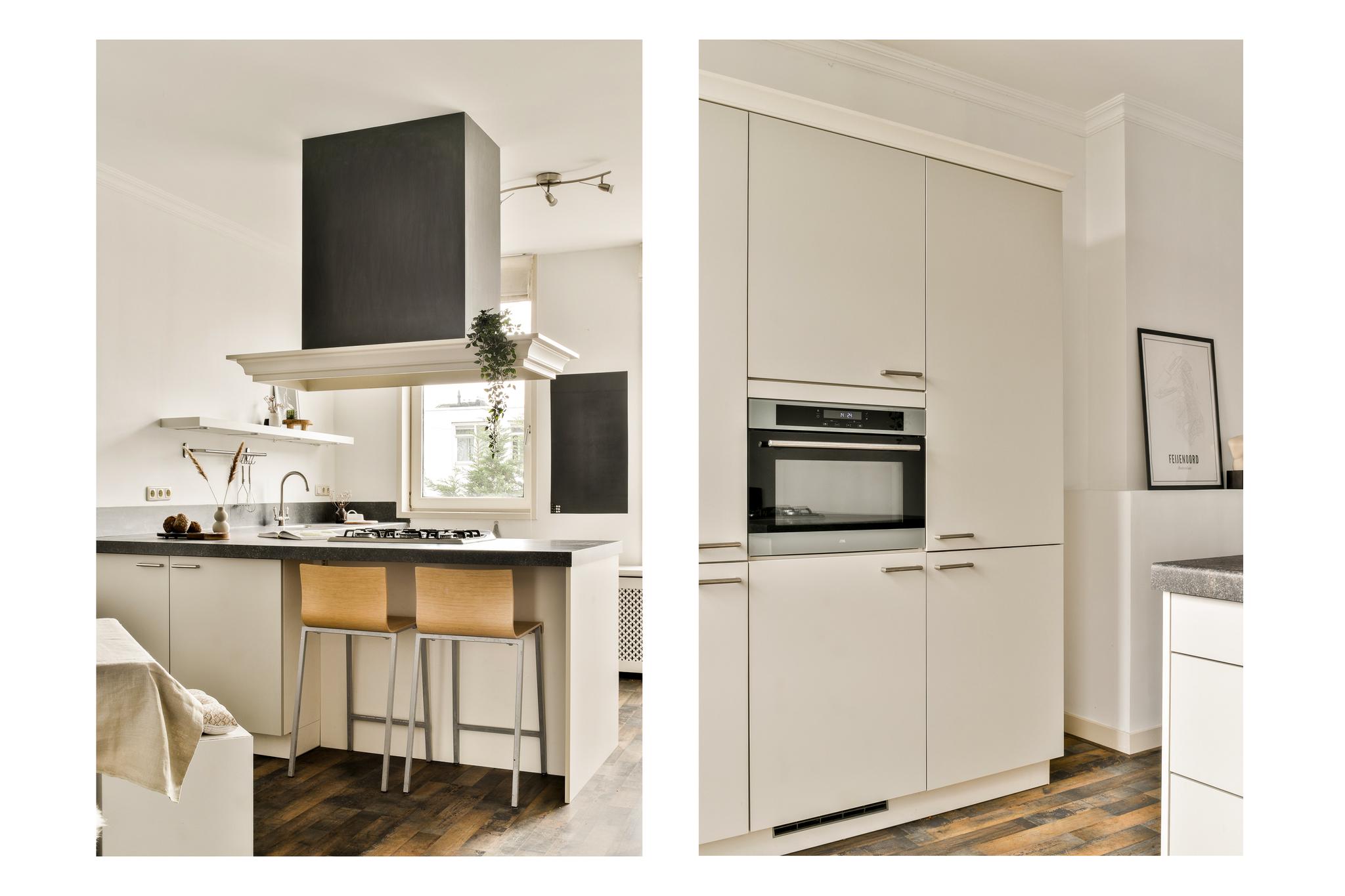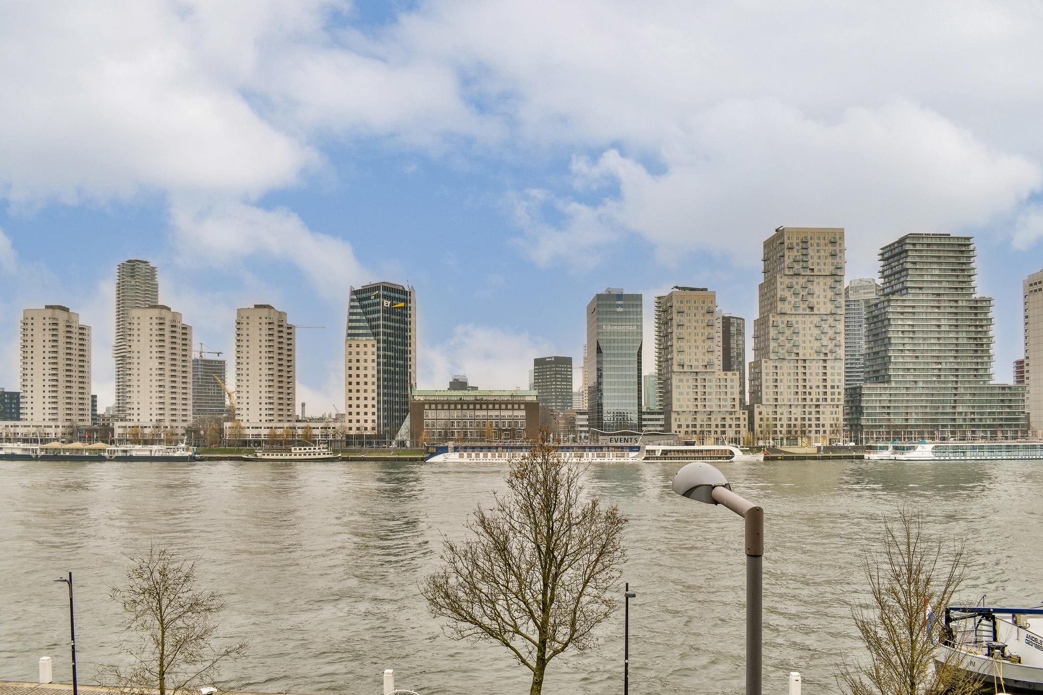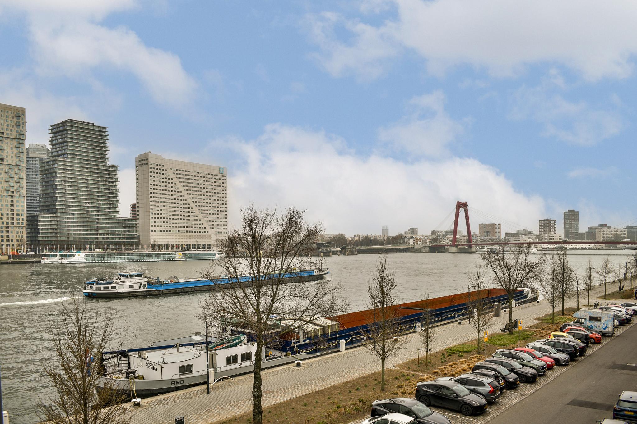 De woonkamer ademt karakter, met glas-in-loodramen, een klassieke schouw en brede vensterbanken met stijlvolle ombouw. De grote raampartijen zorgen voor een fijne lichtinval en prachtig zicht op de Maas en de skyline van Rotterdam. Een heerlijke plek waar je nooit uitgekeken raakt. De keuken, in een praktische L-opstelling, is voorzien van een gaskookplaat, koel-/vriescombinatie, vaatwasser en een gezellige bar: ideaal voor een snel ontbijt of een glas wijn tijdens het koken.