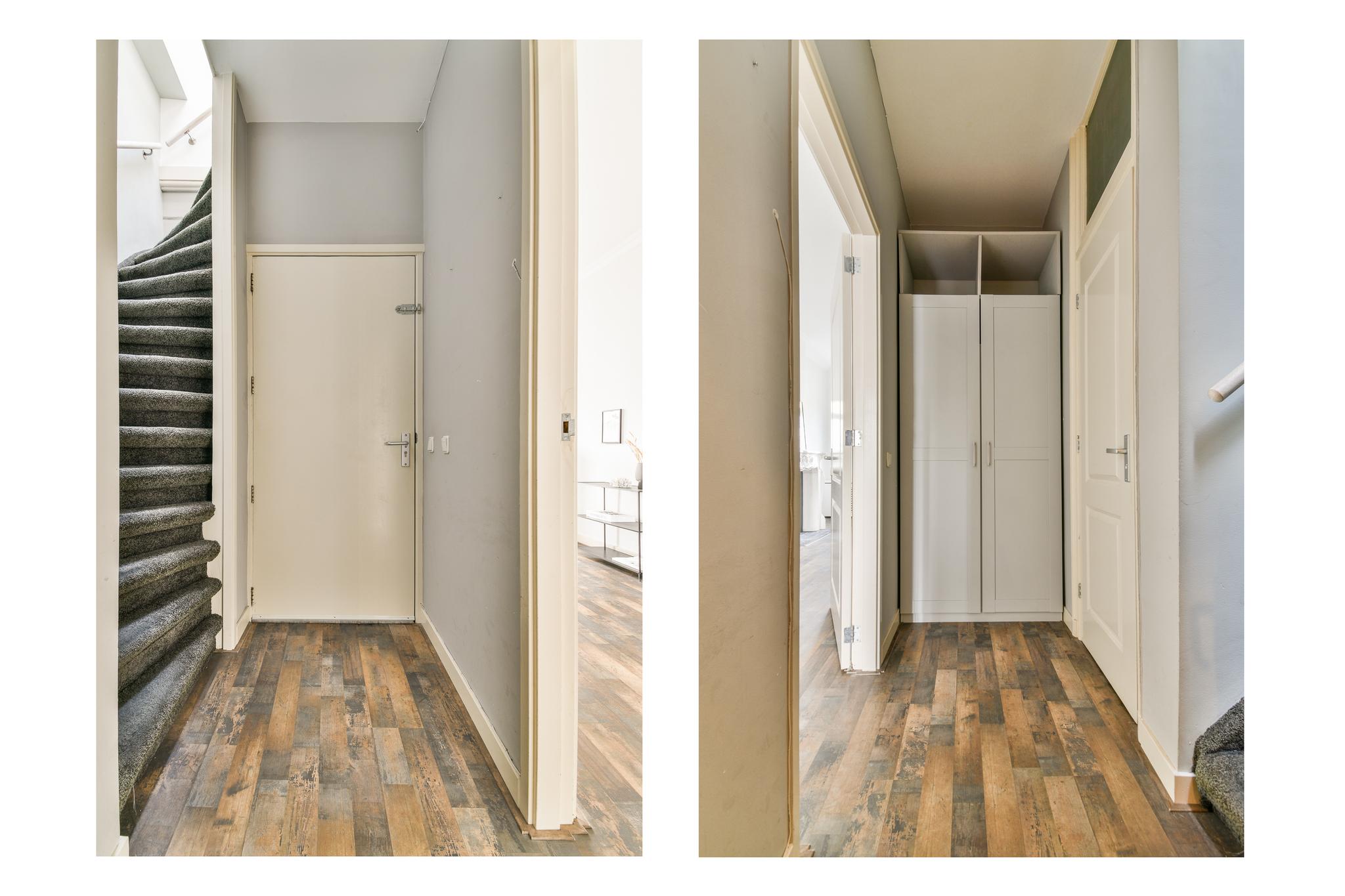 In de hal tref je de praktische garderobekast en het separate toilet. Van hieruit leidt de trap je naar de slaapverdieping en heb je toegang tot de living.