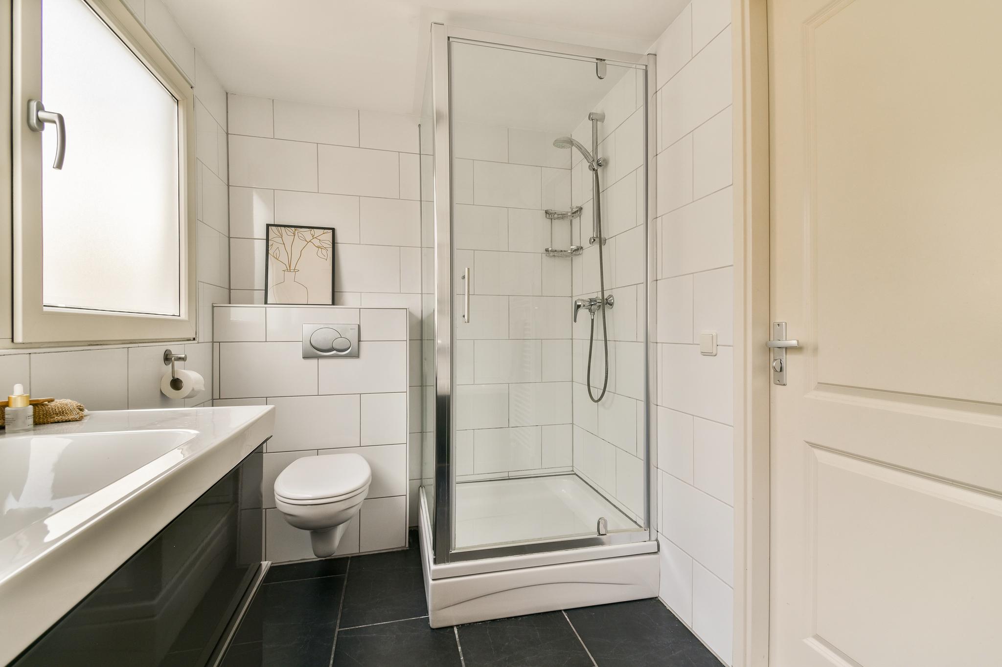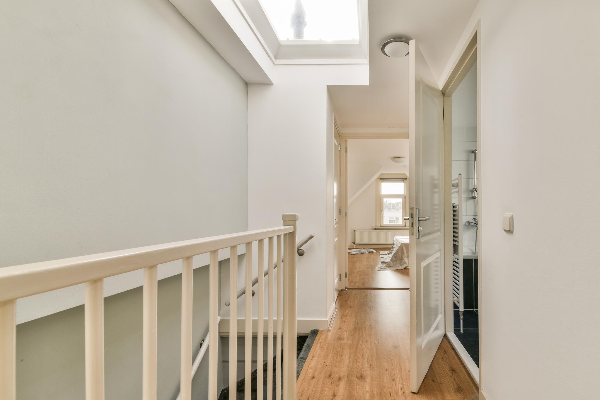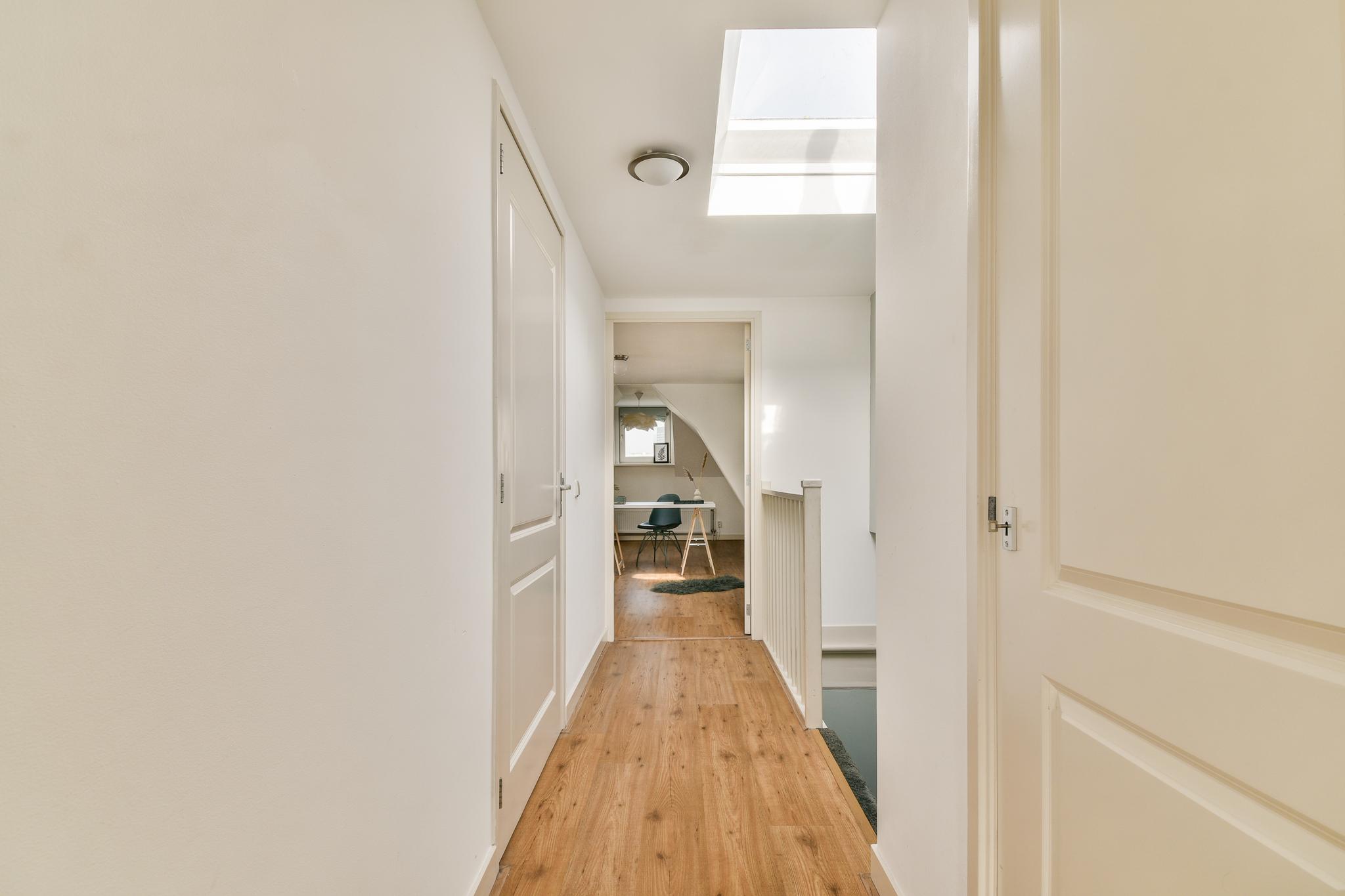 De slaapverdieping biedt twee comfortabele slaapkamers, rijk aan licht en ruimte. Naast een praktische bergkast met de opstelplaats voor de cv, is er een ruime, volledig betegelde badkamer. Deze is compleet uitgerust met een ligbad, aparte douche, een modern wastafelmeubel en een tweede toilet, comfortabel en stijlvol ingericht.