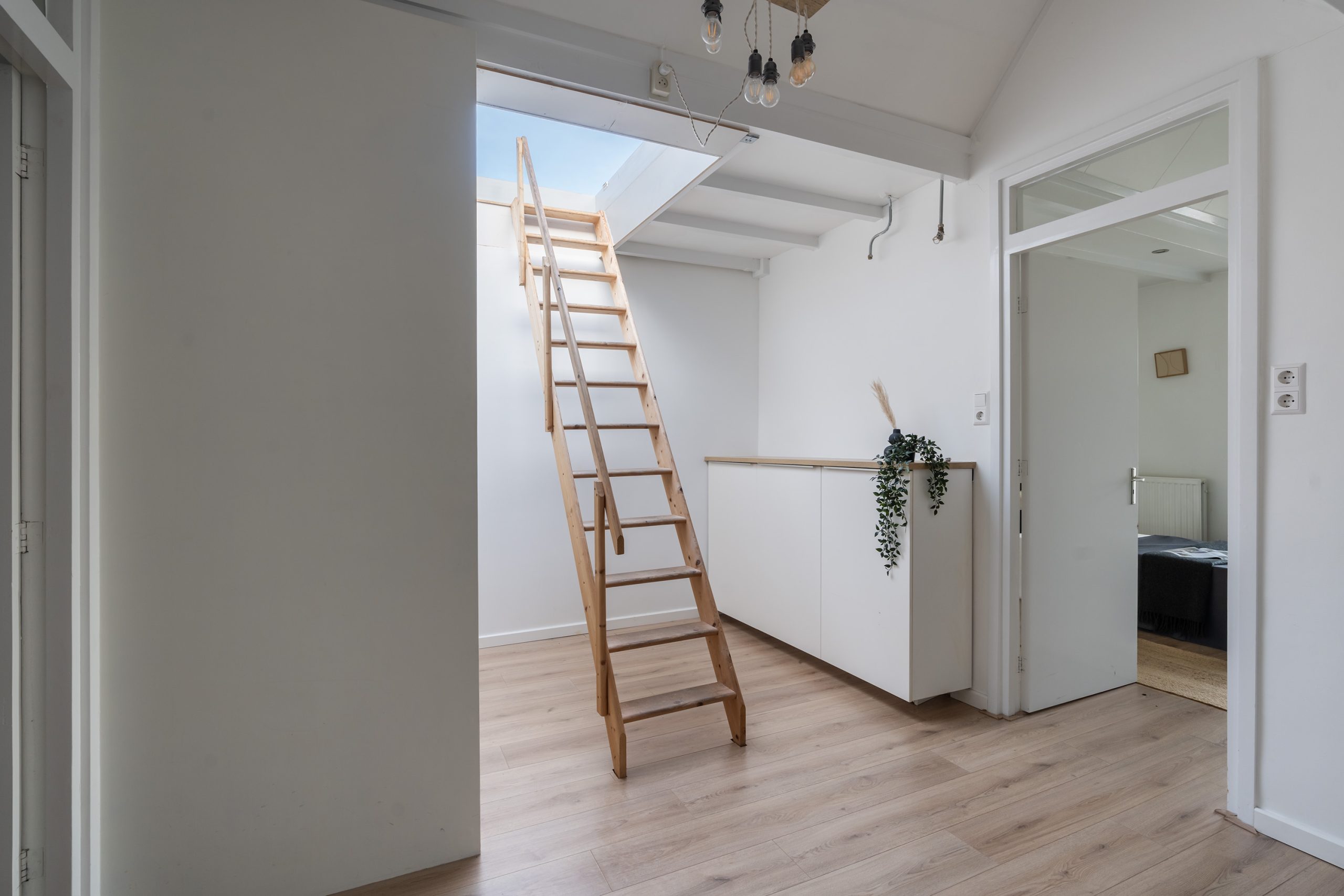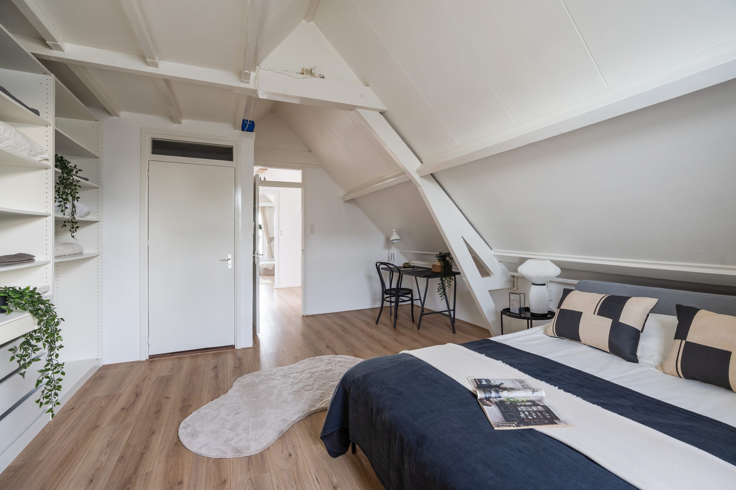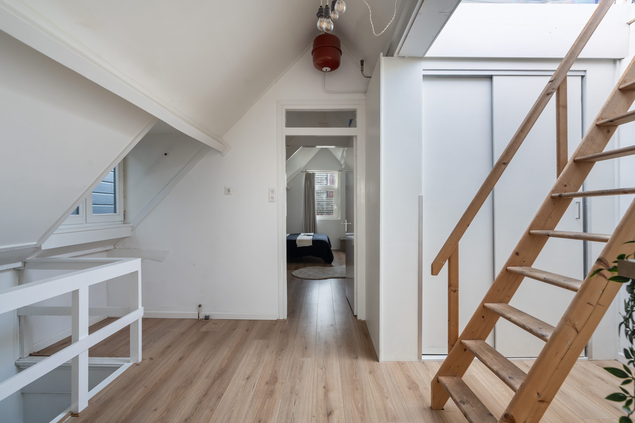 Op deze verdieping bevinden zich twee royale slaapkamers. De hoofdslaapkamer, gelegen aan de achterzijde van de woning, heeft een eigen toegang tot een separaat toilet met wastafel. Handig om te weten: er is tevens een aansluiting voor een douche, waardoor hier eenvoudig een tweede badkamer kan worden gerealiseerd. Ook zijn hier de houten balken in zicht, die zorgen voor een warme en sfeervolle uitstraling. De tweede slaapkamer heeft eveneens de houten balken in zicht, die worden gecombineerd met inbouwspots. Op de overloop met dakraam is een vaste kast met schuifdeuren te vinden, waar de cv-opstelling en de aansluiting voor de wasmachine en droger zijn gevestigd. De vaste trap brengt je naar het dakterras.