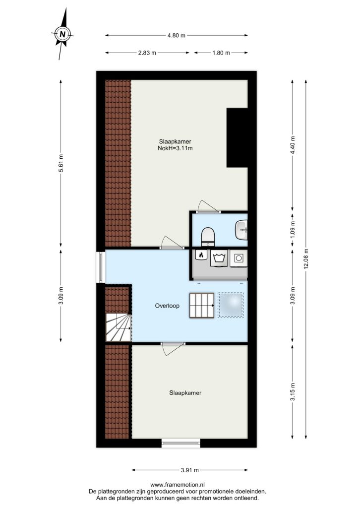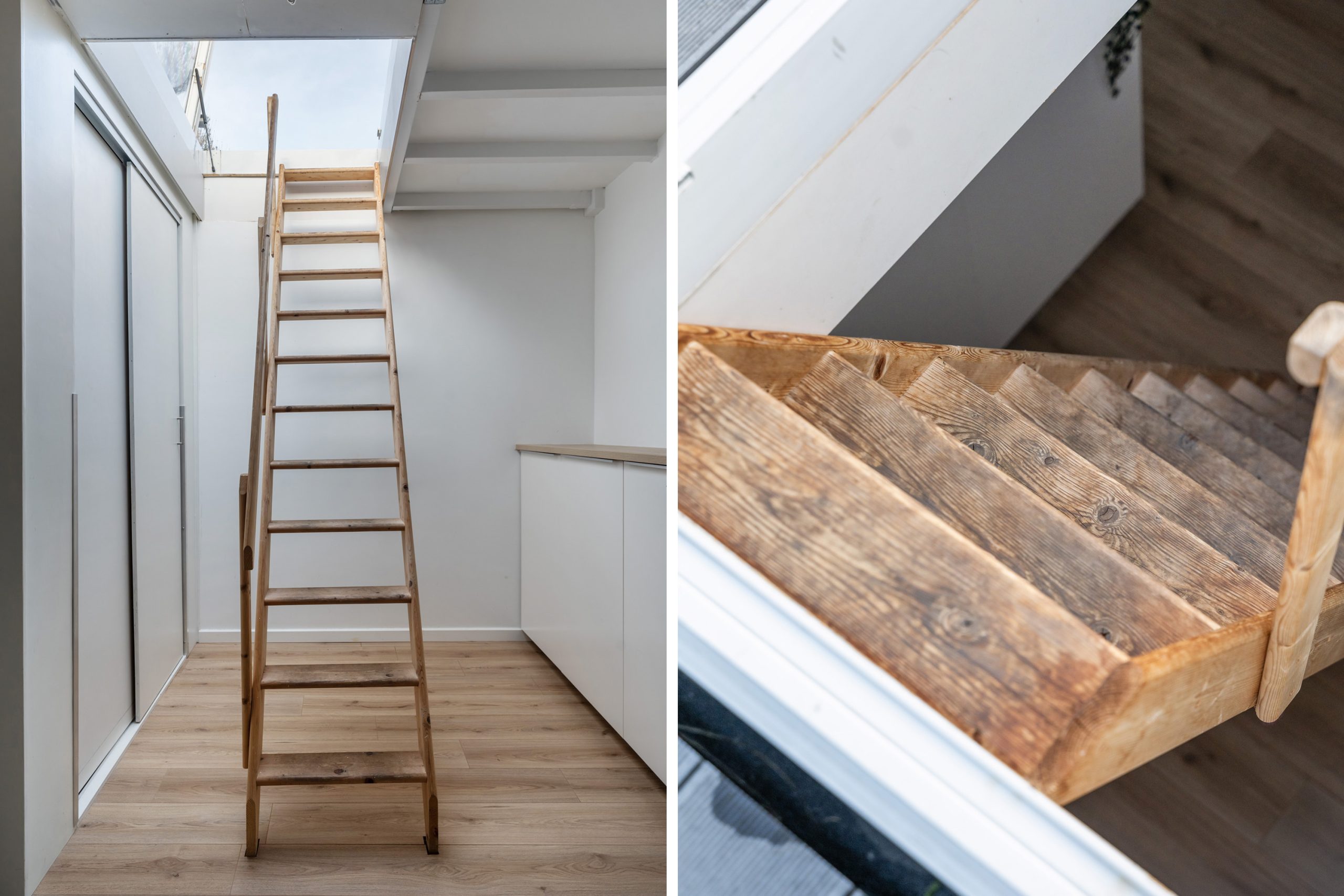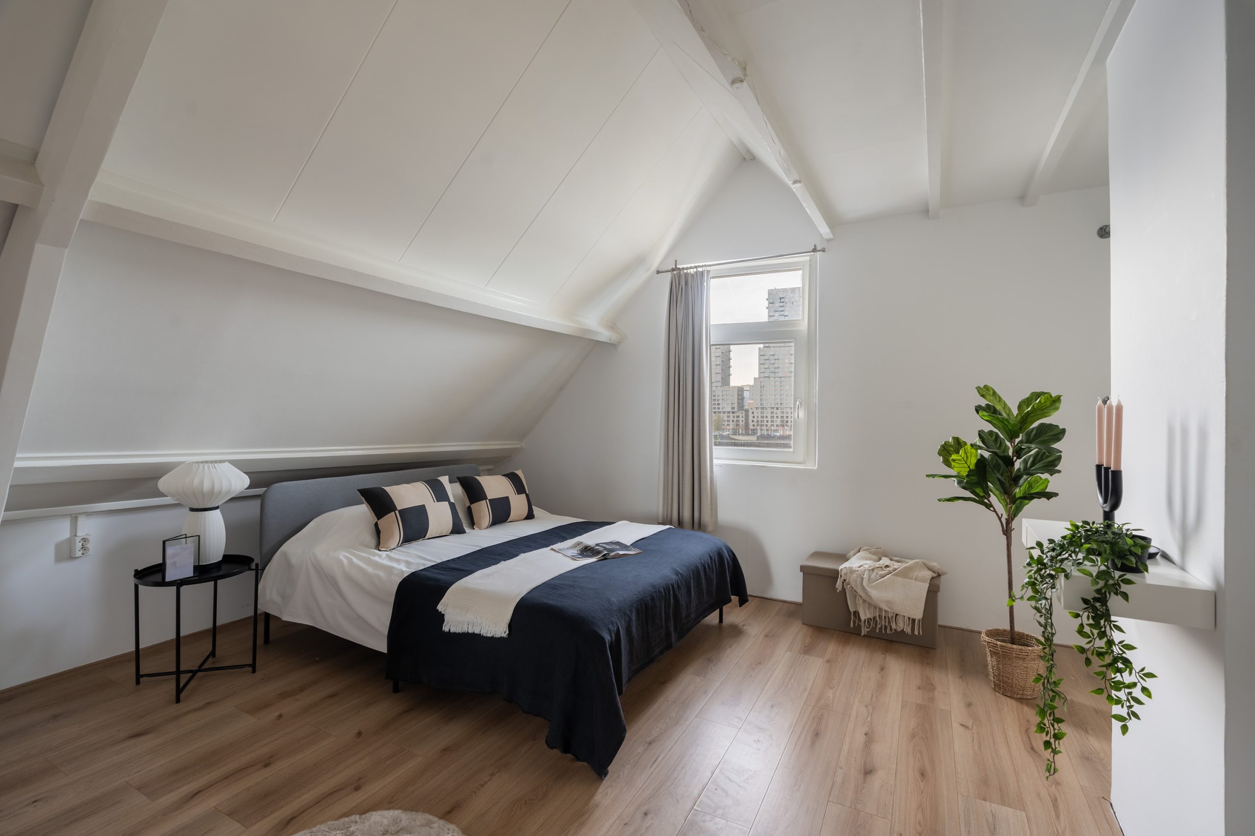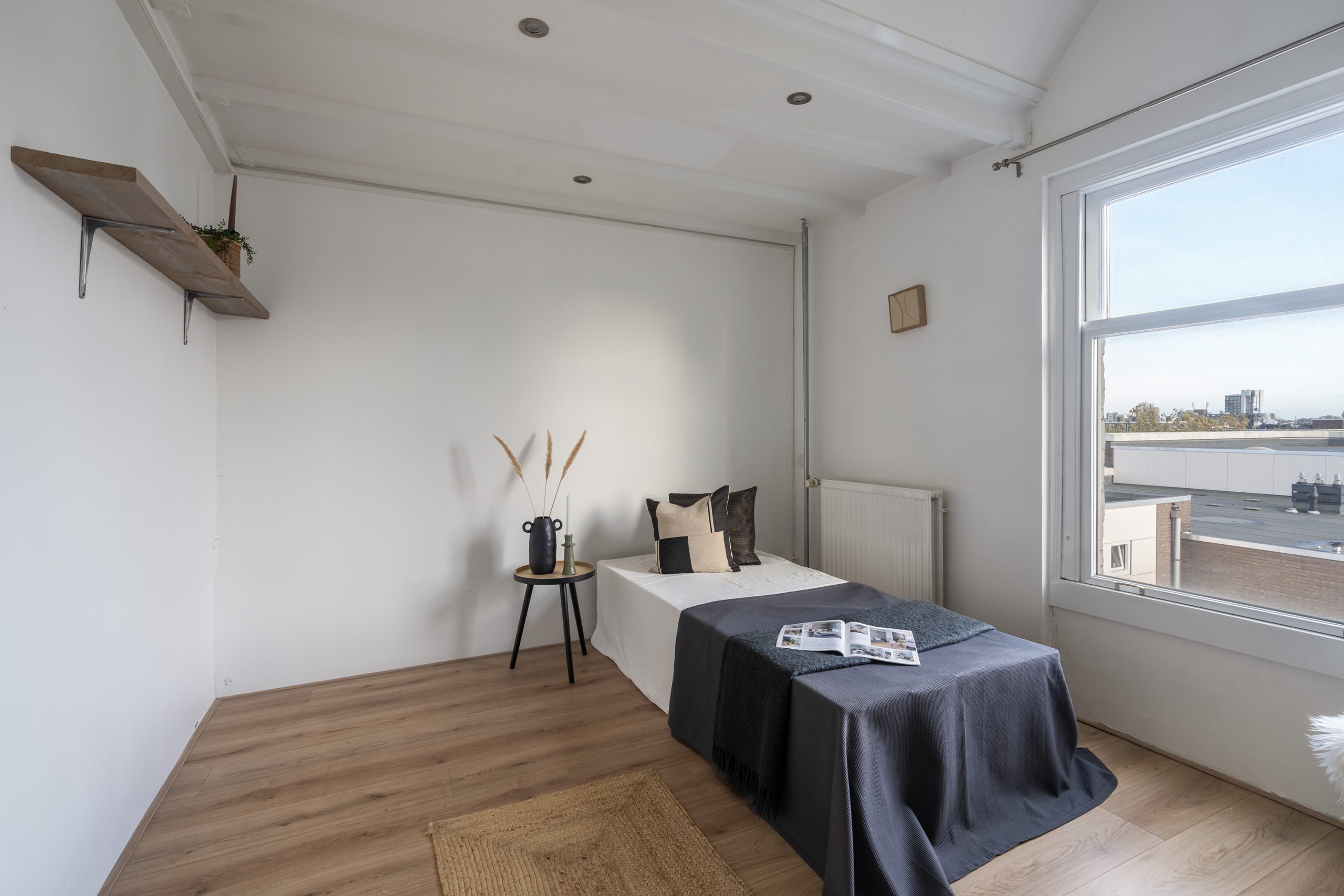 Op deze verdieping bevinden zich twee royale slaapkamers. De hoofdslaapkamer, gelegen aan de achterzijde van de woning, heeft een eigen toegang tot een separaat toilet met wastafel. Handig om te weten: er is tevens een aansluiting voor een douche, waardoor hier eenvoudig een tweede badkamer kan worden gerealiseerd. Ook zijn hier de houten balken in zicht, die zorgen voor een warme en sfeervolle uitstraling. De tweede slaapkamer heeft eveneens de houten balken in zicht, die worden gecombineerd met inbouwspots. Op de overloop met dakraam is een vaste kast met schuifdeuren te vinden, waar de cv-opstelling en de aansluiting voor de wasmachine en droger zijn gevestigd. De vaste trap brengt je naar het dakterras.