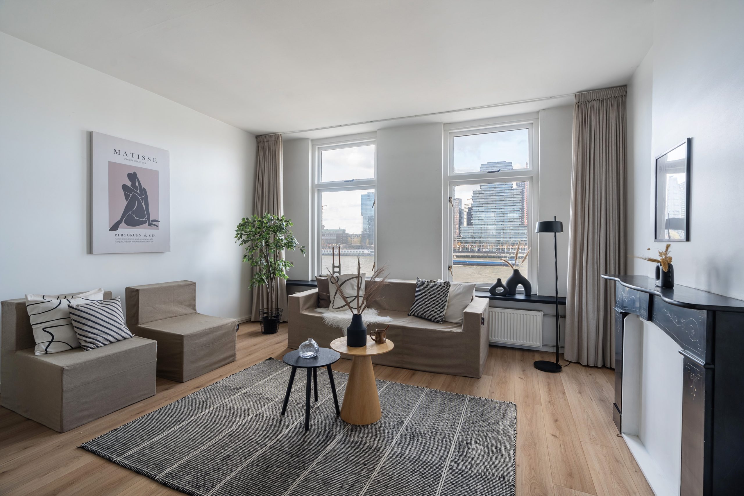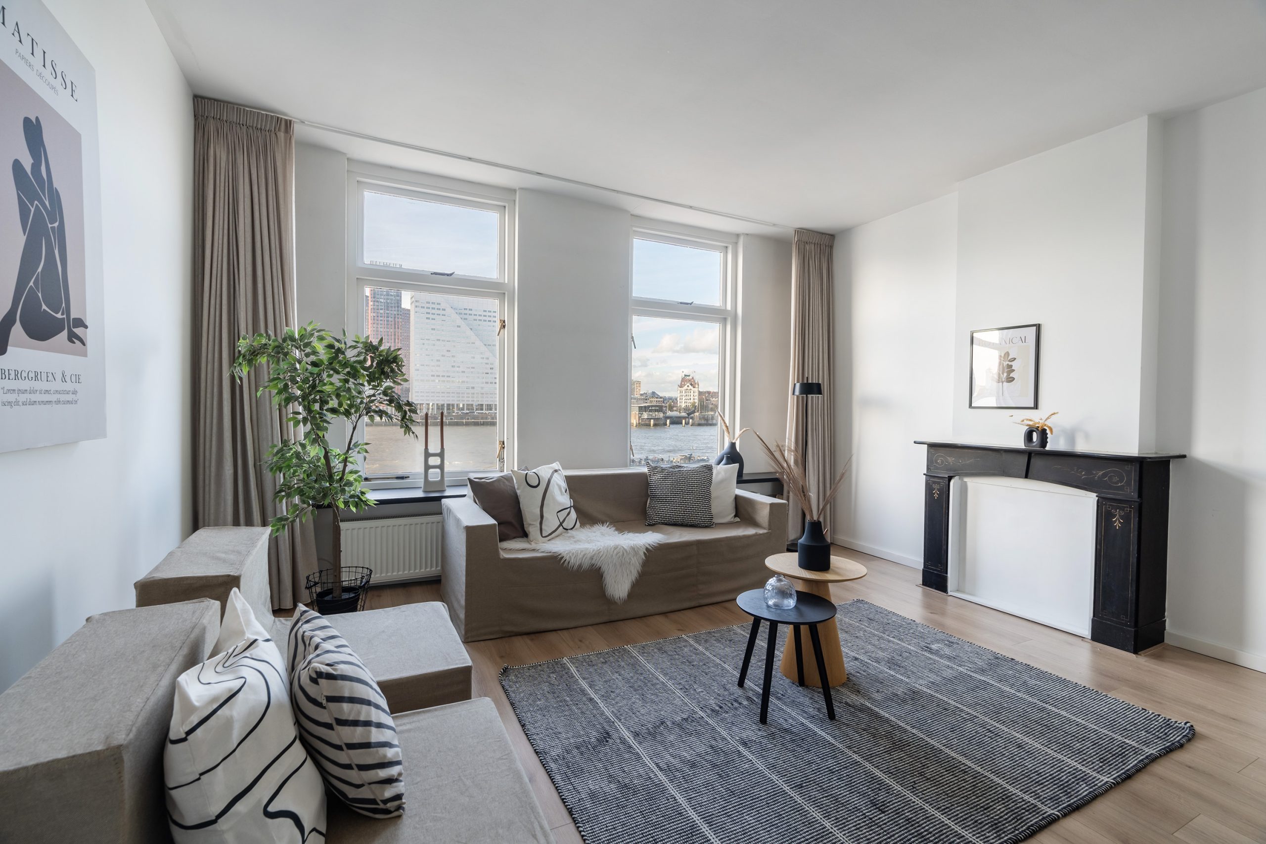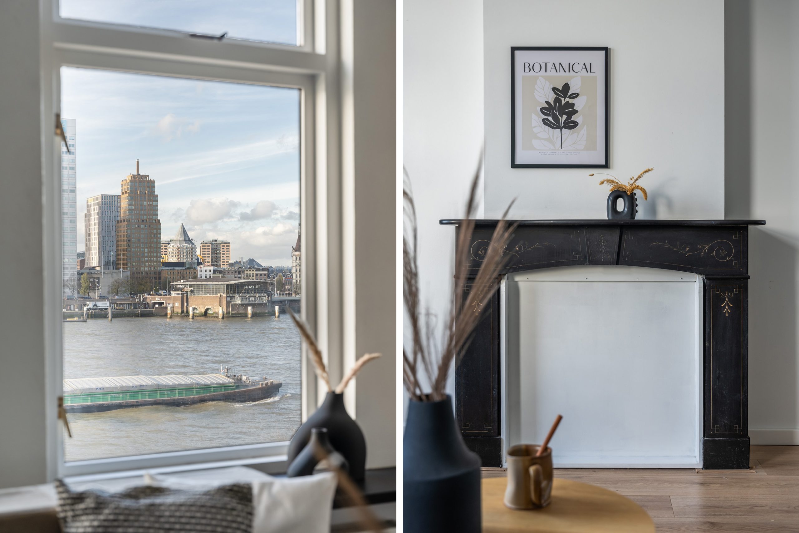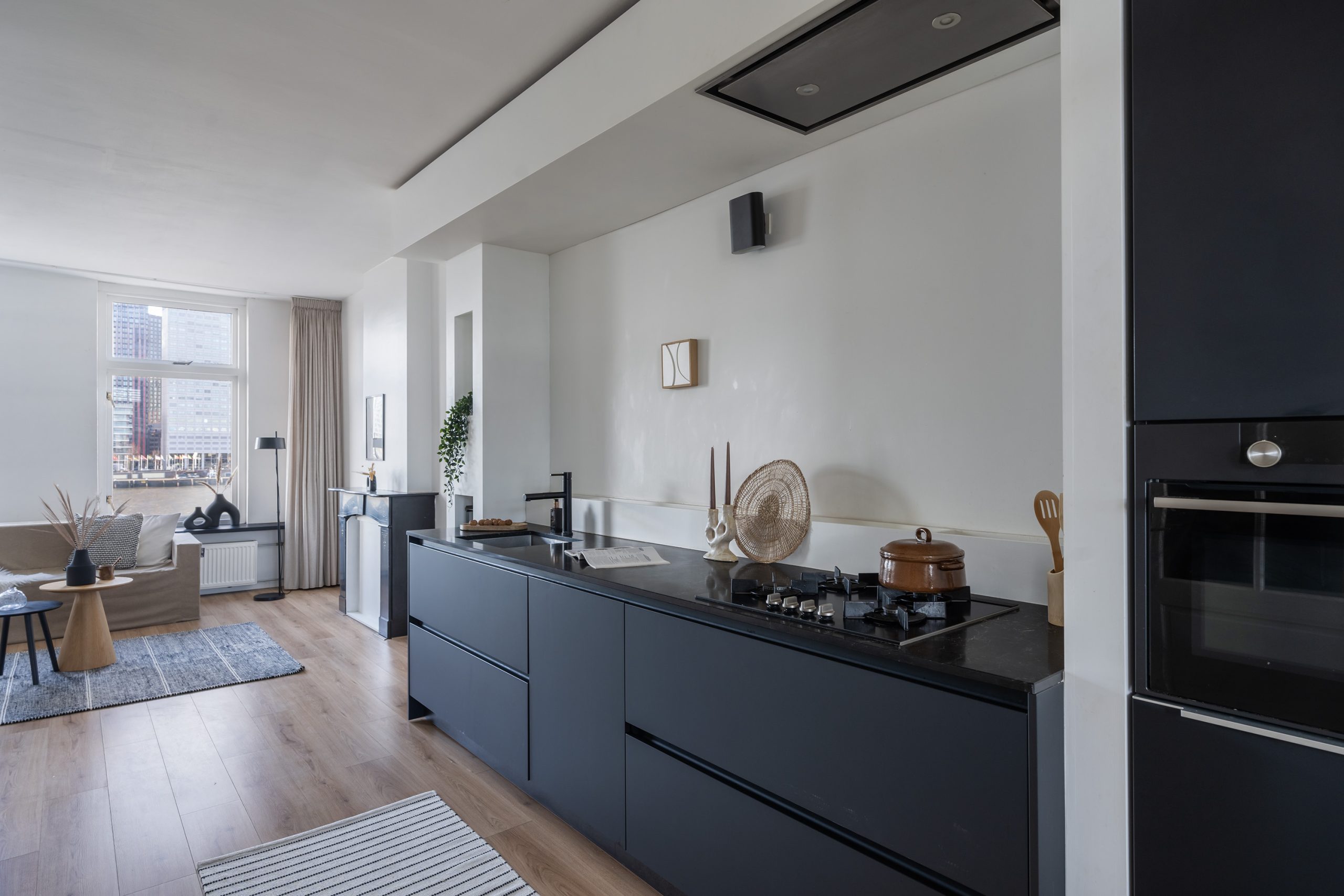 Kom binnen in de hal, die toegang geeft tot de verschillende vertrekken, waaronder het royale leefgedeelte. De moderne afwerking is het eerste wat opvalt! De strak gestucte wanden en de lichte laminaatvloer geven de woning een frisse uitstraling. Eenmaal in de woonkamer stroomt het daglicht via de grote raampartijen aan de voorzijde van de woning heerlijk naar binnen. Vanuit hier geniet je ook nog eens van een schitterend uitzicht over de Maas en de imposante hoogbouw van Rotterdam. Er is voldoende ruimte voor een knusse zithoek, of plaats een comfortabele fauteuil bij het raam om te genieten van dit zicht. Een levend schilderij dat elk moment van de dag een andere sfeer heeft! Daarbij geeft de authentieke schouw extra veel sfeer aan de ruimte.