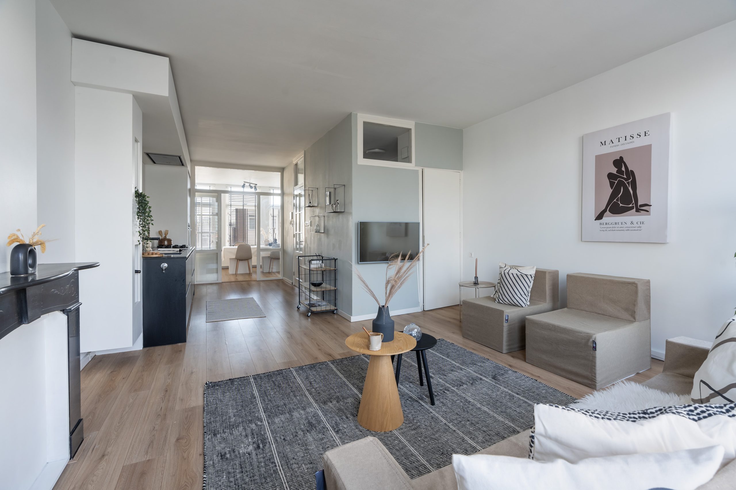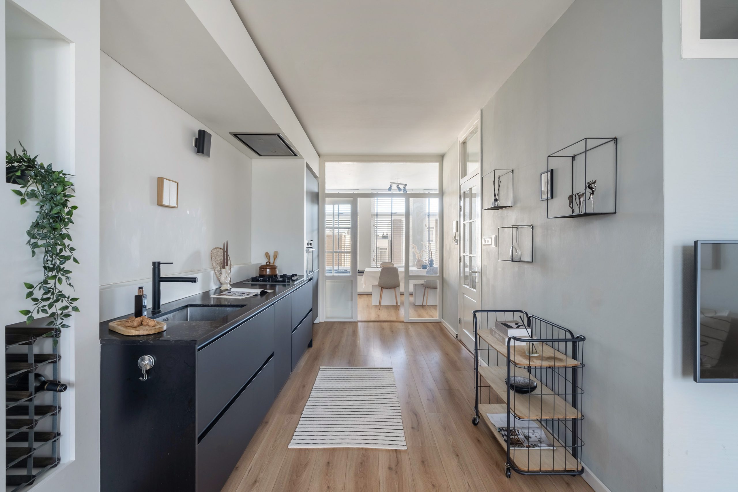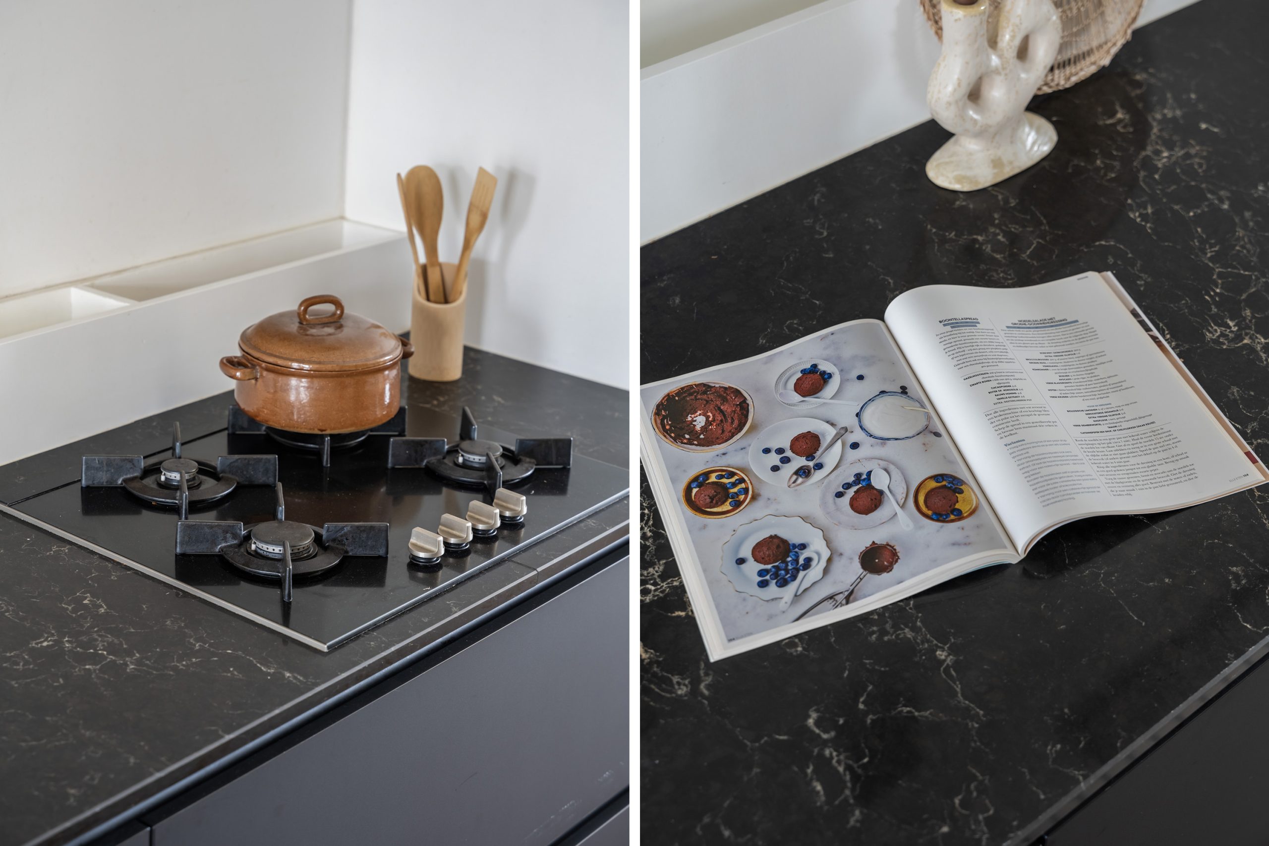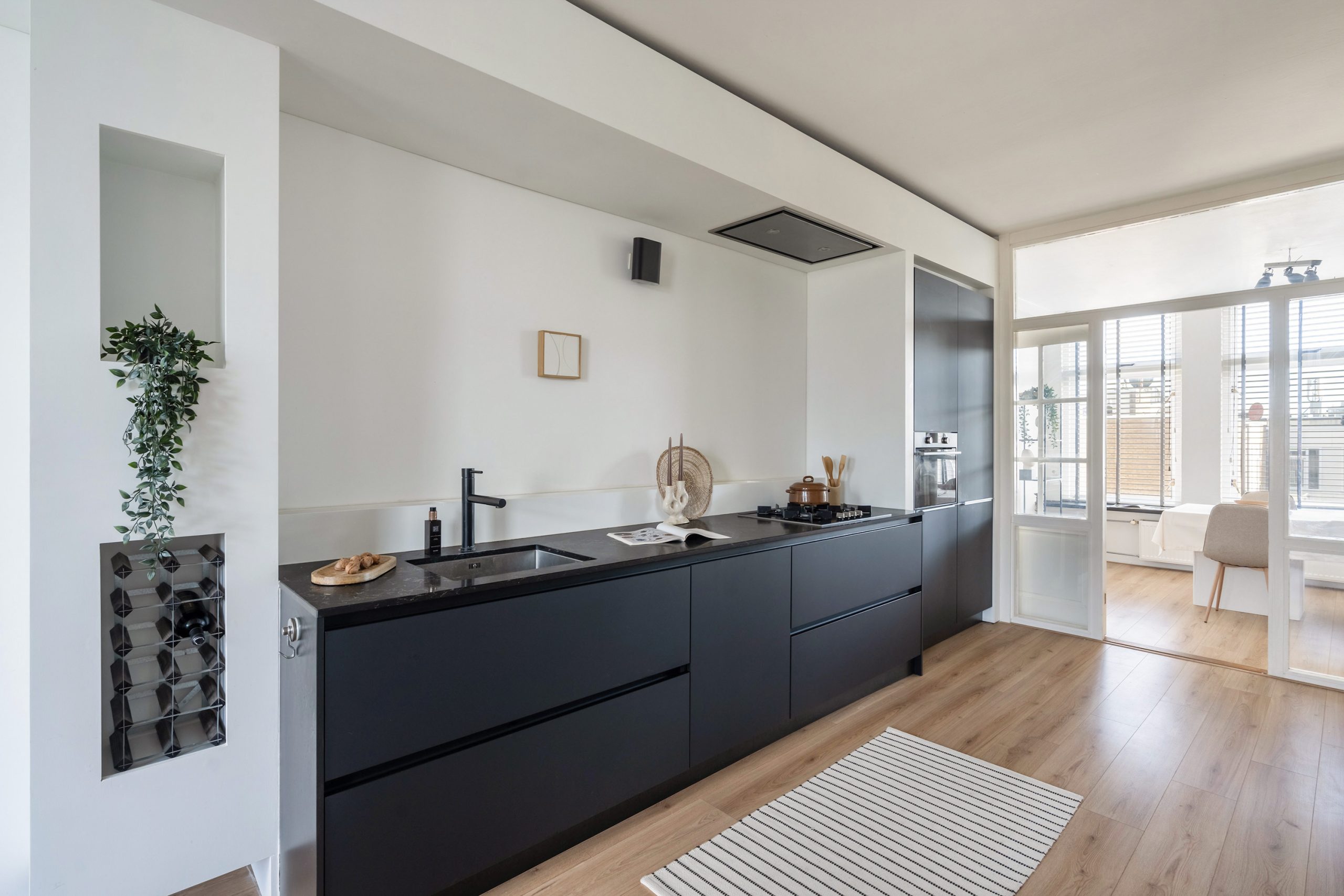 De keuken (2017), gesitueerd tussen het zit- en eetgedeelte, vormt het hart van de woning. De matzwarte fronten en het marmerlook aanrechtblad sluiten naadloos aan op de charmante schouw, wat zorgt voor een stijlvol en samenhangend geheel. De keuken is bovendien van alle gemakken voorzien en beschikt over een 4-pits gasfornuis, een in het plafond ingebouwde afzuigkap, combi-oven, koel-vriescombinatie en vaatwasser. Alles wat je nodig hebt om heerlijk te kokkerellen!
