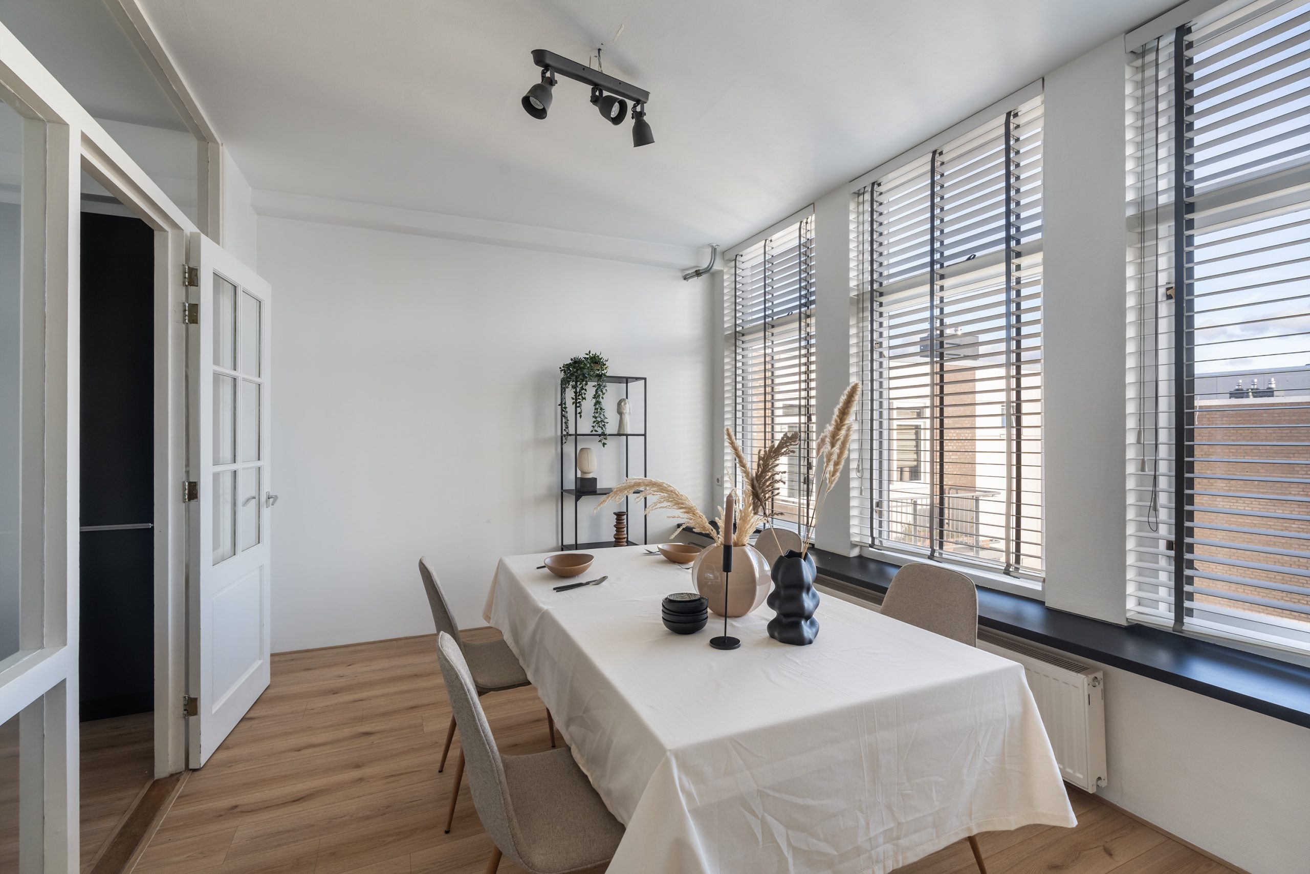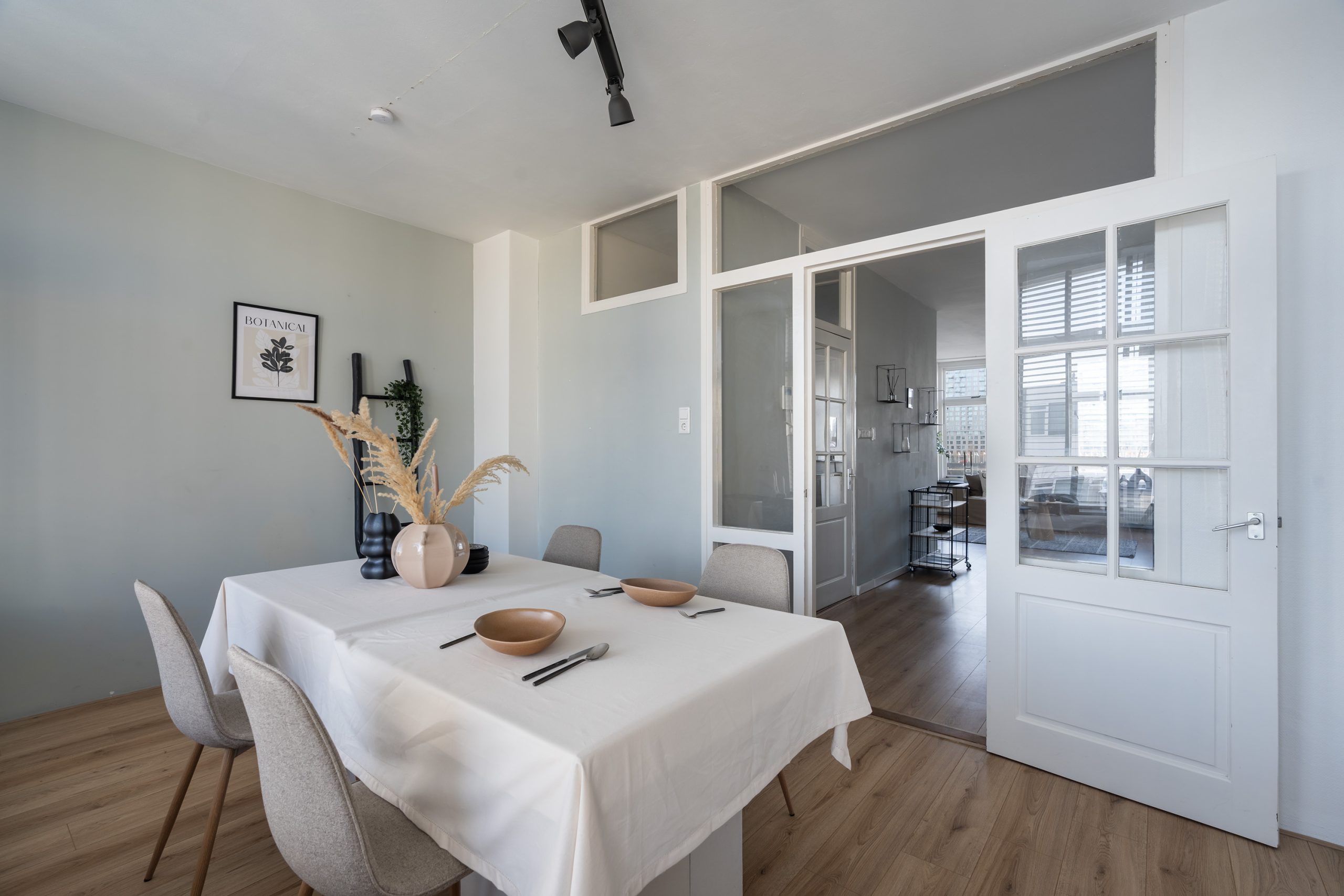 Via de karaktervolle en-suite deuren betreed je de eetkamer aan de achterzijde van de woning. Wederom een lichte ruimte, dankzij de raampartijen over de volledige breedte. Genoeg plek voor een lange eettafel om optimaal te genieten van lekker lang tafelen met vrienden en familie. Bovendien is het mogelijk om van deze kamer een extra slaapkamer te maken, mocht je meer slaapruimte wensen. Ideaal!