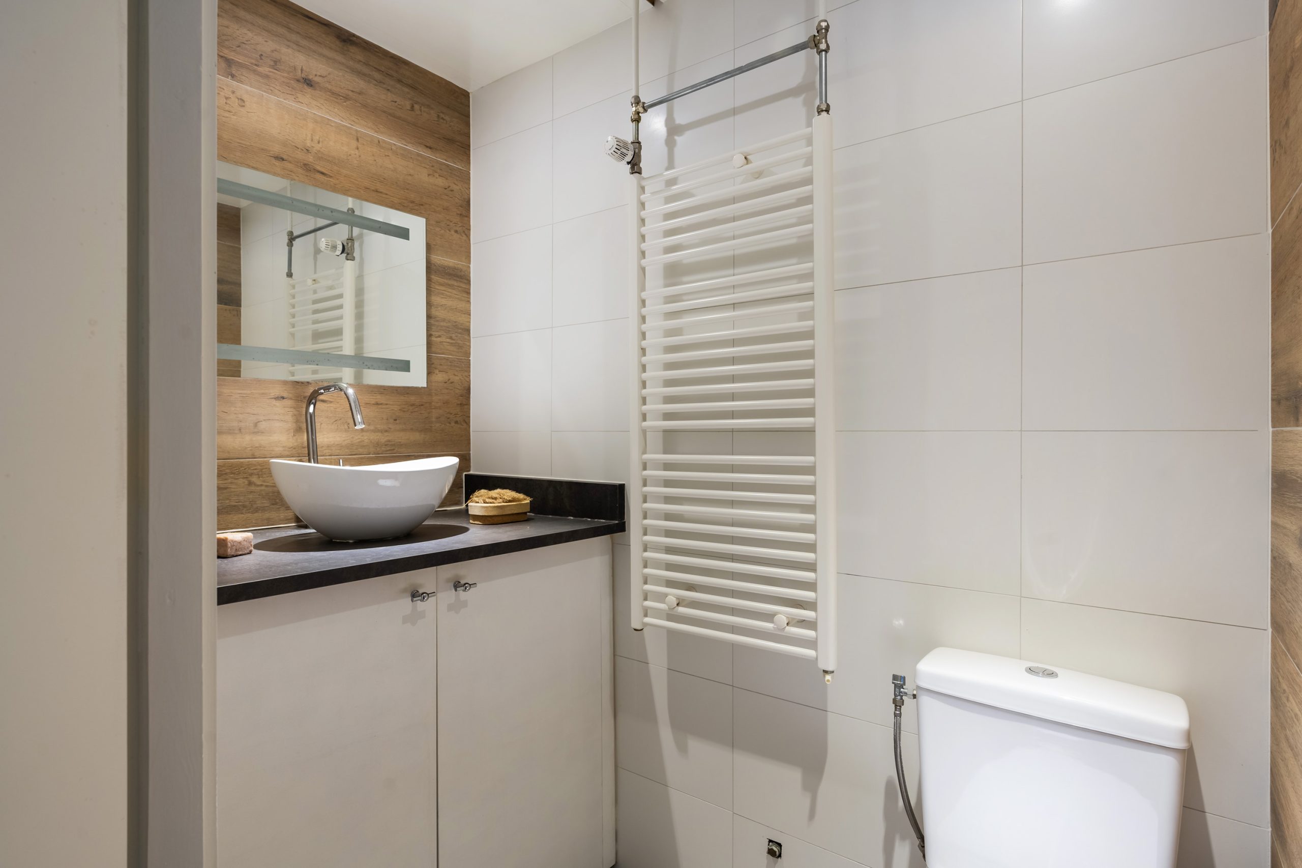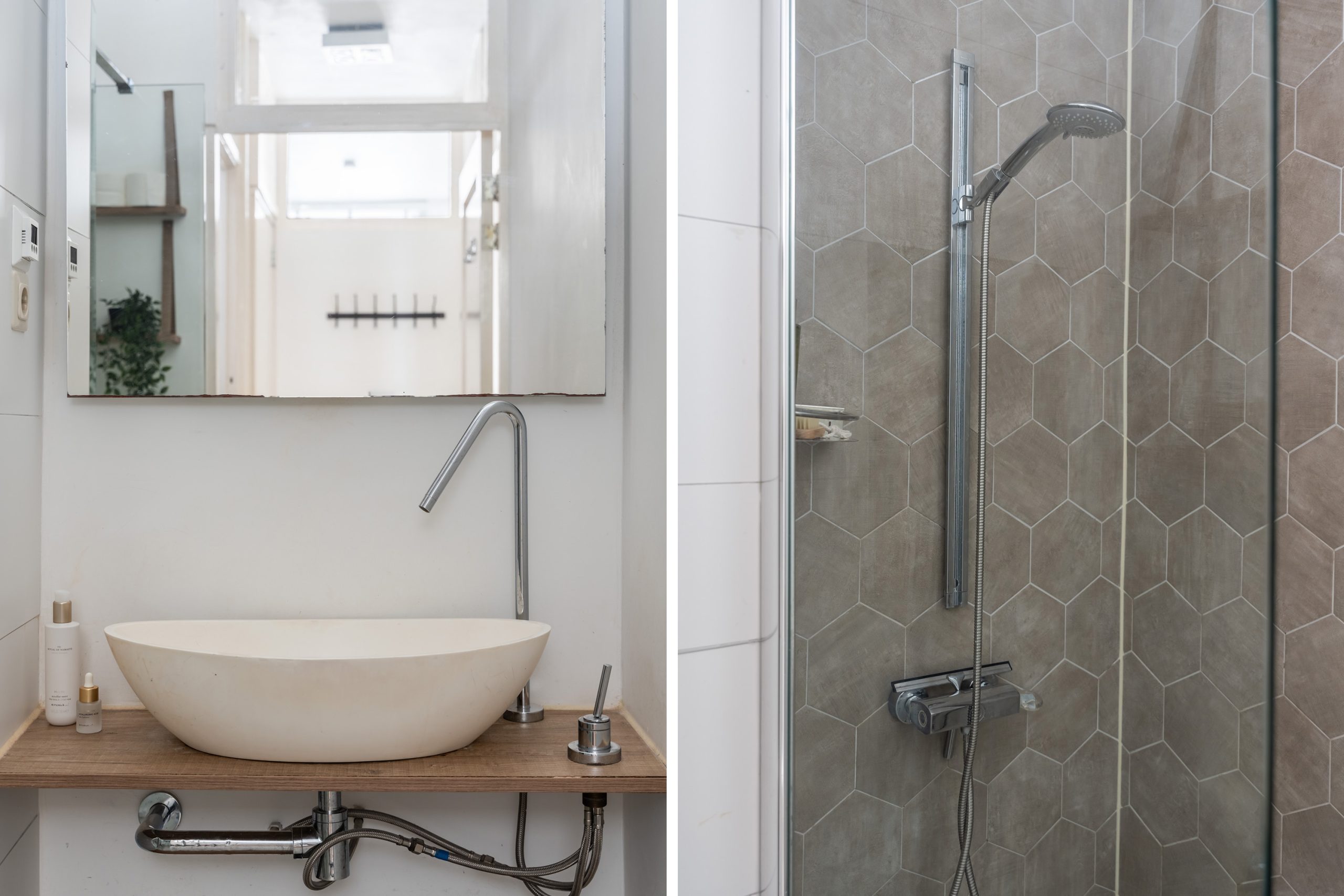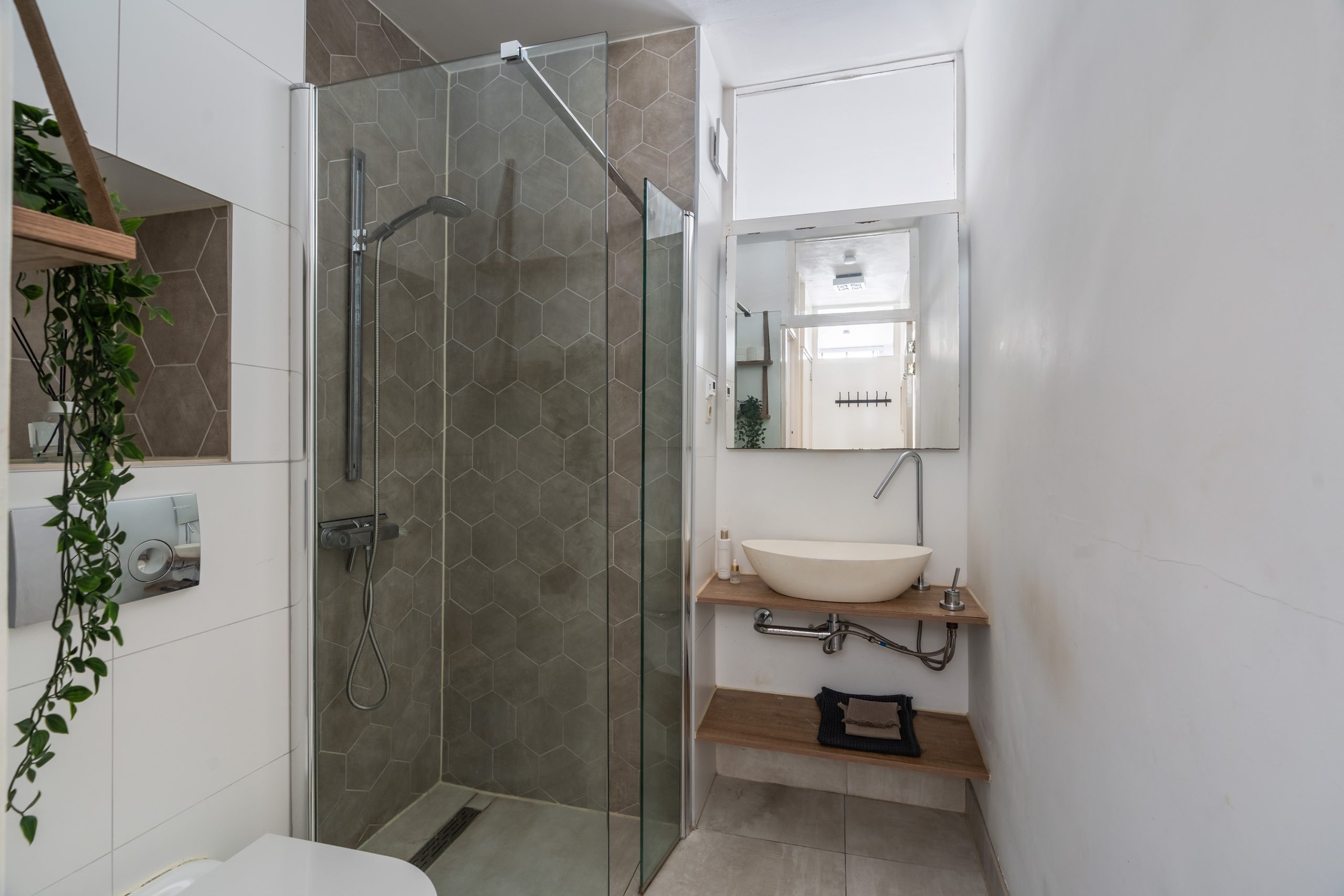 Terug in de hal bereik je de badkamer (2017), die is voorzien van een inloopdouche met hippe hexagontegels, een wastafel met plankjes en een toilet.