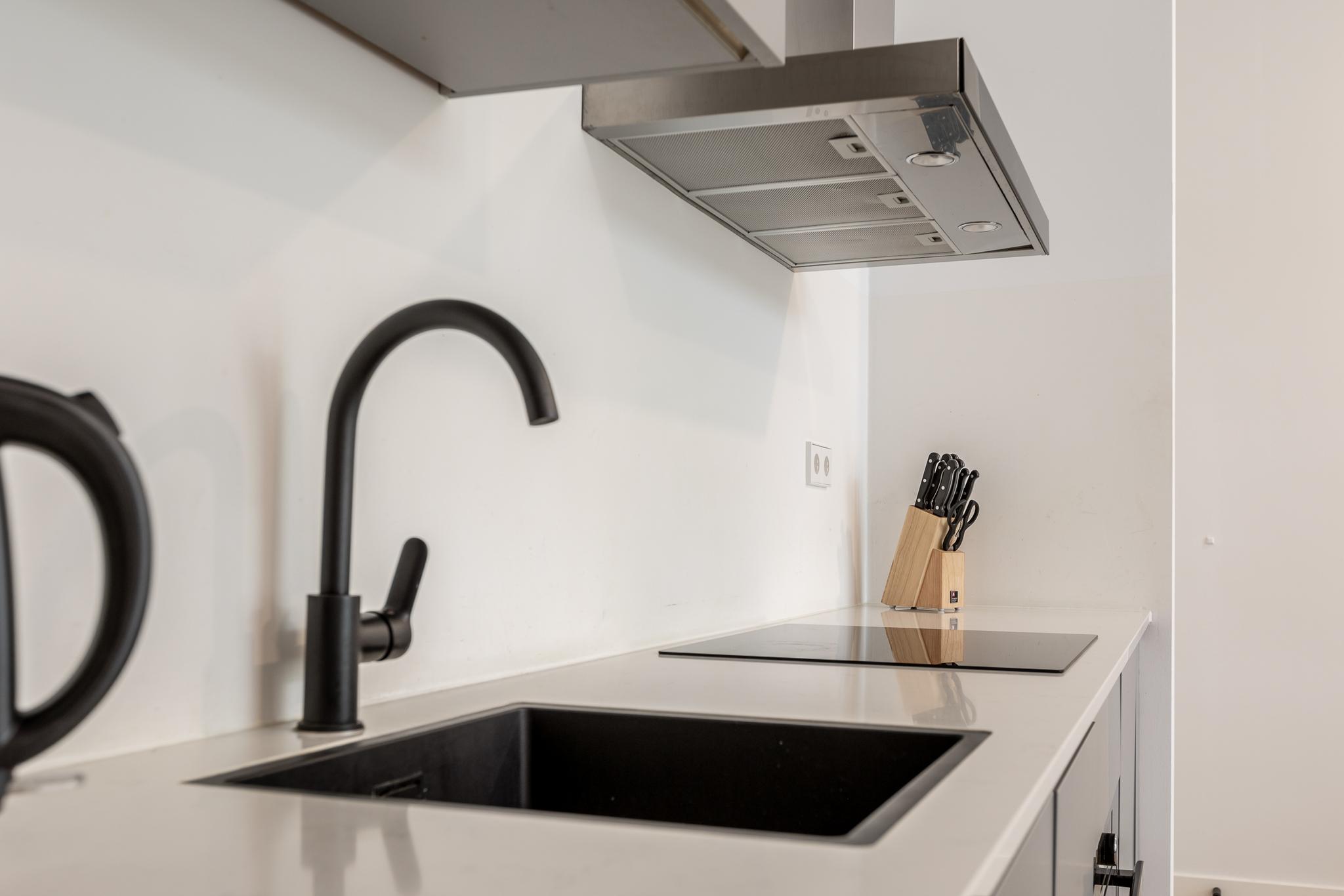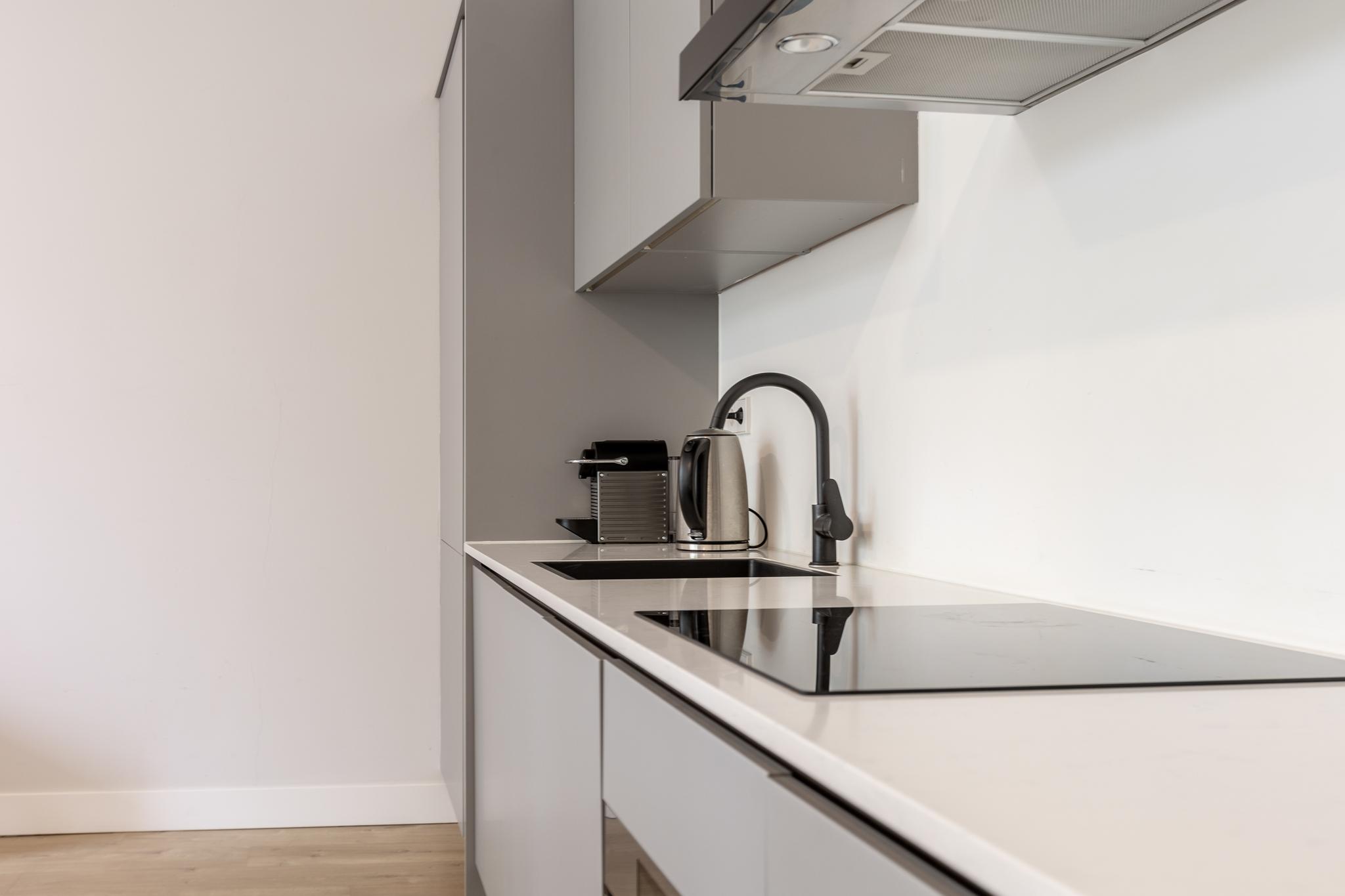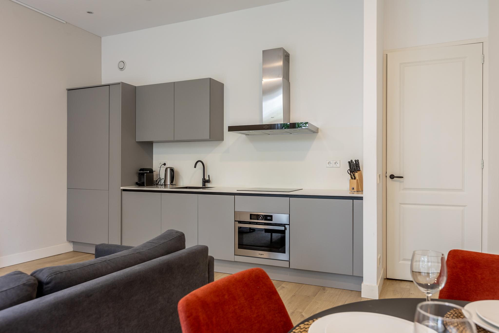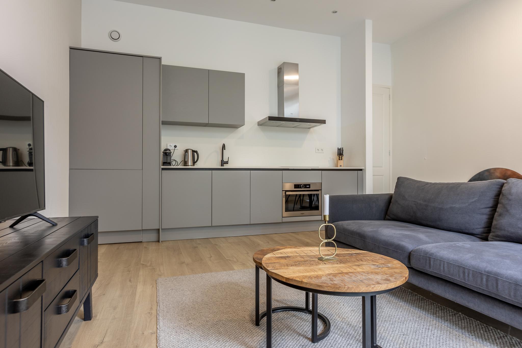 De entree wordt gevolgd door een hal die op zijn beurt weer toegang geeft aan het toilet met fonteintje. De hal geeft toegang aan de woonkamer (met riante hoogte van ca 3,08m) welke overloopt in een flink balkon waar je prettig kunt zitten met uitzicht op de binnentuin. Aan de achterzijde van de woonkamer vind je luxe keuken welke voorzien is van de volgende apparatuur: inductiekookplaat, combimagnetron, vaatwasser, afzuigkap, koelkast en vriezer. Een kast met de CV ketel en wasmachine aansluiting maakt het geheel compleet.
