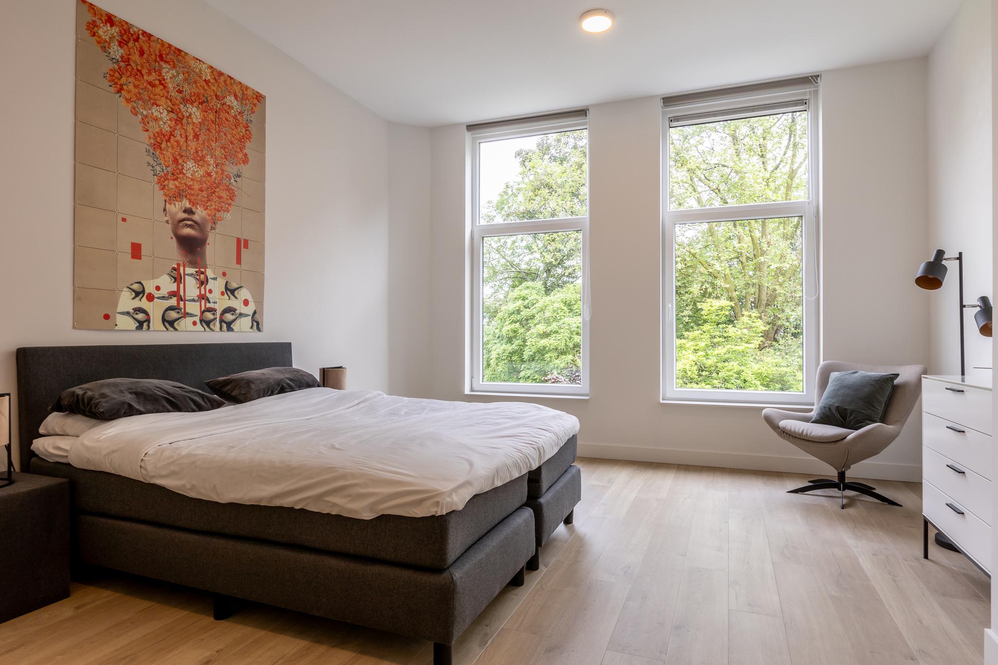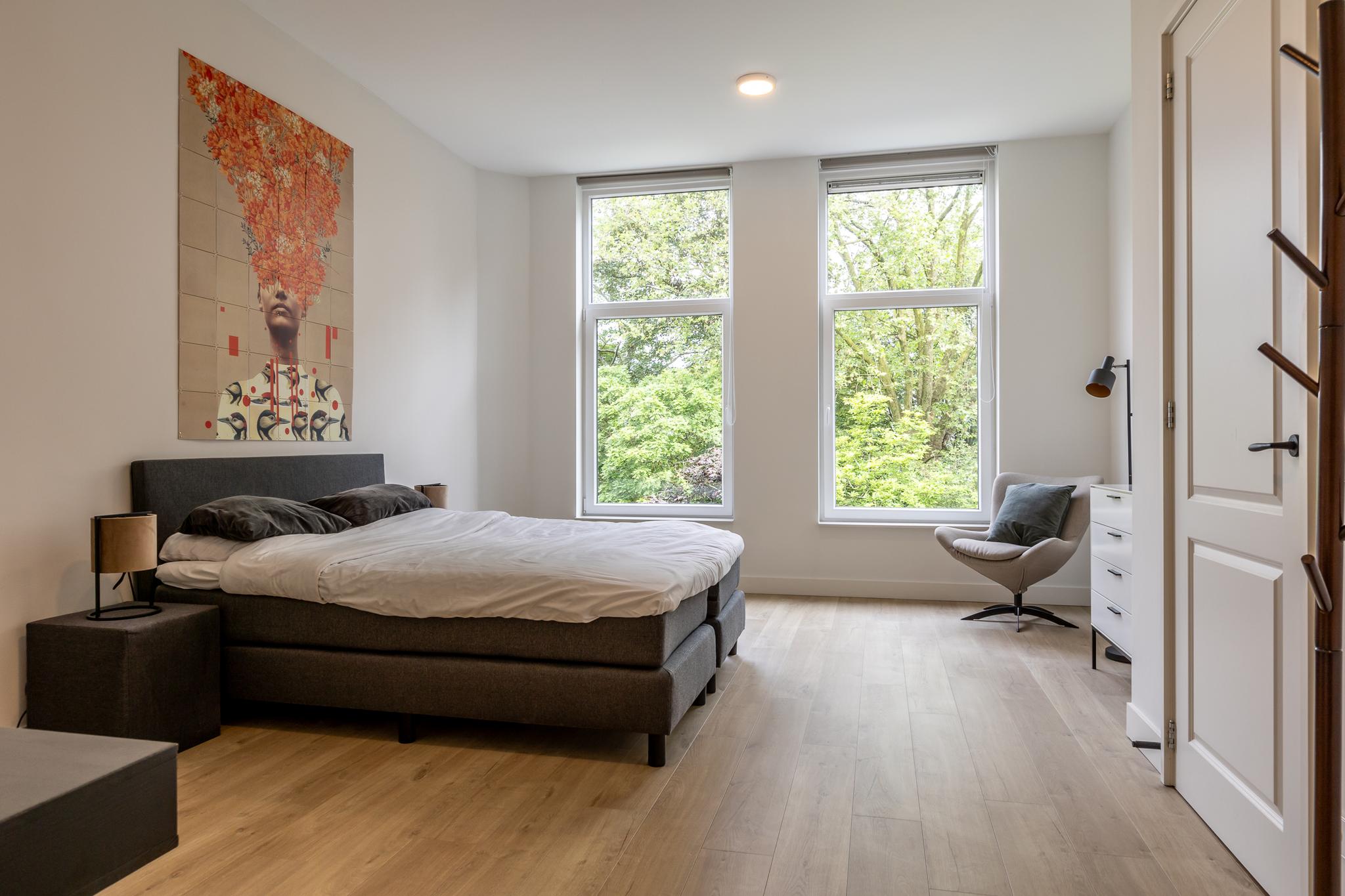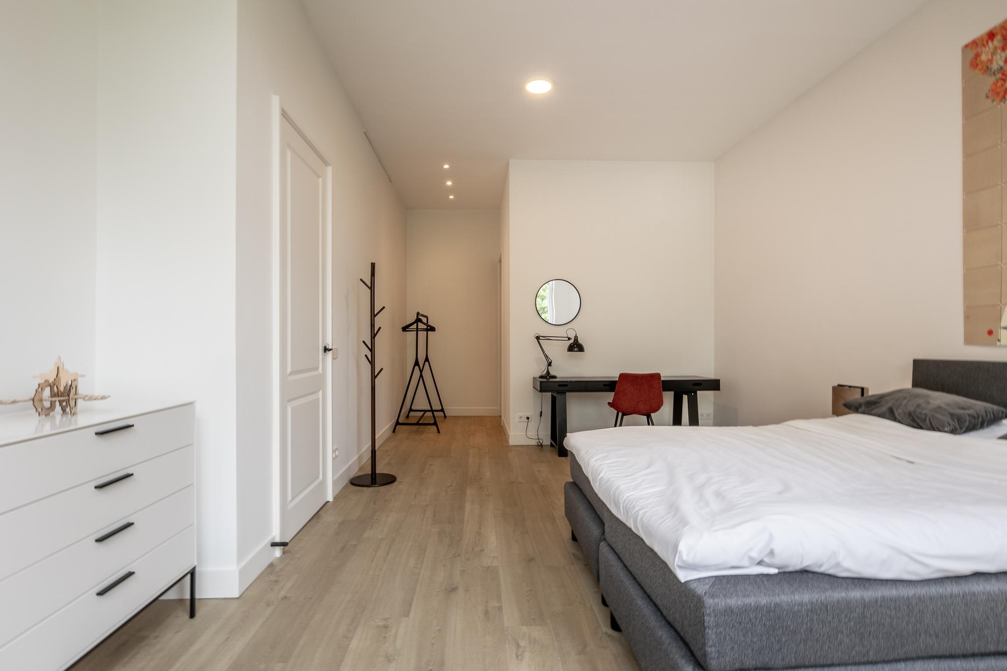 Vanuit de woonkamer loop je zo de grote slaapkamer in welke groot genoeg is voor een kantoorhoekje. De badkamer is aansluitend aan je slaapkamer hetgeen de luxe badkamer meer beleving geeft. De badkamer is voorzien van 2e toilet, wastafel in meubel, fijne inloopdouche en naast je vloerverwarming ook nog een handdoekenradiator.