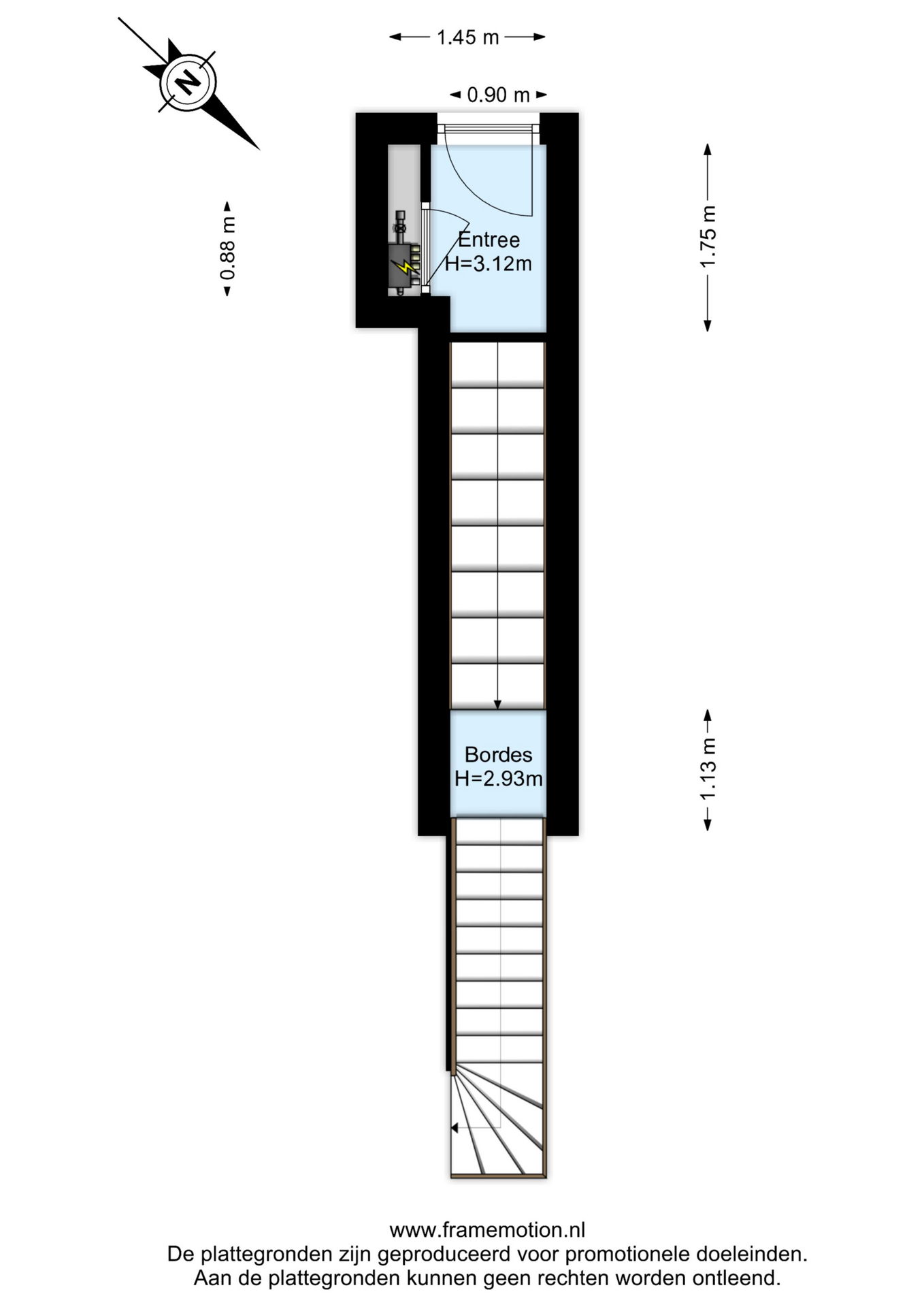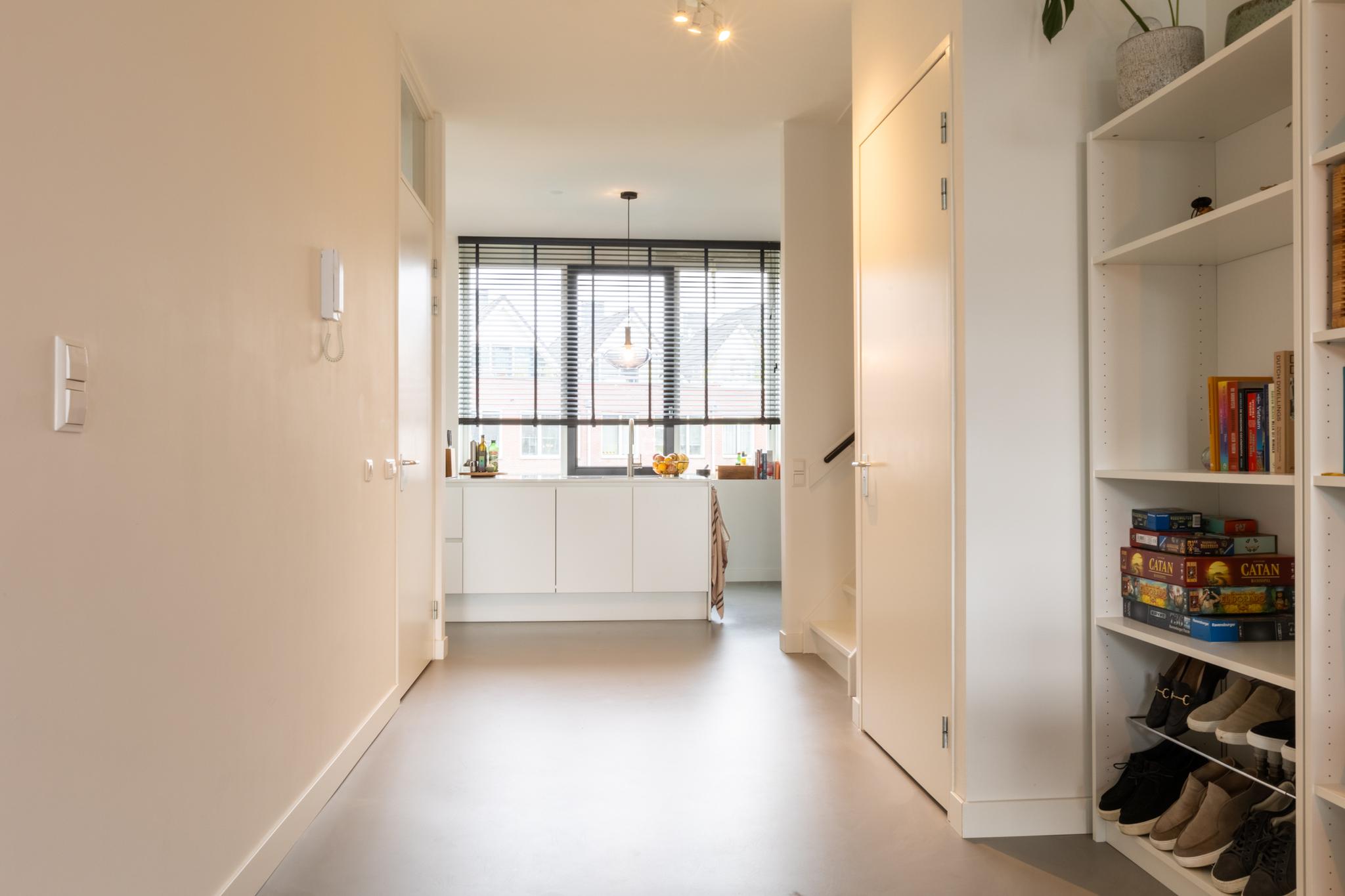 Afgesloten entree met meterkast en trapopgang naar het appartement. Onder de trap is een ruime berging te vinden; ideaal voor het stallen van fietsen of een kinderwagen.