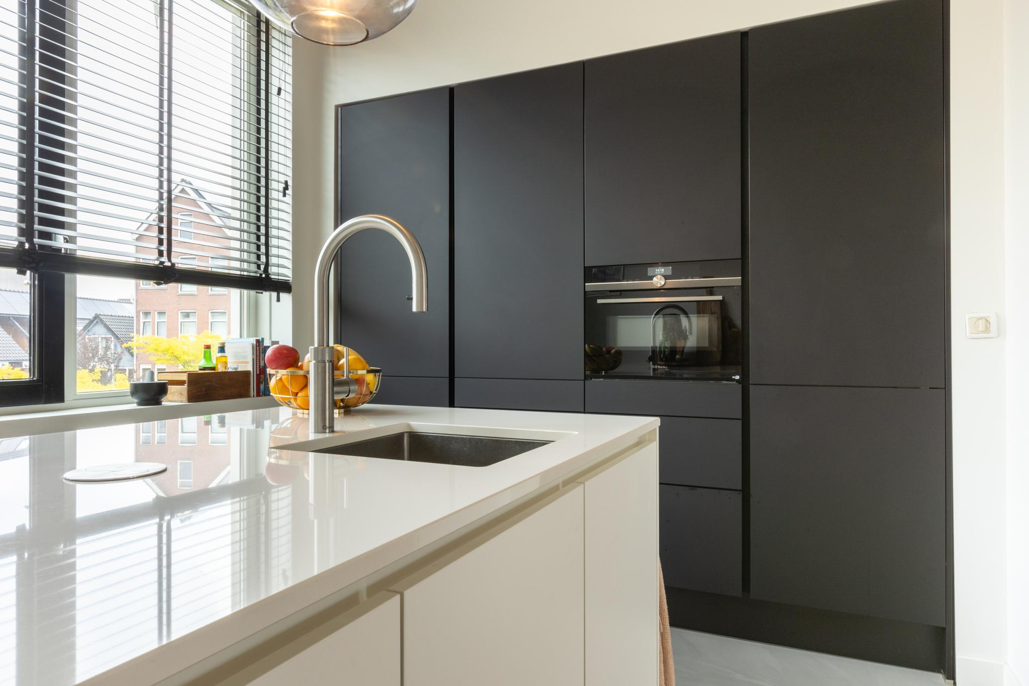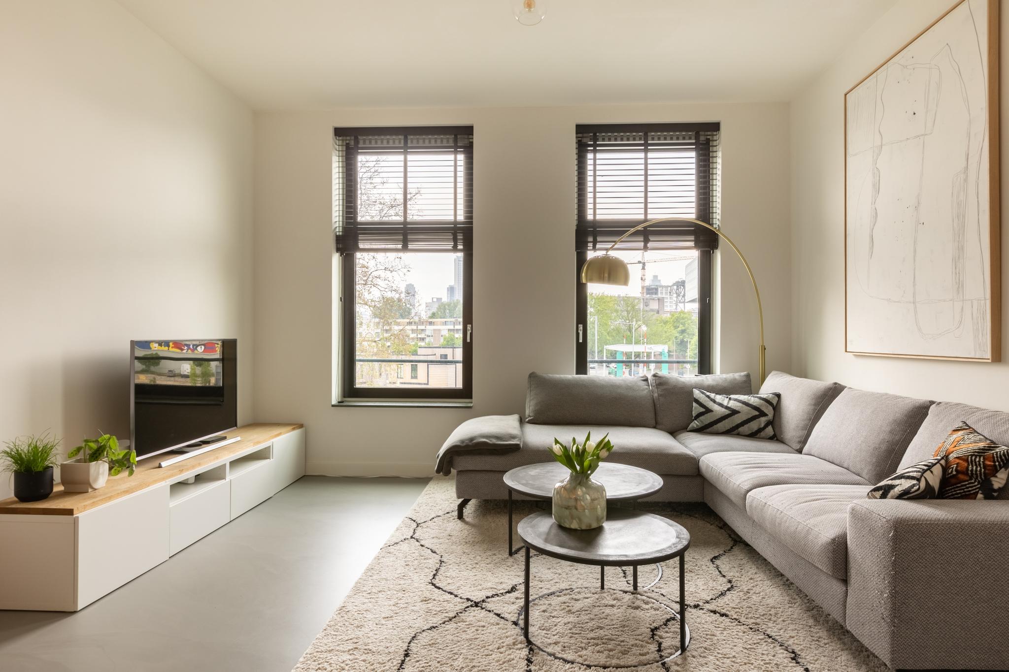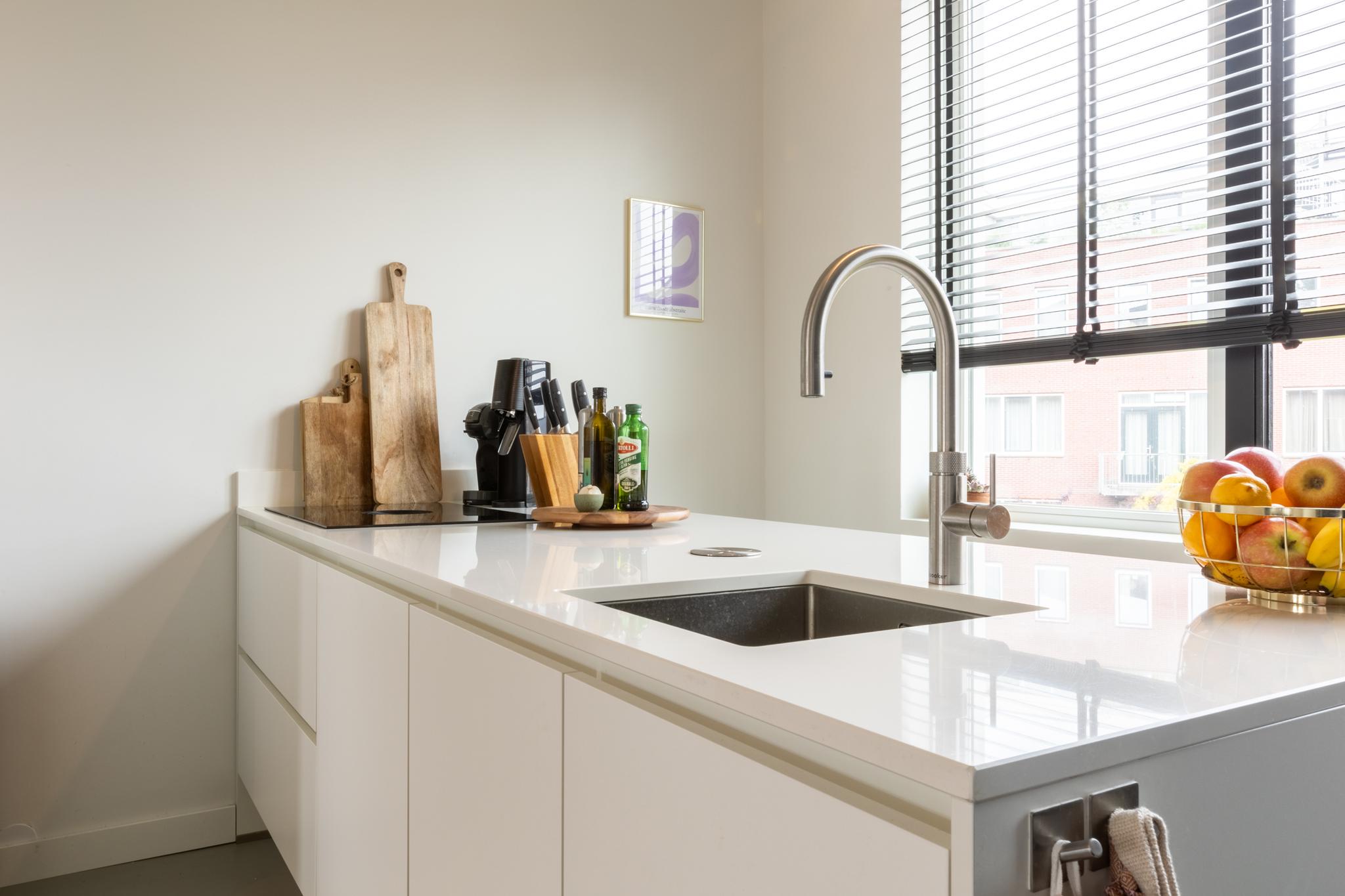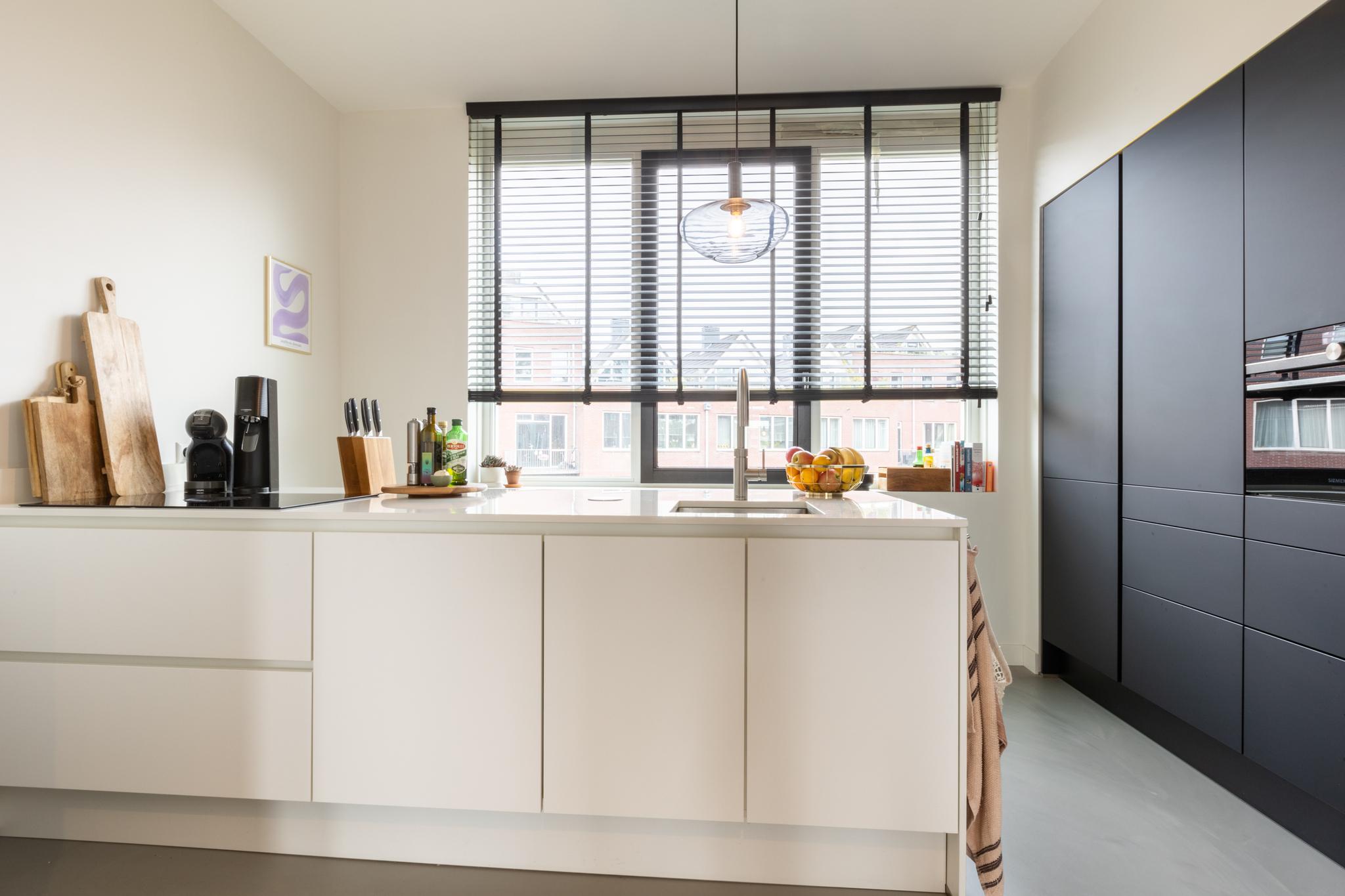 Treed binnen in dit moderne appartement waar je aan de voorkant een lichte en ruime woonkamer vindt. Heerlijk uitzicht hier! Grote ramen zorgen voor een overvloed aan natuurlijk licht, waardoor dit de perfecte plek is voor een comfortabele zithoek. De moderne en luxe open keuken is volledig uitgerust, inclusief een Bora inductiekookplaat met geïntegreerde afzuiging, een quooker en een vaatwasser. Ideaal voor het bereiden van gezellige diners. Deze verdieping is tevens voorzien van een gietvloer met vloerverwarming en je vindt er een toilet.