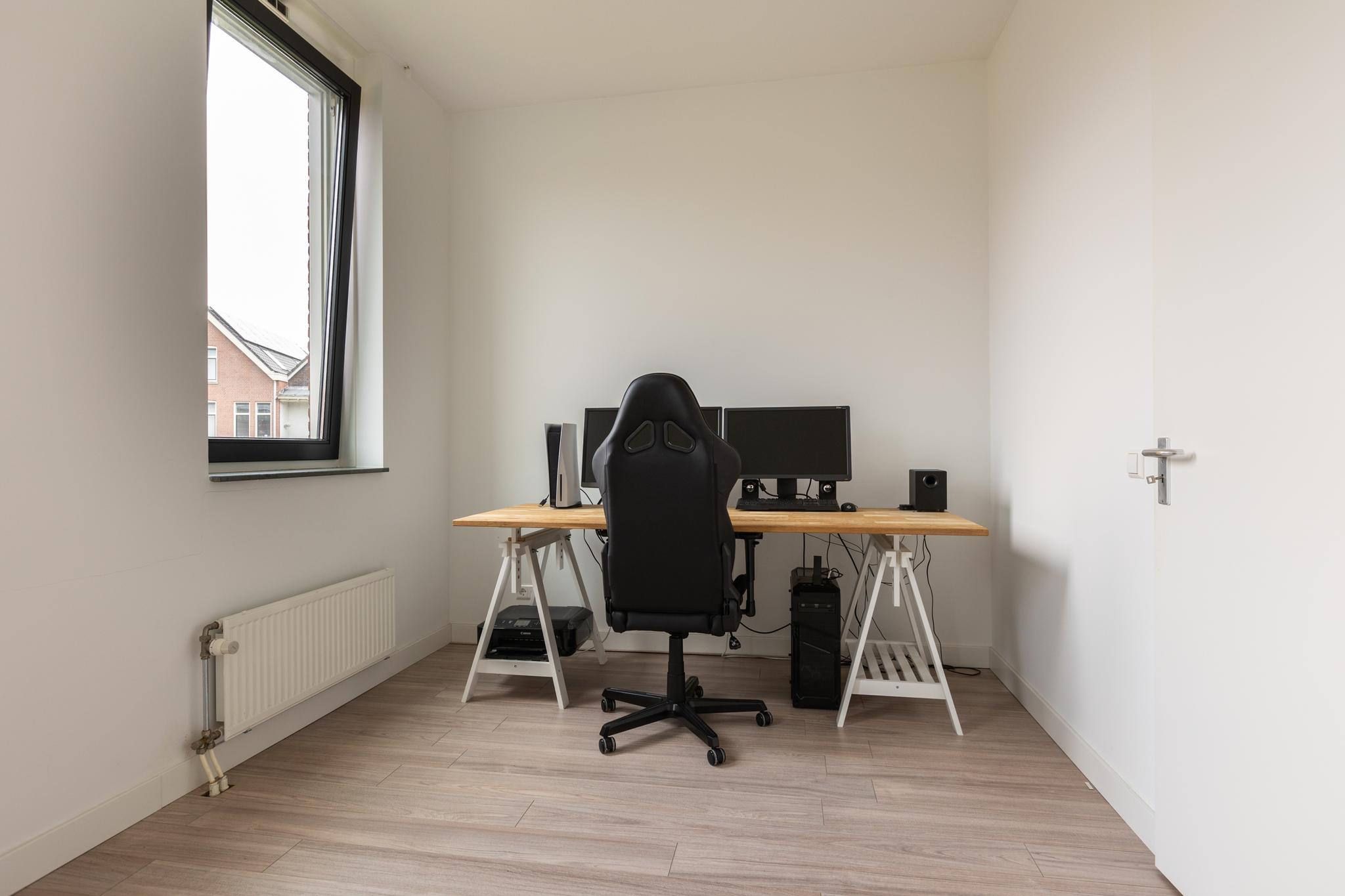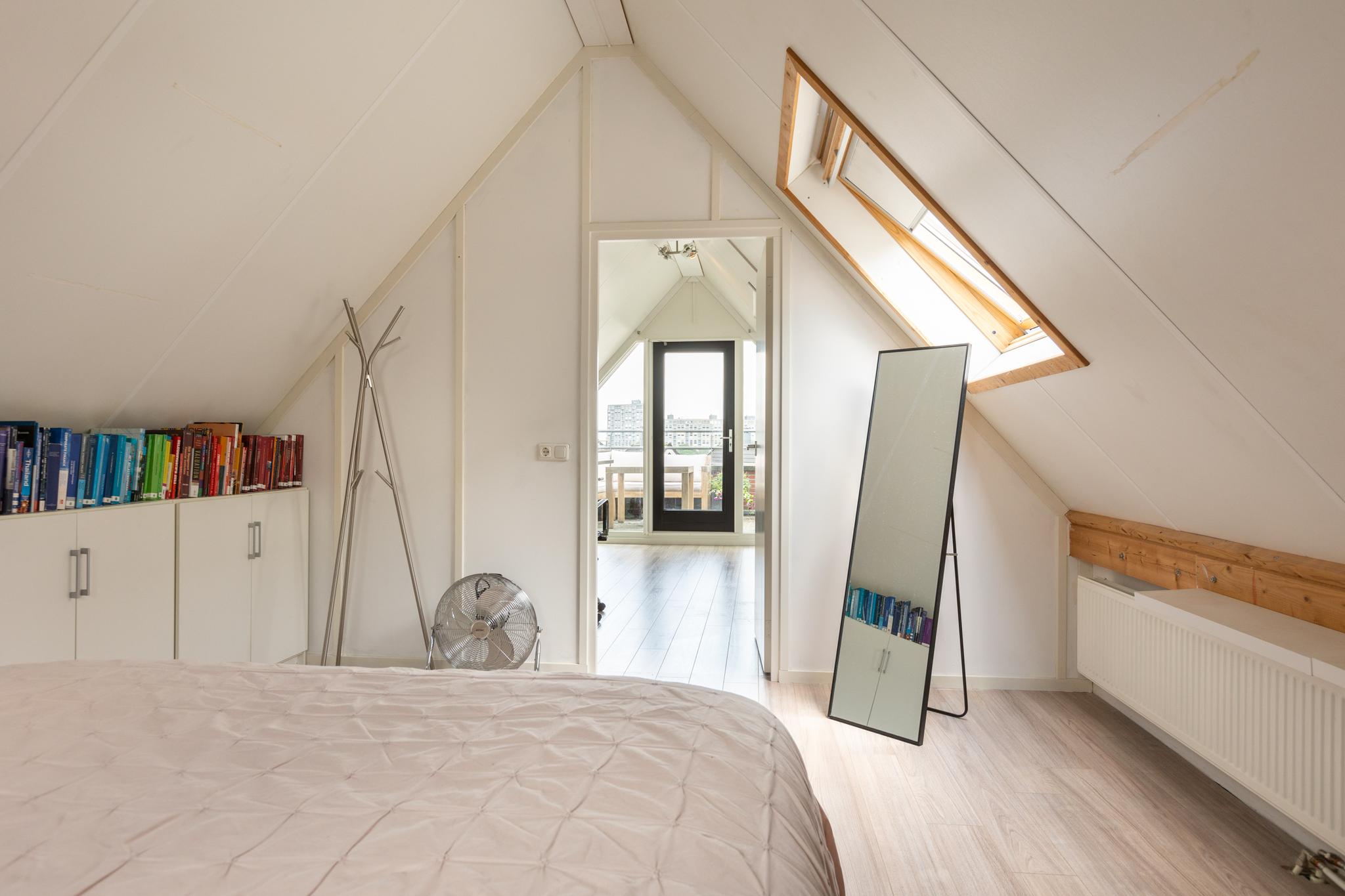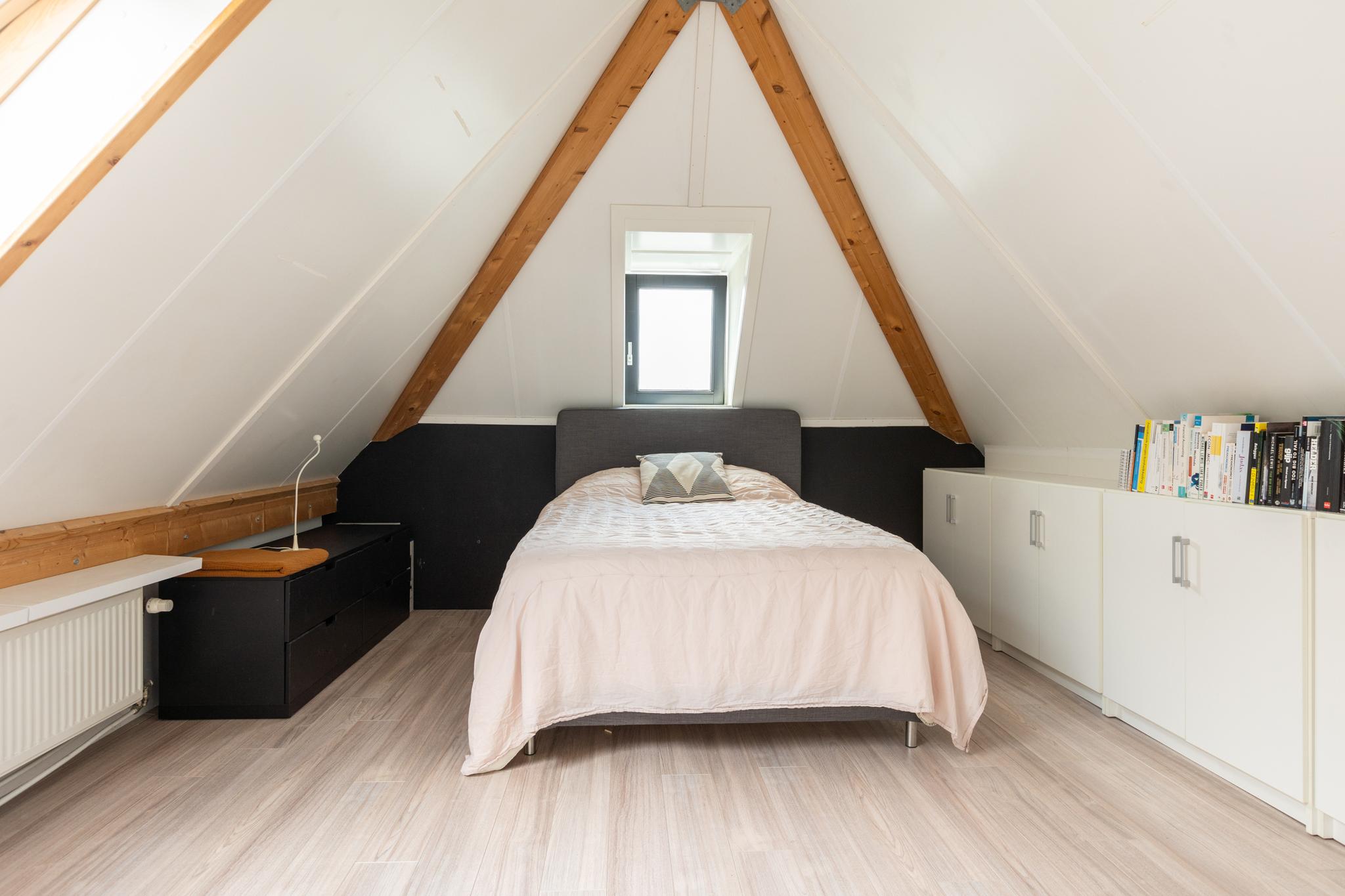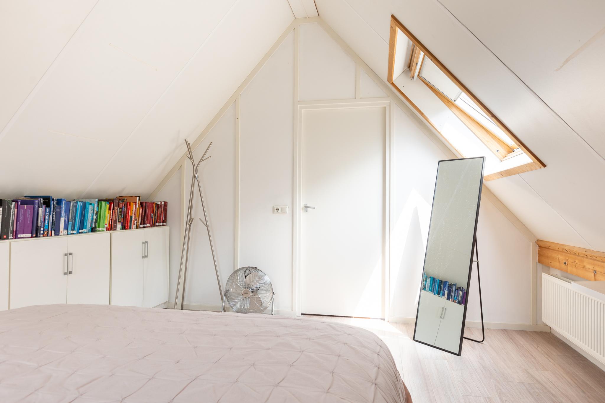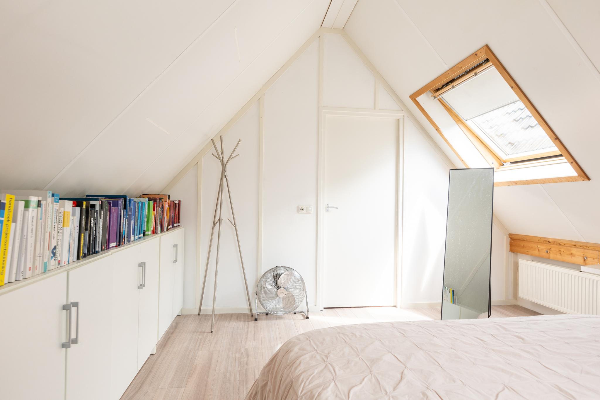 Op deze etage bevindt zich de royale derde slaapkamer van ongeveer 20 m². Het dakraam zorgt voor extra lichtinval en de hoge nok geeft een ruimtelijk gevoel. De ruime overloop biedt veel flexibiliteit: je kunt deze gebruiken als extra bergruimte of als een ideale thuiswerkplek. Praktisch en veelzijdig! Hier vind je ook de opstelling voor de cv-ketel en de aansluitingen voor wasmachine en droger.