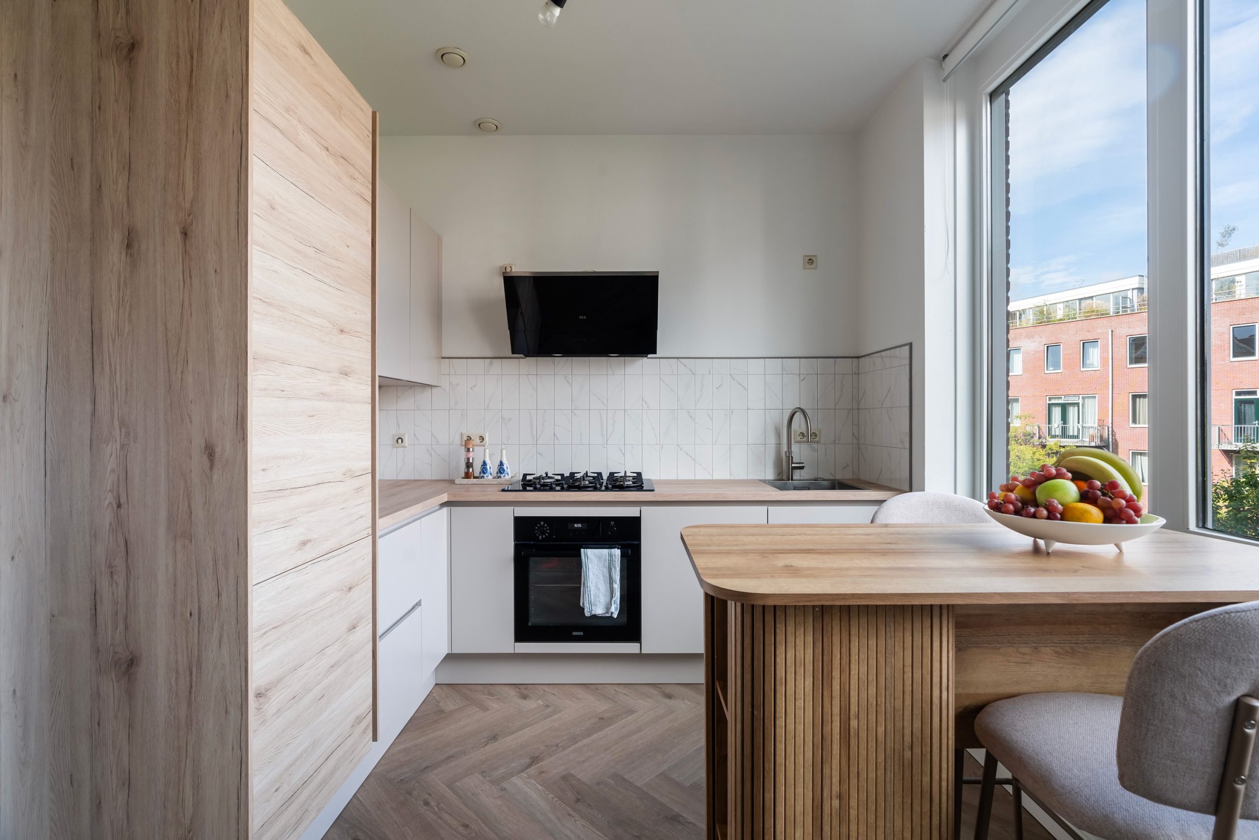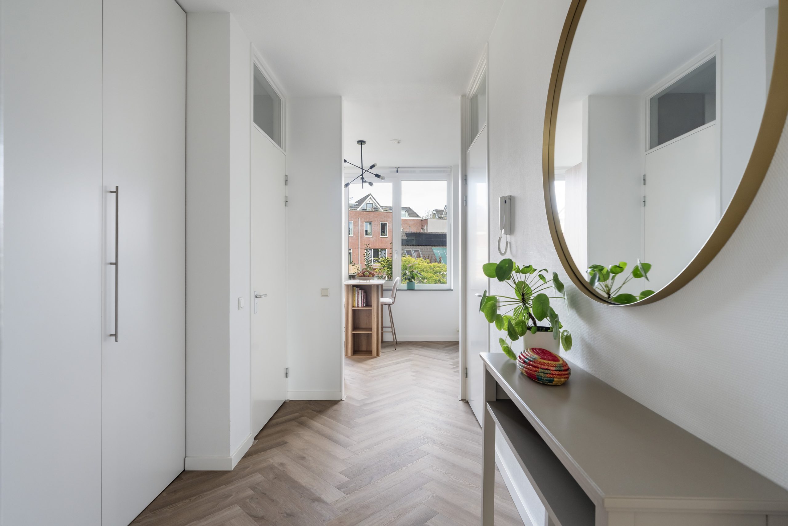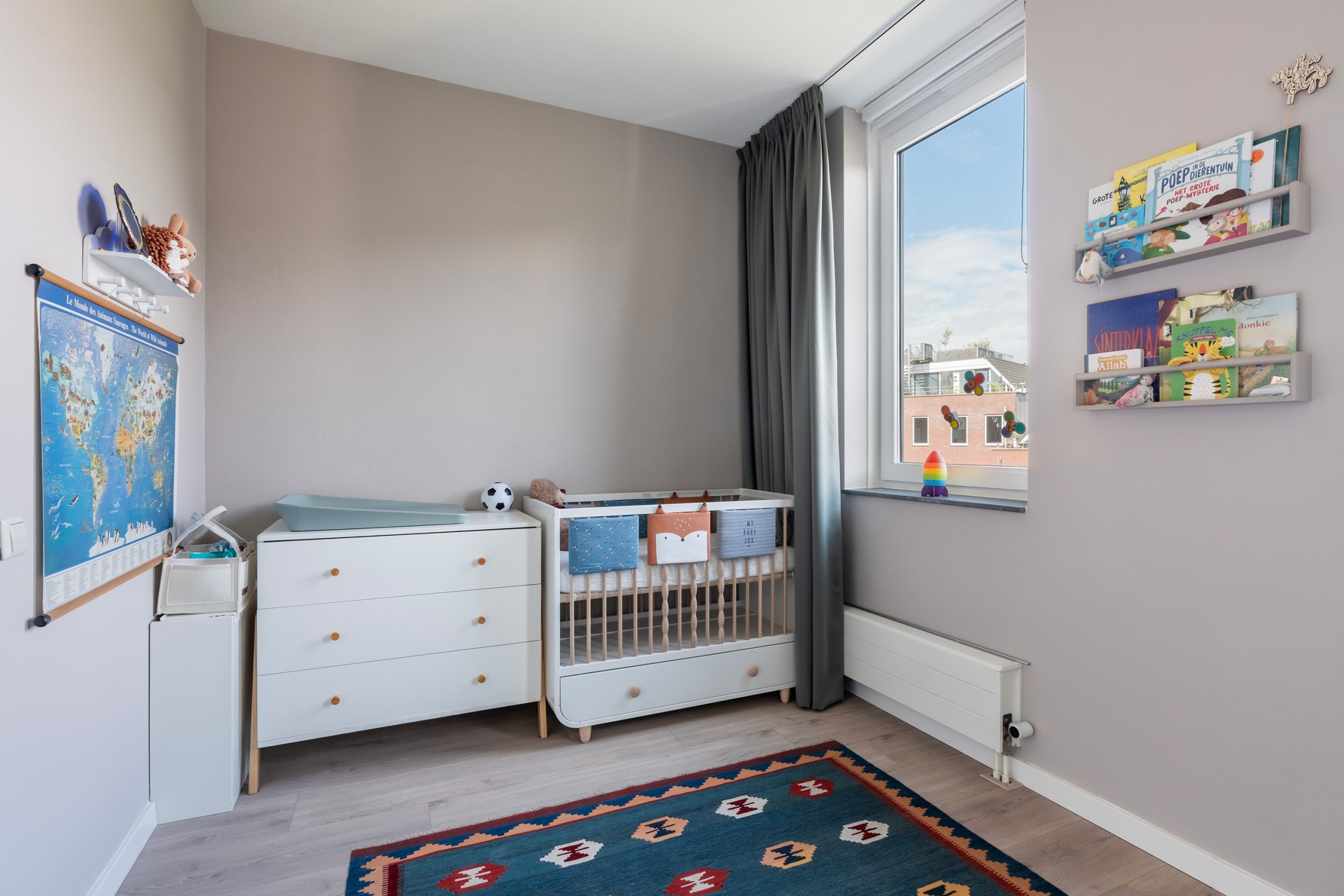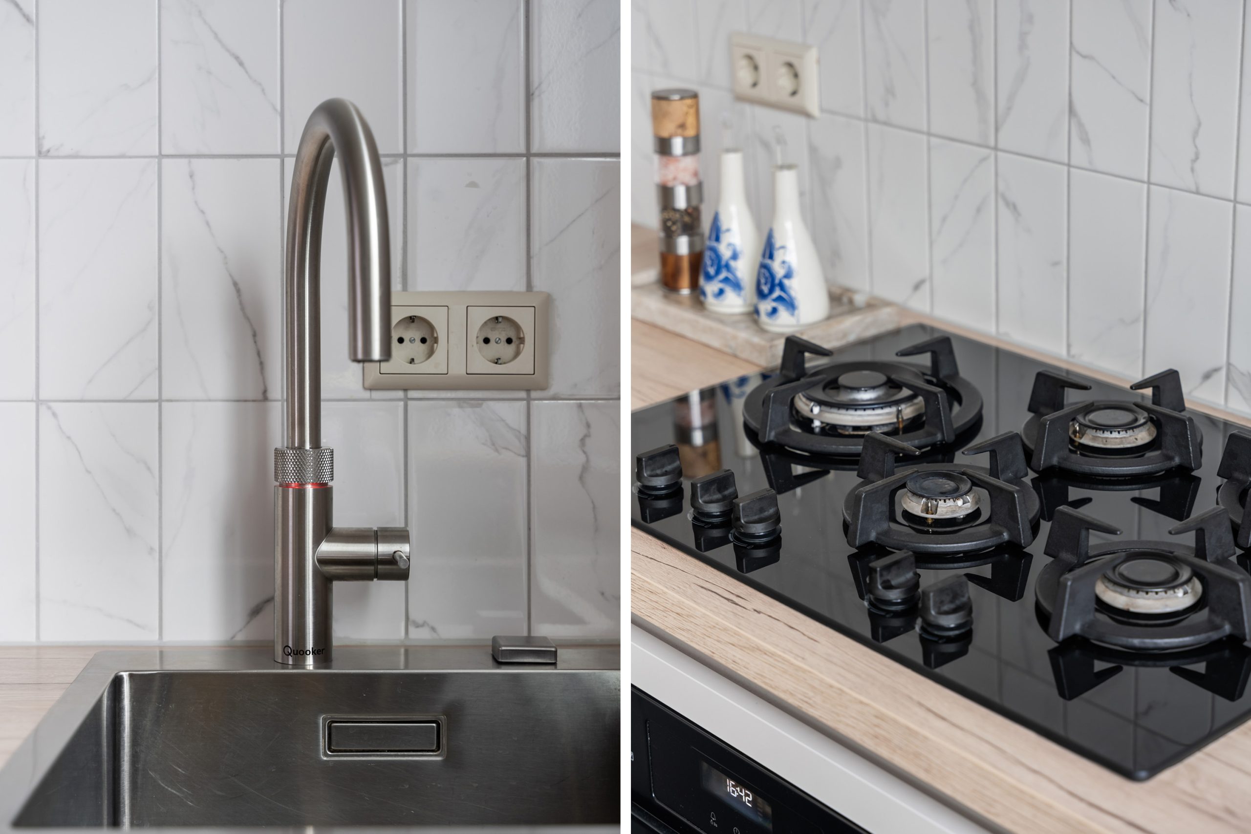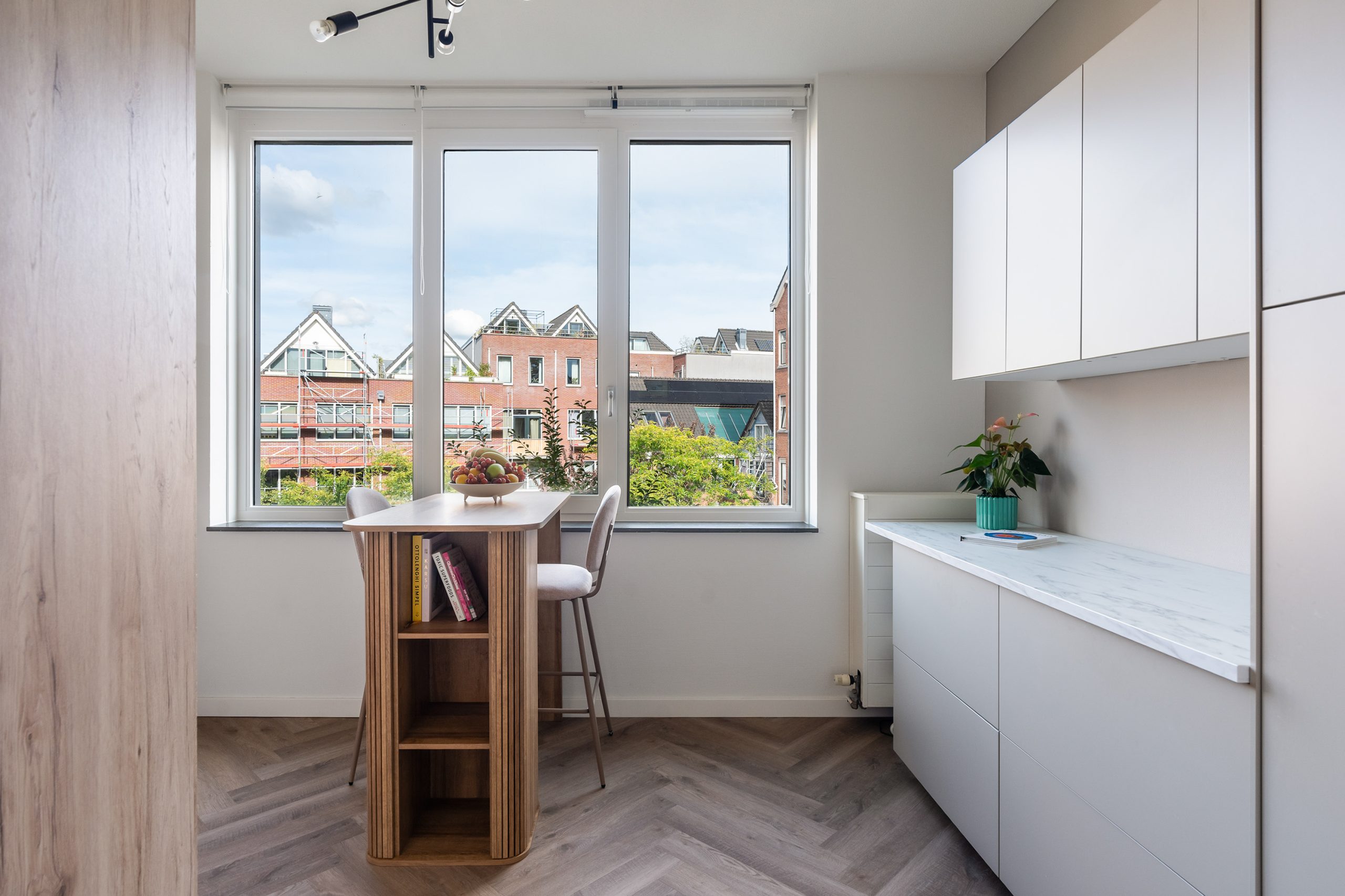 De ruime overloop leidt je naar de sfeervolle woonkamer aan de voorzijde, waar grote ramen zorgen voor een prettige lichtinval en karaktervolle glas-in-looddetails een vleugje authenticiteit geven. De mooie PVC-vloer en strakke afwerking maken deze ruimte warm en uitnodigend. Er ligt een keurige visgraatvloer over de gehele verdieping, welke de woning extra sfeervol maakt. Aan de achterzijde bevindt zich de ruime woonkeuken met kookeiland en moderne inbouwapparatuur zoals oven, gaskookplaat, vaatwasser, koelkast, vriezer, kokend-water kraan (Quooker) en afzuigkap. Hier kijk je uit over de binnentuinen terwijl je de lekkerste gerechten op tafel tovert. Op deze verdieping vind je een separaat toilet met fonteintje en een praktische en zeer ruime opbergkast.