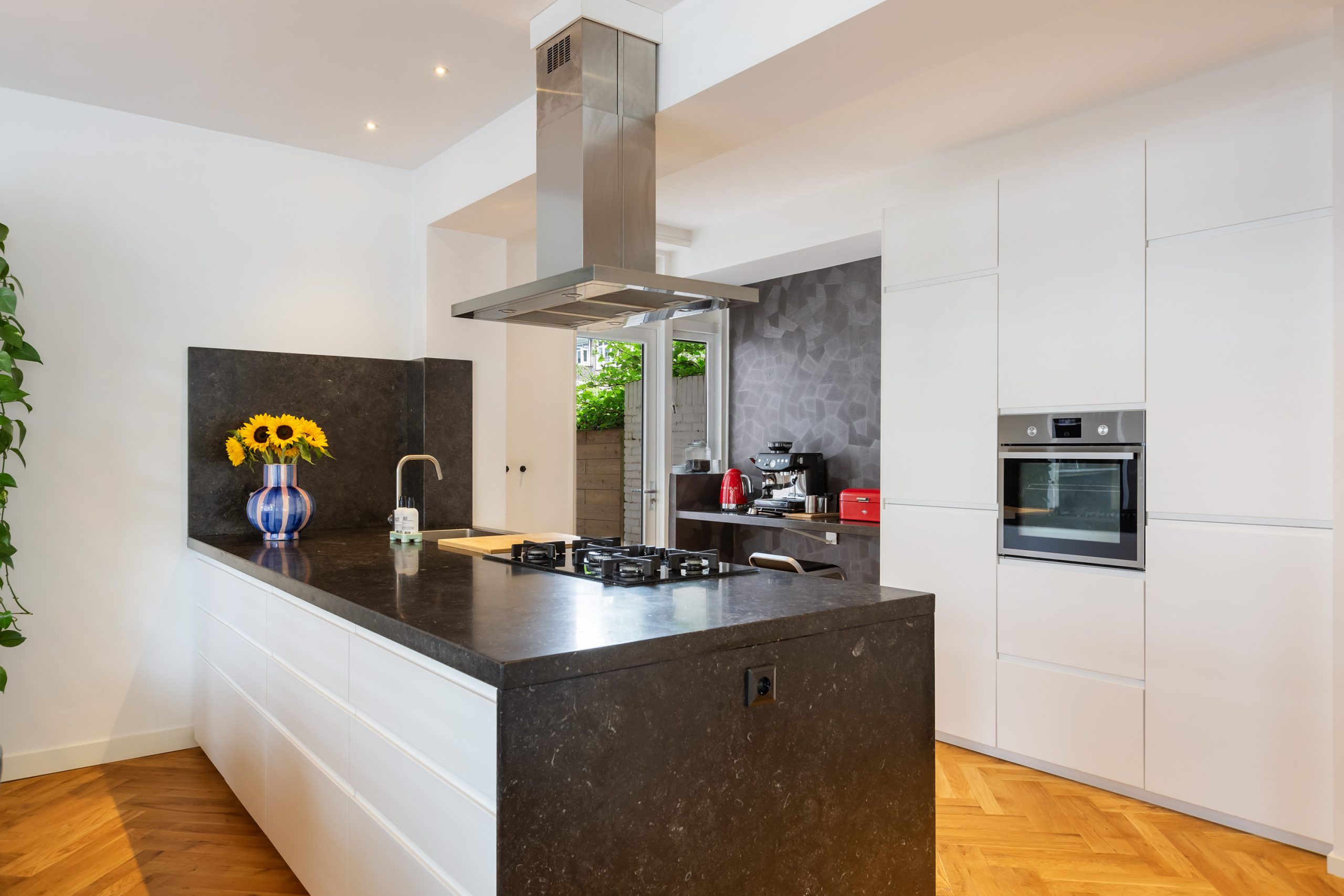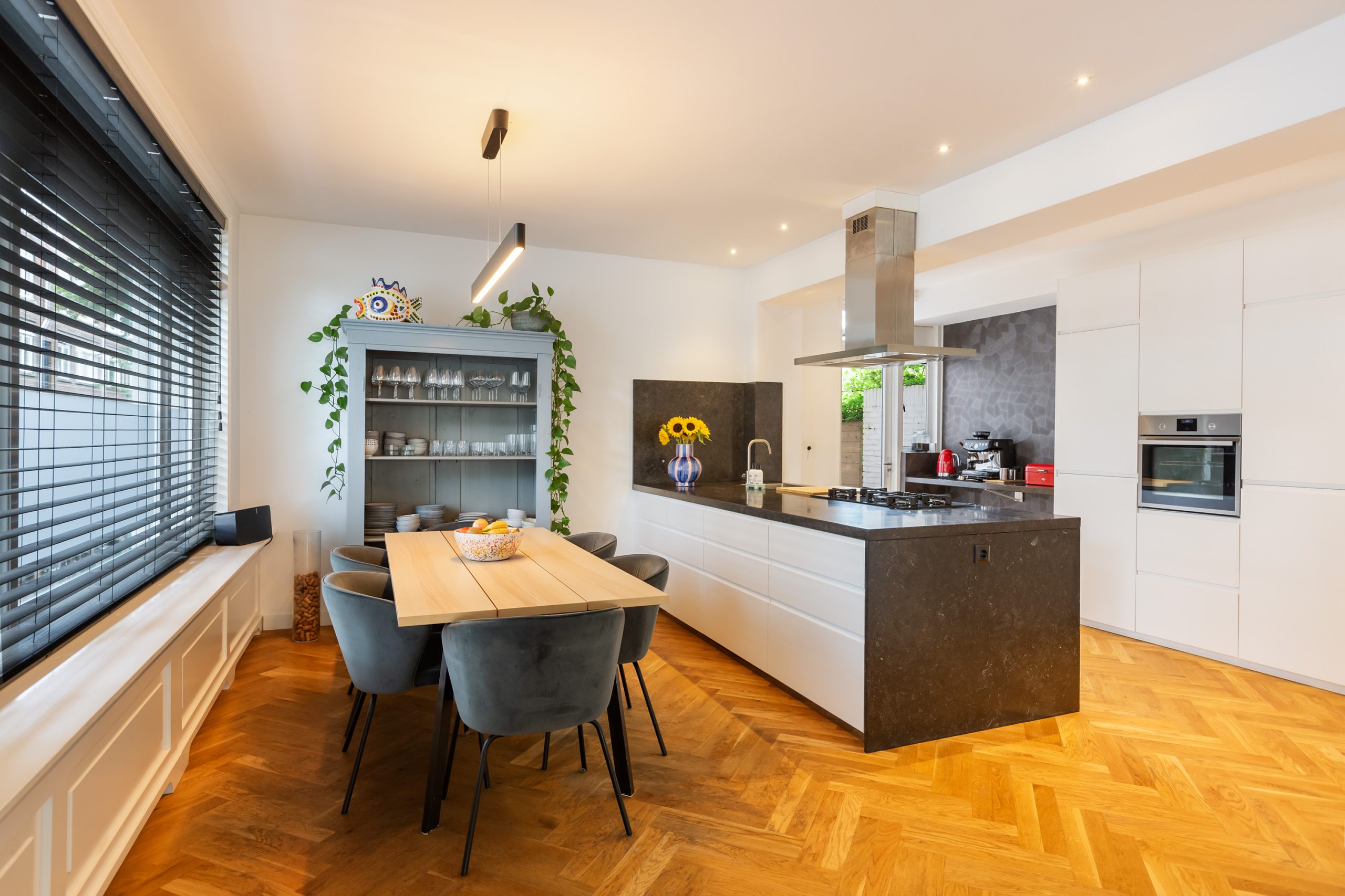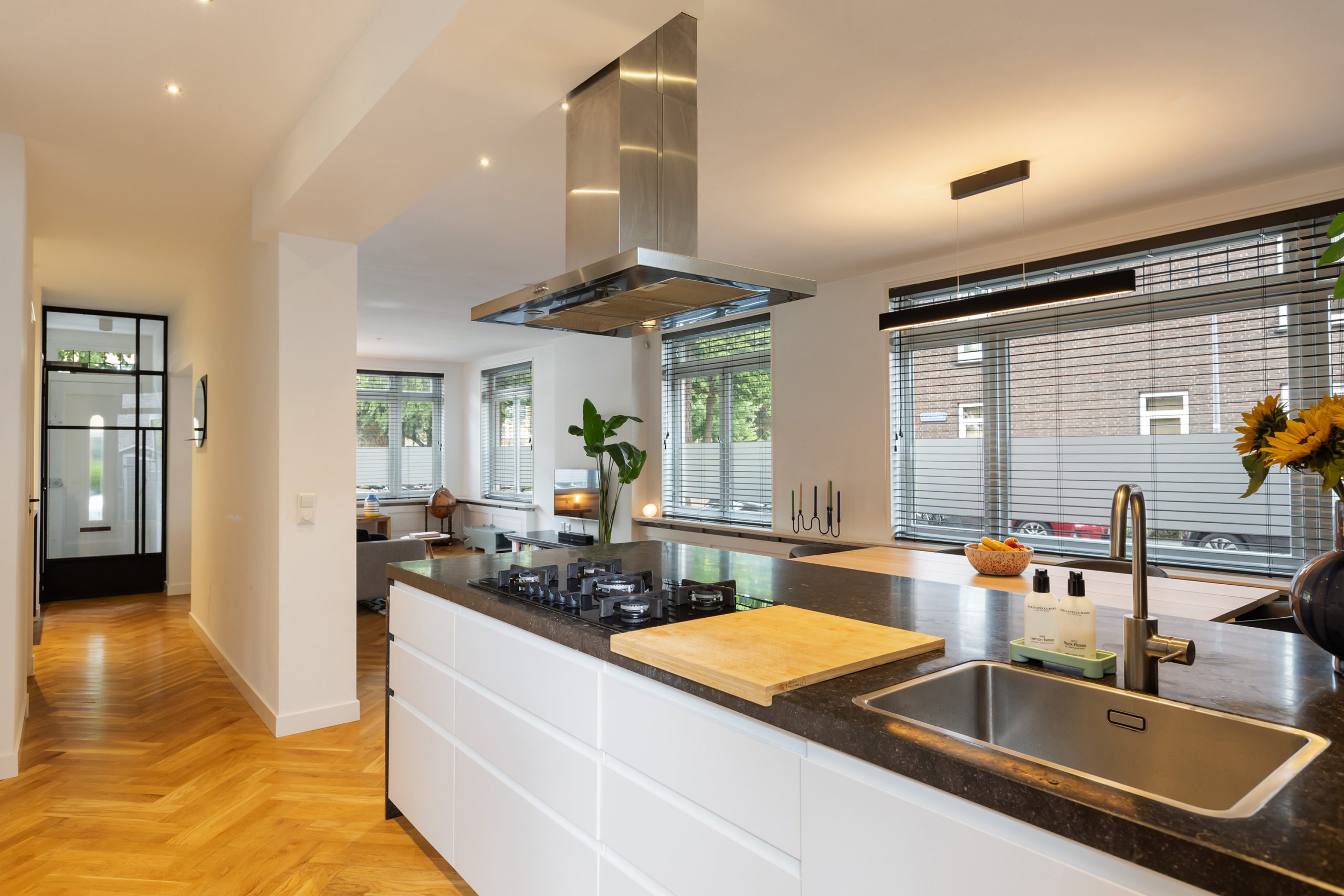 Binnenkomst in een nette entree met zwart stalen deur naar de hal, waar zich een separaat toilet met fonteintje, een vaste kast en de meterkast bevinden. Vanuit de hal stap je de royale en lichte woonkamer binnen, die direct een gevoel van ruimte en comfort uitstraalt dankzij de brede raampartijen en de hoekligging. De moderne open keuken is uitgerust met een strak kookeiland, hoogwaardige inbouwapparatuur, zoals een gas-kookplaat, afzuigkap, vaatwasser (2022), oven, koelkast en vriezer, een composiet werkblad en veel kastruimte. Hier kook je met plezier voor familie of vrienden. Over de gehele verdieping ligt een prachtige visgraatvloer, dit geeft de woning extra veel charme!