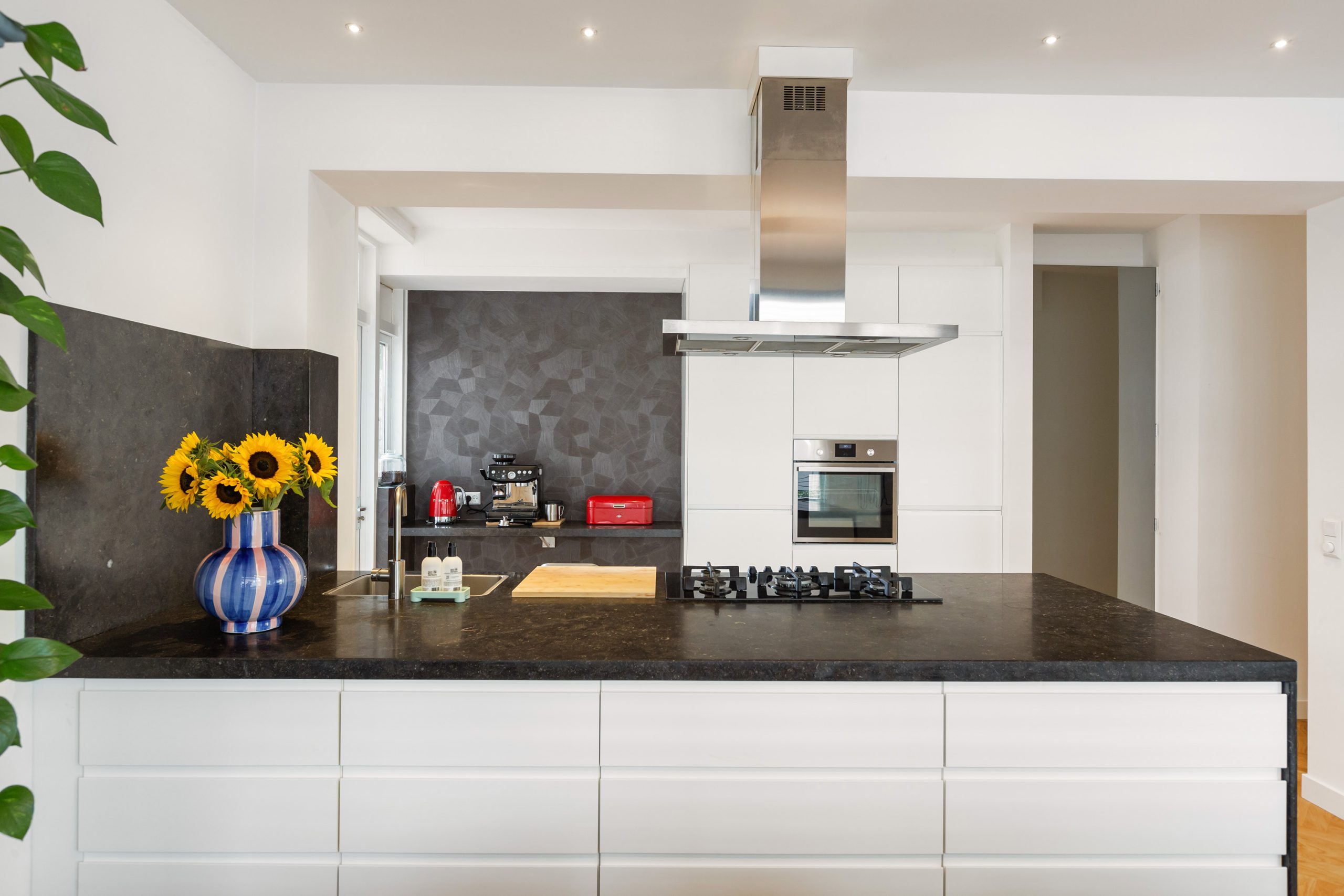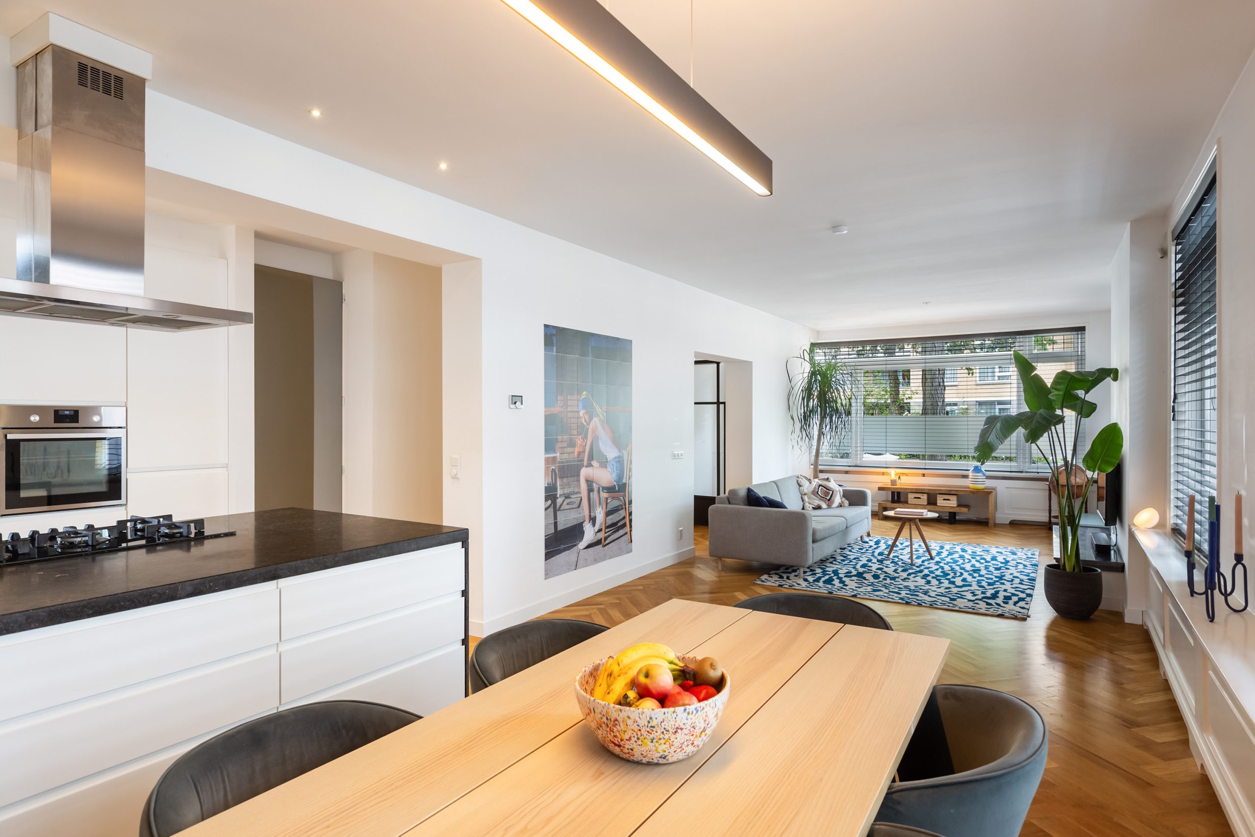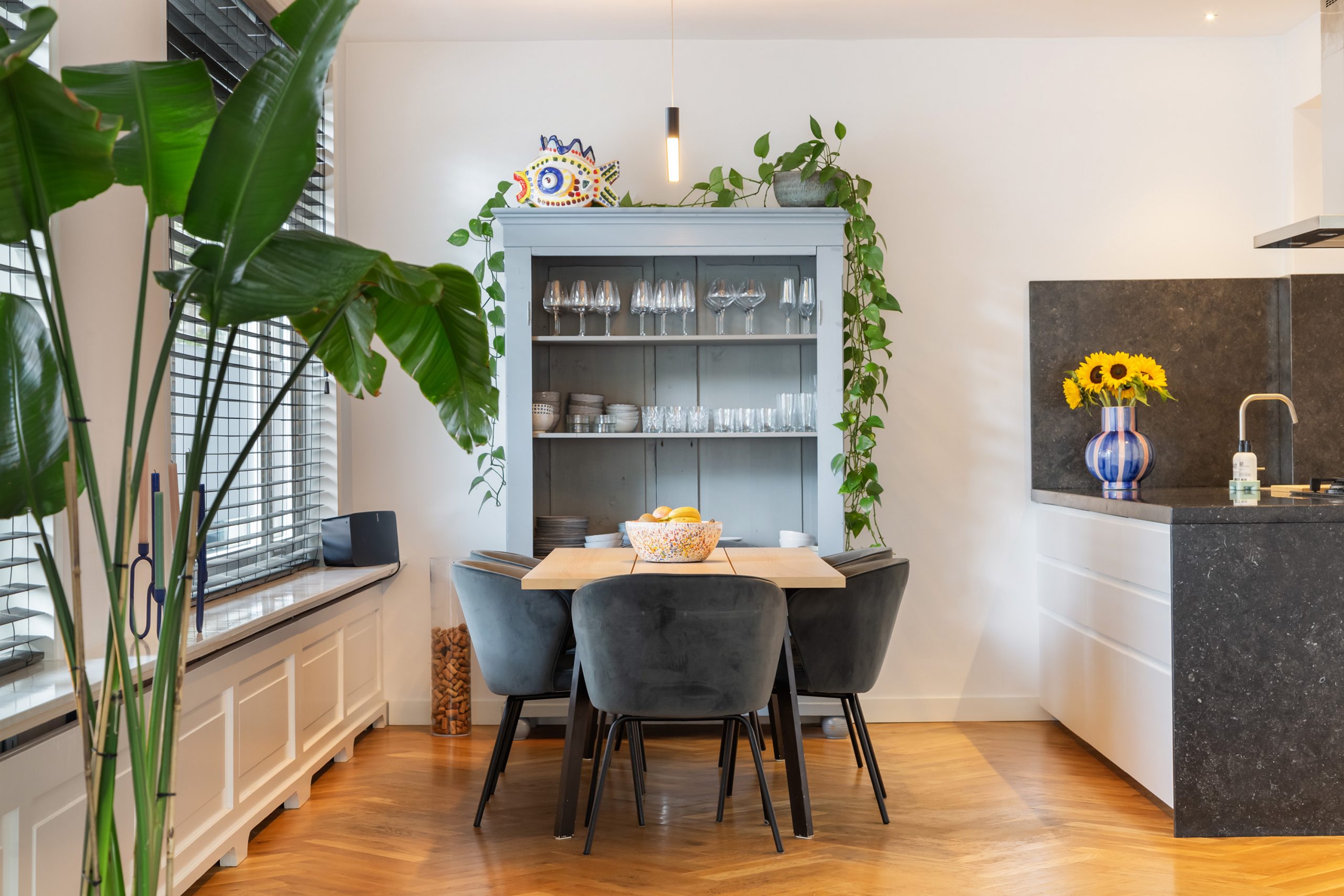Binnenkomst in een nette entree met zwart stalen deur naar de hal, waar zich een separaat toilet met fonteintje, een vaste kast en de meterkast bevinden. Vanuit de hal stap je de royale en lichte woonkamer binnen, die direct een gevoel van ruimte en comfort uitstraalt dankzij de brede raampartijen en de hoekligging. De moderne open keuken is uitgerust met een strak kookeiland, hoogwaardige inbouwapparatuur, zoals een gas-kookplaat, afzuigkap, vaatwasser (2022), oven, koelkast en vriezer, een composiet werkblad en veel kastruimte. Hier kook je met plezier voor familie of vrienden. Over de gehele verdieping ligt een prachtige visgraatvloer, dit geeft de woning extra veel charme!