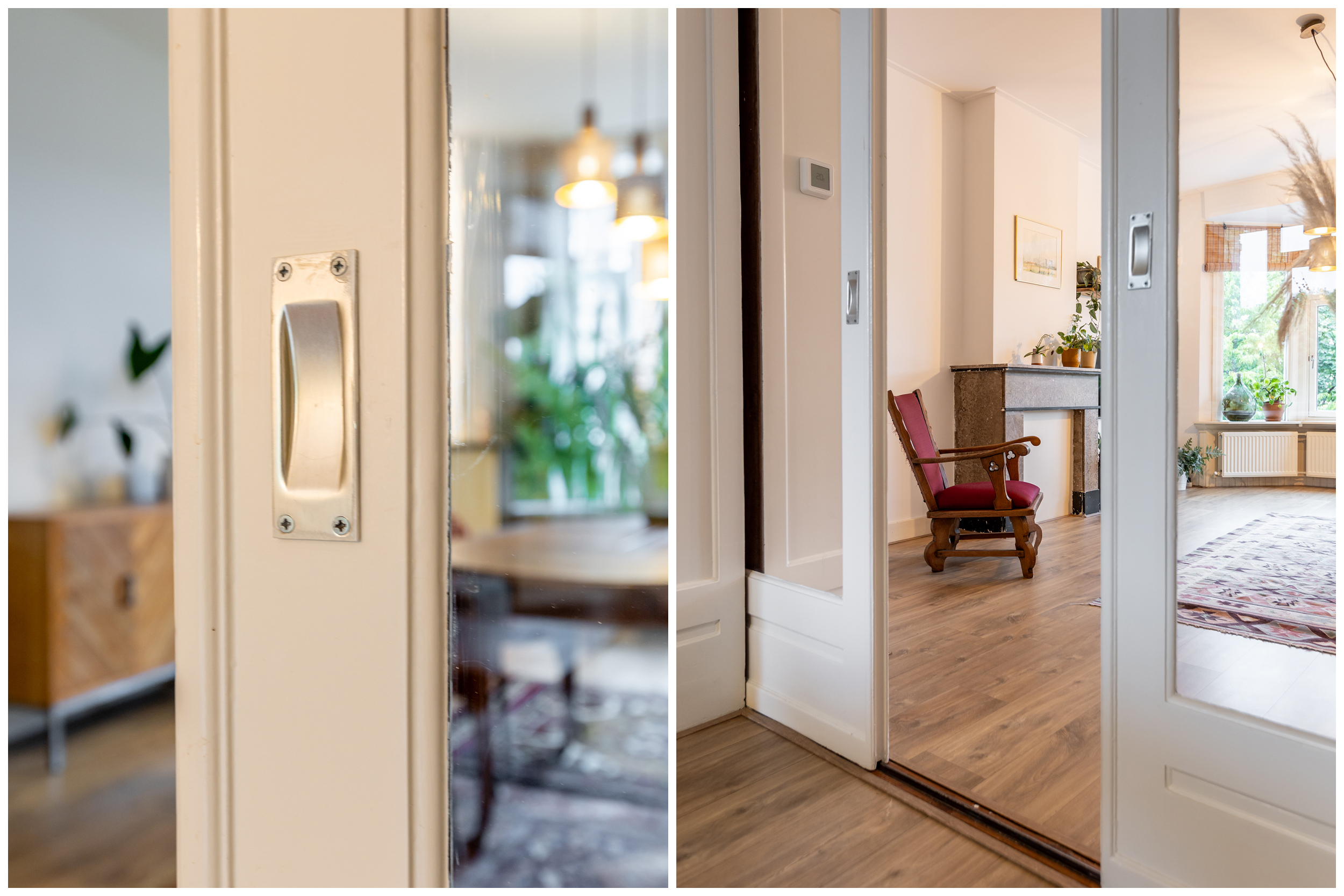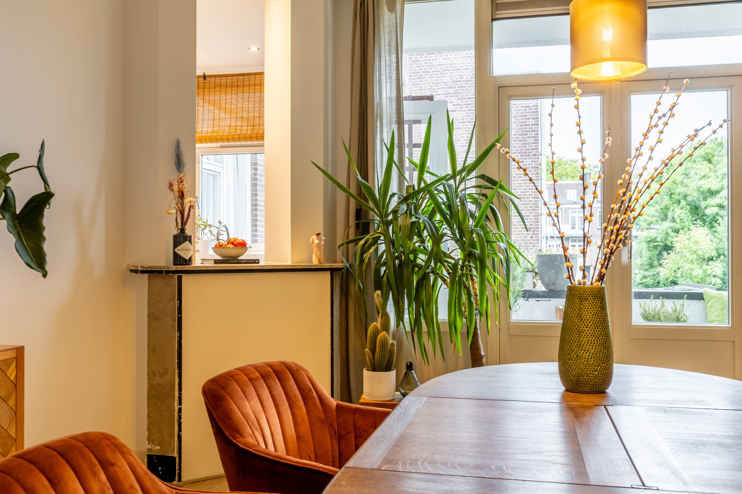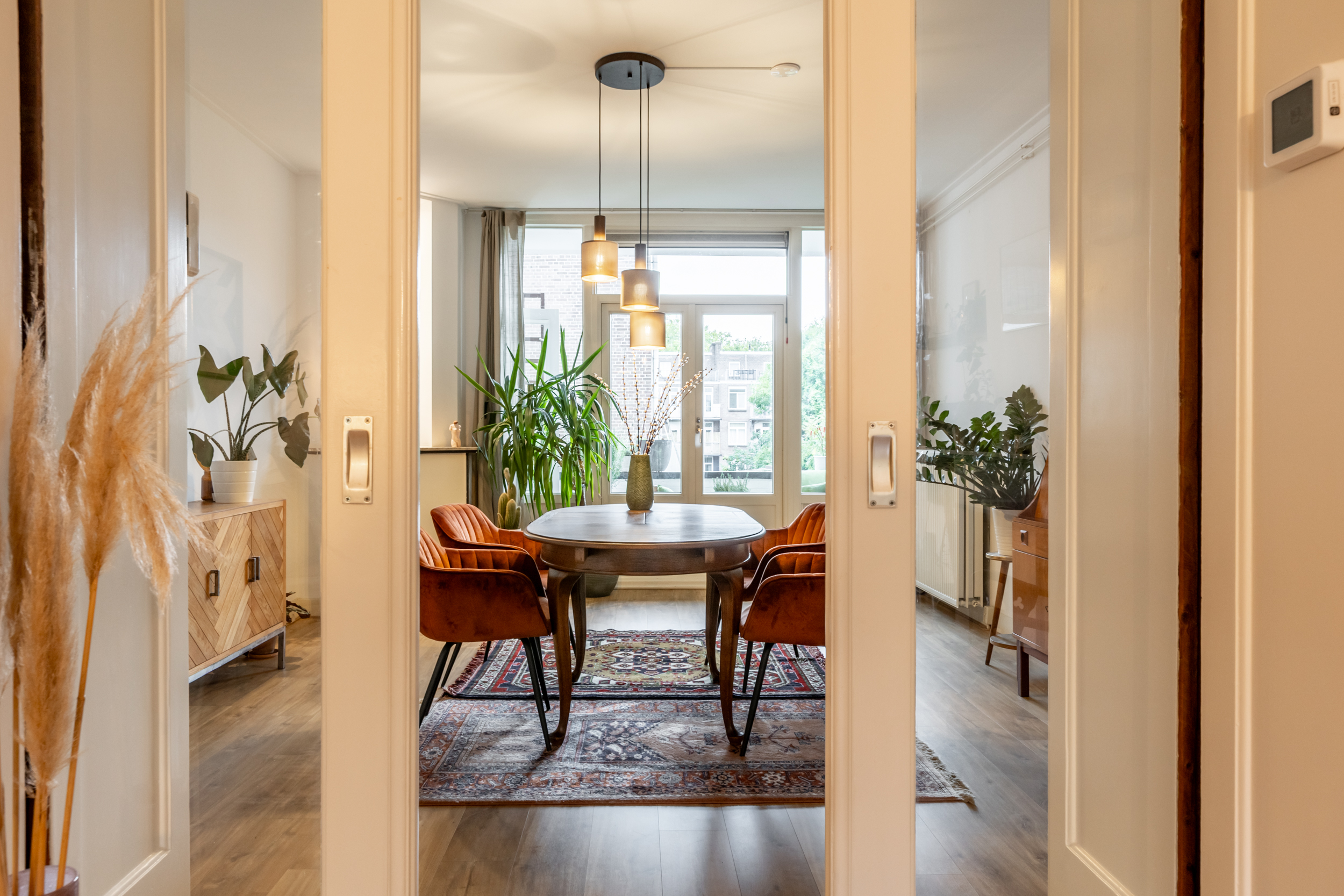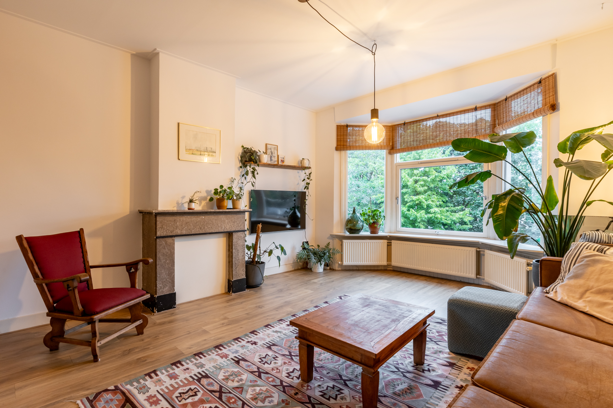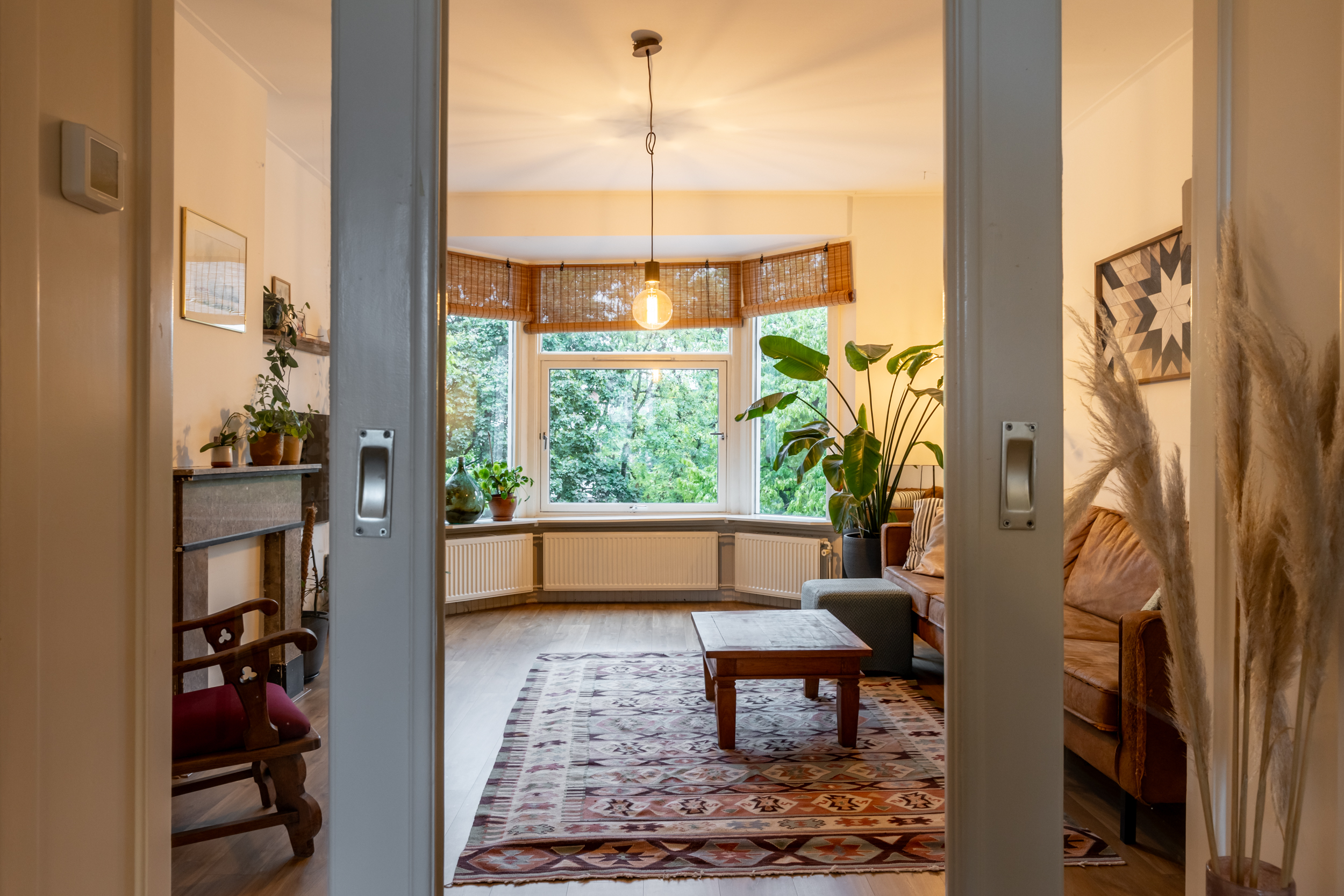 Bij binnenkomst stap je in de hal die toegang biedt tot de vertrekken op deze etage. De leefruimte is een heerlijke, royale ruimte vol sfeer, warmte en natuurlijk licht dankzij de grote raampartijen. De strakke wanden en het laminaat vormen een mooi contrast met de authentieke details van de woning. Een perfecte mix! Het zitgedeelte aan de voorzijde van de woning is een knusse ruimte met voldoende plek voor een royale zithoek. Hier zorgt onder andere de elegante schouw voor een stijlvolle blikvanger en een knusse sfeer. Dé plek om heerlijk tot rust te komen. Via de prachtige en suite deuren, met aan weerszijden inbouwkasten, bereik je het eetgedeelte. Hier is genoeg ruimte voor een lange eettafel om avonden lang te tafelen met vrienden en familie. Boven de schouw is een charmant en uniek doorkijkje naar de keuken gerealiseerd, wat zorgt voor een speelse en open uitstraling. Via de dubbele openslaande deuren stap je het balkon gelegen op het zuidwesten op, een ideale plek om te genieten van een goed gesprek of een gezellige borrel in de zon. Via de hal bereik je de keuken, die modern is uitgevoerd en van alle gemakken is voorzien. De gerenoveerde keuken beschikt over alle moderne inbouwapparatuur zoals een inductiekookplaat, afzuigkap, oven, koelkast, vriezer en vaatwasser. Dankzij de doorkijk naar de eetkamer voelt de ruimte open en ruimtelijk aan. Ideaal voor wie graag kookt, maar toch in contact wil blijven met zijn of haar gezelschap. Bovendien zorgt het natuurlijke licht voor een prettige sfeer tijdens het koken. Vanuit de hal is de eerste multifunctionele slaapkamer, nu ingericht als thuiskantoor, en het separate toilet met fonteintje te bereiken.
