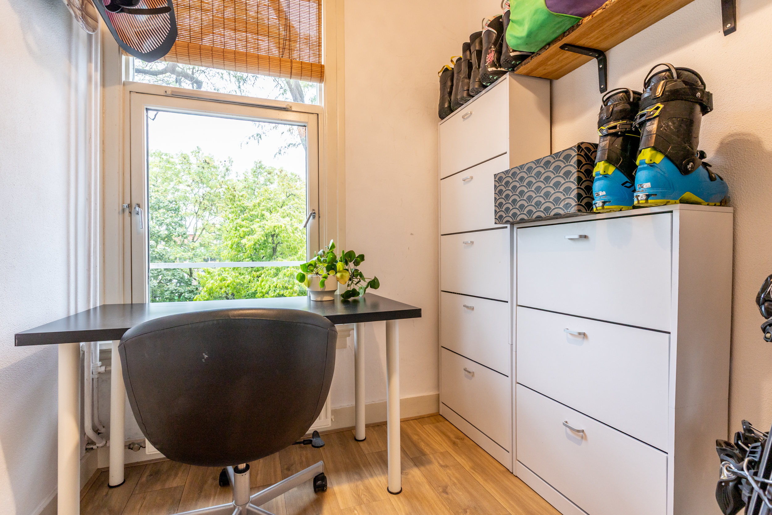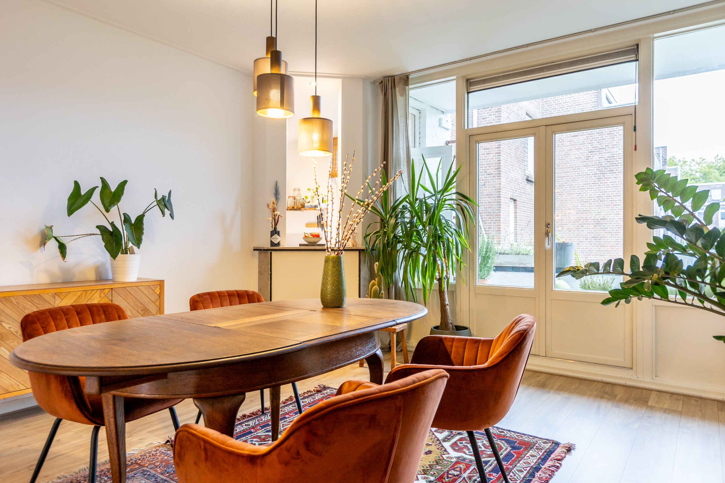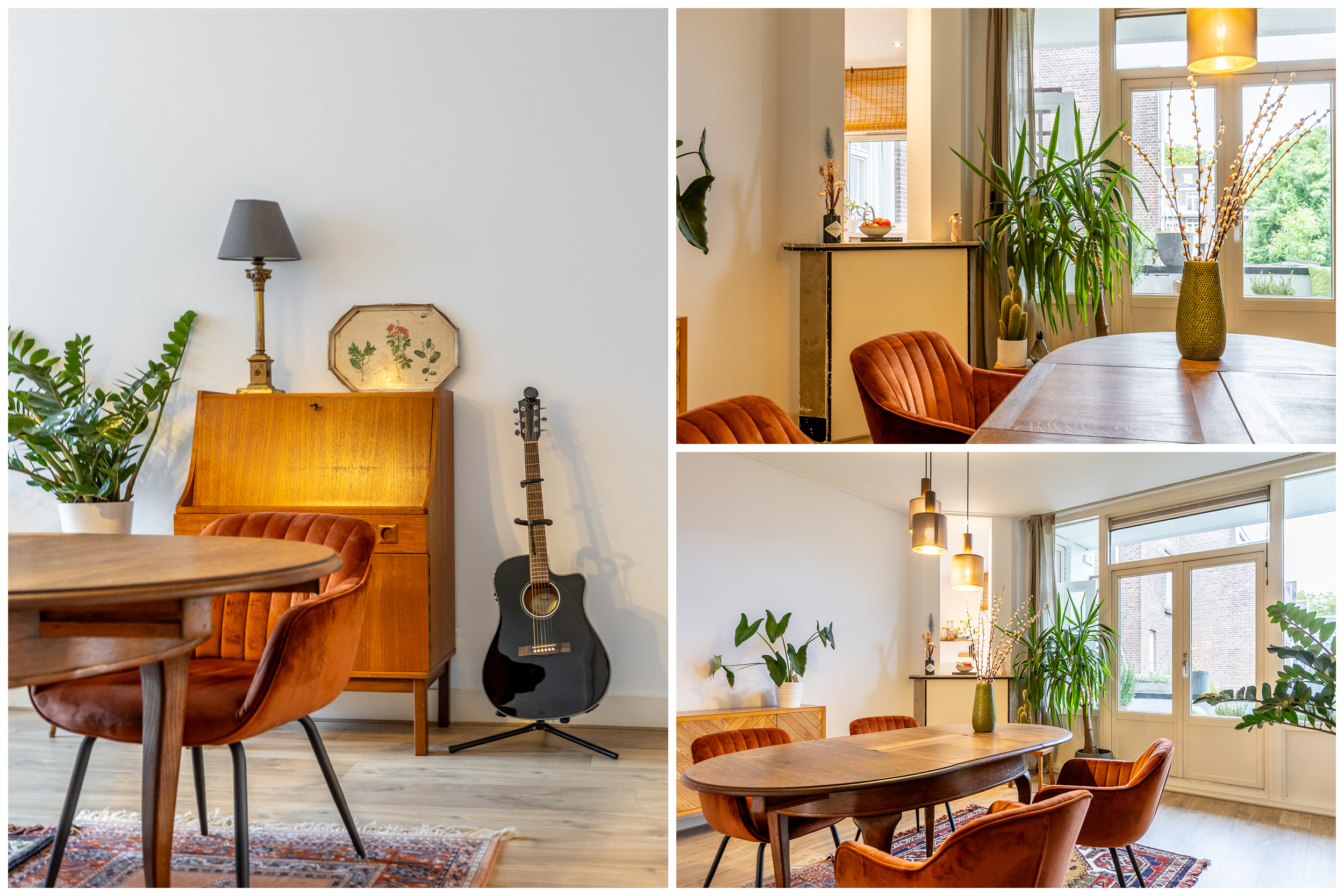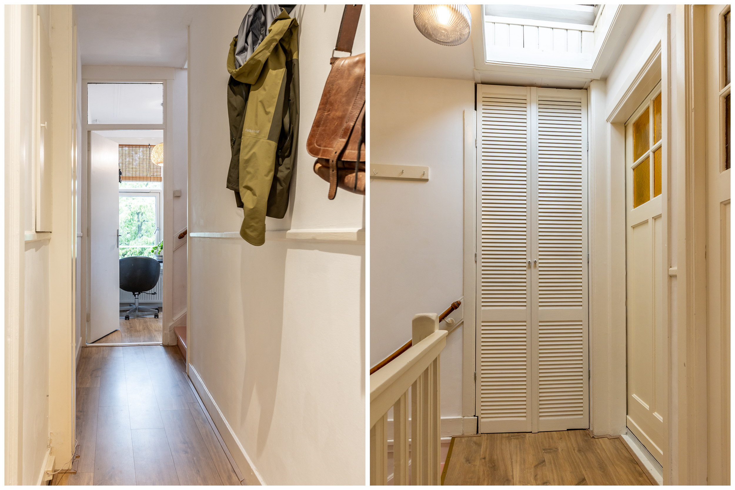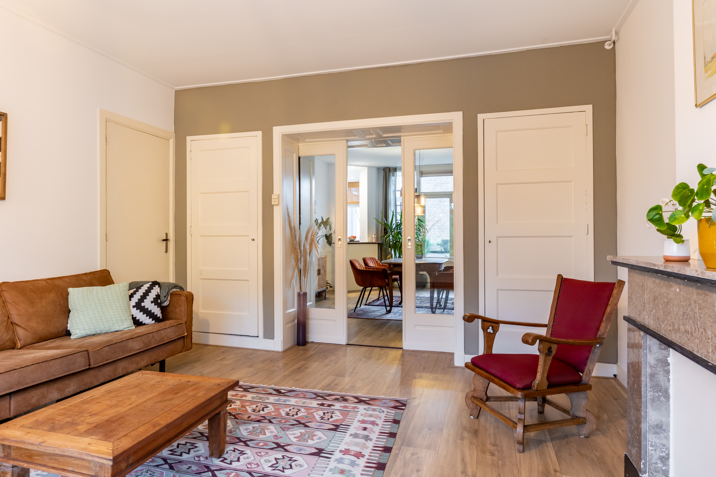 Bij binnenkomst stap je in de hal die toegang biedt tot de vertrekken op deze etage. De leefruimte is een heerlijke, royale ruimte vol sfeer, warmte en natuurlijk licht dankzij de grote raampartijen. De strakke wanden en het laminaat vormen een mooi contrast met de authentieke details van de woning. Een perfecte mix! Het zitgedeelte aan de voorzijde van de woning is een knusse ruimte met voldoende plek voor een royale zithoek. Hier zorgt onder andere de elegante schouw voor een stijlvolle blikvanger en een knusse sfeer. Dé plek om heerlijk tot rust te komen. Via de prachtige en suite deuren, met aan weerszijden inbouwkasten, bereik je het eetgedeelte. Hier is genoeg ruimte voor een lange eettafel om avonden lang te tafelen met vrienden en familie. Boven de schouw is een charmant en uniek doorkijkje naar de keuken gerealiseerd, wat zorgt voor een speelse en open uitstraling. Via de dubbele openslaande deuren stap je het balkon gelegen op het zuidwesten op, een ideale plek om te genieten van een goed gesprek of een gezellige borrel in de zon. Via de hal bereik je de keuken, die modern is uitgevoerd en van alle gemakken is voorzien. De gerenoveerde keuken beschikt over alle moderne inbouwapparatuur zoals een inductiekookplaat, afzuigkap, oven, koelkast, vriezer en vaatwasser. Dankzij de doorkijk naar de eetkamer voelt de ruimte open en ruimtelijk aan. Ideaal voor wie graag kookt, maar toch in contact wil blijven met zijn of haar gezelschap. Bovendien zorgt het natuurlijke licht voor een prettige sfeer tijdens het koken. Vanuit de hal is de eerste multifunctionele slaapkamer, nu ingericht als thuiskantoor, en het separate toilet met fonteintje te bereiken.