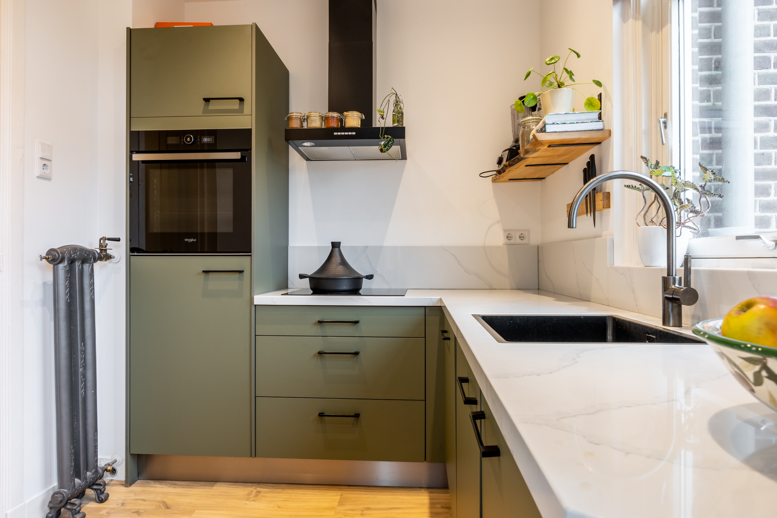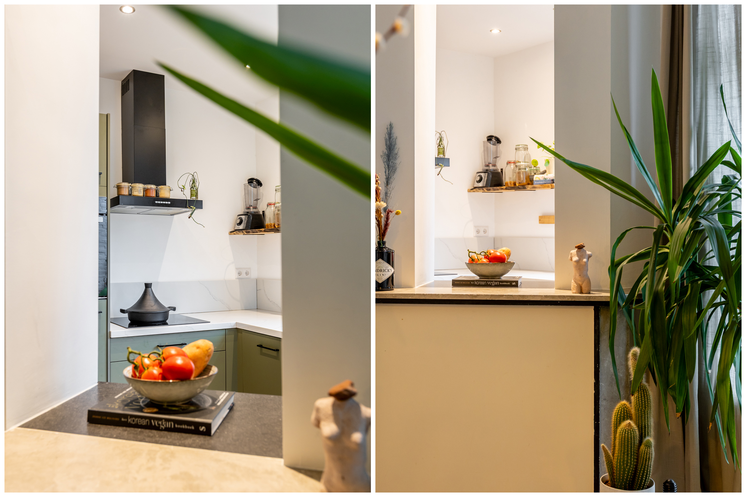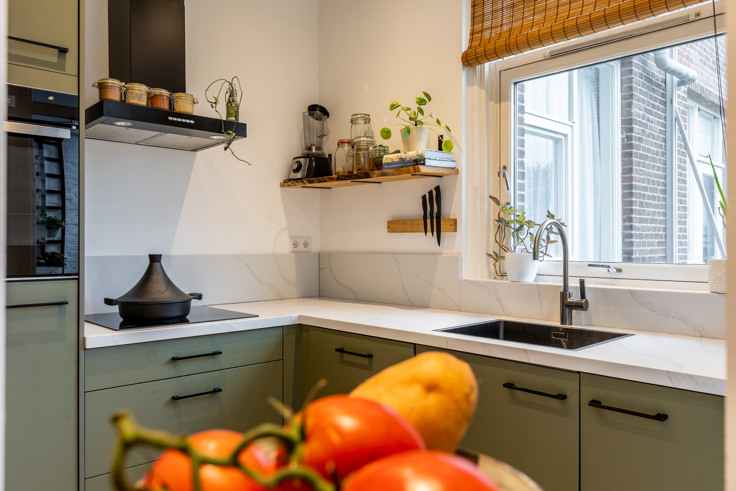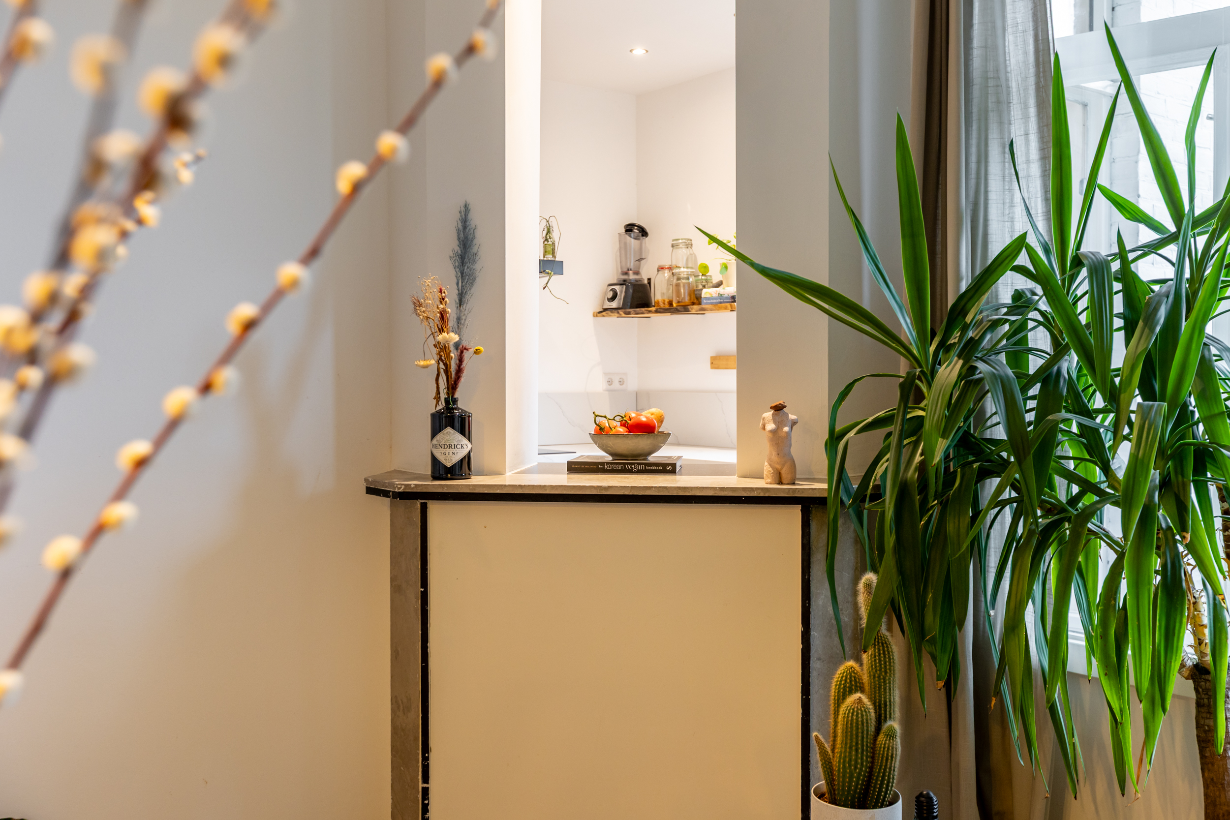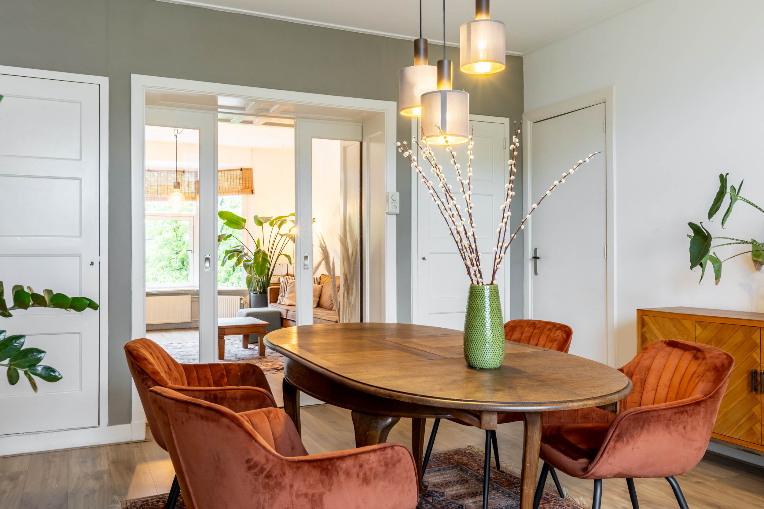 Bij binnenkomst stap je in de hal die toegang biedt tot de vertrekken op deze etage. De leefruimte is een heerlijke, royale ruimte vol sfeer, warmte en natuurlijk licht dankzij de grote raampartijen. De strakke wanden en het laminaat vormen een mooi contrast met de authentieke details van de woning. Een perfecte mix! Het zitgedeelte aan de voorzijde van de woning is een knusse ruimte met voldoende plek voor een royale zithoek. Hier zorgt onder andere de elegante schouw voor een stijlvolle blikvanger en een knusse sfeer. Dé plek om heerlijk tot rust te komen. Via de prachtige en suite deuren, met aan weerszijden inbouwkasten, bereik je het eetgedeelte. Hier is genoeg ruimte voor een lange eettafel om avonden lang te tafelen met vrienden en familie. Boven de schouw is een charmant en uniek doorkijkje naar de keuken gerealiseerd, wat zorgt voor een speelse en open uitstraling. Via de dubbele openslaande deuren stap je het balkon gelegen op het zuidwesten op, een ideale plek om te genieten van een goed gesprek of een gezellige borrel in de zon. Via de hal bereik je de keuken, die modern is uitgevoerd en van alle gemakken is voorzien. De gerenoveerde keuken beschikt over alle moderne inbouwapparatuur zoals een inductiekookplaat, afzuigkap, oven, koelkast, vriezer en vaatwasser. Dankzij de doorkijk naar de eetkamer voelt de ruimte open en ruimtelijk aan. Ideaal voor wie graag kookt, maar toch in contact wil blijven met zijn of haar gezelschap. Bovendien zorgt het natuurlijke licht voor een prettige sfeer tijdens het koken. Vanuit de hal is de eerste multifunctionele slaapkamer, nu ingericht als thuiskantoor, en het separate toilet met fonteintje te bereiken.