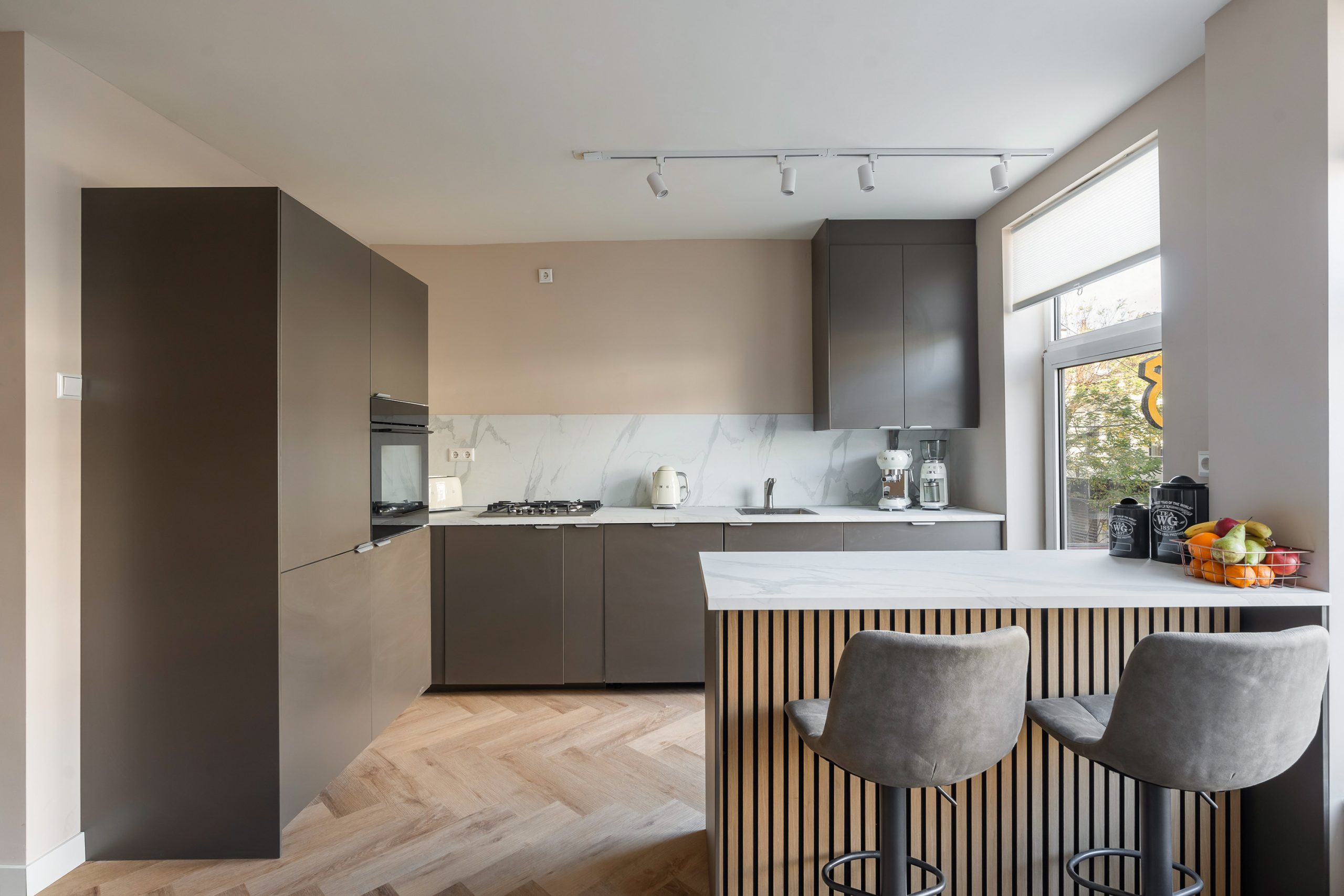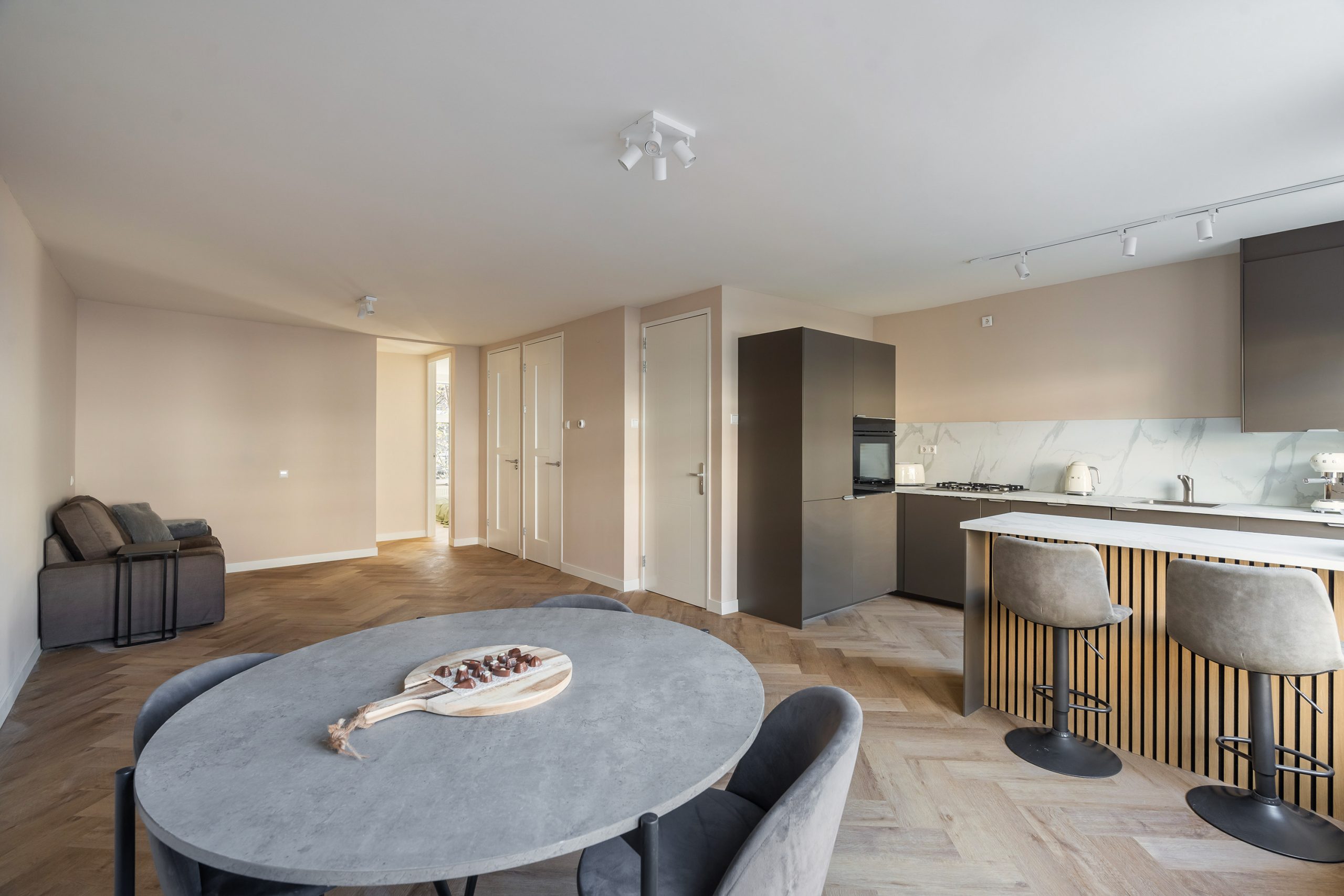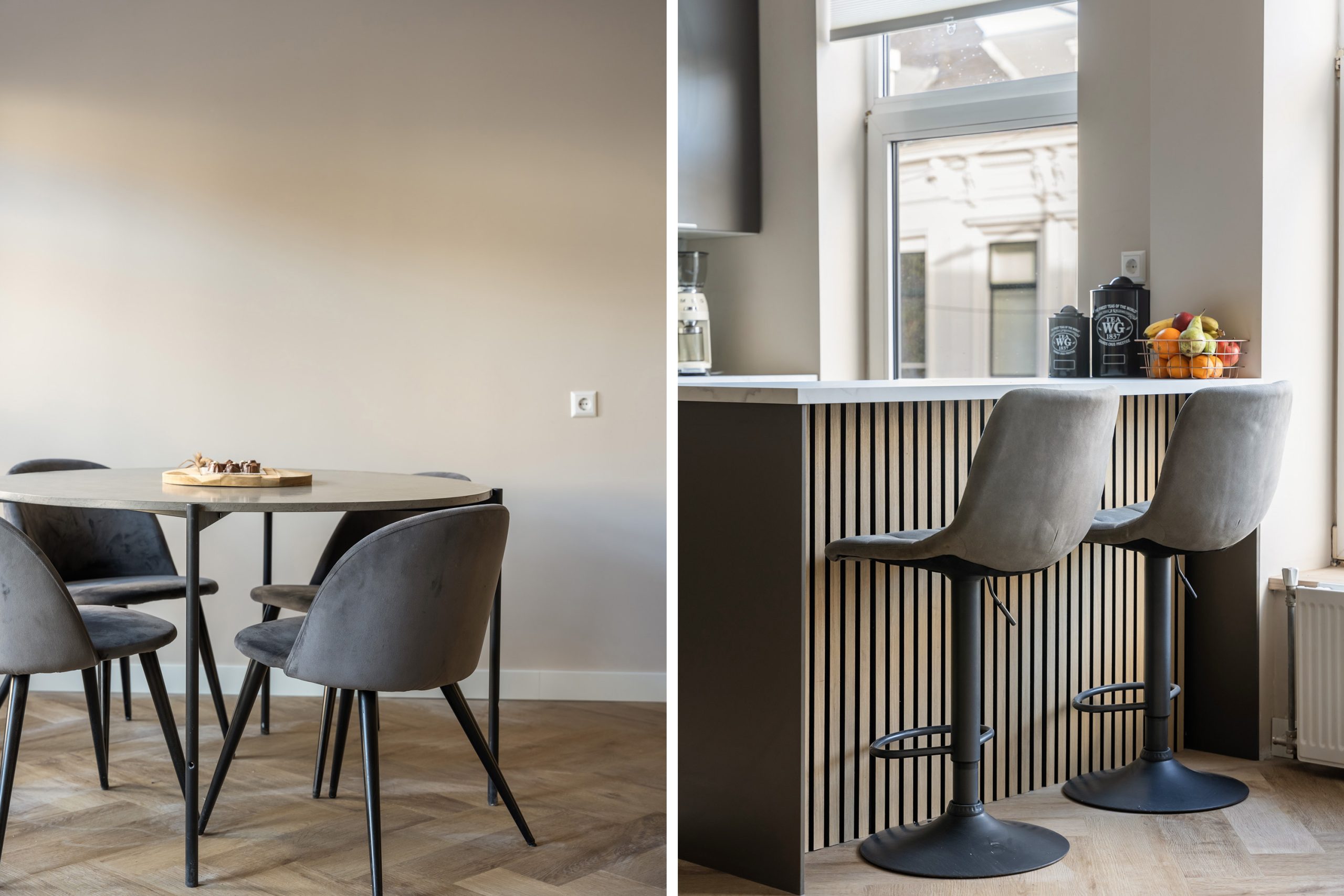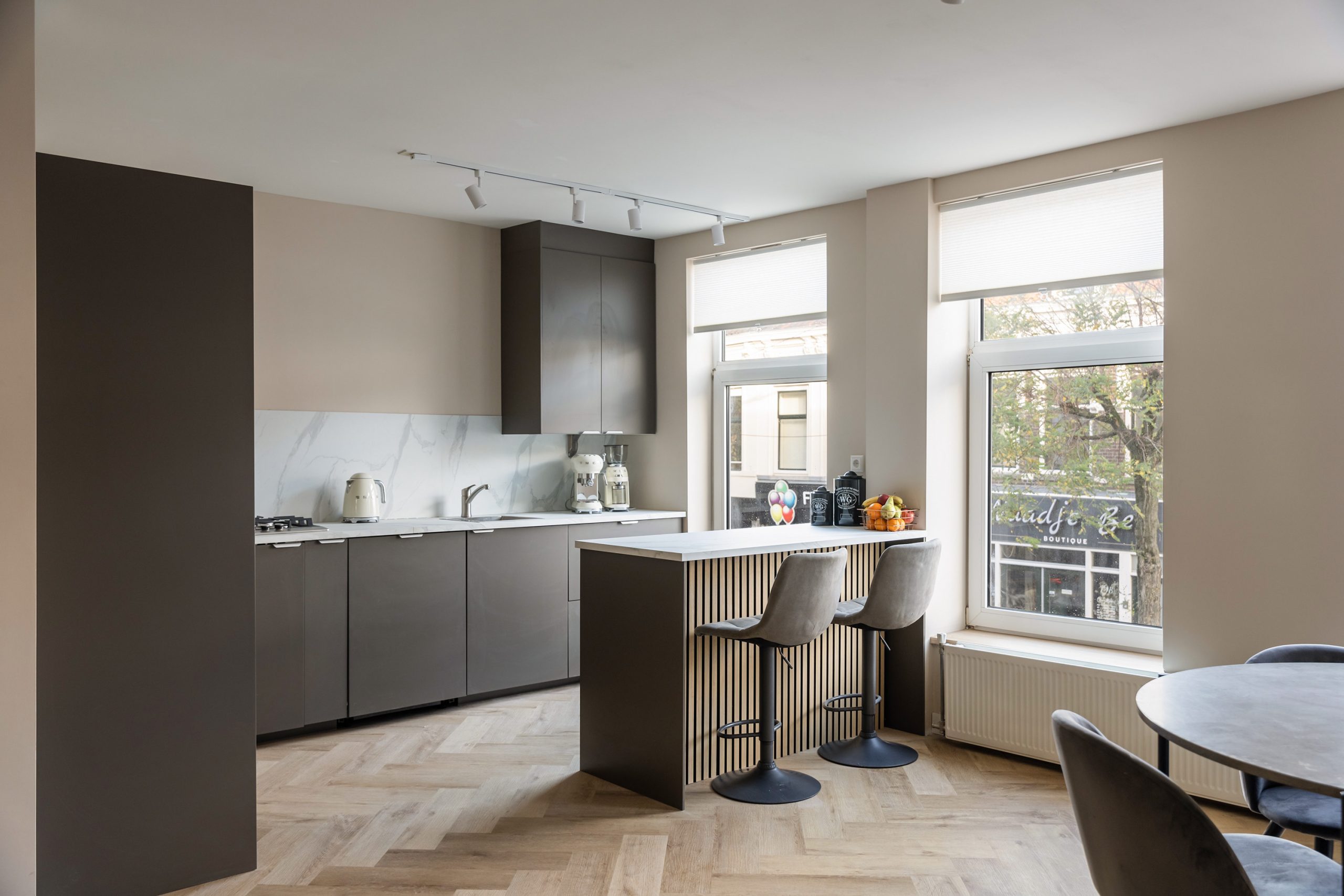 Bij binnenkomst valt meteen op hoe sfeervol en stijlvol dit appartement is! Je stapt direct een prachtige en lichte leefruimte binnen met drie grote raampartijen die zorgen voor een prettige lichtinval en een levendig uitzicht over de straat. De charmante visgraatvloer en strak afgewerkte wanden combineren warmte met een moderne look. Aan de voorzijde bevindt zich de keuken met het eetgedeelte. De stijlvolle keuken trekt meteen de aandacht dankzij de mooie keukenbar en marmerenlook aanrechtblad. Wat een plaatje! Verder is deze voorzien van een 4-pits gasfornuis, afzuigkap, combi-oven, koel-vriescombinatie, vaatwasser en is de cv-opstelling netjes weggewerkt. Een plek waar kookplezier en gezellig samenzijn moeiteloos samengaan, mede door de open verbinding met de rest van de living. Vanuit de woonkamer is de ruime berging te bereiken met een aansluiting voor de wasmachine.Â