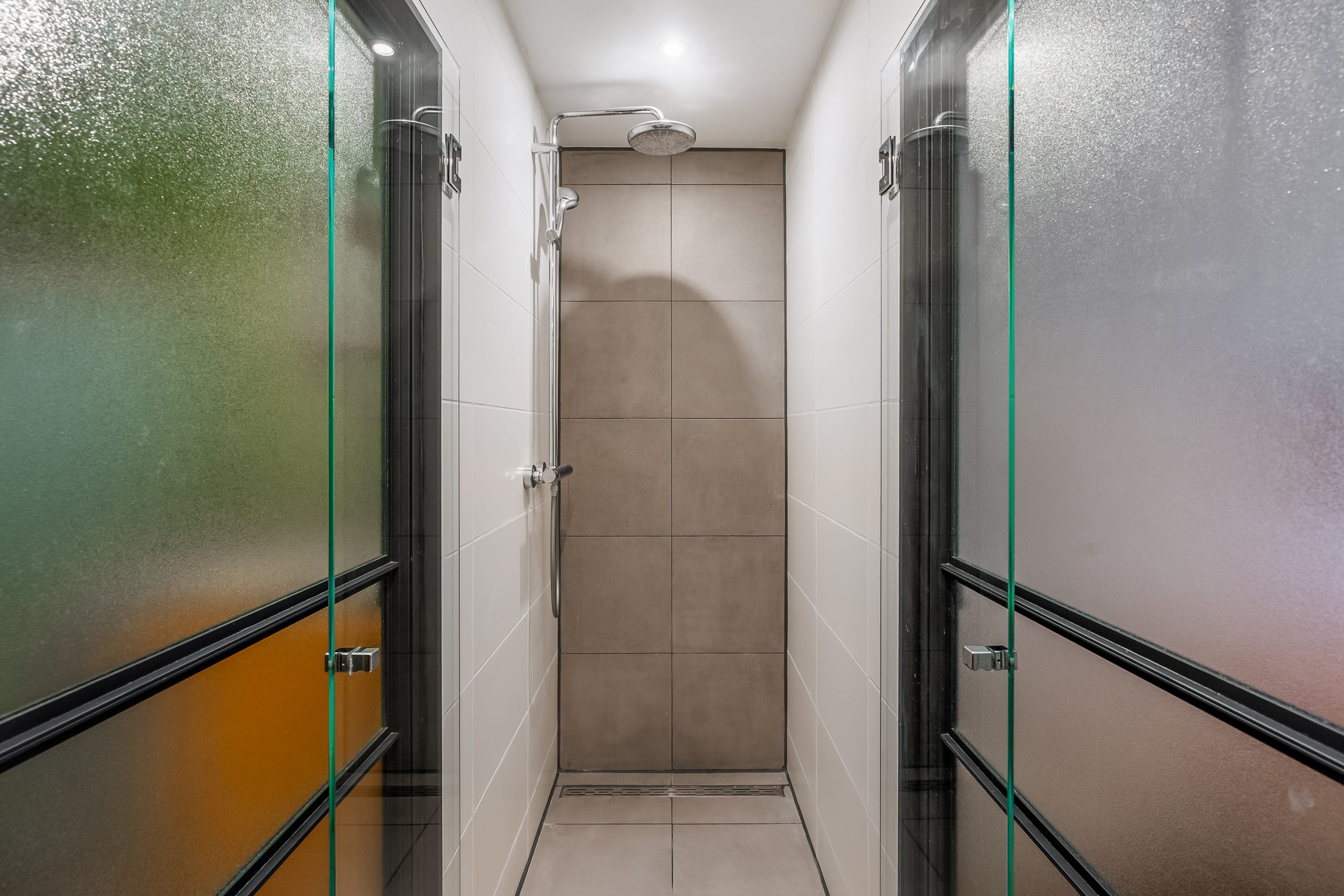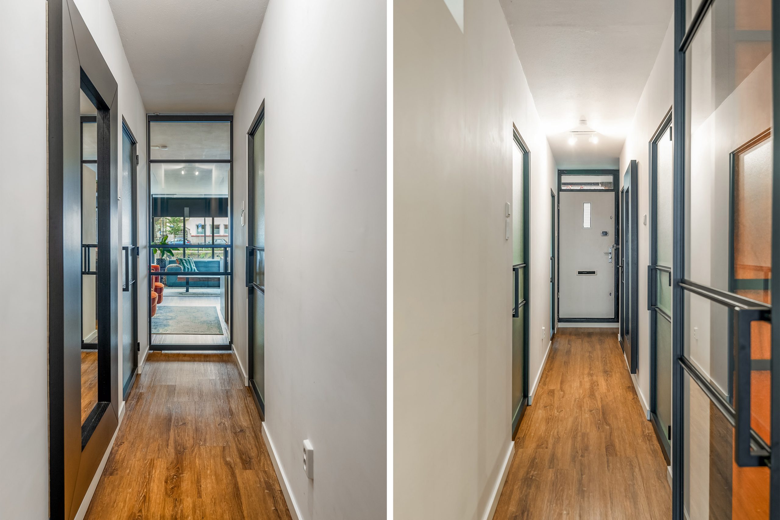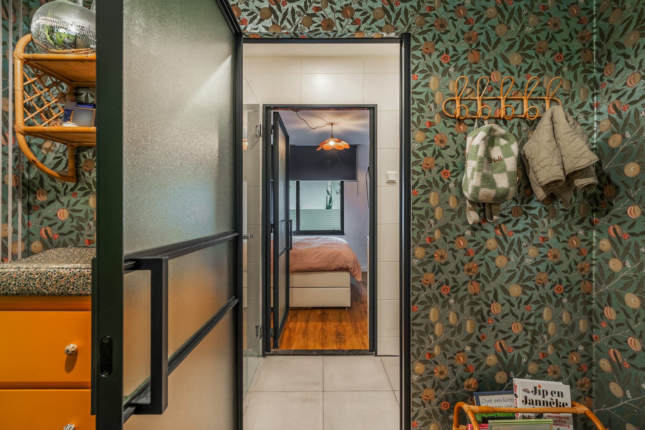 Terugkomend in de entree bereik je de twee slaapkamers, de badkamer, het separate toilet en een praktische inpandige kast met aansluitingen voor wasmachine en droger. Alle ruimtes zijn voorzien van stijlvolle glas-in-staal deuren, wat zorgt voor een toffe uitstraling. De hoofdslaapkamer is een rustige, sfeervolle plek om de dag te beginnen. De ruimte is efficiënt ingericht, met voldoende plaats voor een tweepersoonsbed en volop kastruimte. Vanuit deze kamer loop je rechtstreeks de badkamer (2018) in, die met zorg is afgewerkt en beschikt over een wastafelmeubel en een ruime inloopdouche. De tweede slaapkamer grenst eveneens aan de entree en biedt diverse inrichtmogelijkheden. Perfect als kinderkamer, werkkamer of extra kastenkamer. Zo kun je de ruimte helemaal naar eigen wens indelen.