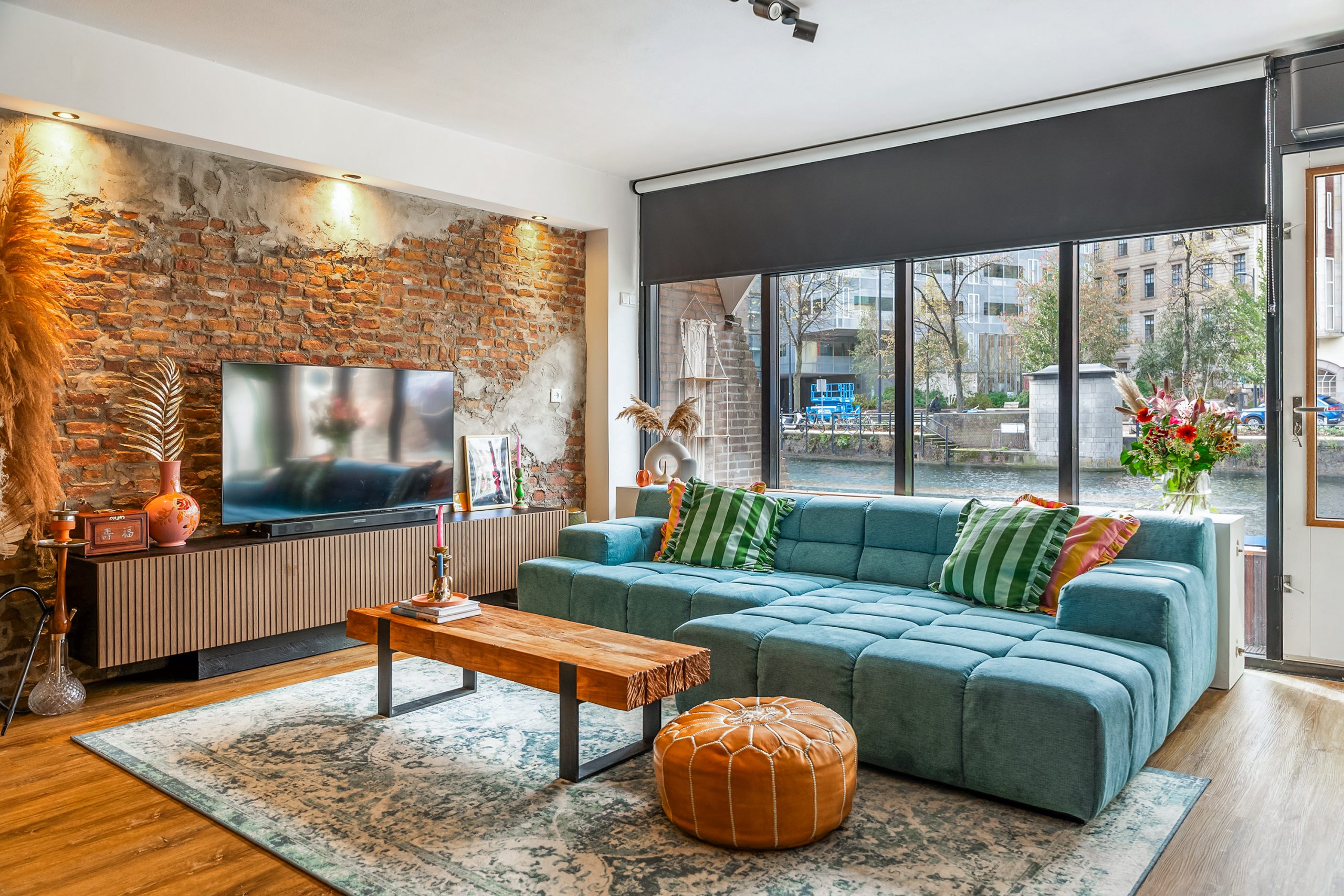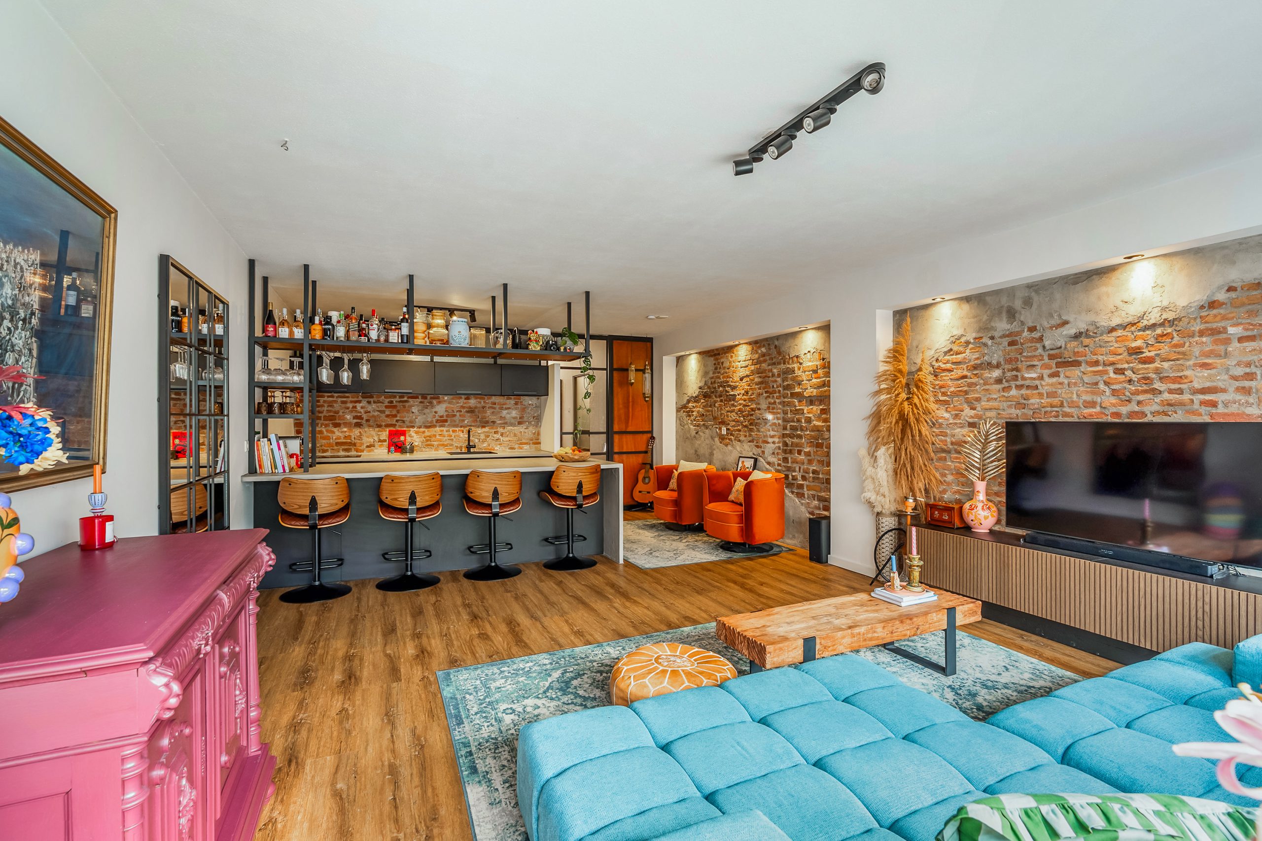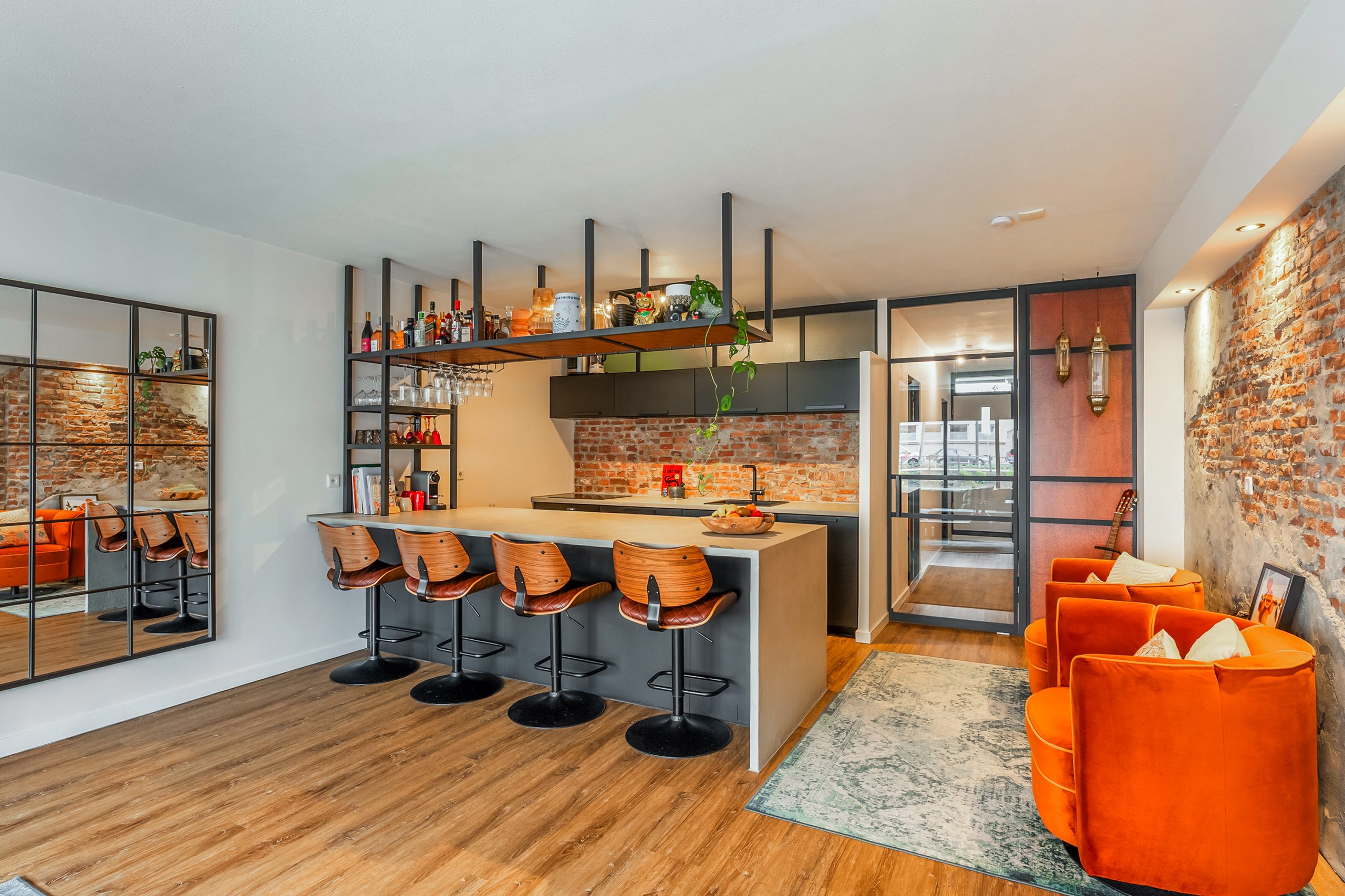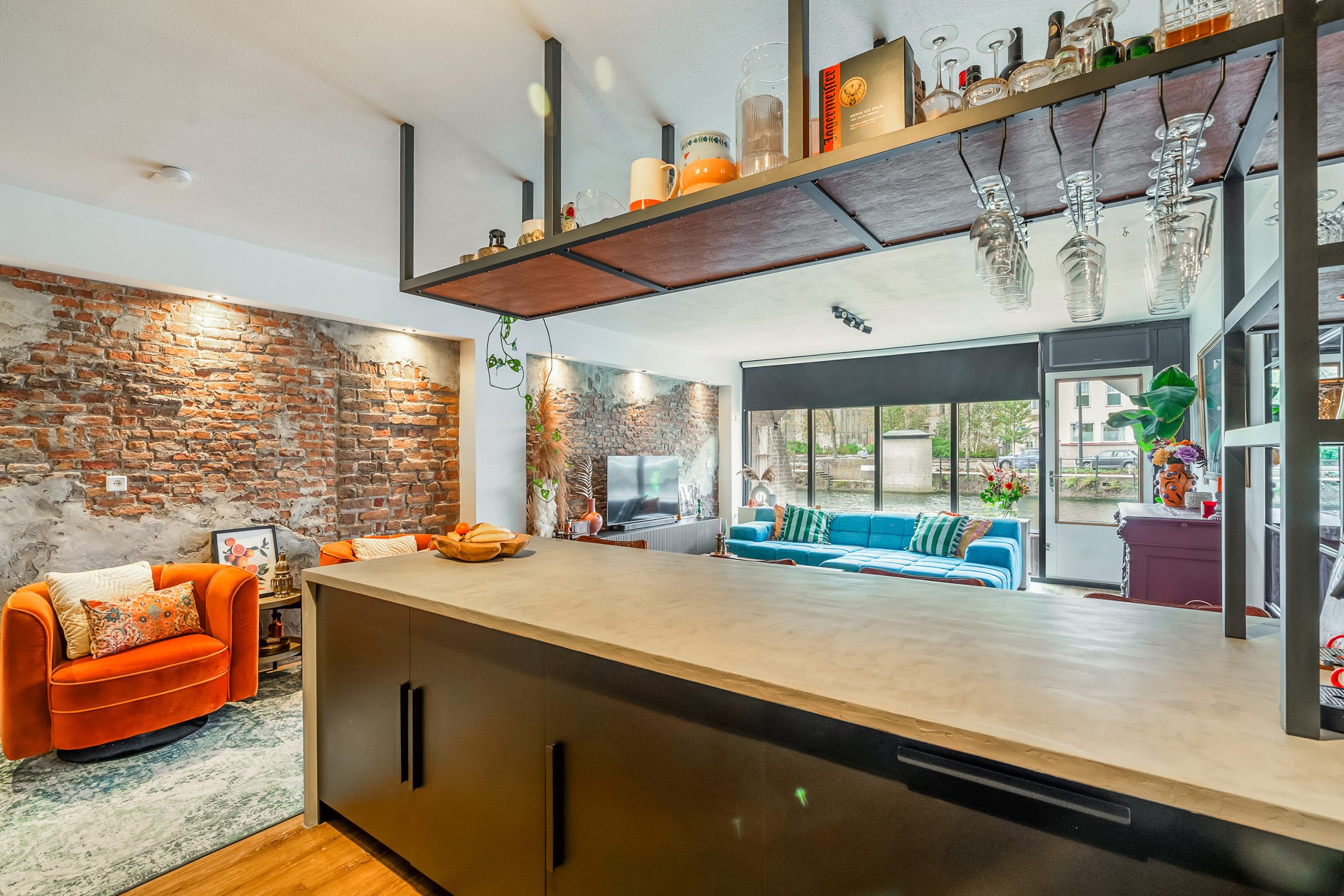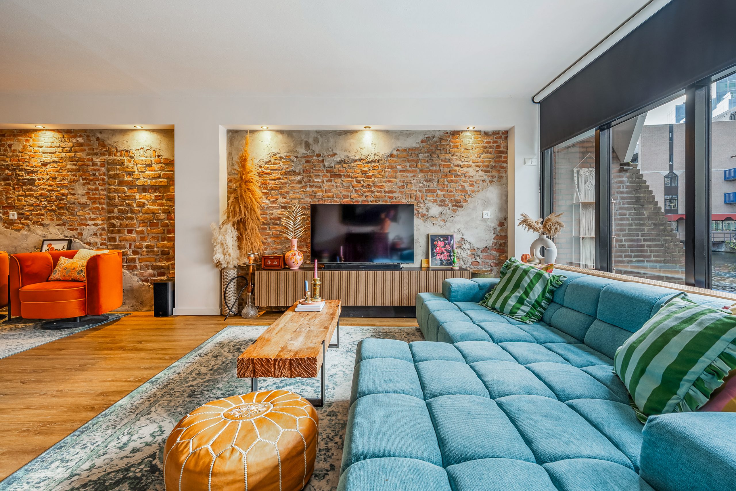 Bij binnenkomst kom je in de L-vormige entree, vanwaar je direct toegang hebt tot het leefgedeelte. Dit leefgedeelte straalt sfeer en stijl uit: een moderne, hoogwaardige afwerking en een doordachte indeling zorgen voor een prettige leefomgeving. De strakke laminaatvloer, nette wand- en plafondafwerking en de stoere brickwall — een echte eyecatcher — geven het geheel karakter.