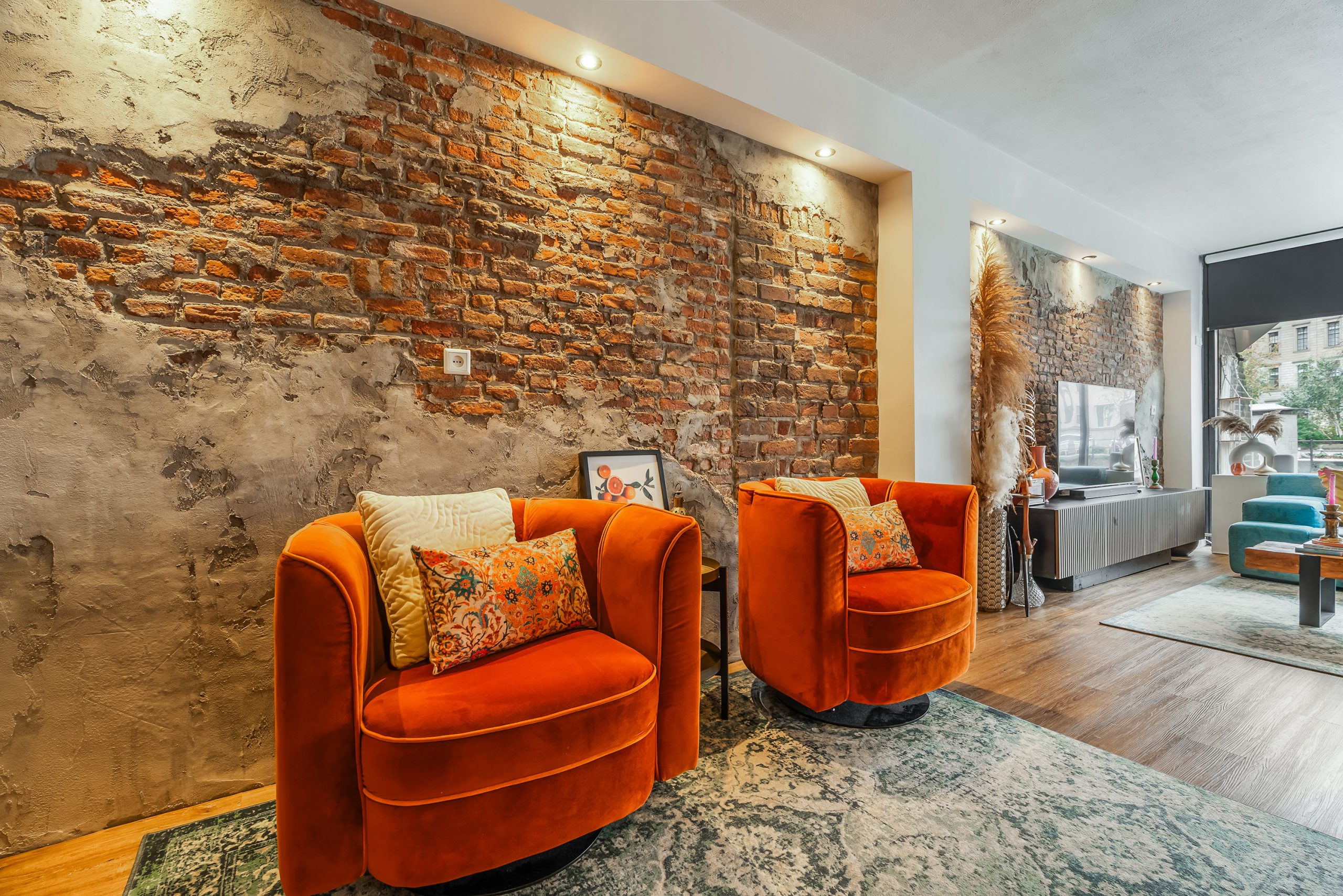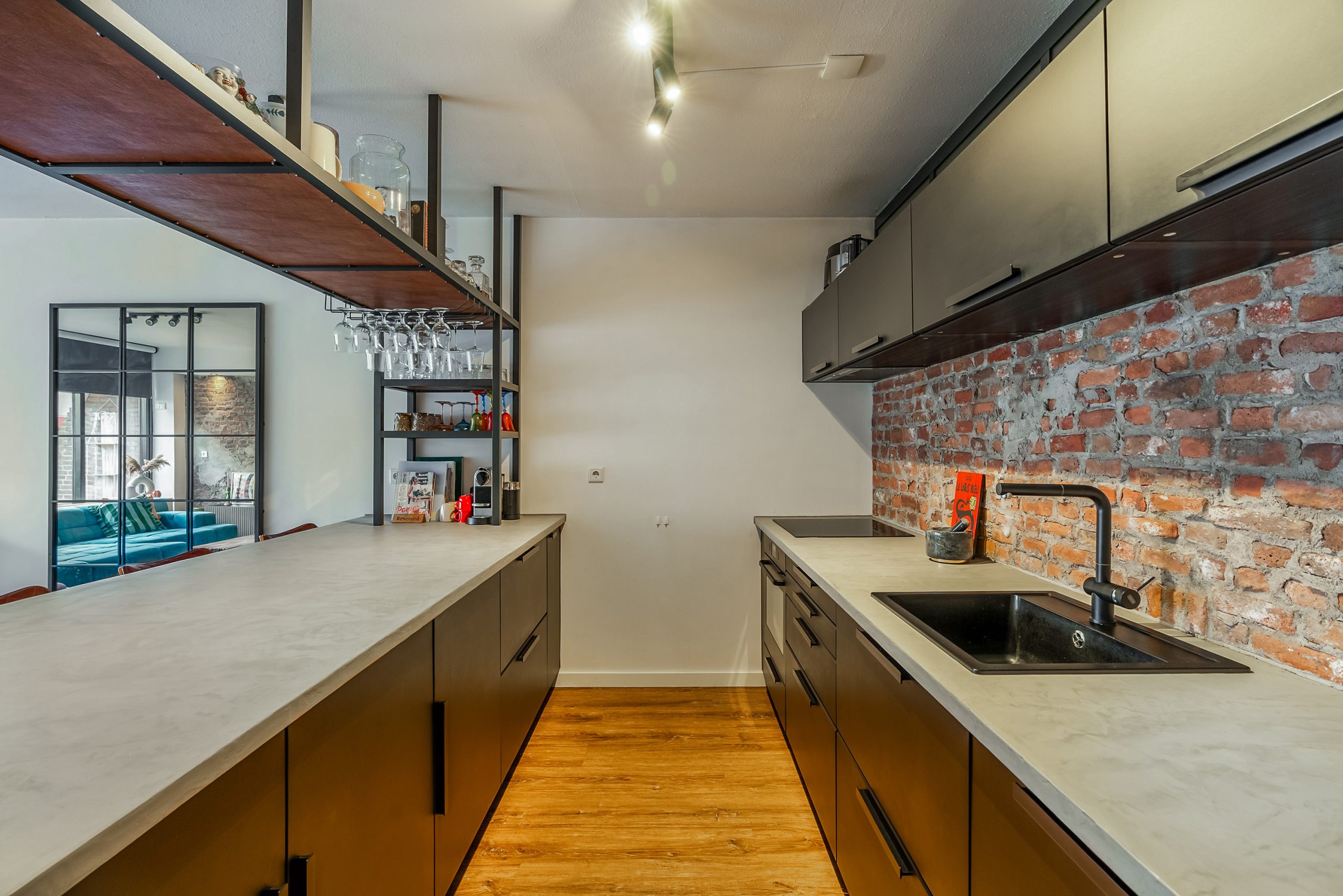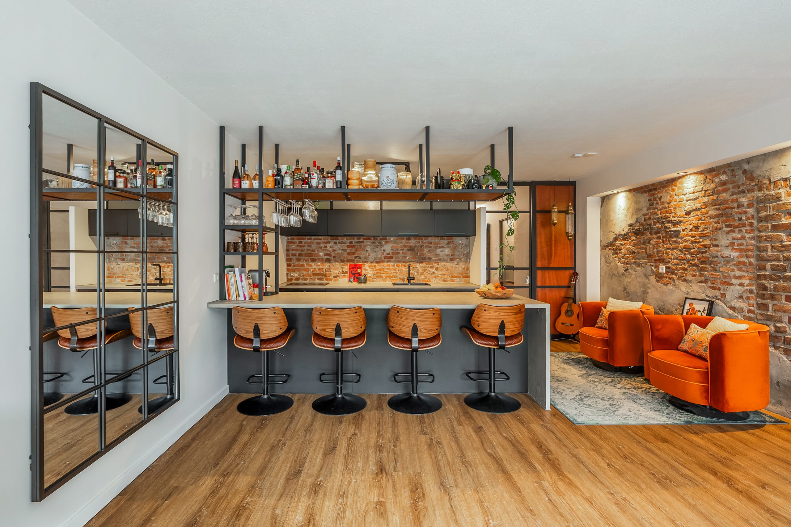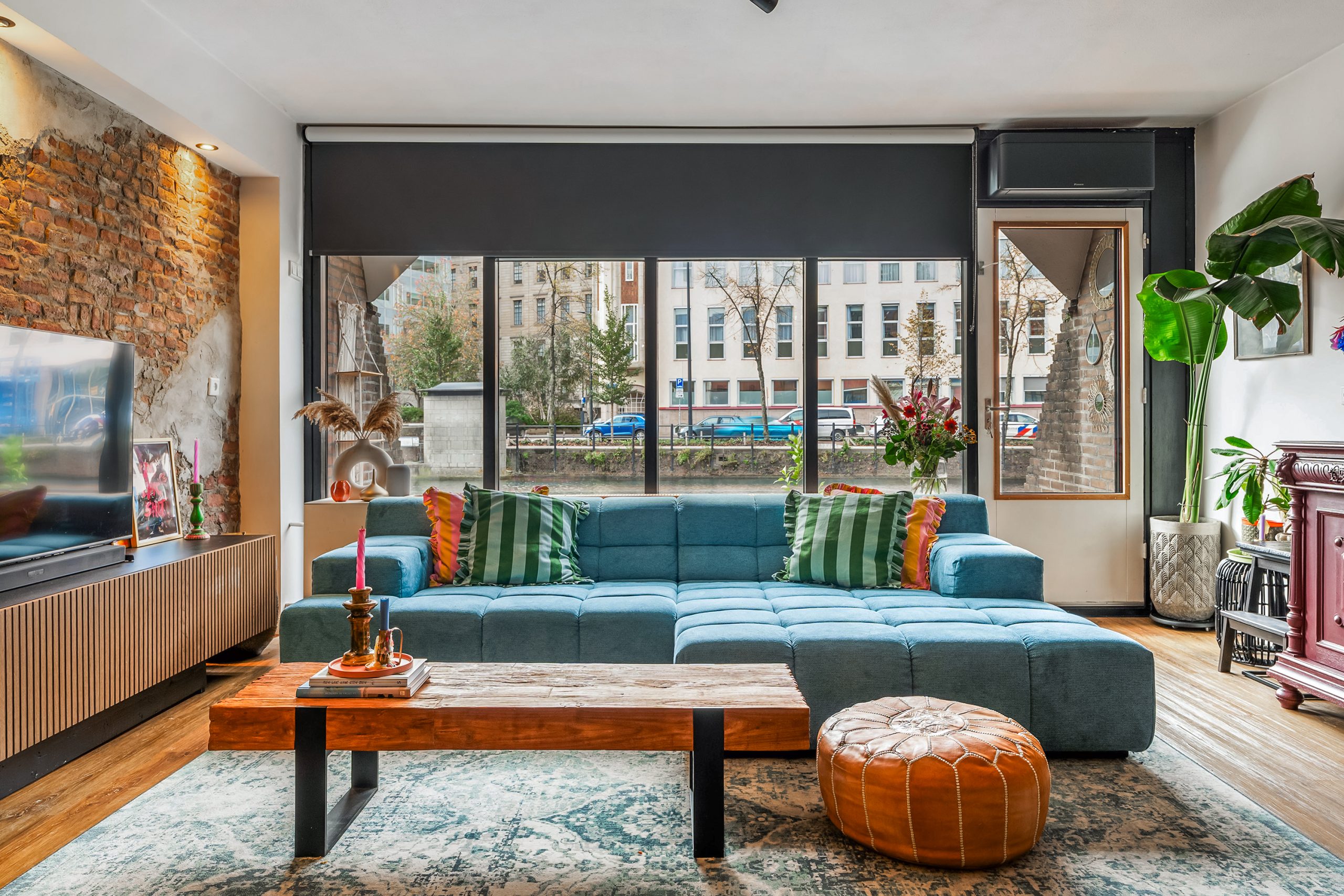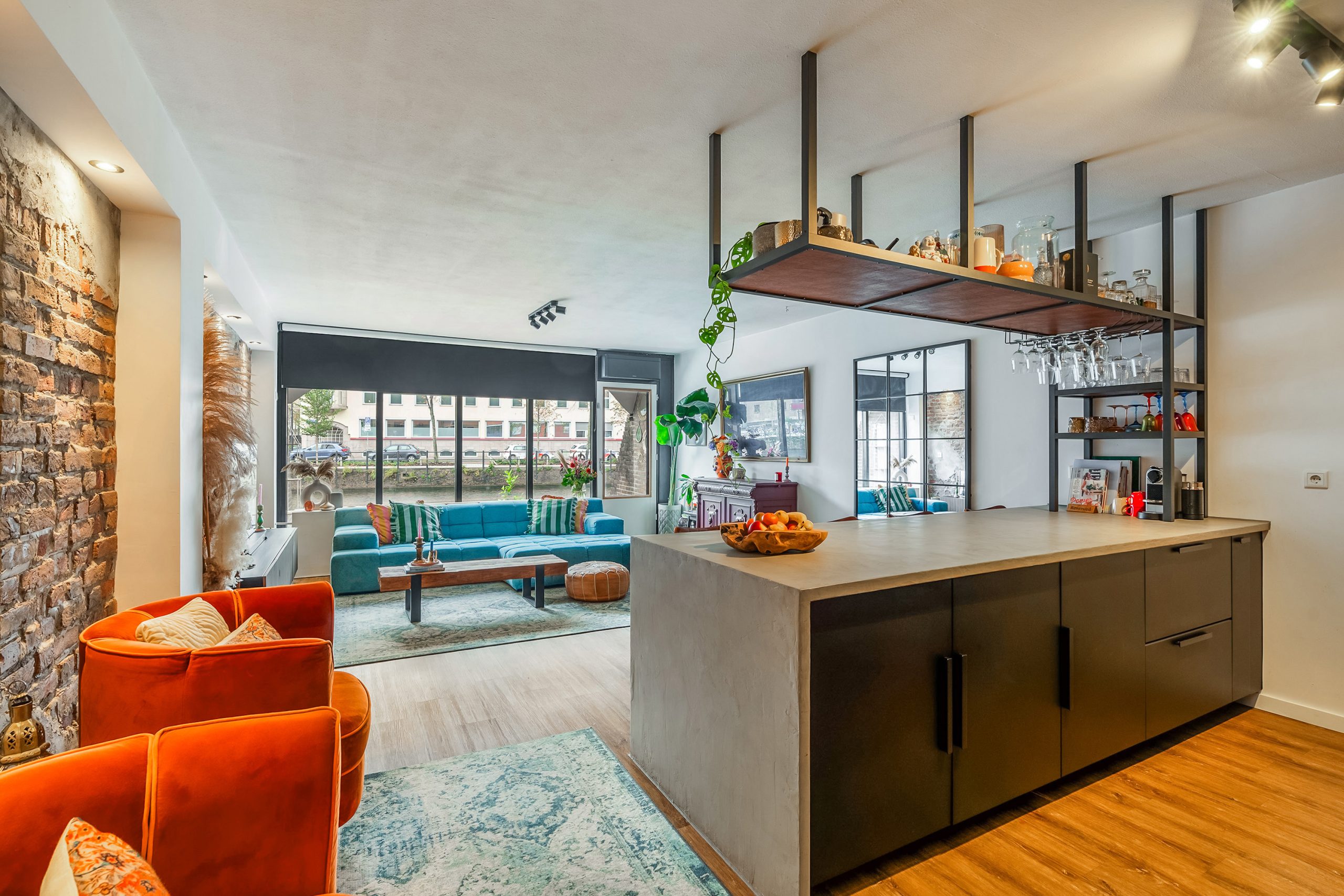 Bij binnenkomst kom je in de L-vormige entree, vanwaar je direct toegang hebt tot het leefgedeelte. Dit leefgedeelte straalt sfeer en stijl uit: een moderne, hoogwaardige afwerking en een doordachte indeling zorgen voor een prettige leefomgeving. De strakke laminaatvloer, nette wand- en plafondafwerking en de stoere brickwall — een echte eyecatcher — geven het geheel karakter.